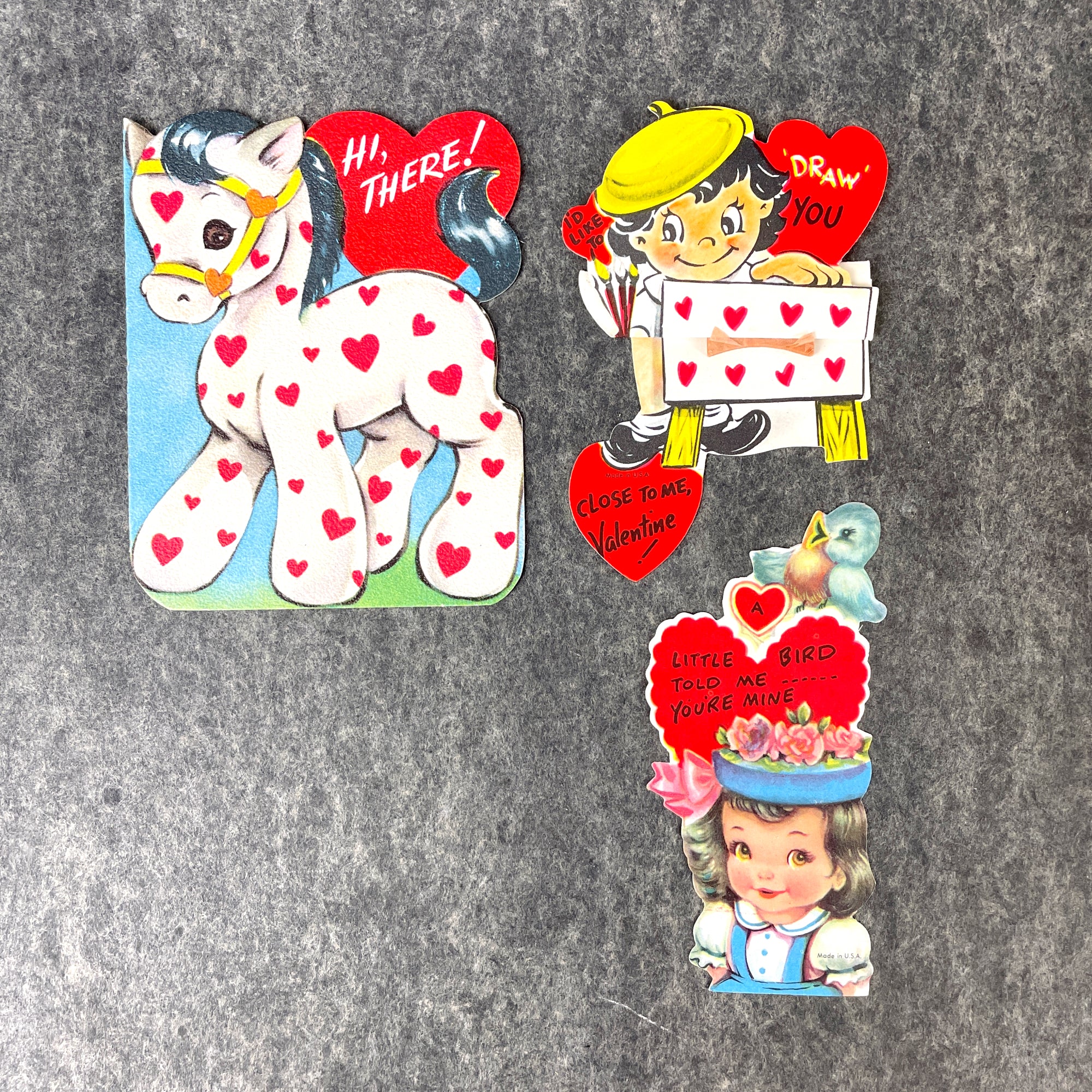 Trio of 1950s vintage used children's valentine greeting cards - mid century vintage
