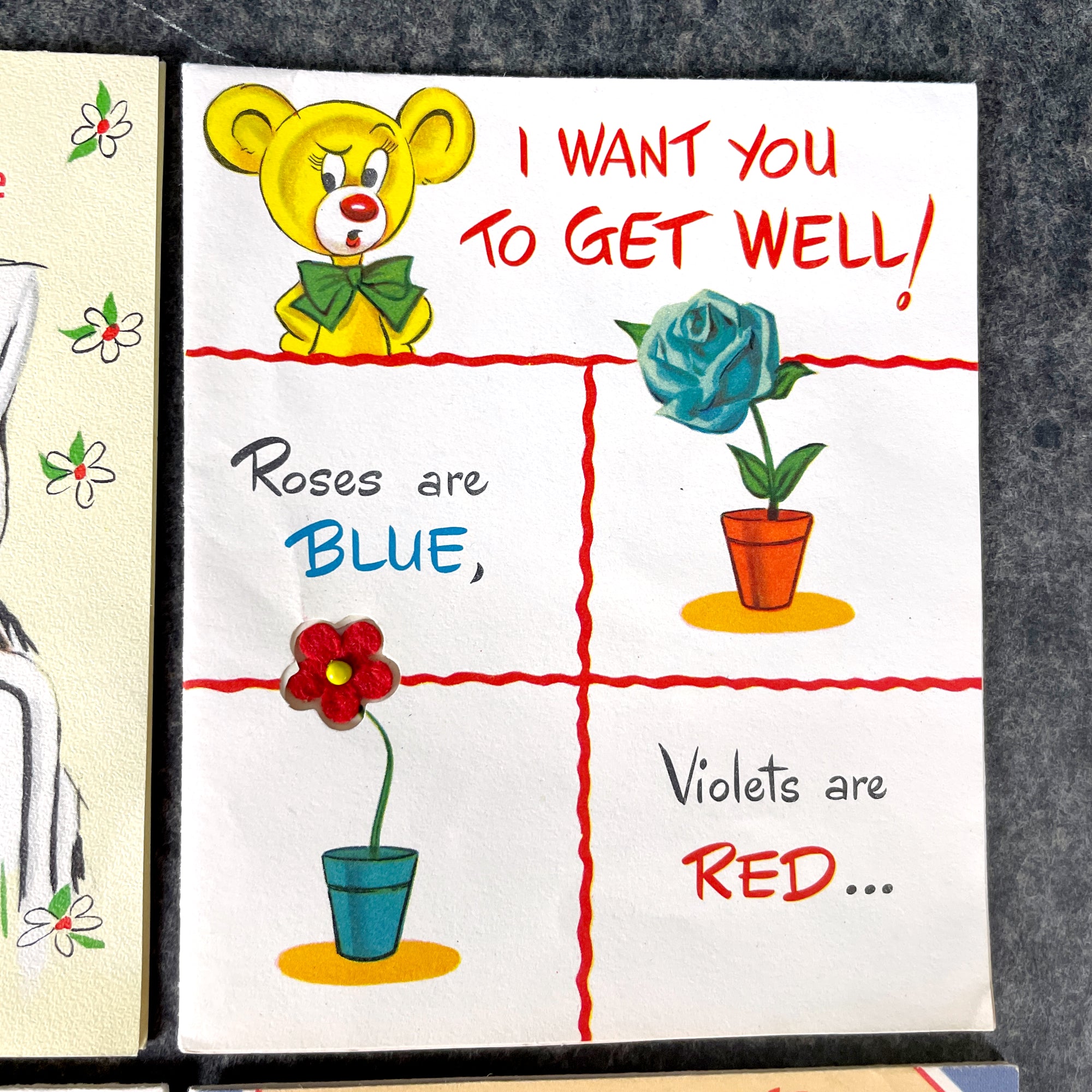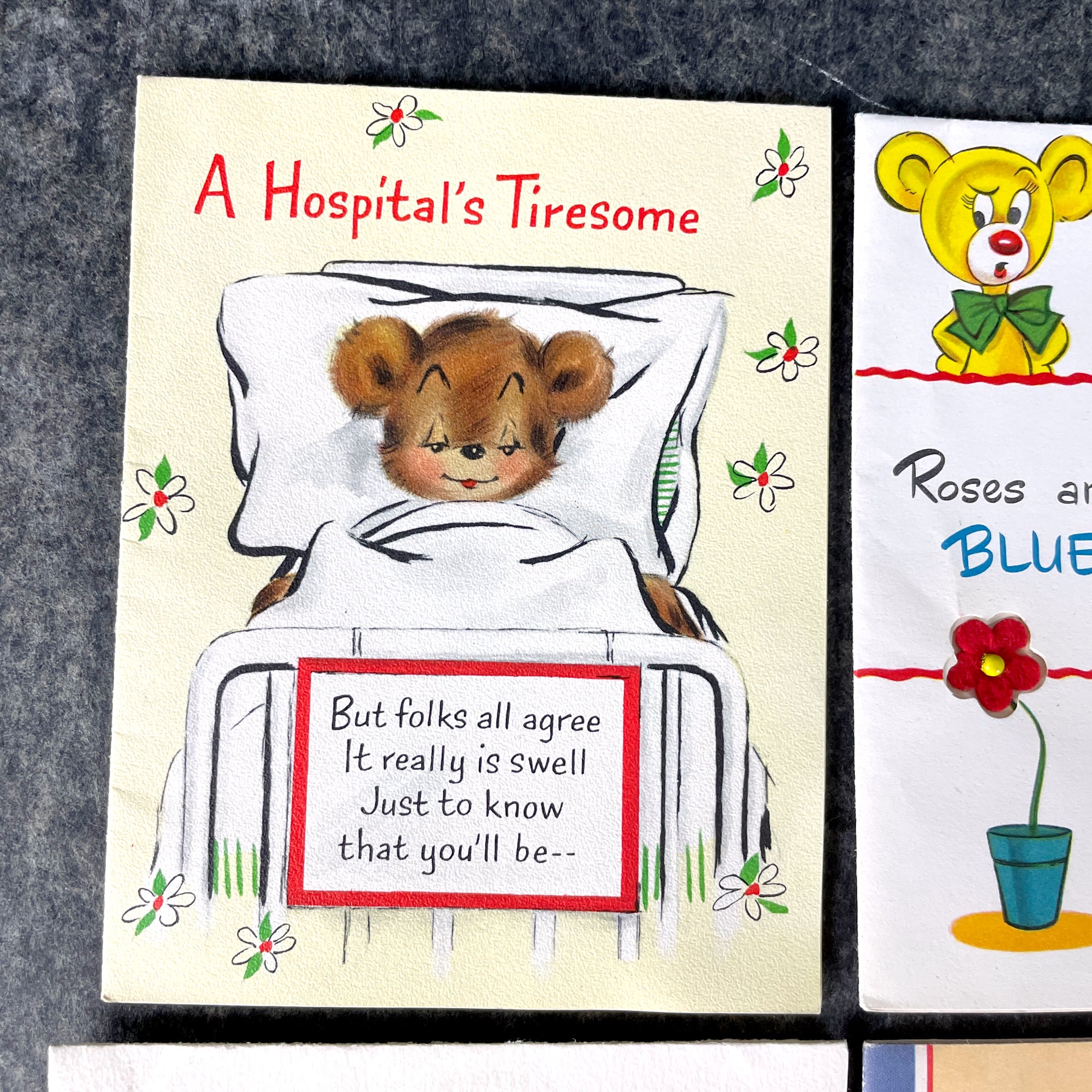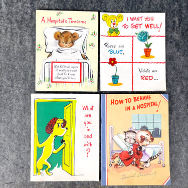 4 Vintage Get Well greeting cards from the 1950s and 1960s for collecting and art projects.
