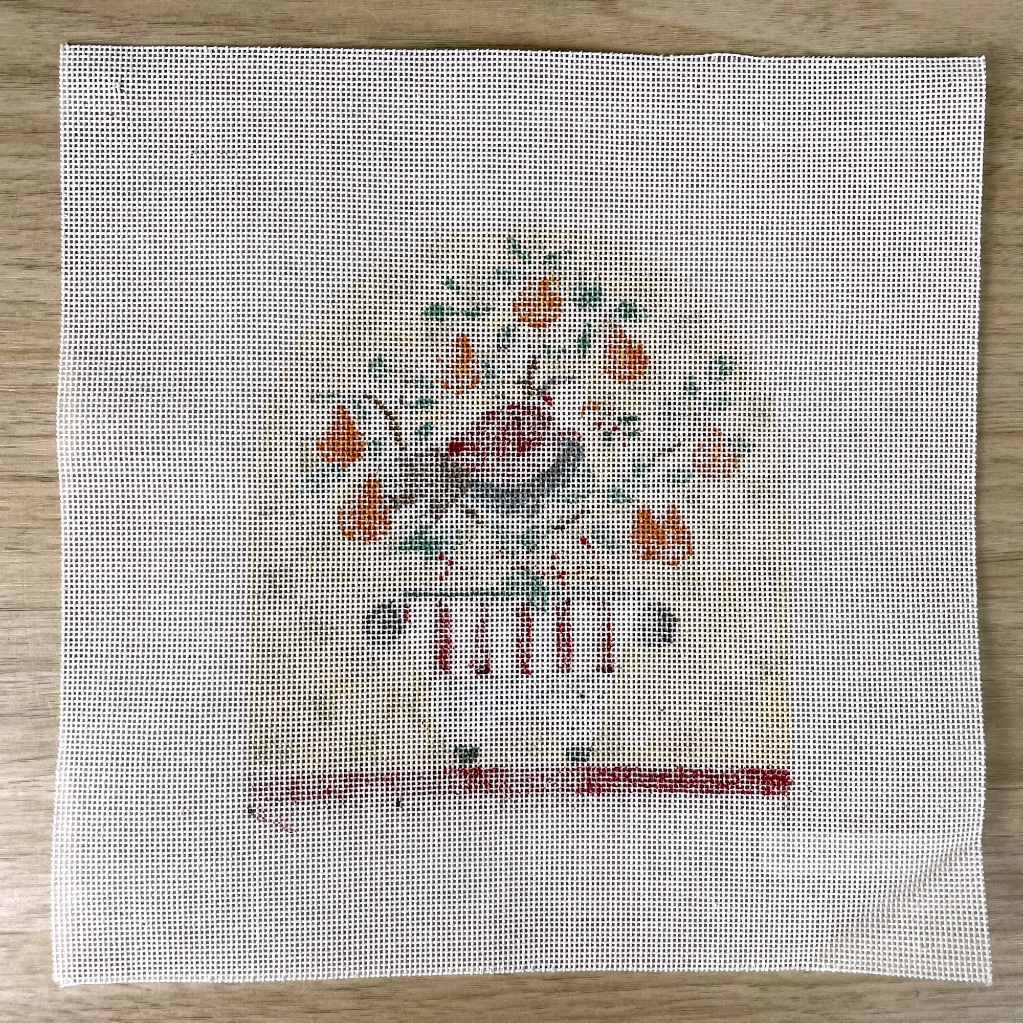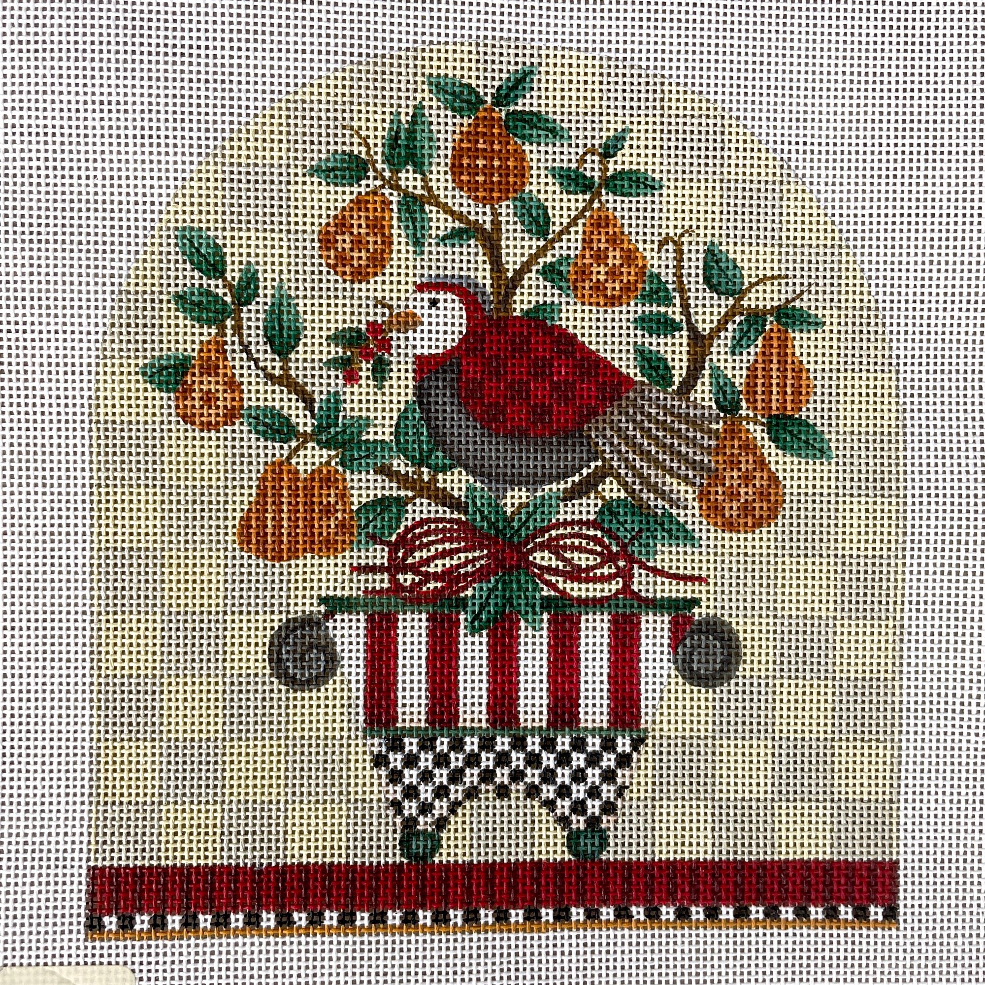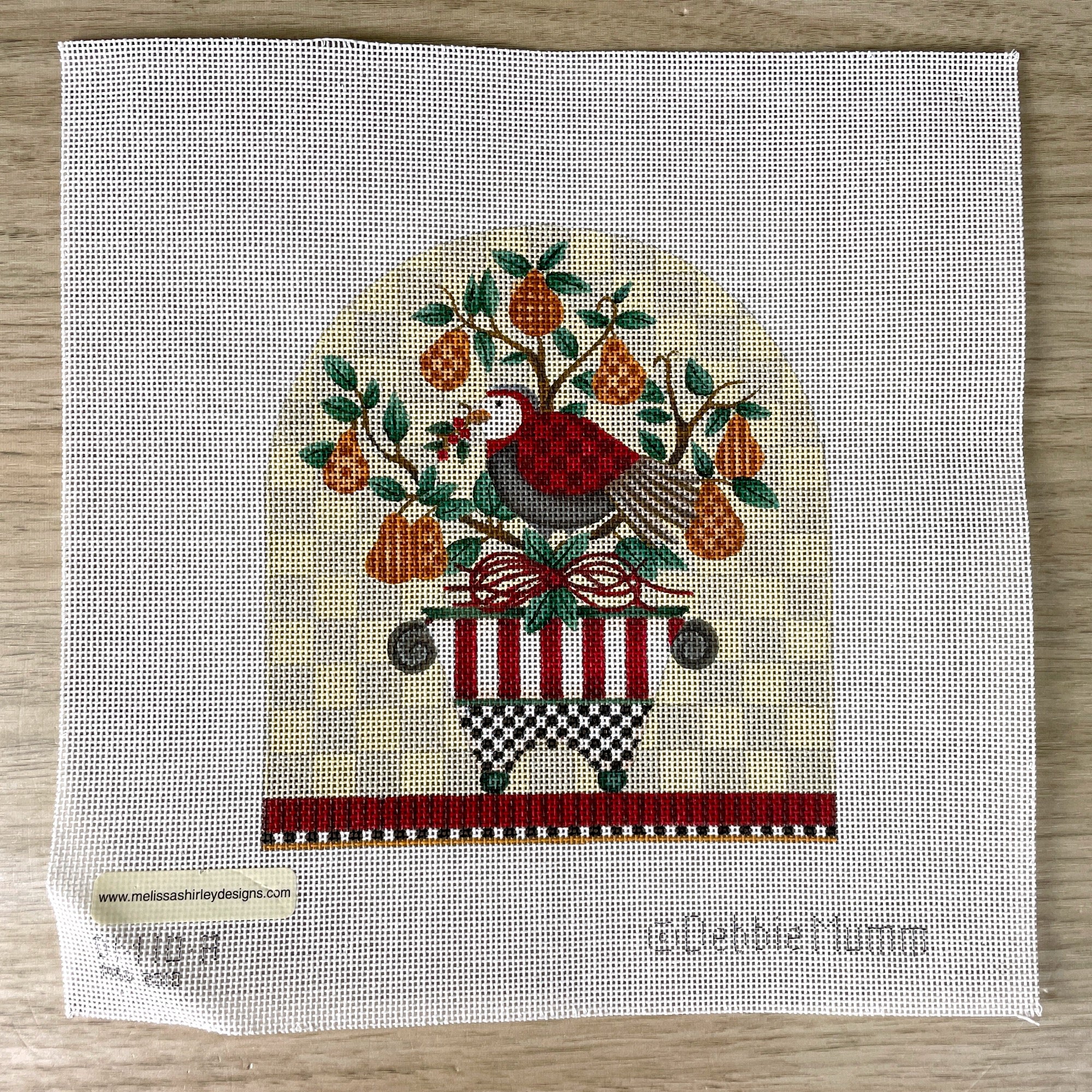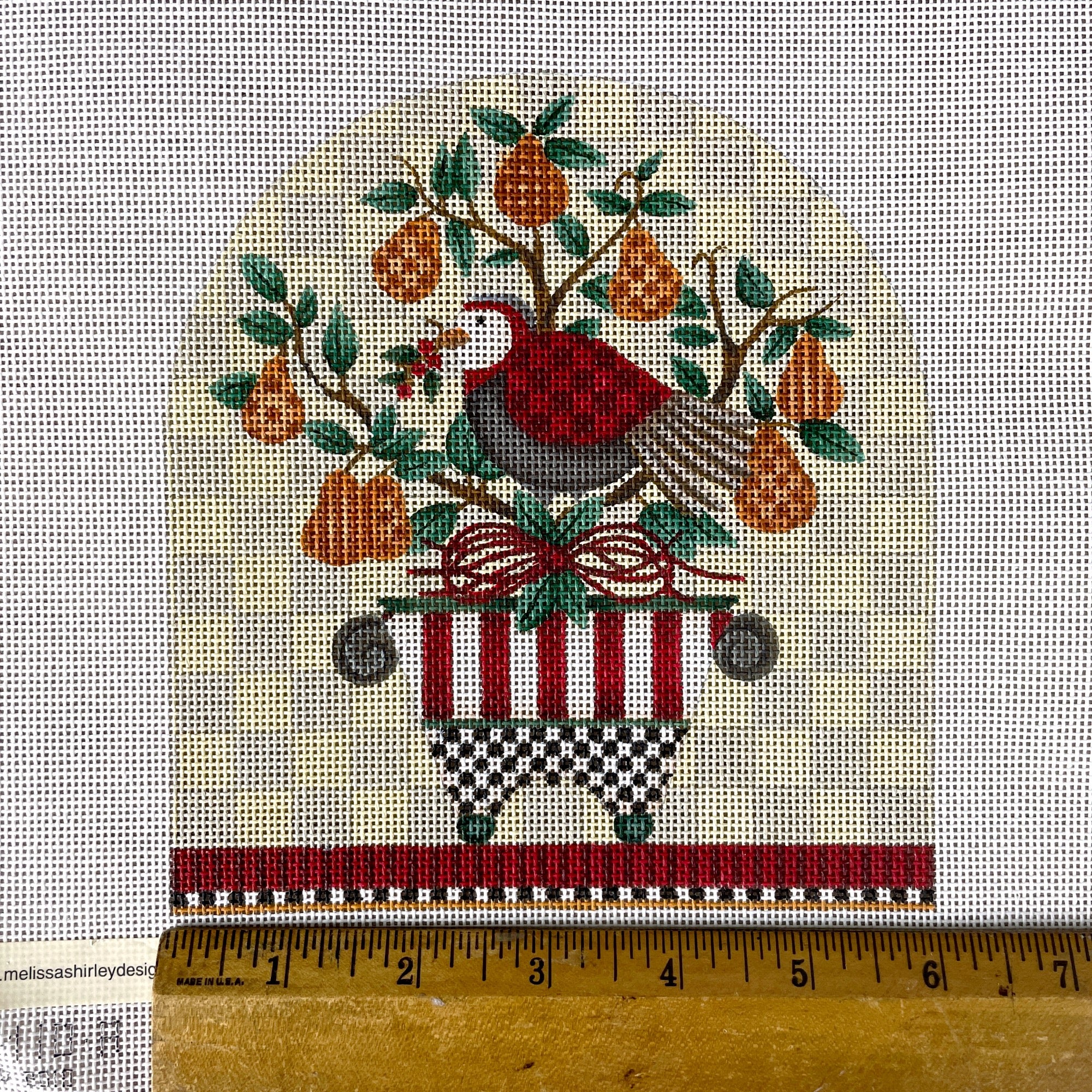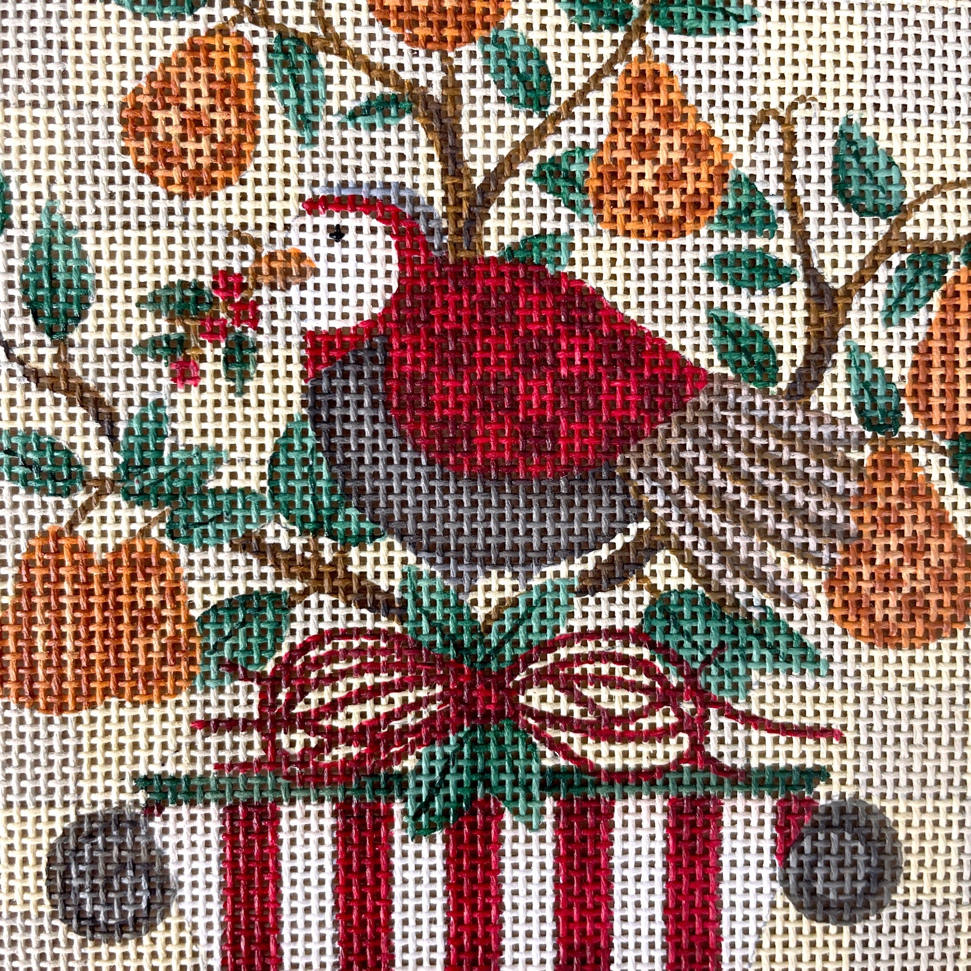 Debbie Mumm handpainted needlepoint canvas from Melissa Shirley Designs. Partridge in a Pear Ree, #DM10A. In classic Debbie Mumm colors. Retail $150.