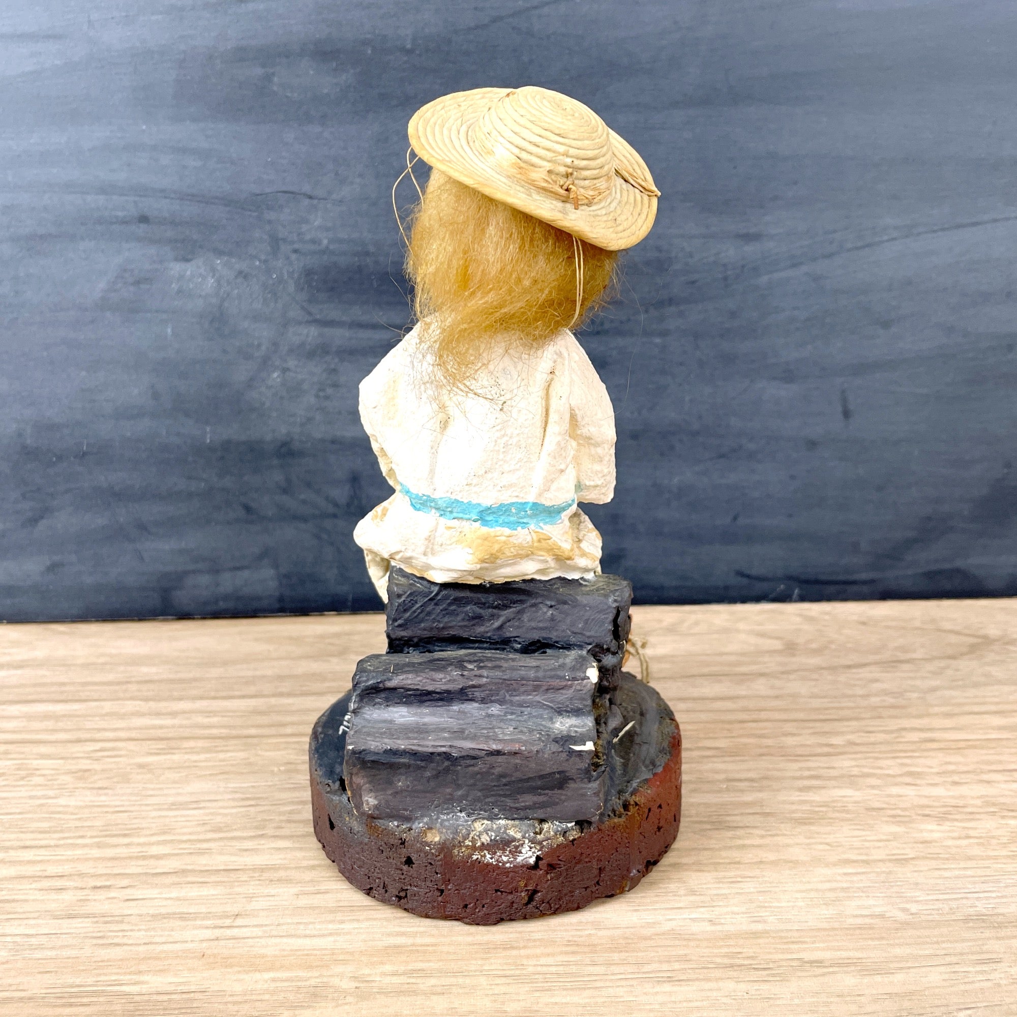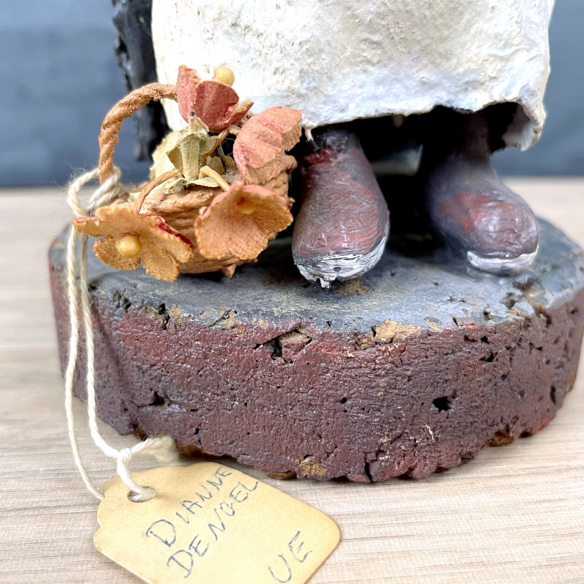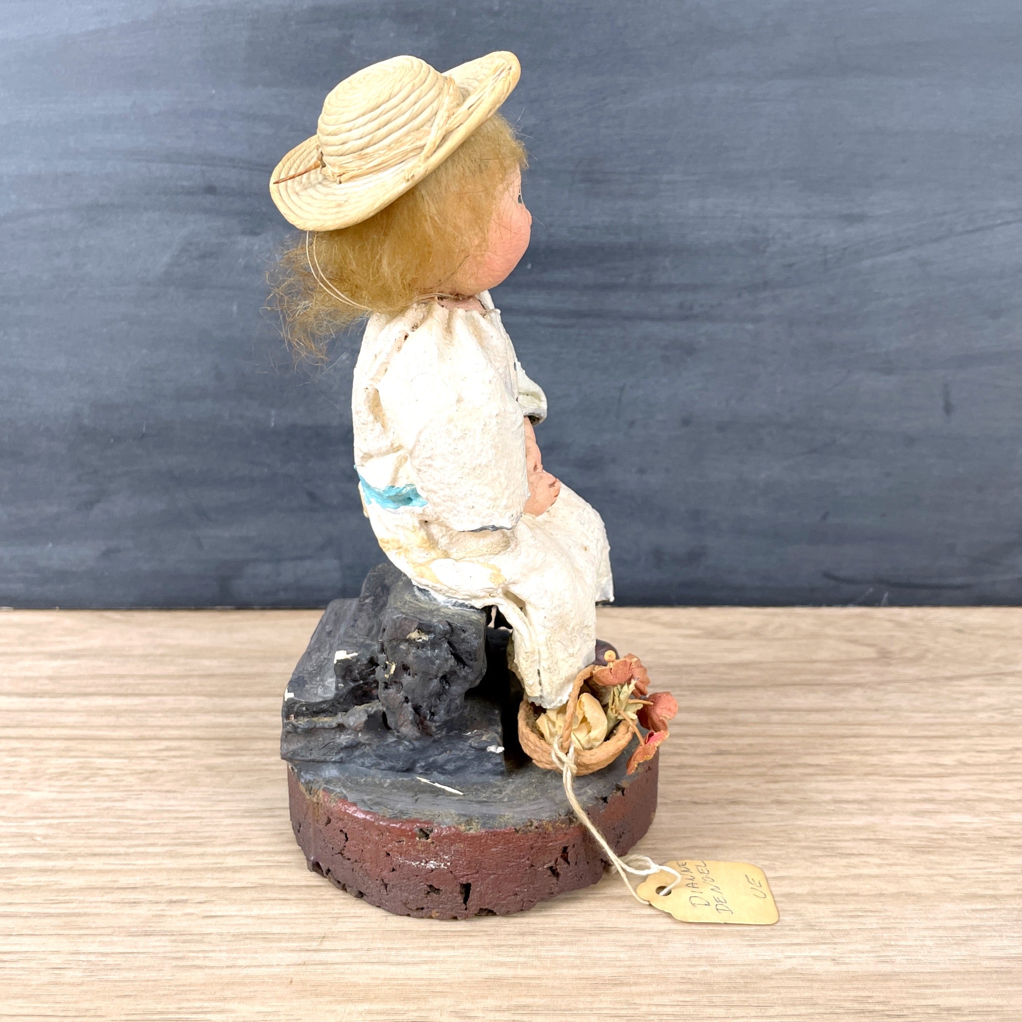 Early one of a kind handmade original paper mache doll made by Dianne Dengel (1939-2012) of a country girl doll mounted on a round cork. Absolutely sweetness personified, this little art doll by a renowned artist.
