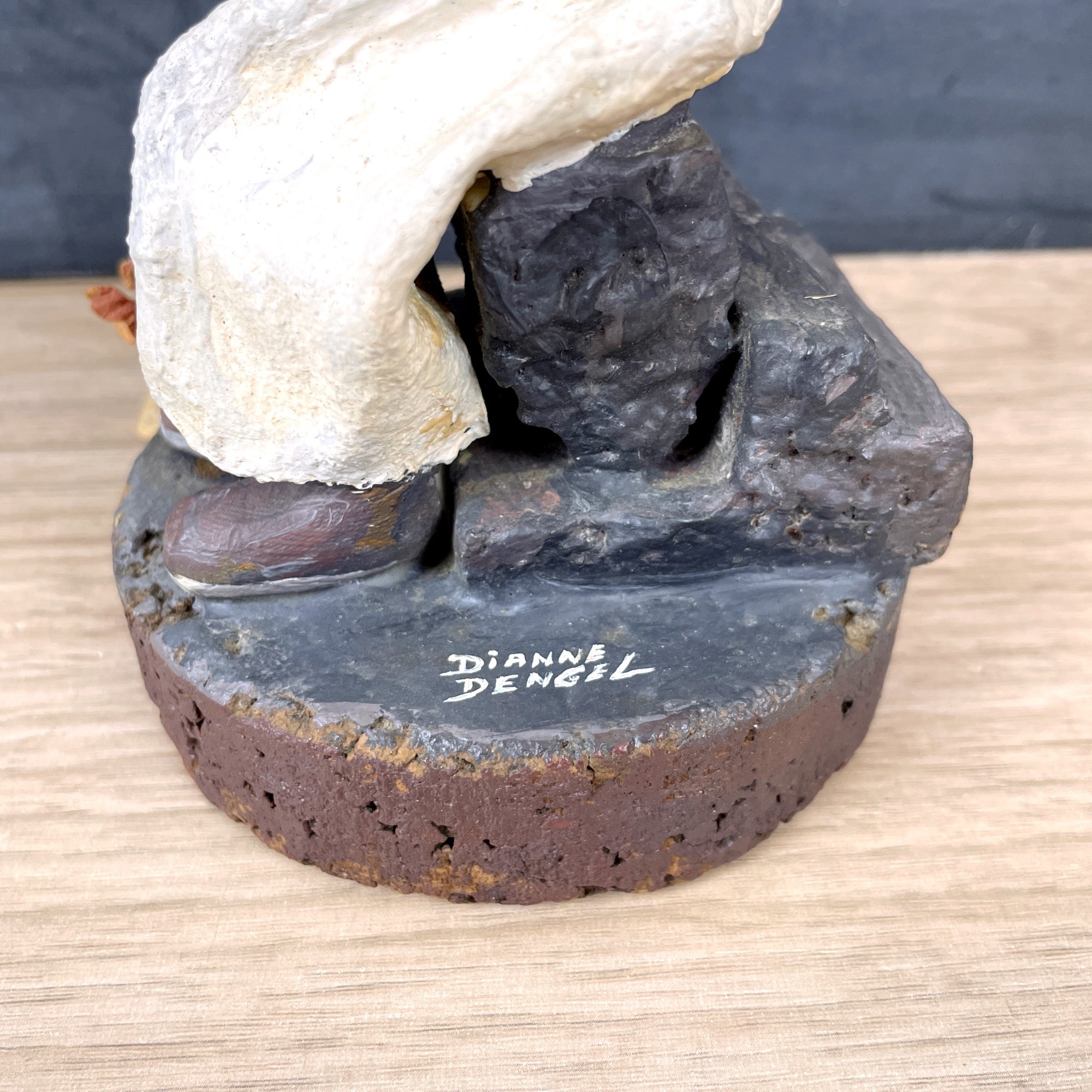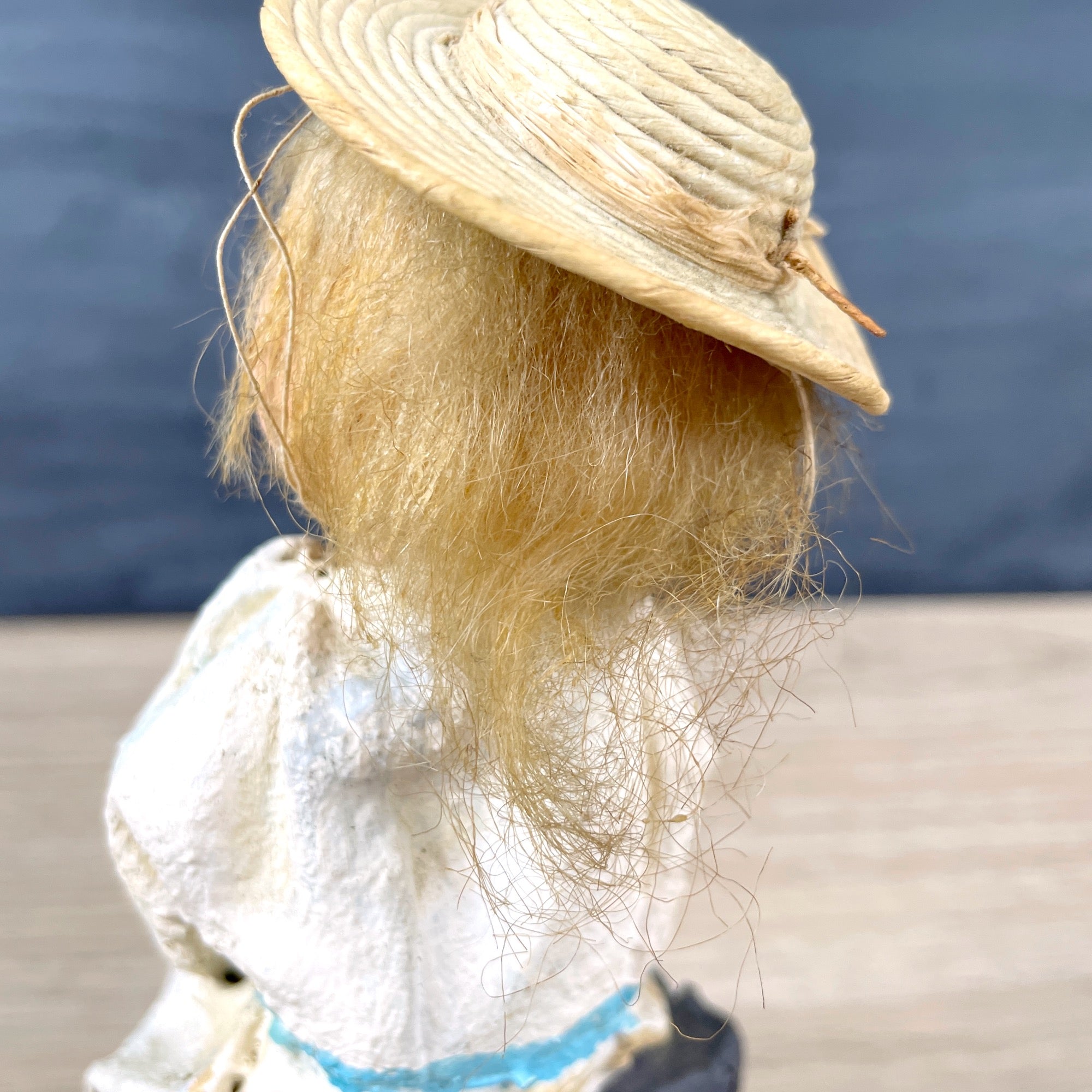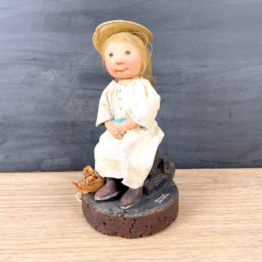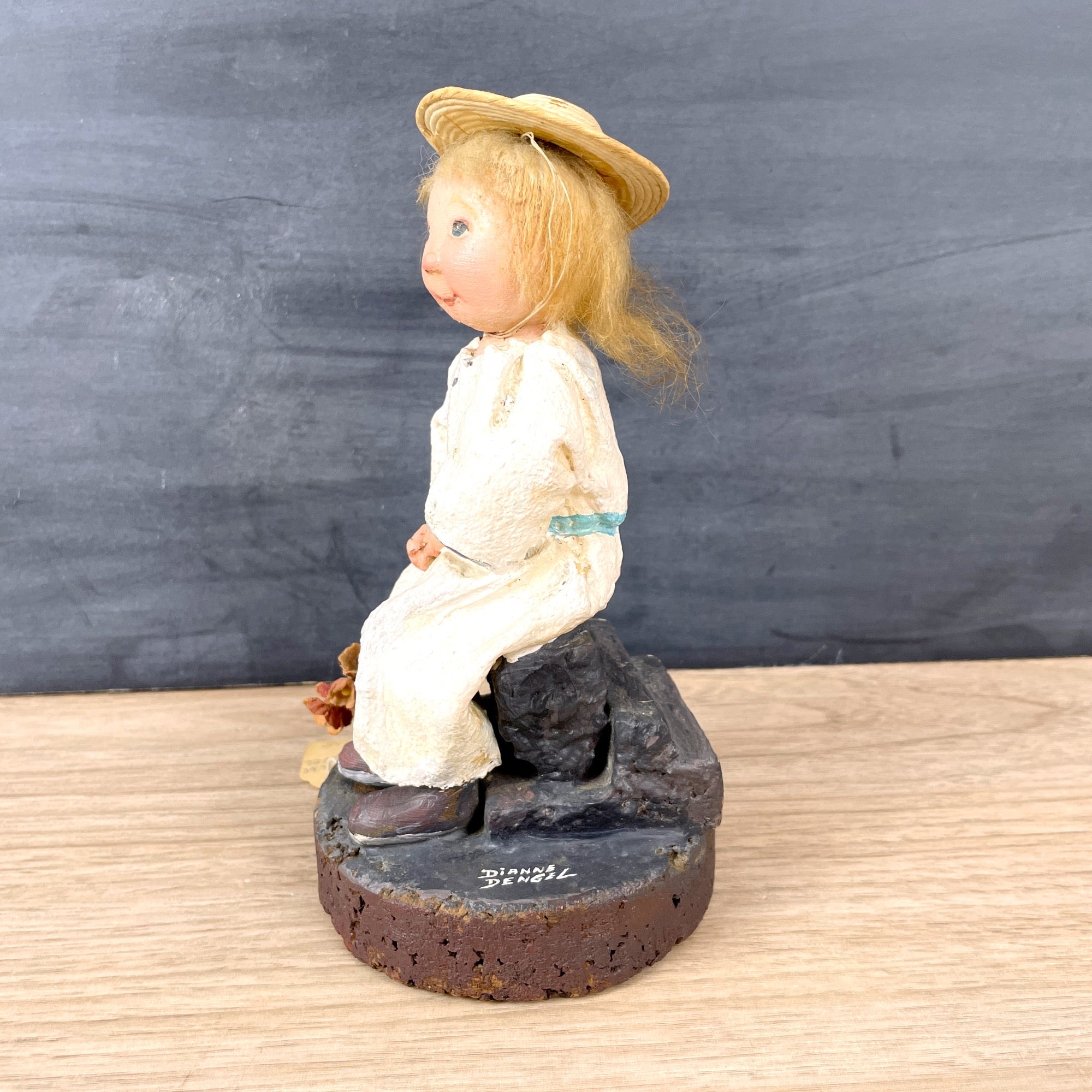 Early one of a kind handmade original paper mache doll made by Dianne Dengel (1939-2012) of a country girl doll mounted on a round cork. Absolutely sweetness personified, this little art doll by a renowned artist.