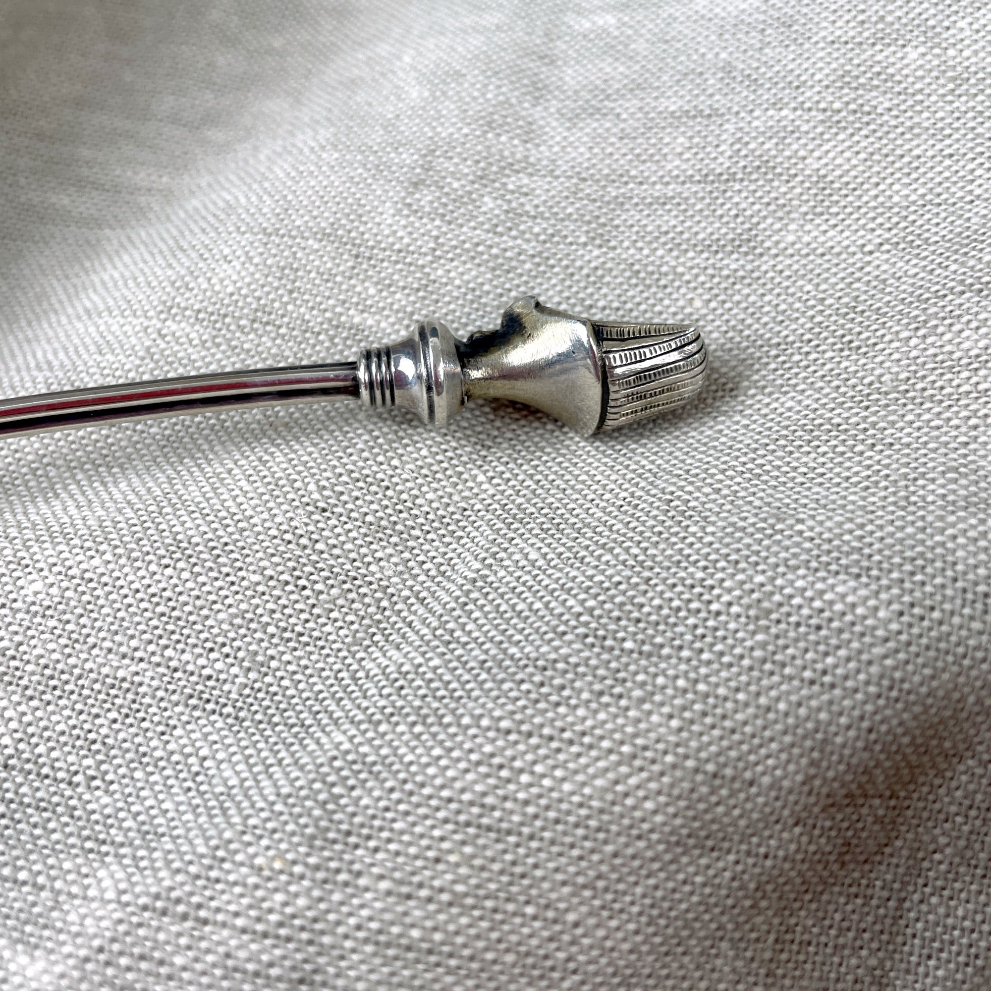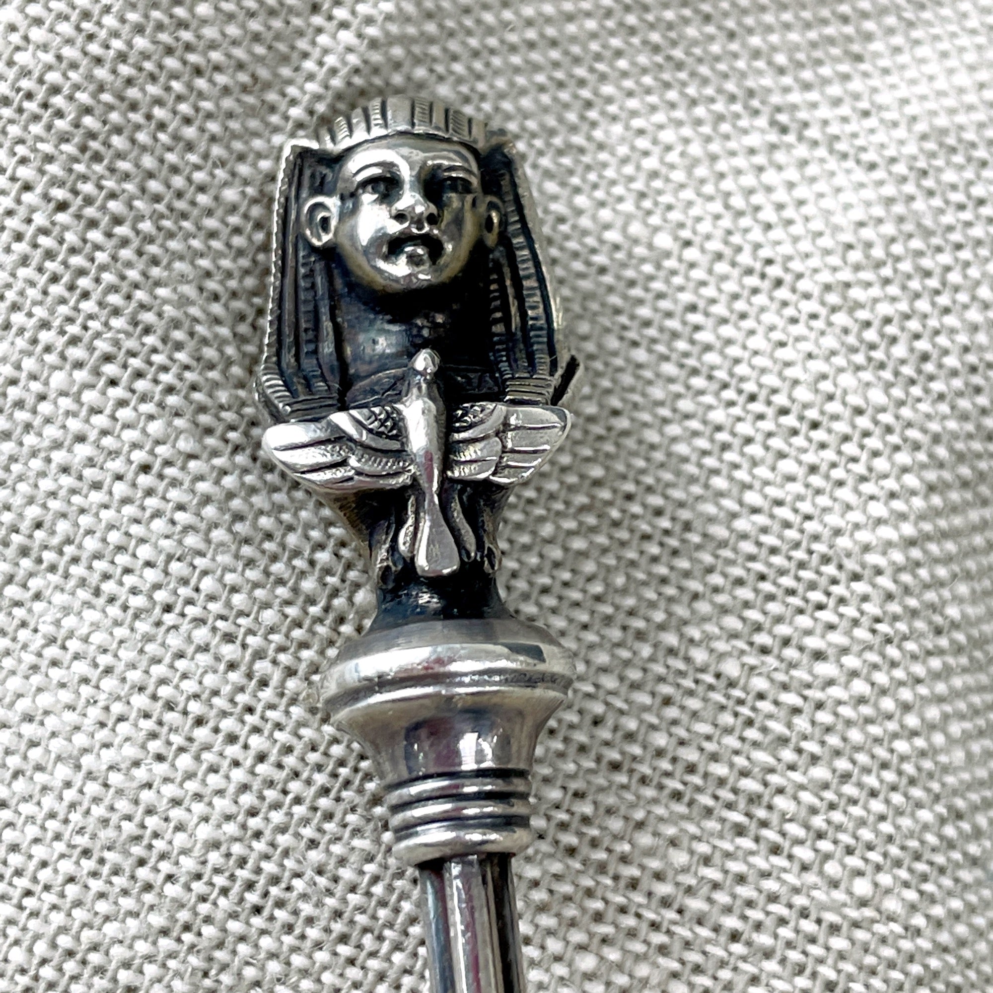Gorham Sterling Egyptian revival sterling sugar sifter. Pattern has a pharaoh's head with the Egyptian royal hawk at the top of the reeded handle, leaves above the bowl and cut out arrows in the bowl. Hallmark on the back of the bowl.