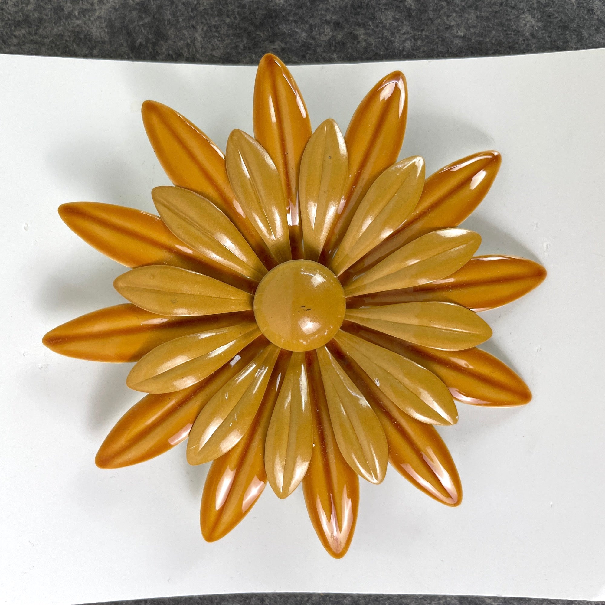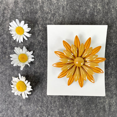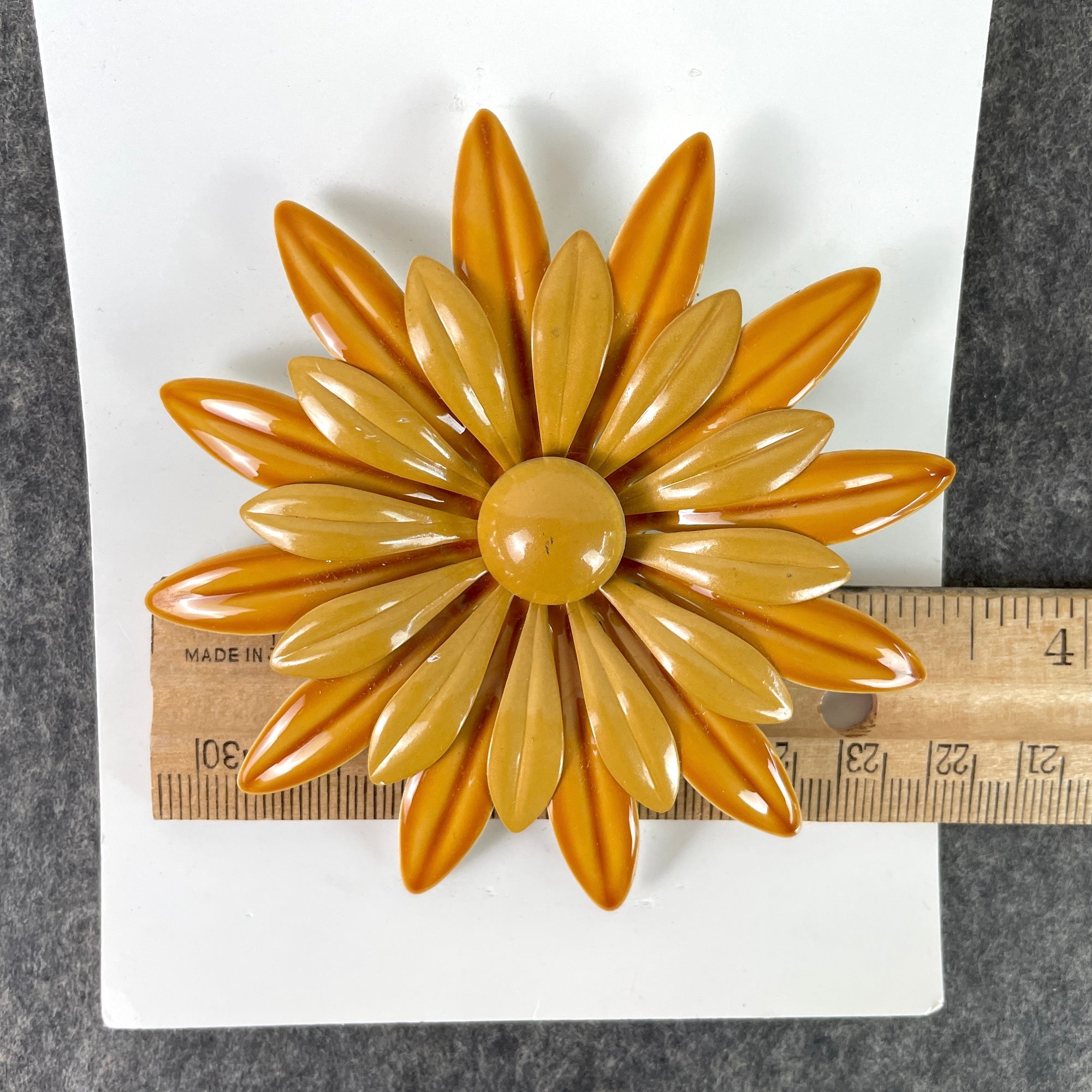 Vintage enamel on metal flower brooch in caramel and butterscotch browns. On original card with S.S. Kresge price sticker.