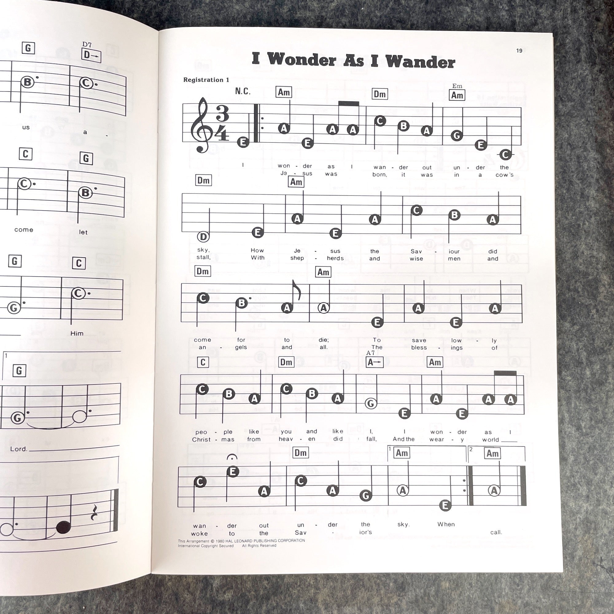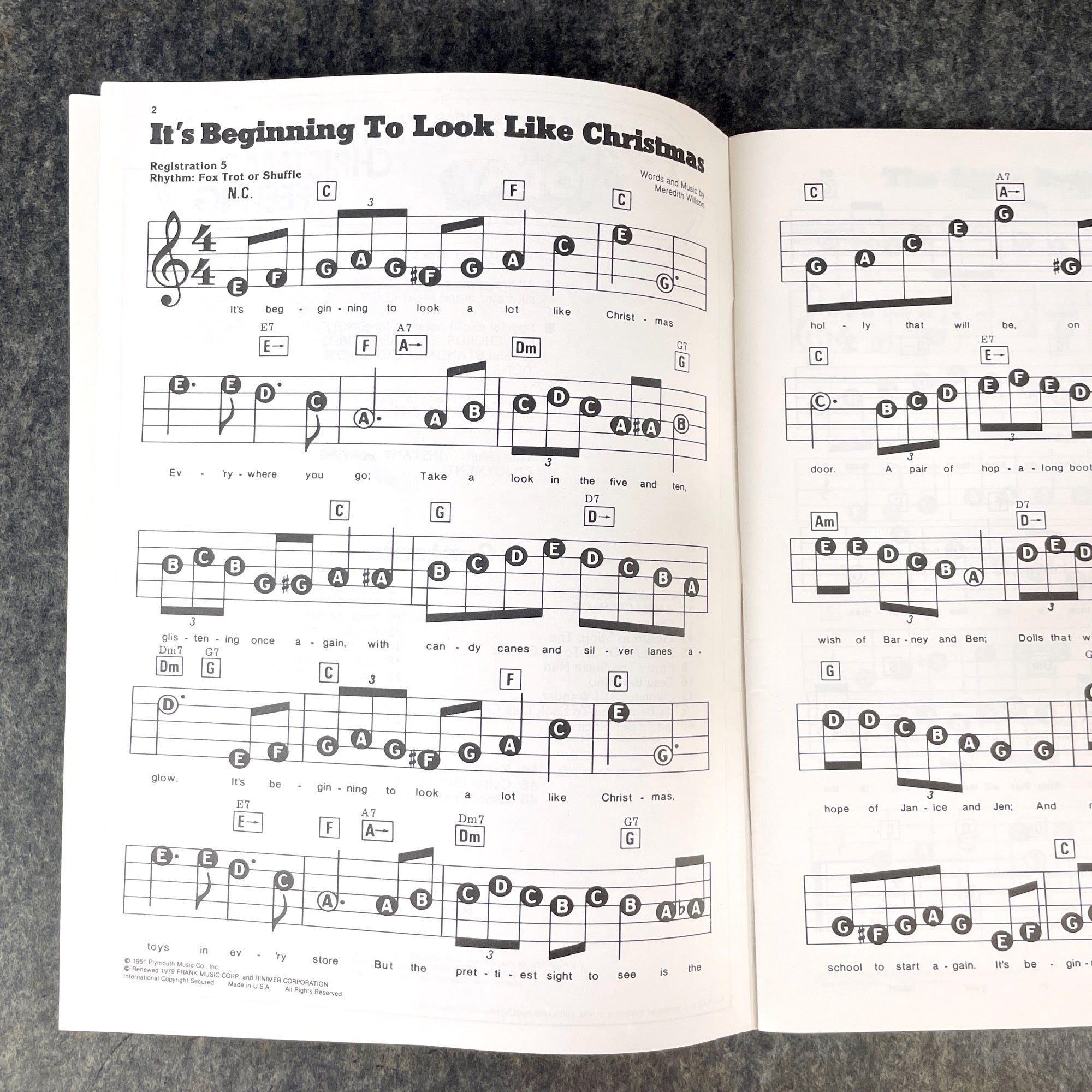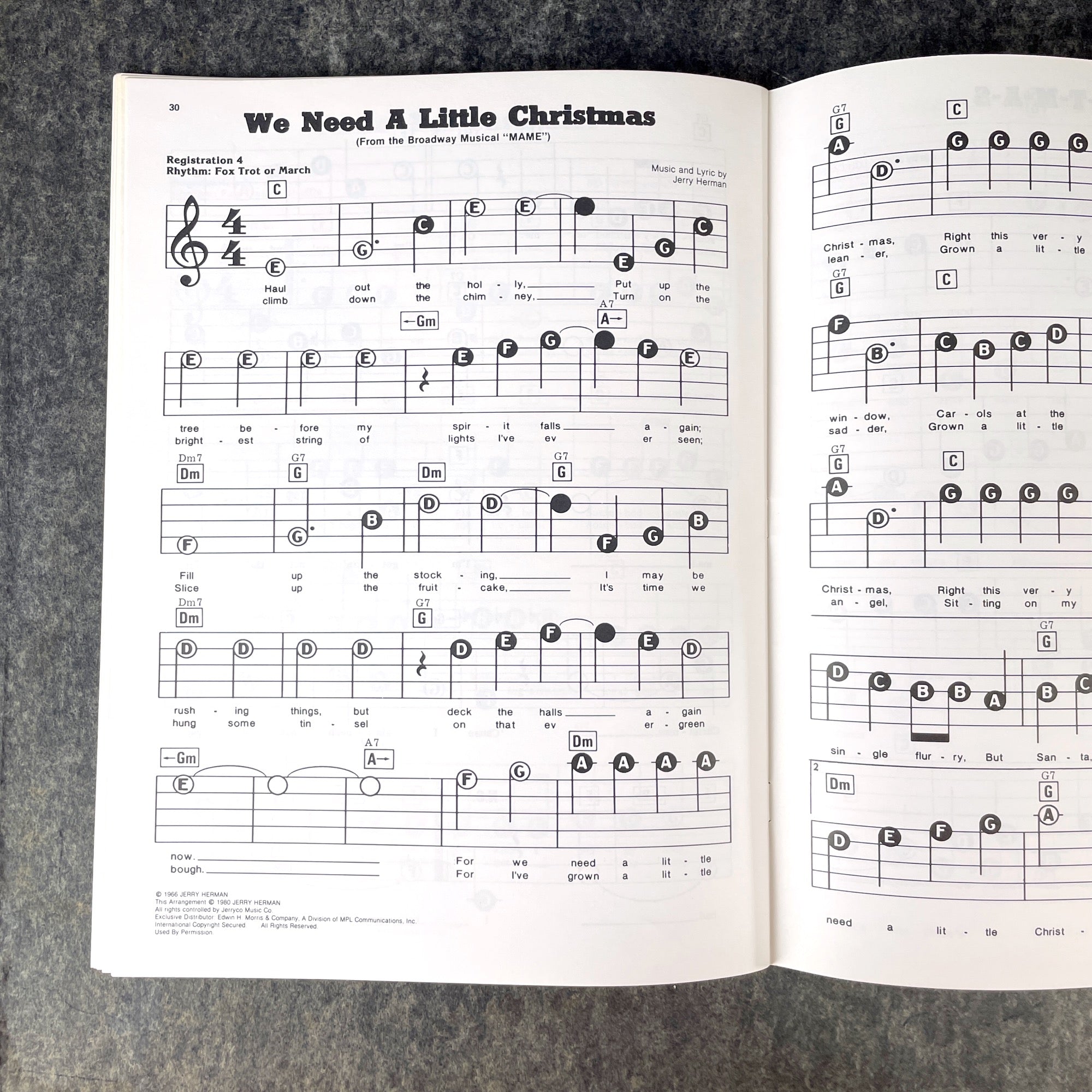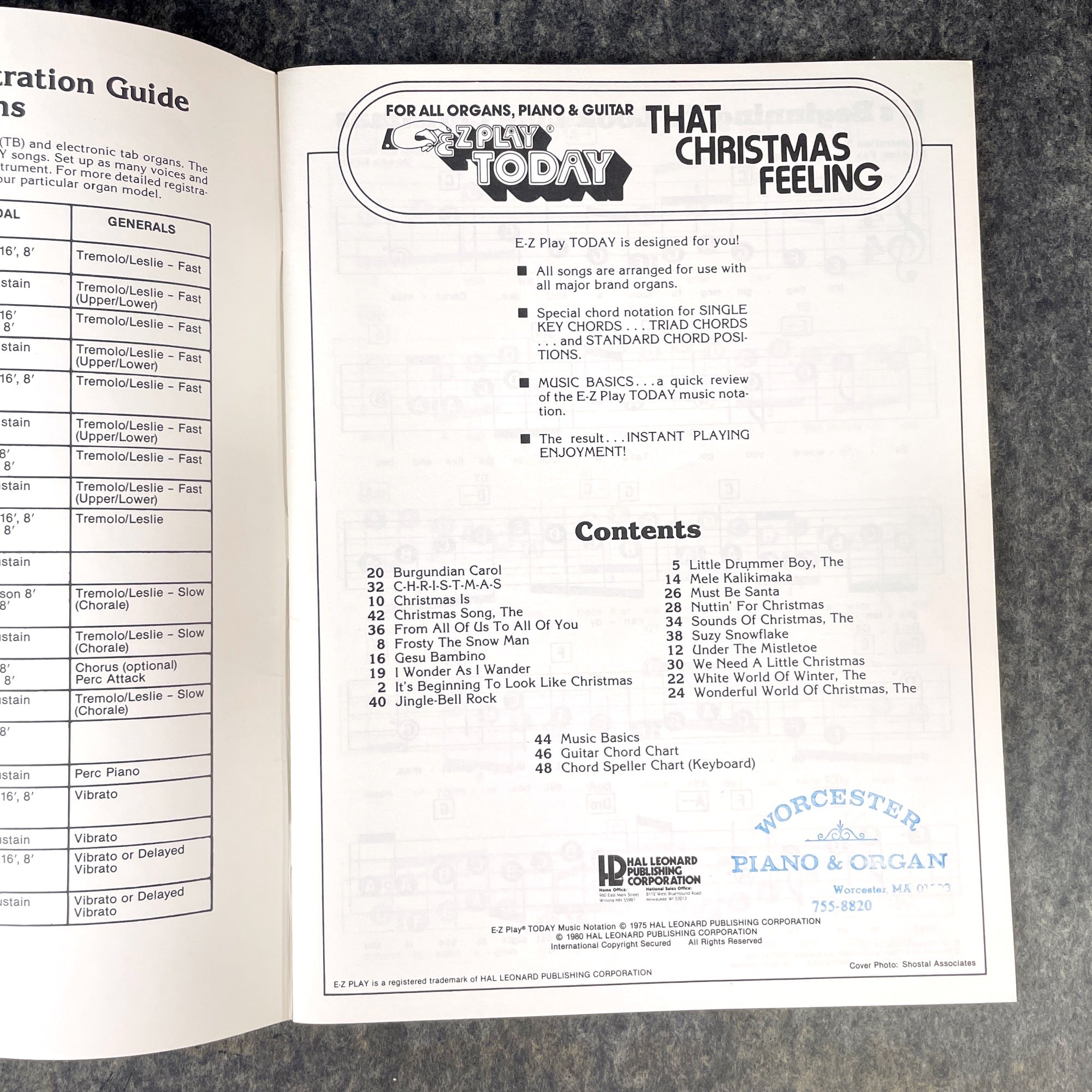 "EZ Play Today: That Christmas Feeling" #134 from Hal Leonard Publishing. For all organs, piano and guitar. Sweetly basic music for popular Christmas songs. See pix for titles. Our favorite is "We Need a Little Christmas," so play that once for us.