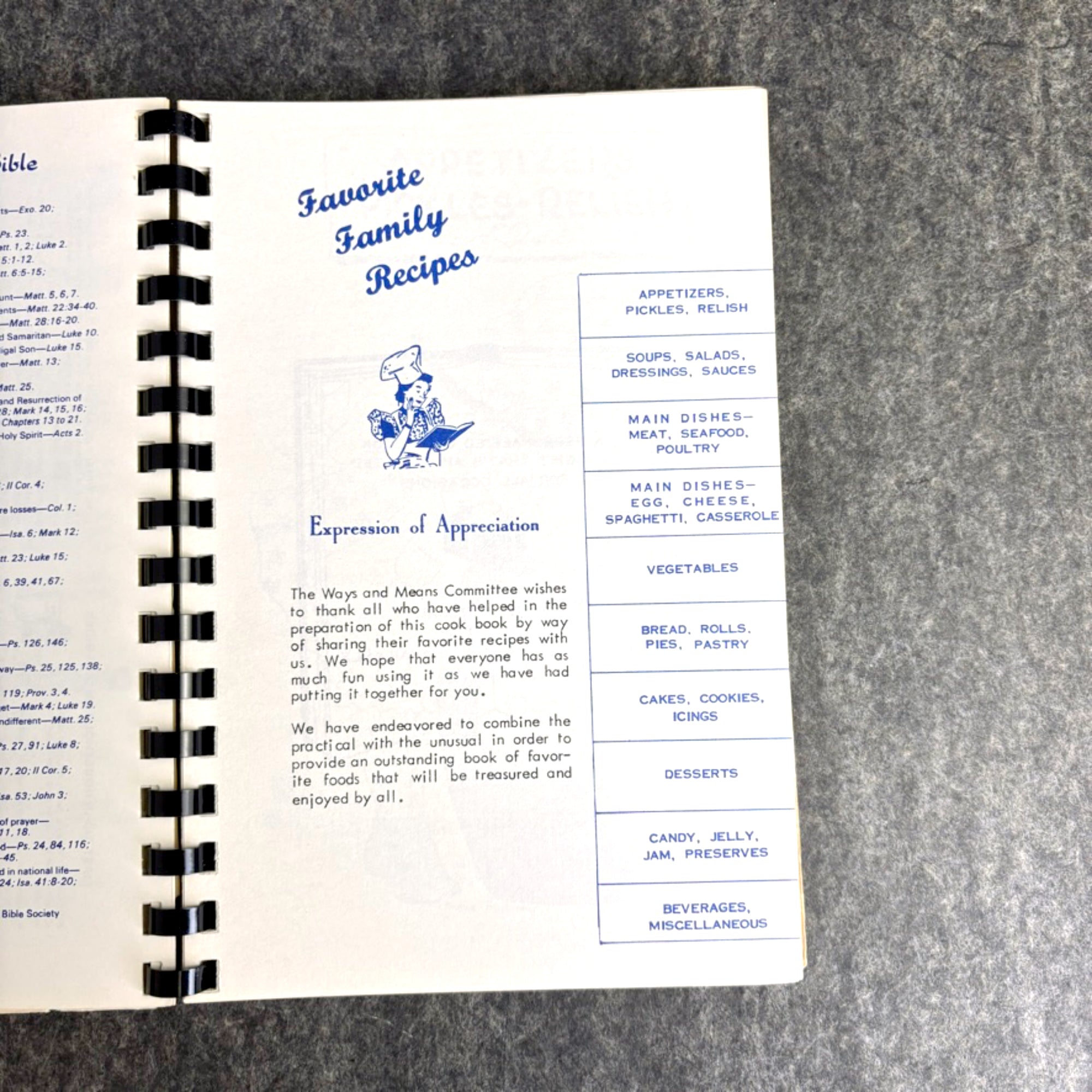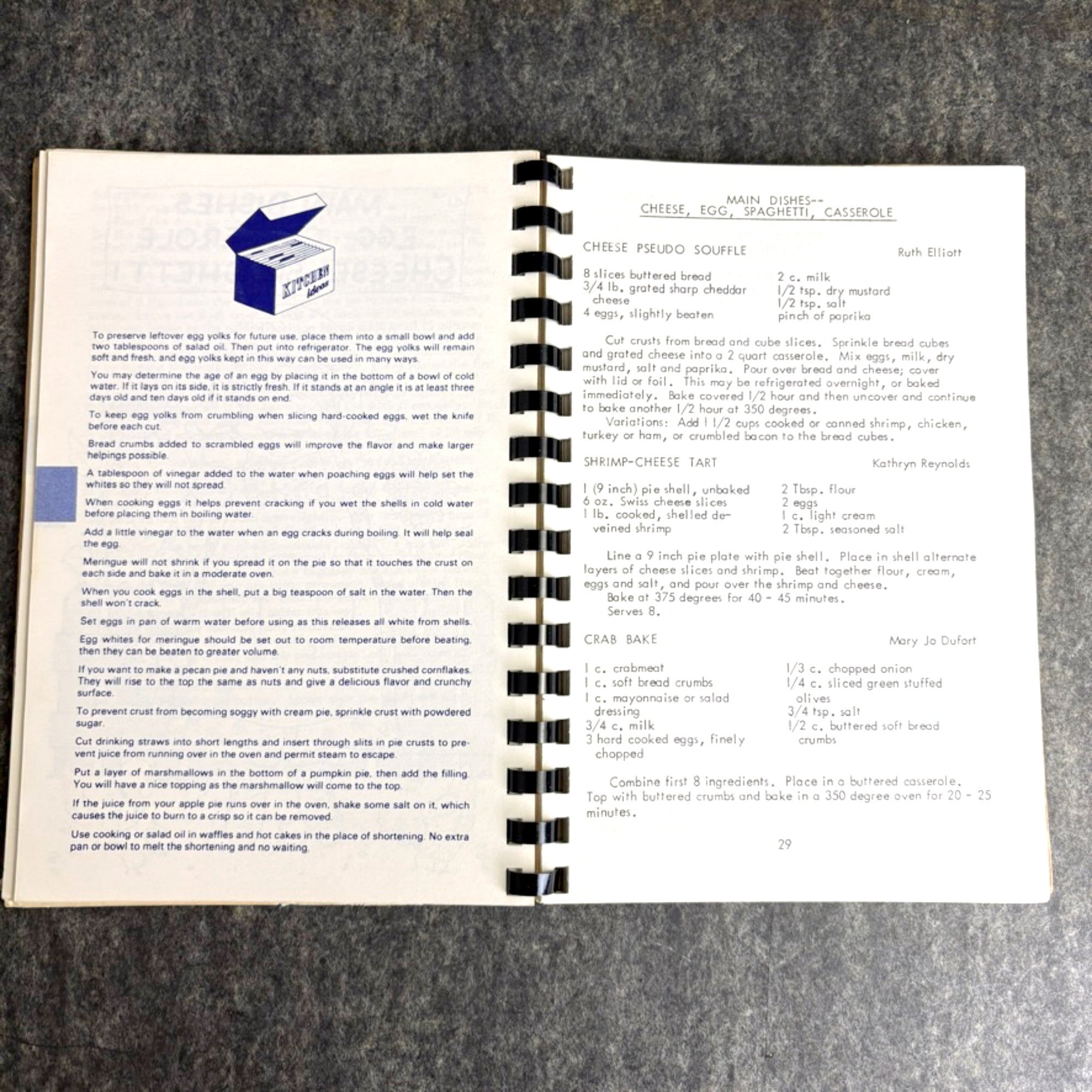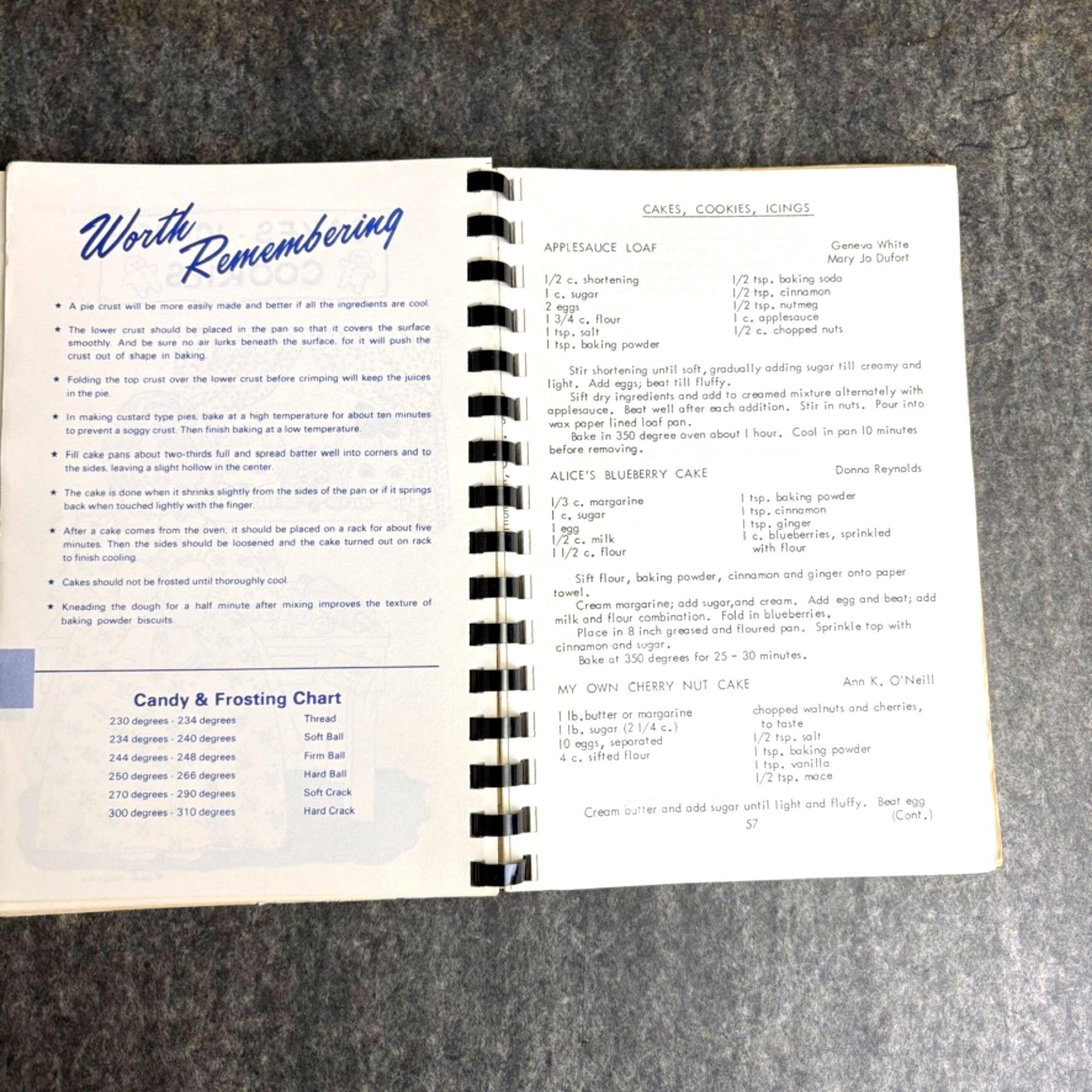 Includes recipes for: Appetizers, Pickles, Relish; Soups, Salads, Dressings, Sauces; Main Dishes - Meat, Seafood, Poultry; Main Dishes- Egg, Cheese, Spaghetti, Casserole; Vegetables; Bread, Rolls, Pies, Pastry; Cakes, Cookies, Icings; Desserts; Candy, Jelly, Jam, Preserves; Beverages, Miscellaneous.