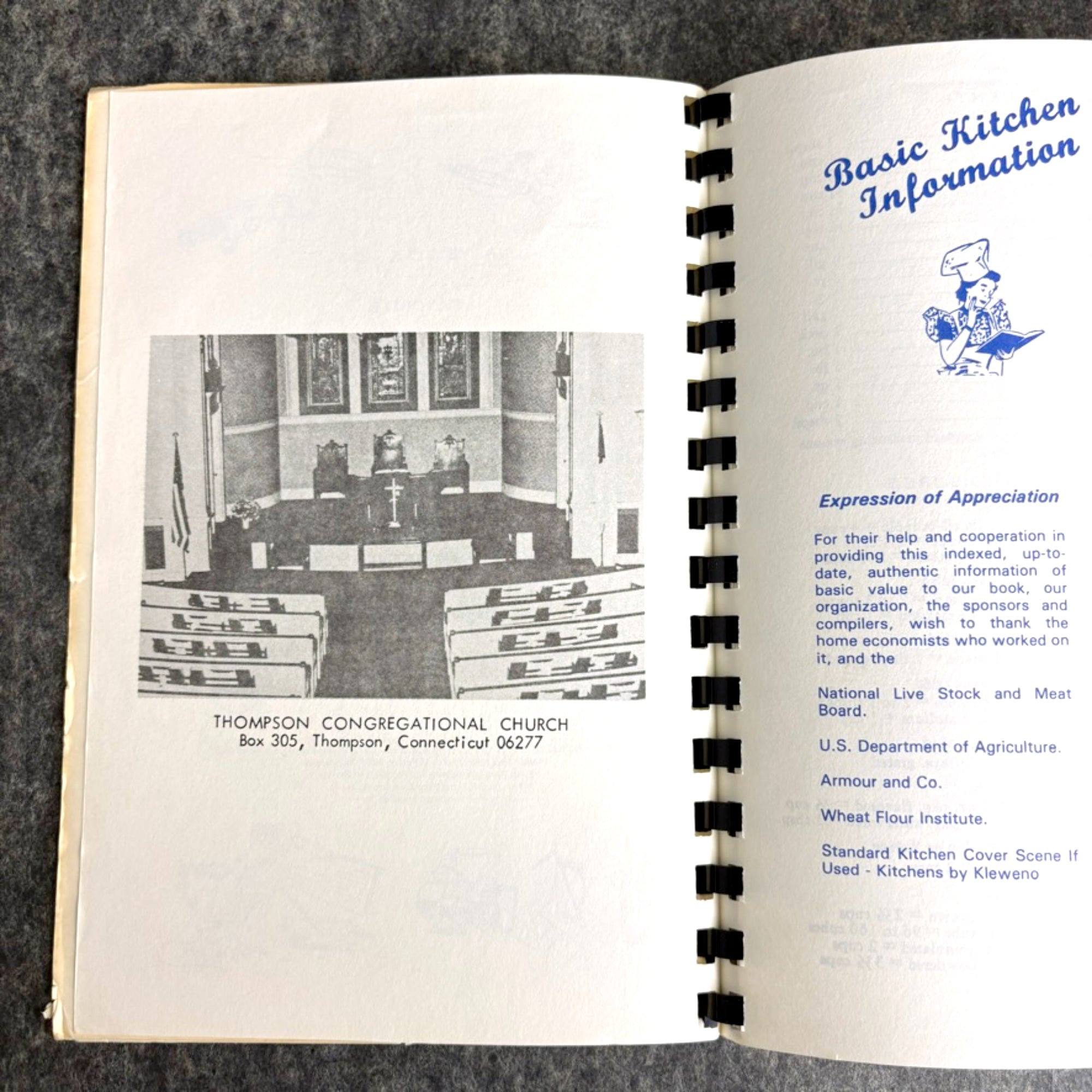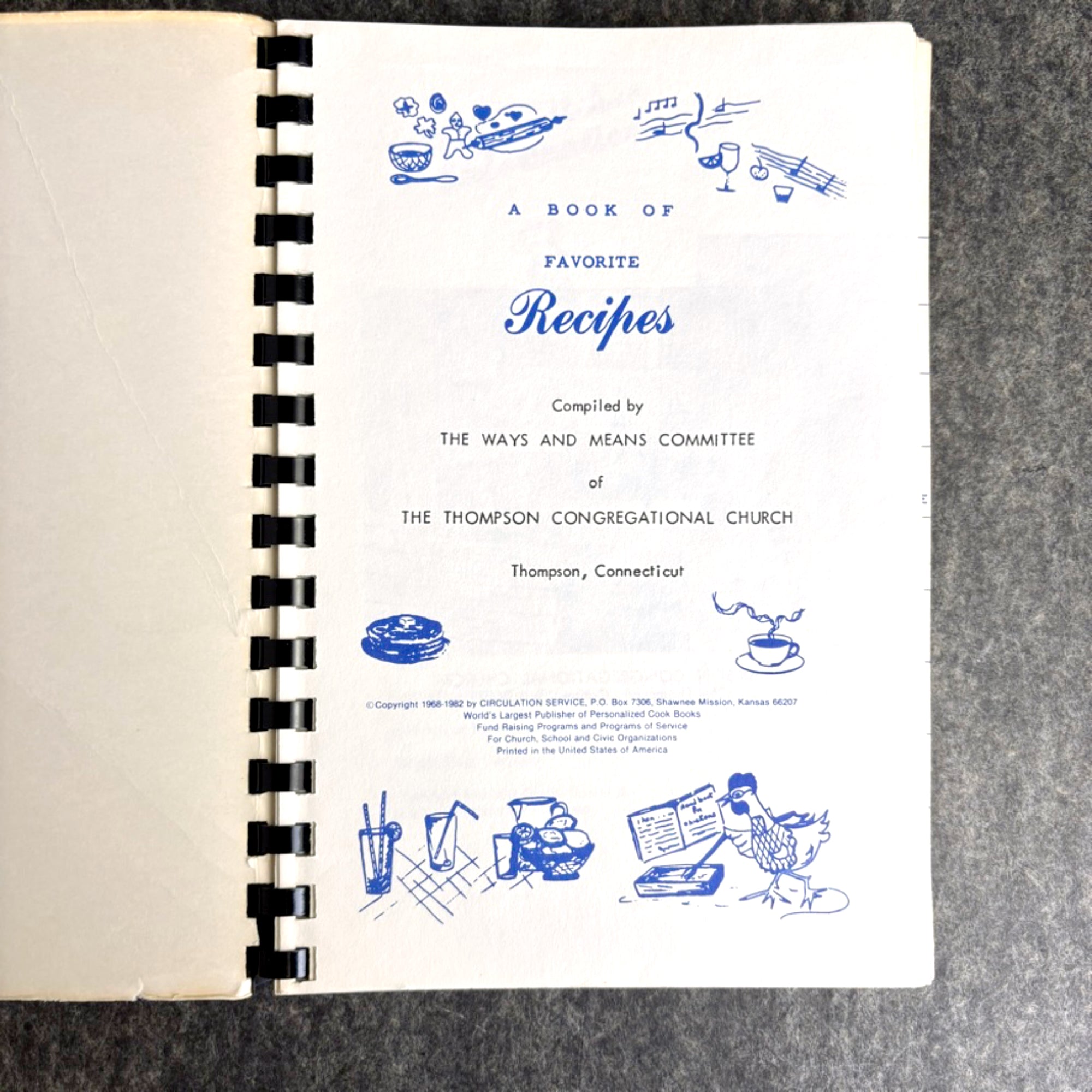 "Favorite Recipes" A book of favorite recipes compiled by the Ways and Means Committee of the Thompson Congregational Church in Thompson, CT. Copyright 1968-1982 by Circulation Service. Comb binding community cookbook with a plethora of basic kitchen information such as equivalents, everyday herb guide, 6 steps to the perfect pie, ways to use leftovers, quantities to serve 100 people, how to remove stains from washables, first aid, and much more to complement the included recipes.