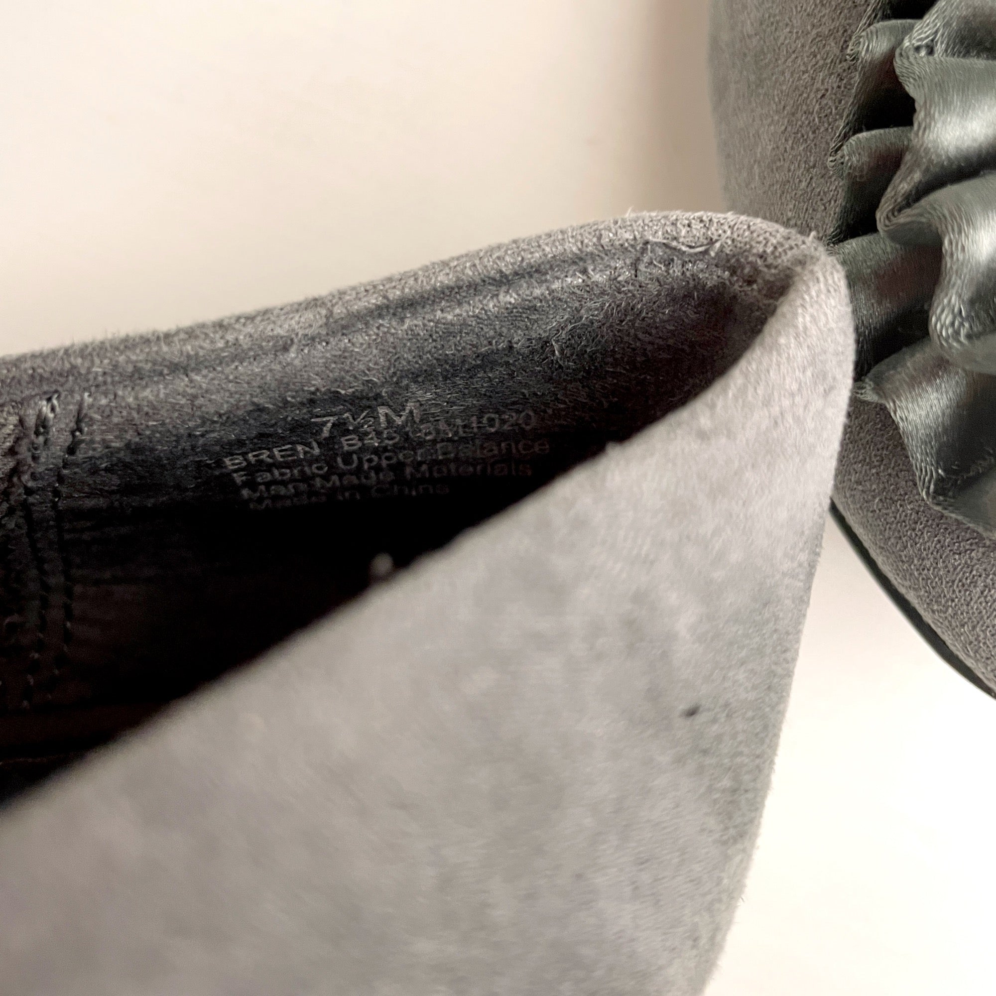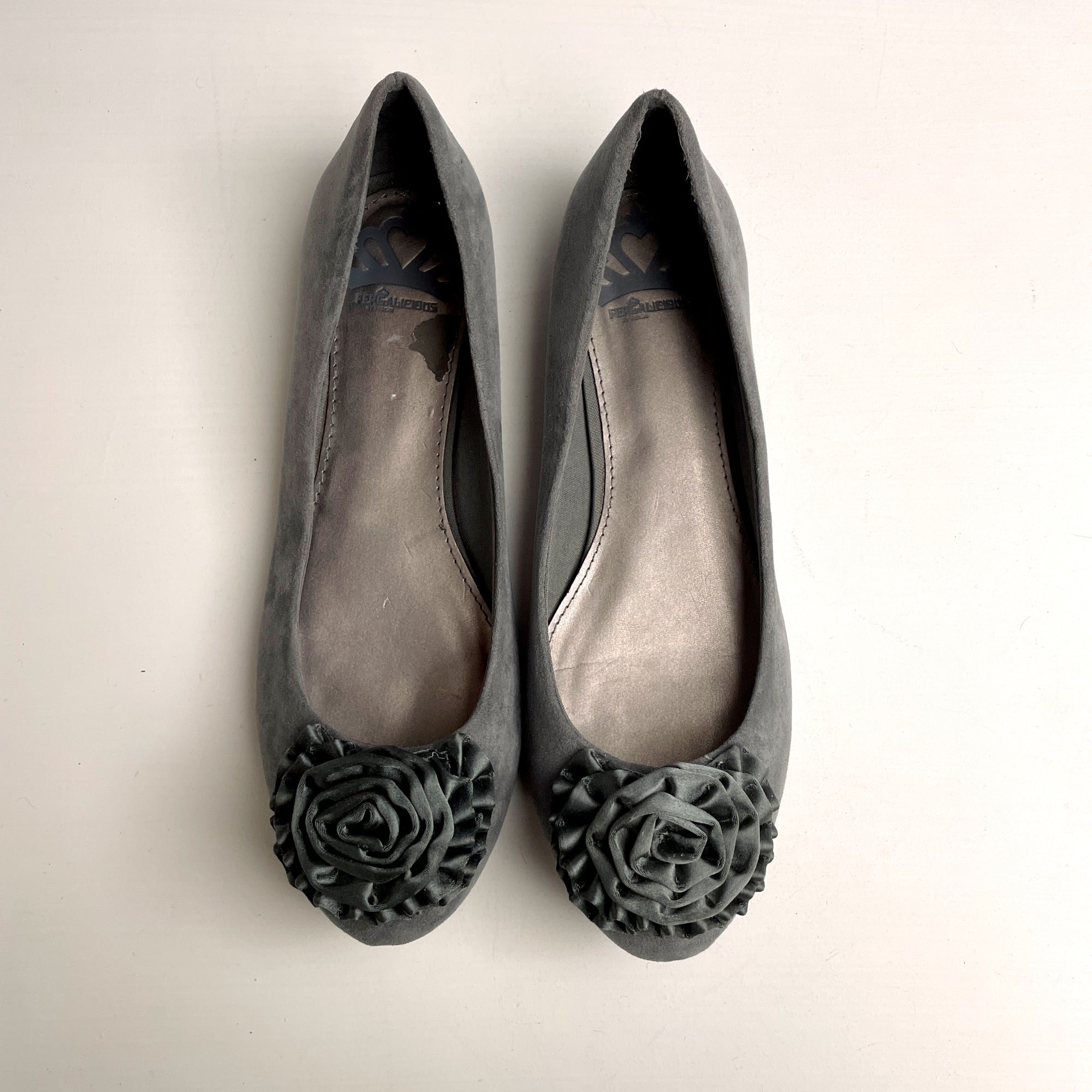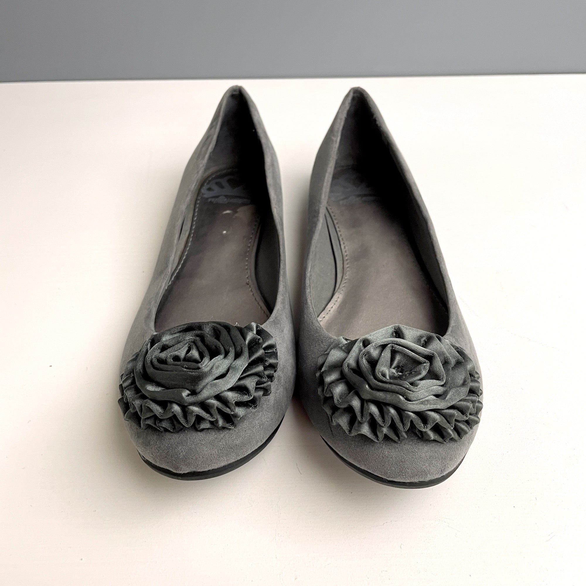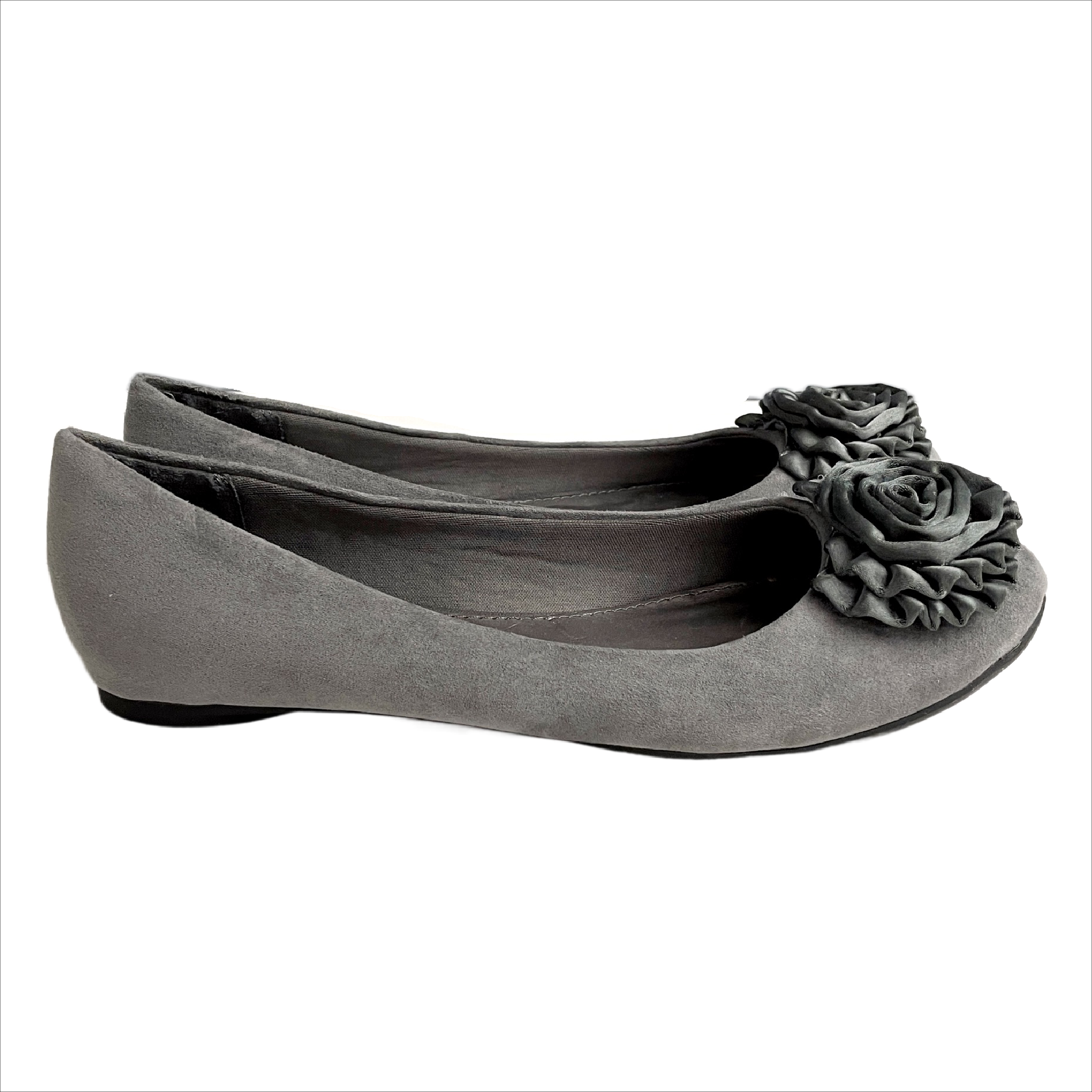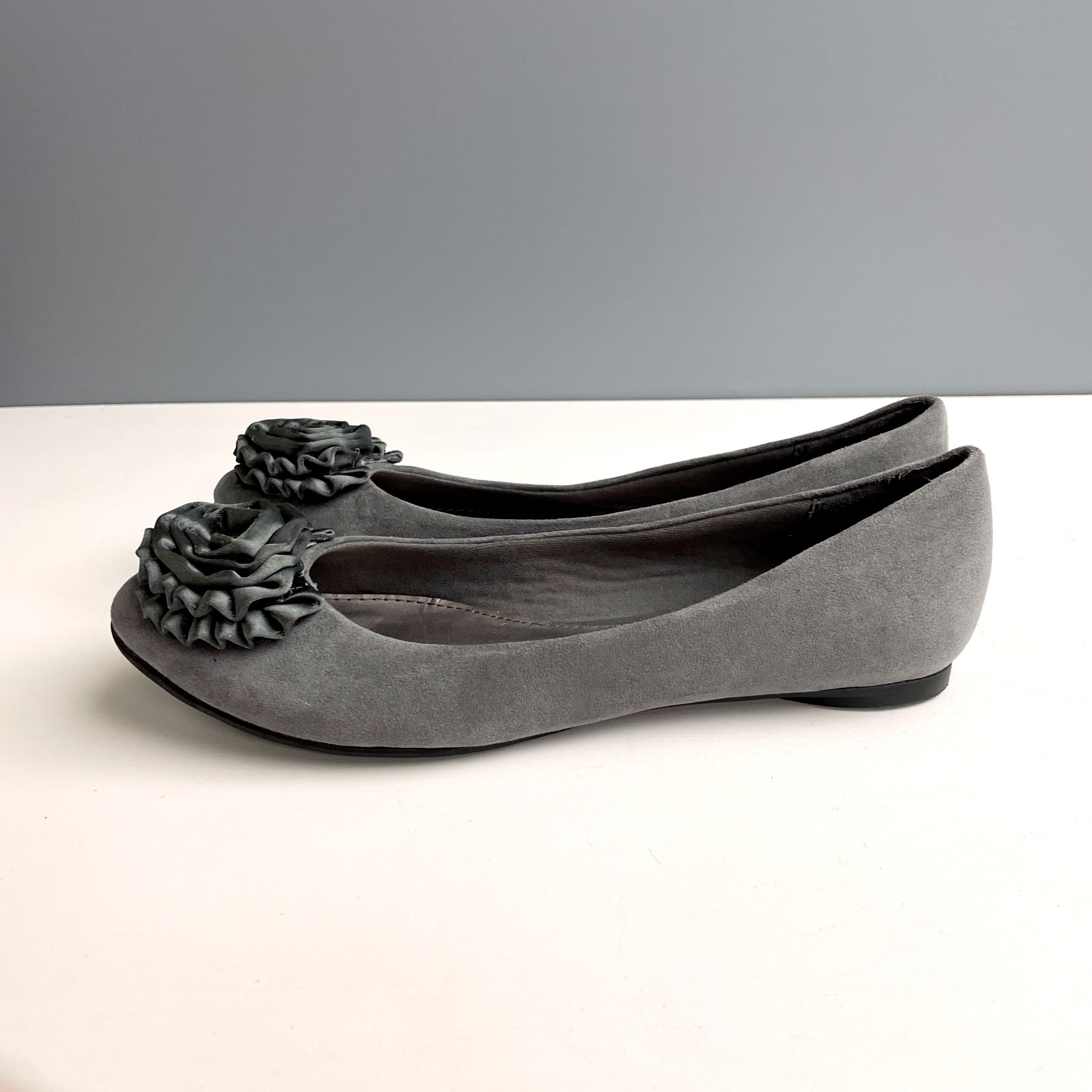 Gray suedecloth ballet flats with crisp satin ribbon flowers from Fergalicious by Fergie. Manmade sole and small heel. Padding insidePerfect with a dress, skirt or jeans. Add subtle style with the flower accent.