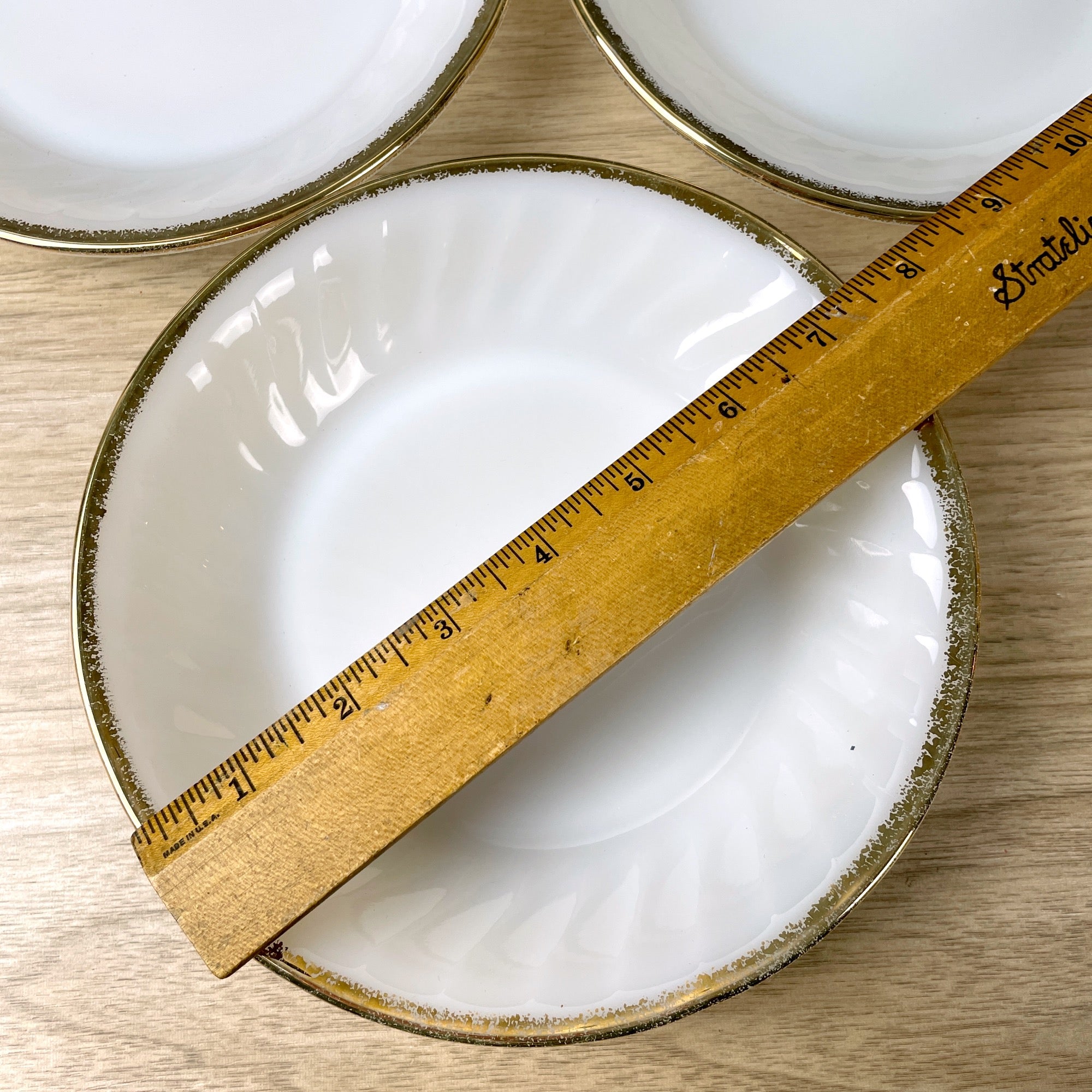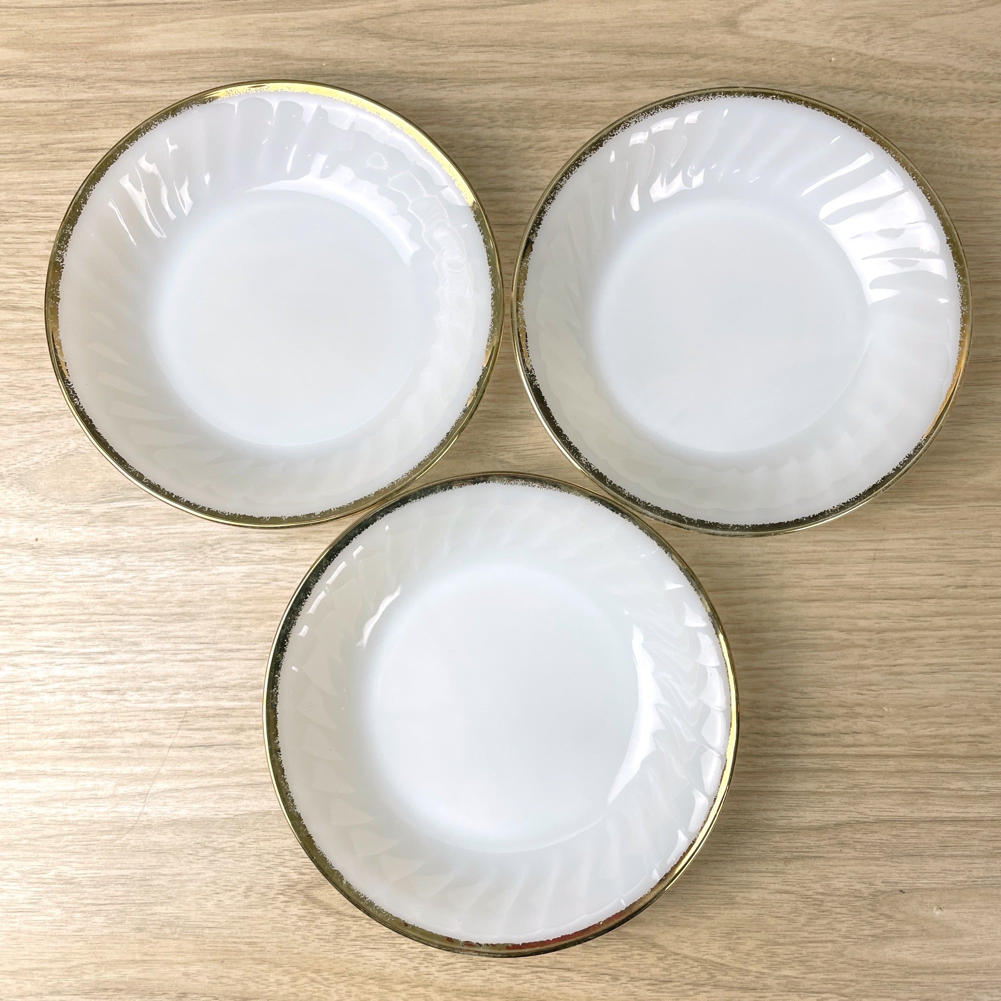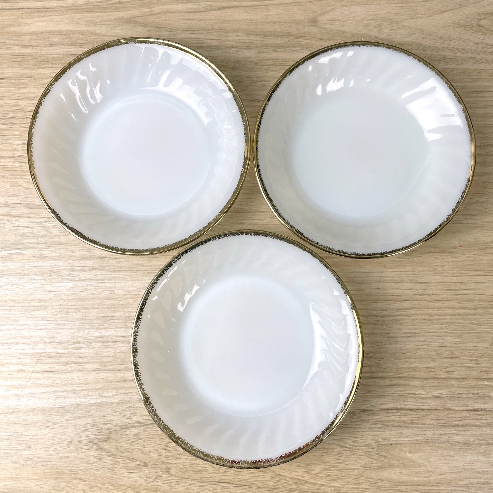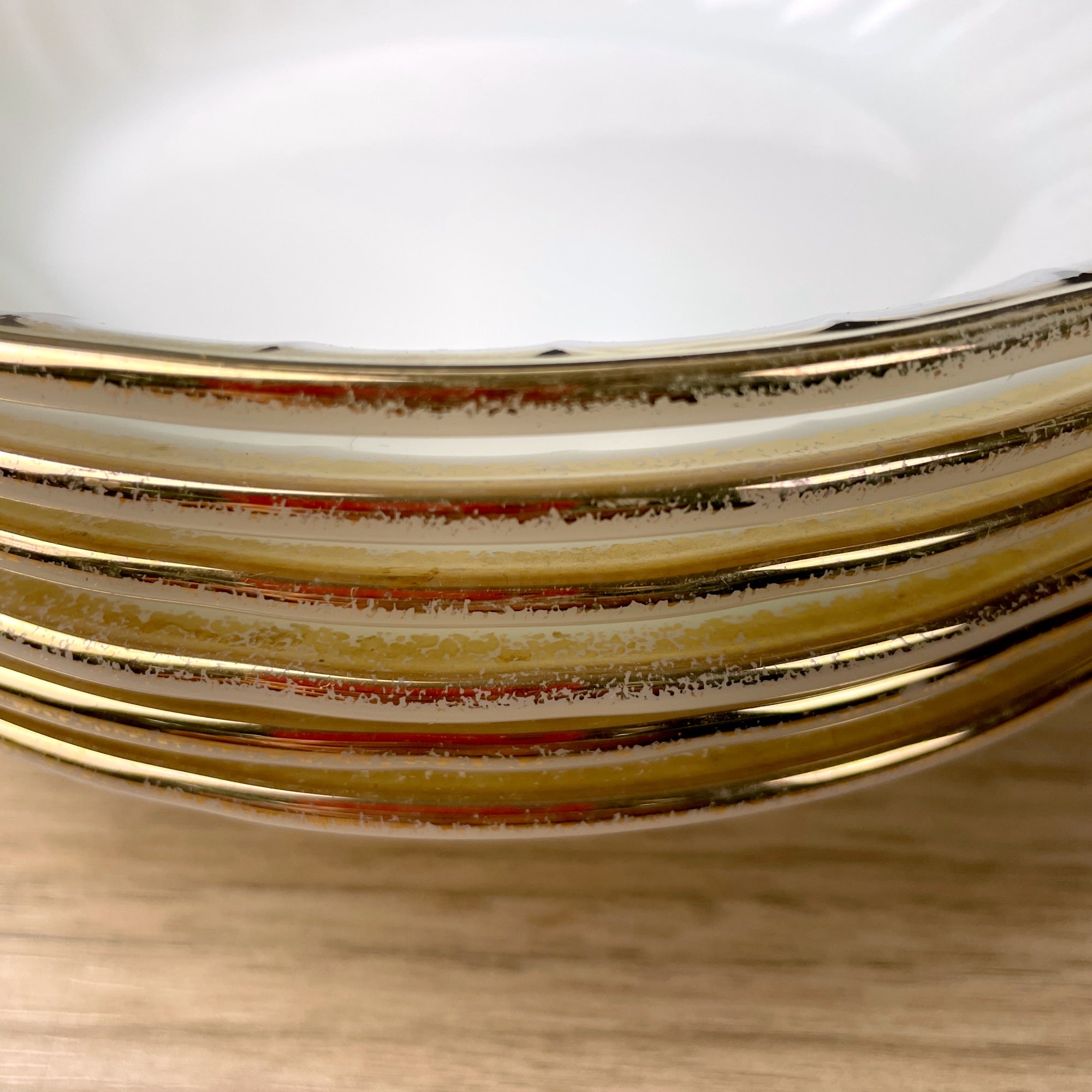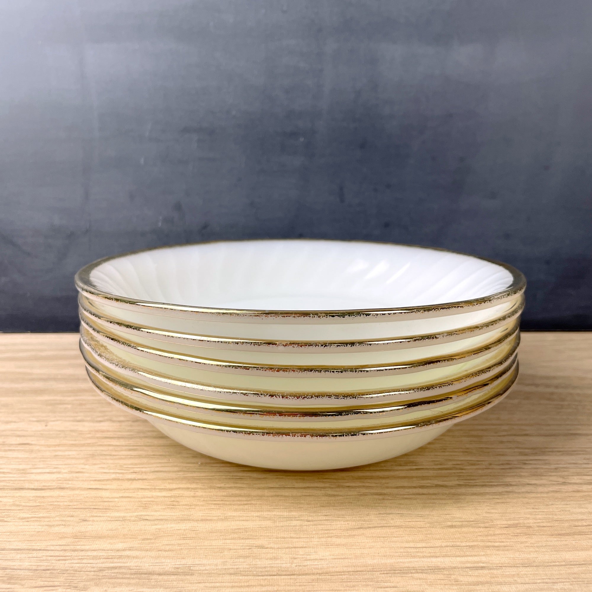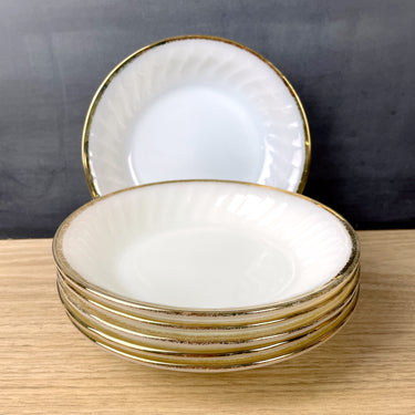 Set of 6 vintage Fire King Swirl coupe bowls with gold banding on the edges. Pattern was made from 1949-1962.