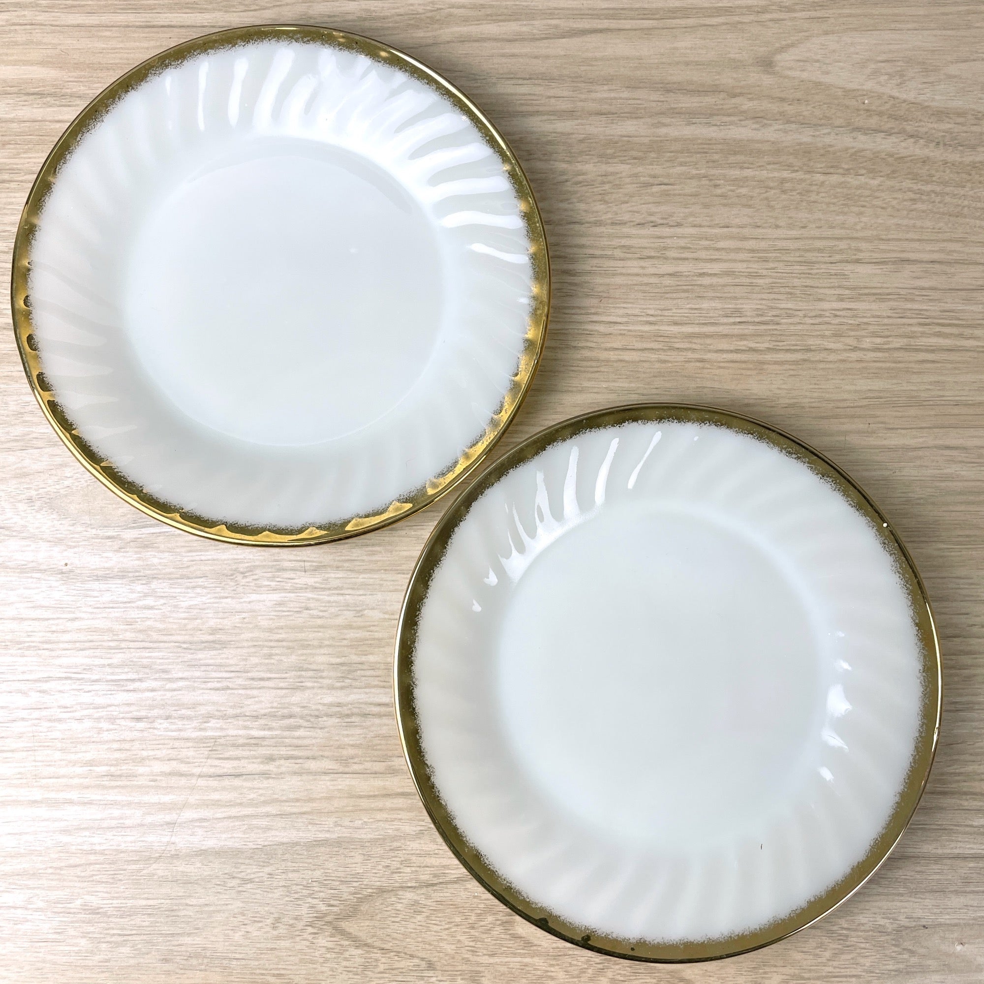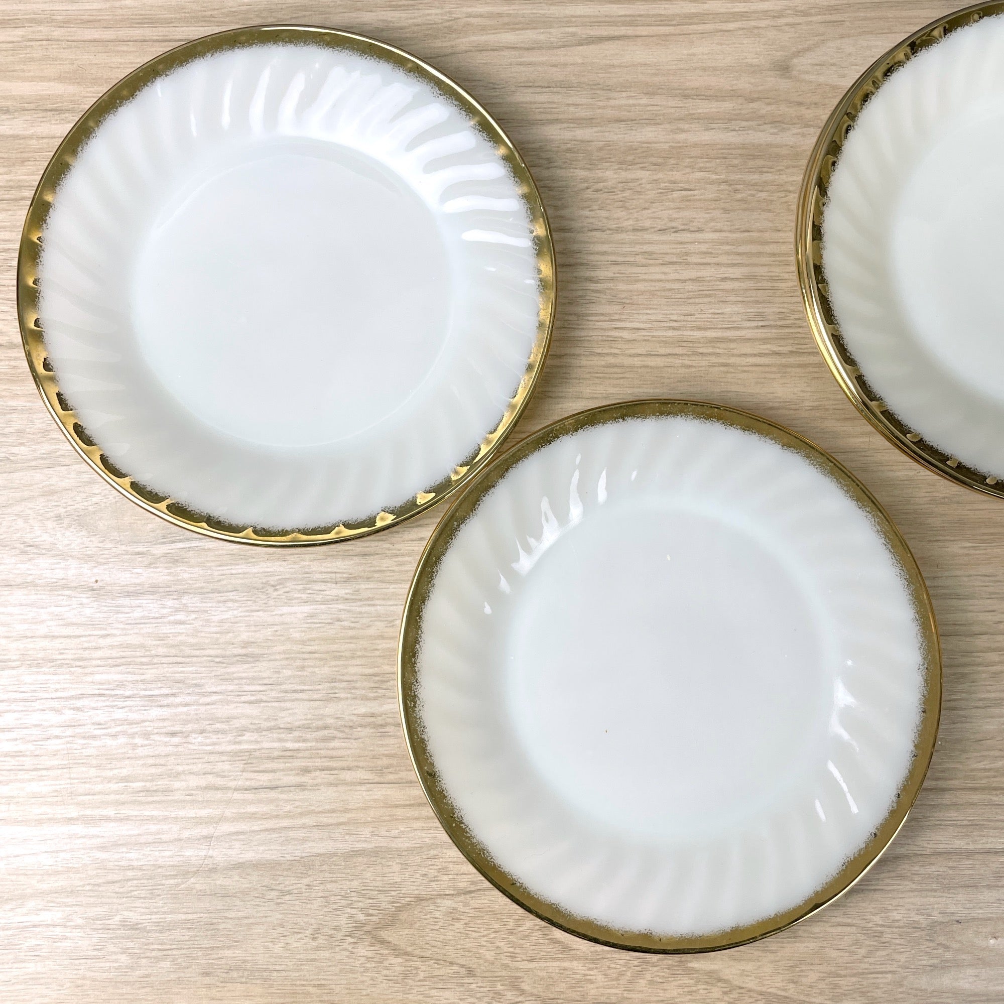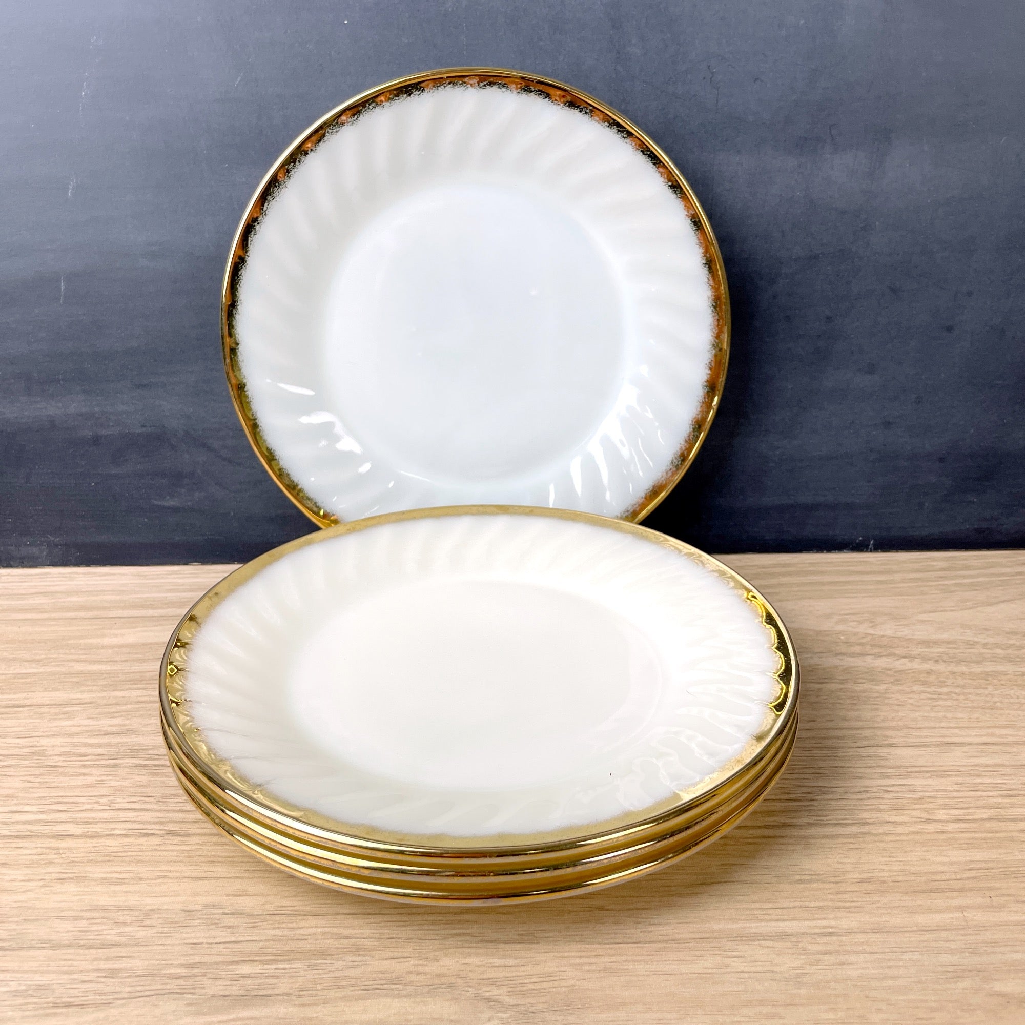 Set of 4 vintage Fire King Swirl dinner plates with gold border on the edges. Pattern was made from 1949-1962.