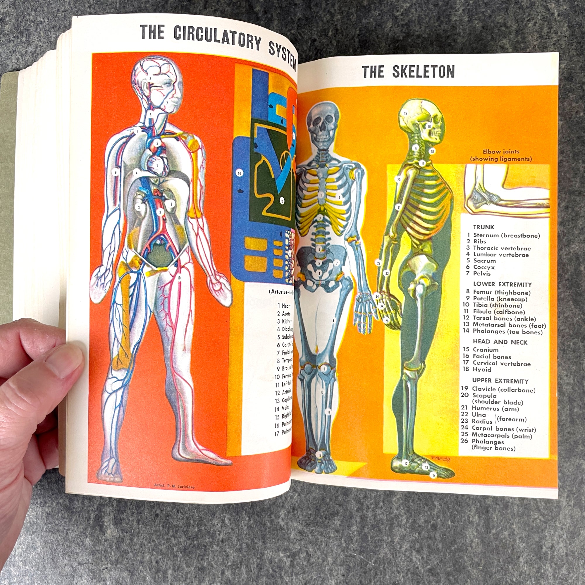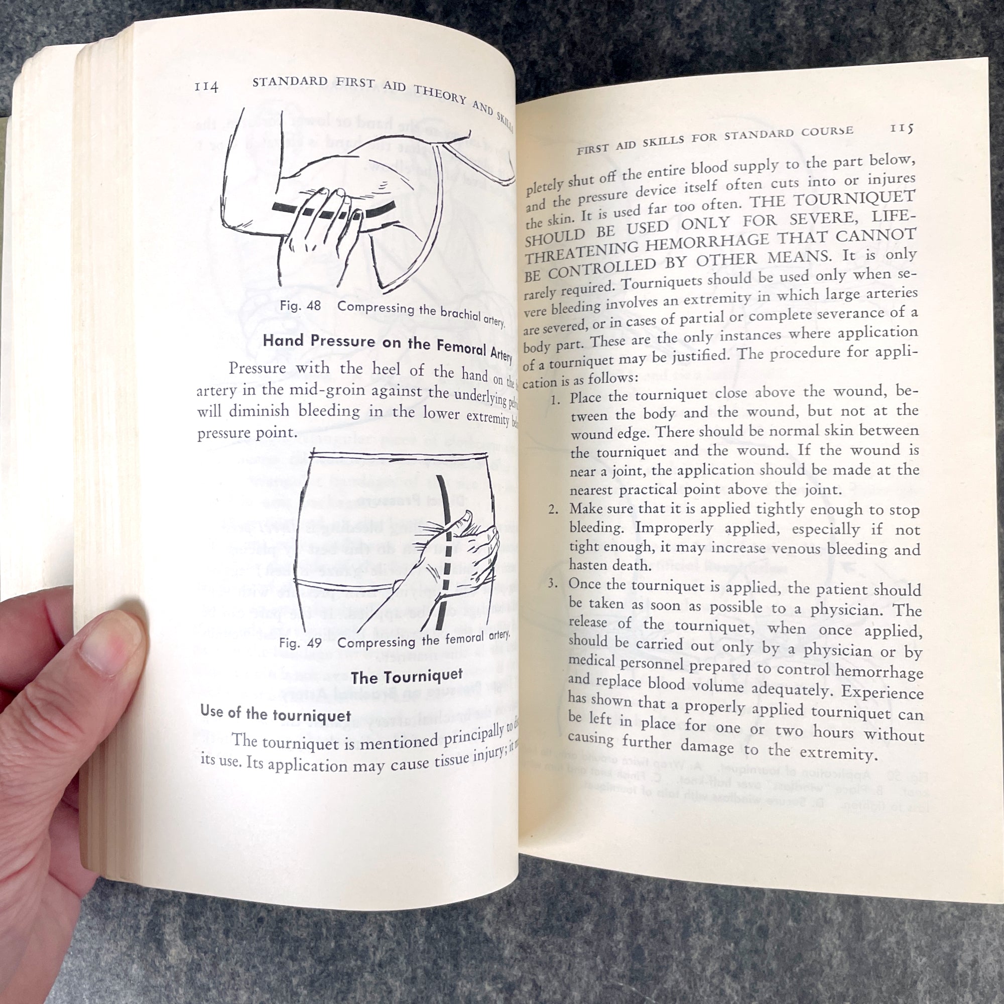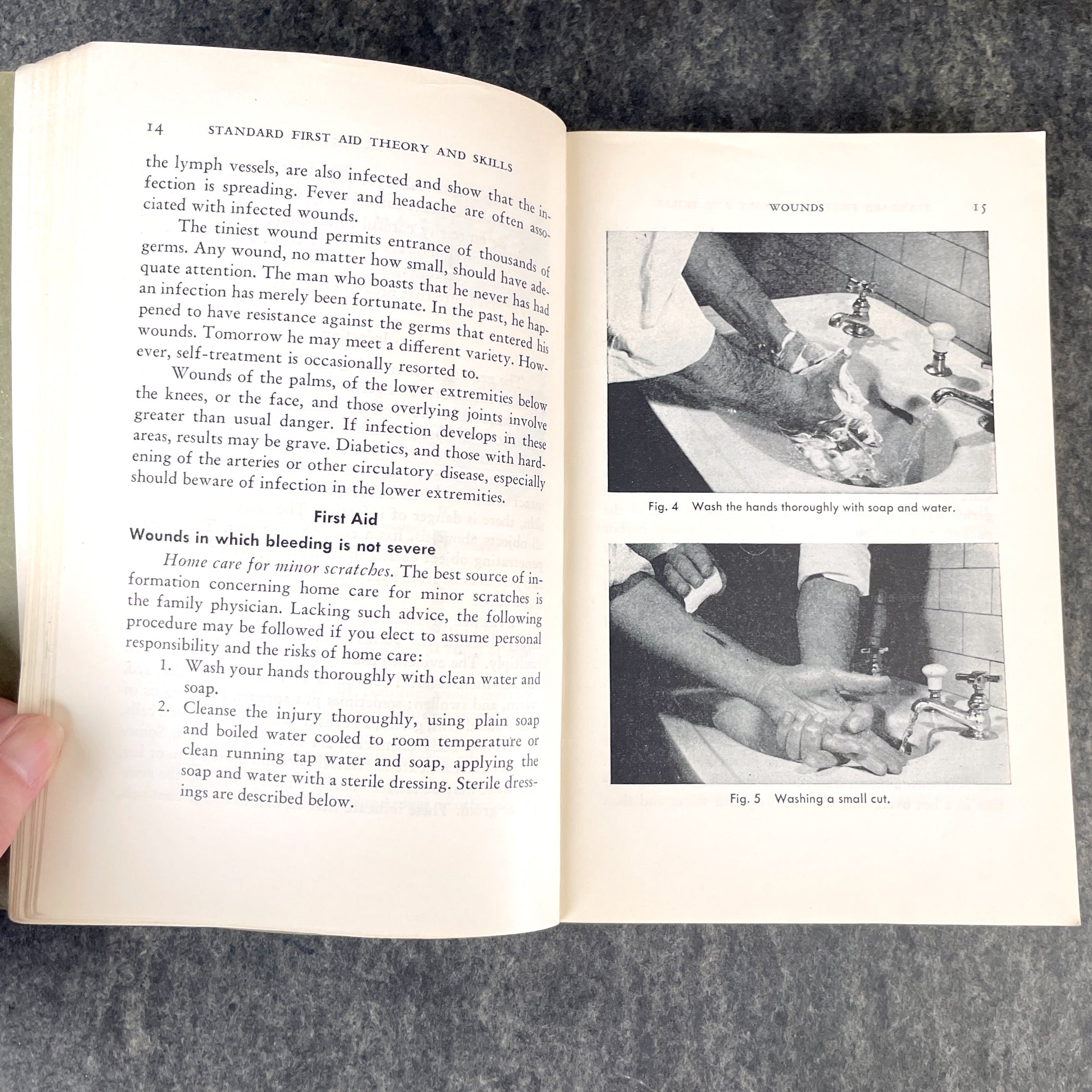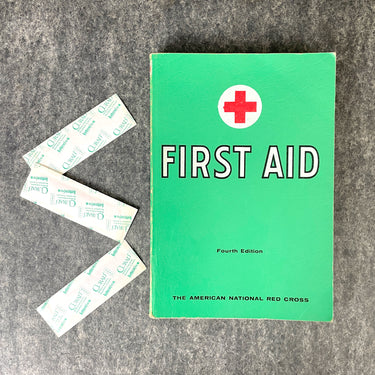 Softcover copy of the American Red Cross First Aid, Fourth Edition, with 249 Illustrations. "Prepared by The American National Red Cross for the Instruction of First Aid Classes." Lots of cool line-drawings and photos, with a color section of Illustrative plates in the center. Fun gift for a soon-to-be medical or nursing student! Soft green cover, book is bound with staples.