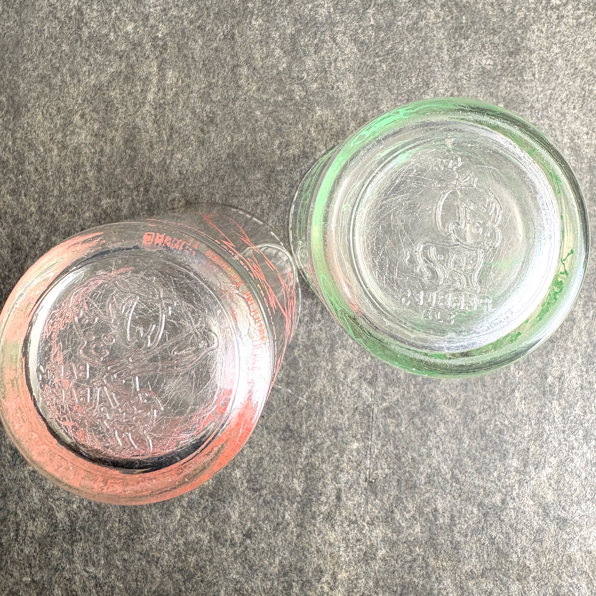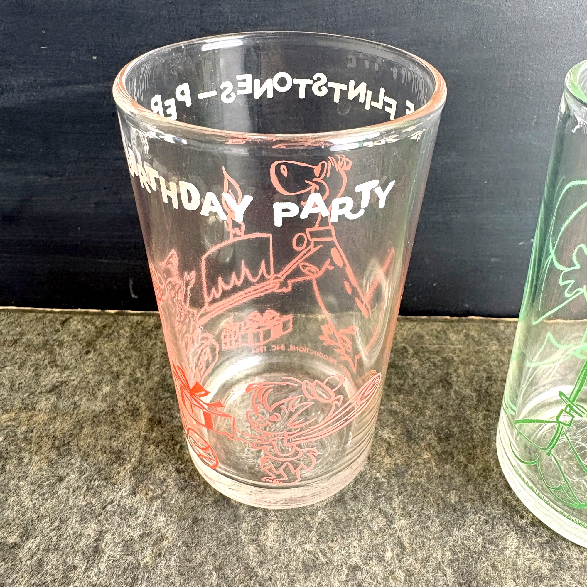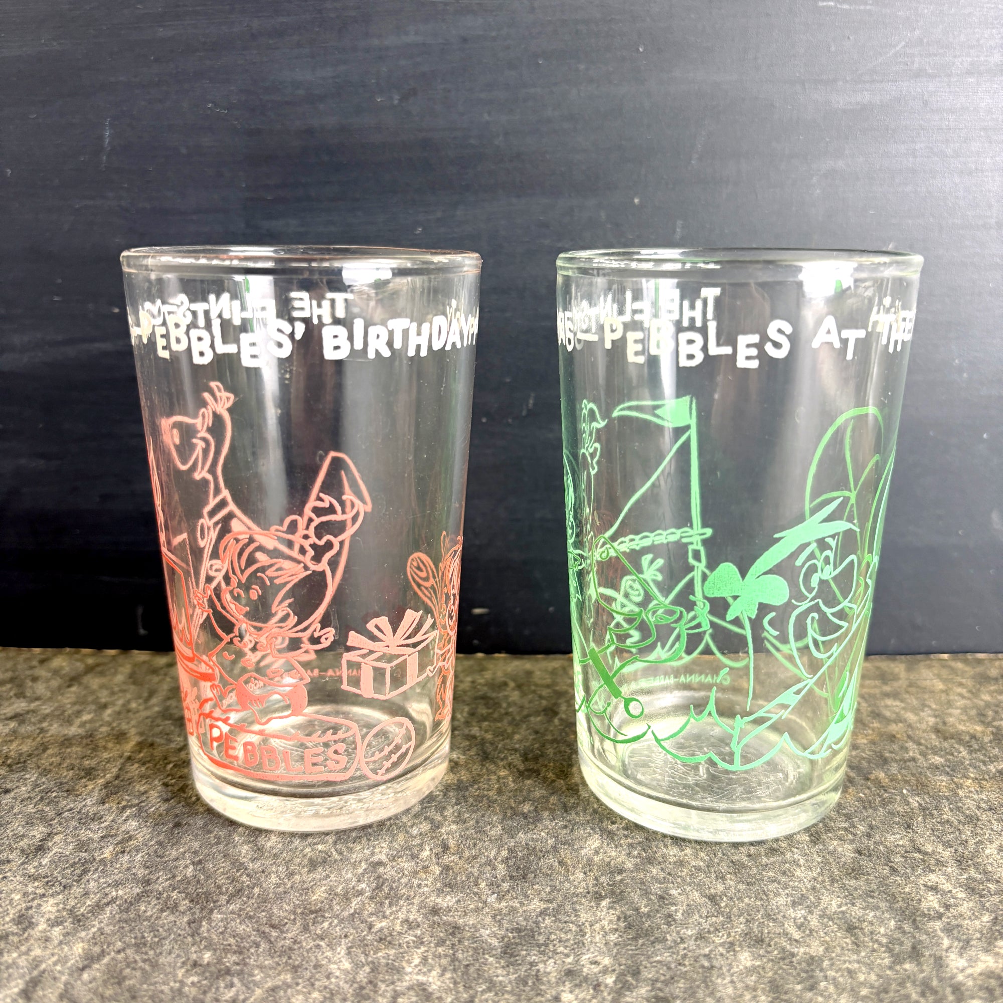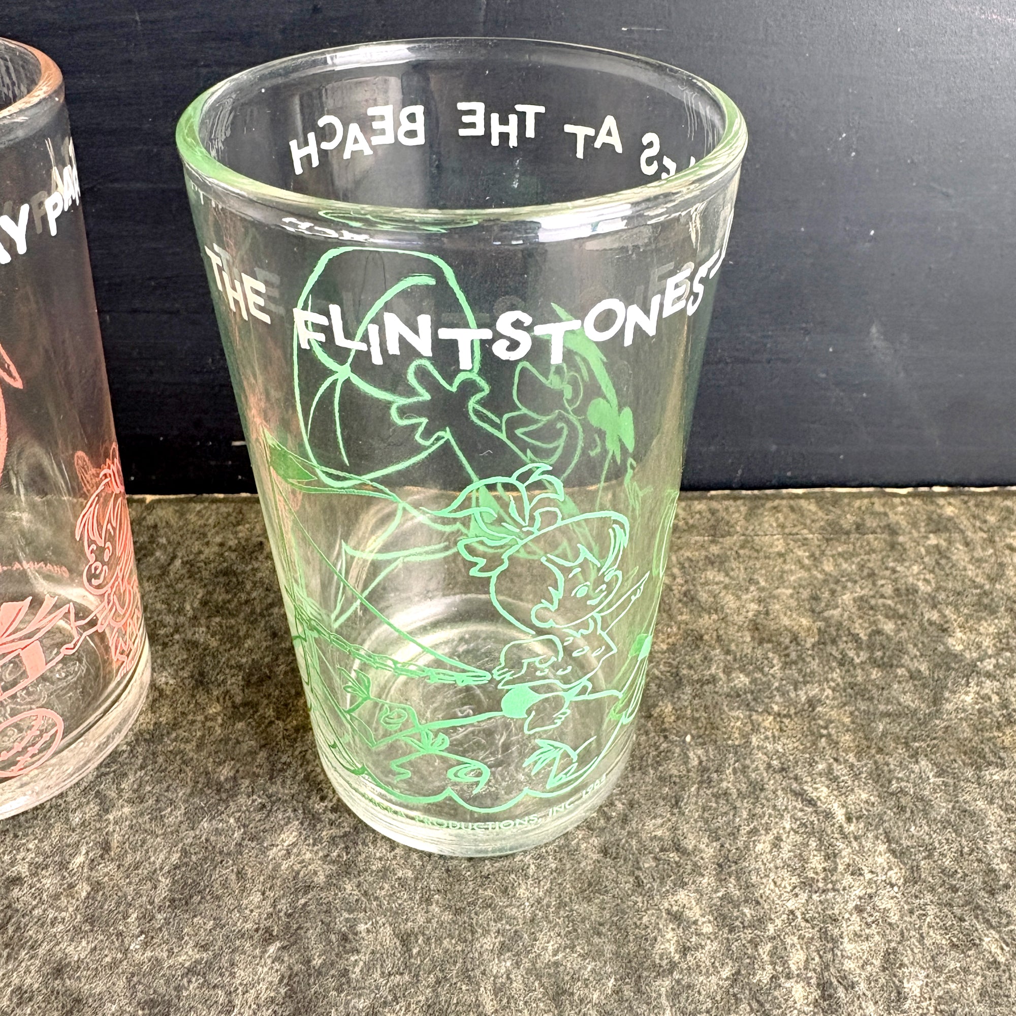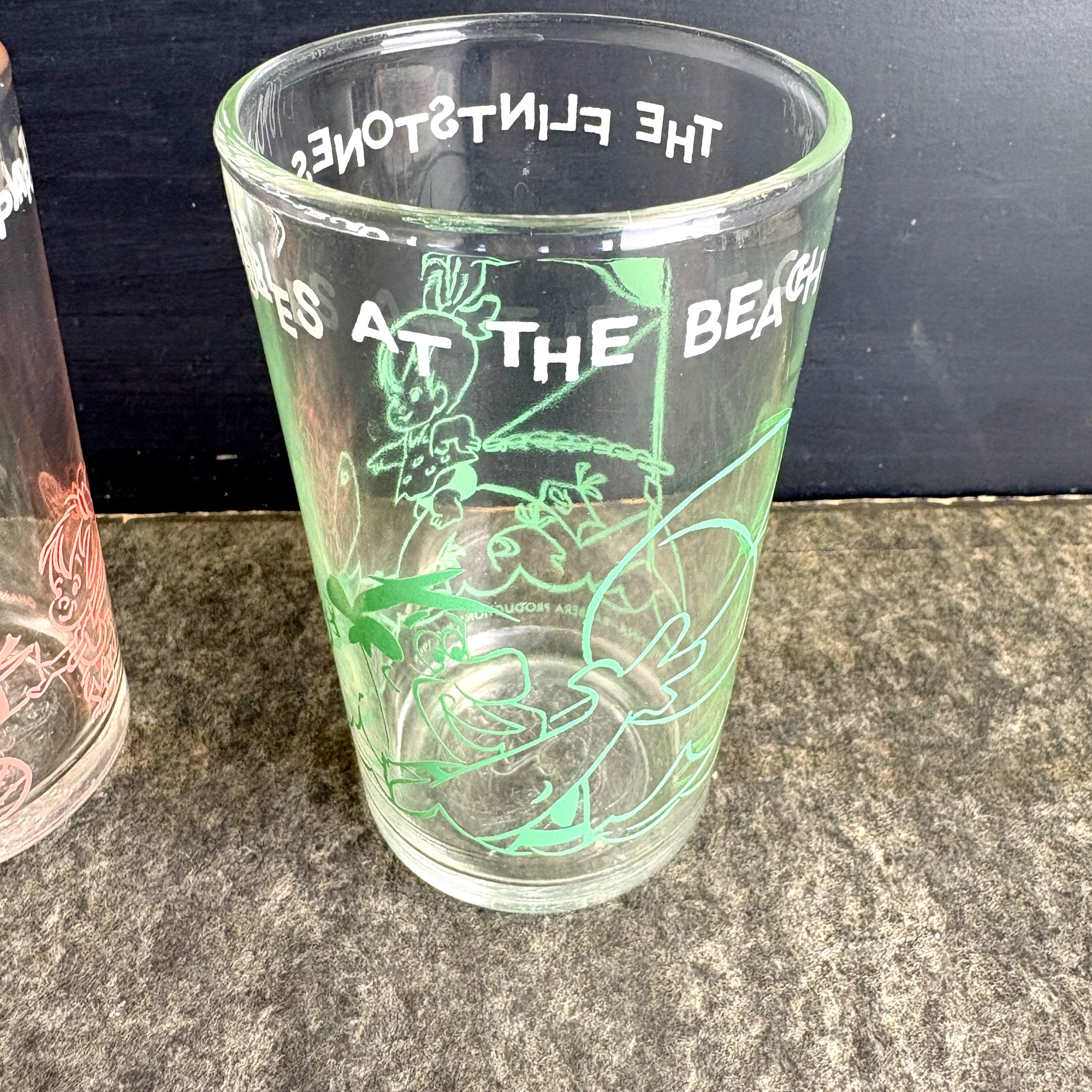 Meet the Flintstones on these fabulous vintage Welch's jelly jar glasses featuring Baby Pebbles, Fred, Dino, and Bam Bam. Marked Hanna Barbera 1964. Oh how we remember the fun of getting to the bottom of the jelly and getting to use these fun glasses. Pebbles' Birthday Party in pink shows Dino carrying a cake to Pebbles and Bam Bam carrying a gift, with Bam Bam featured on the bottom. Pebbles at the Beach in green shows Fred with a beach ball and Pebbles watching Dino go for a swim, with Pebbles featured on the bottom.