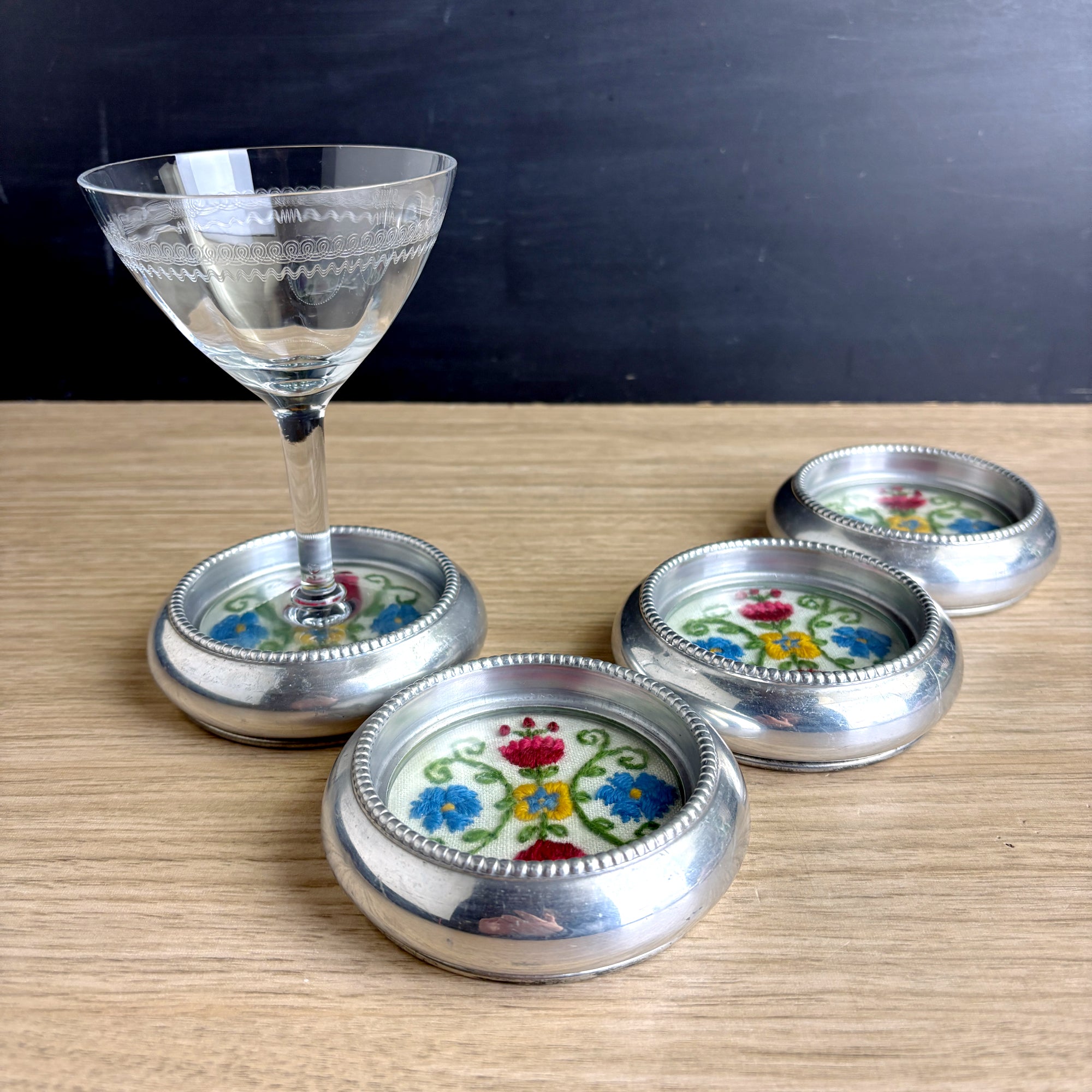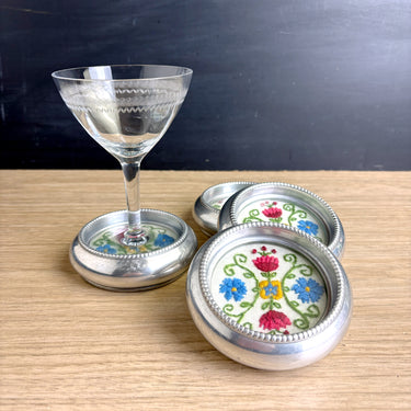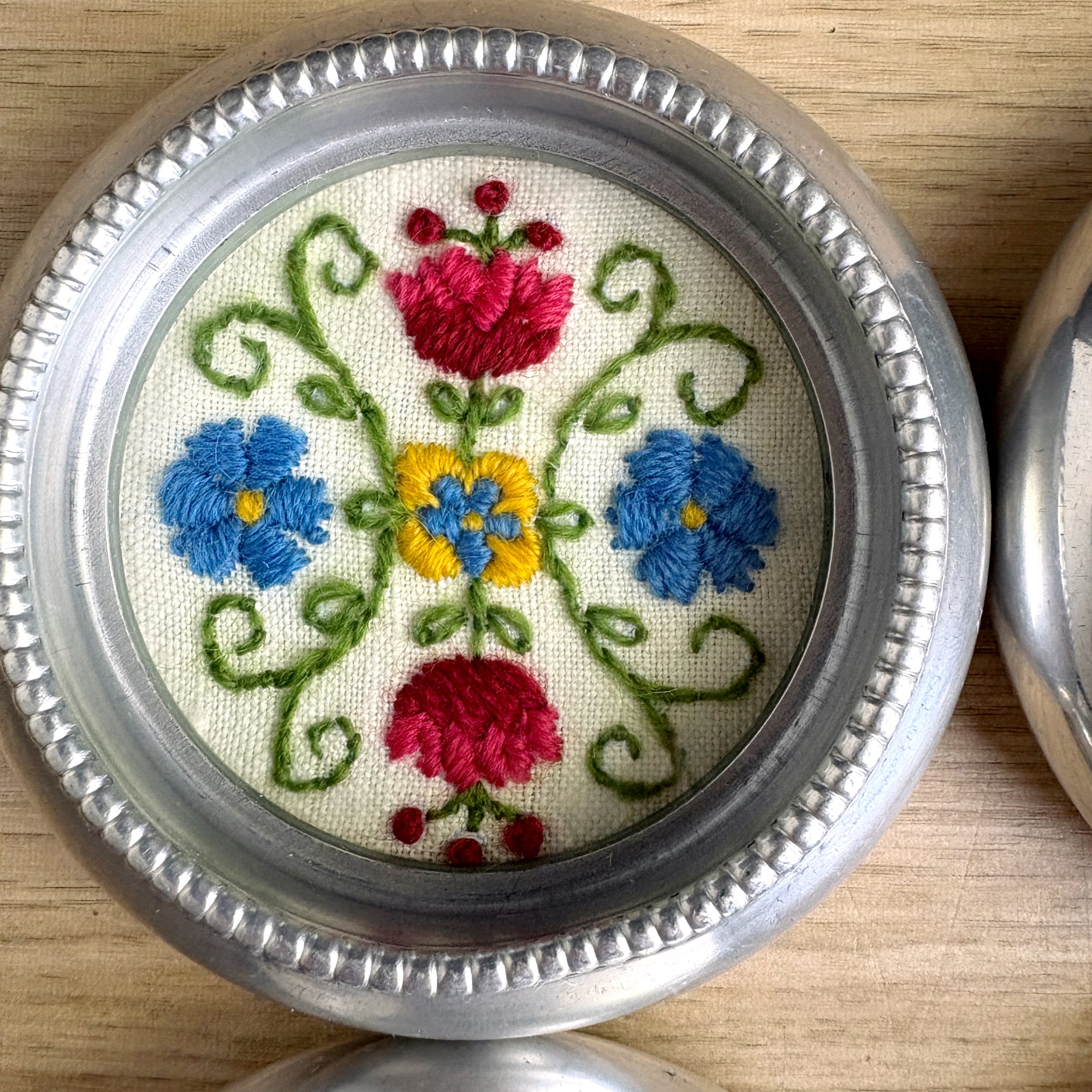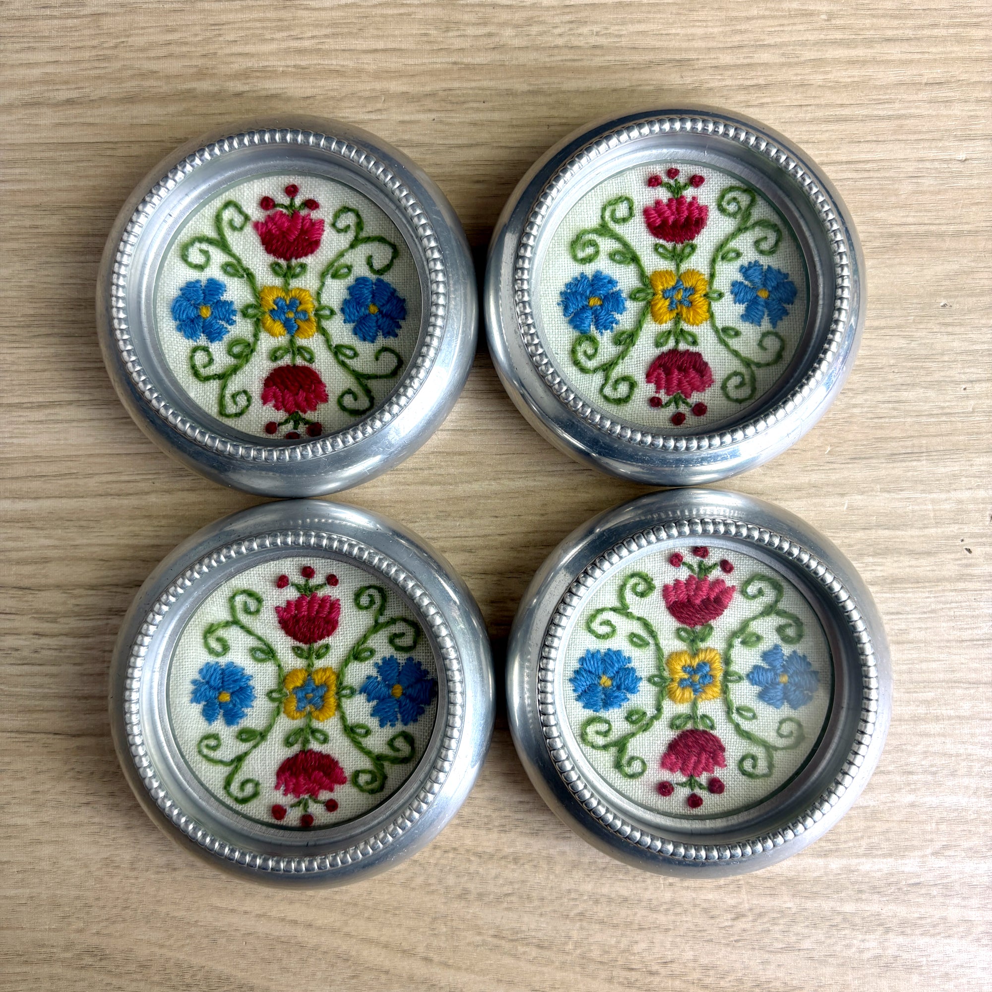 Set of 4 metal and glass coasters feature hand-embroidered flowers "framed" under the glass. You can pop open the frames to change out the embroidery - maybe use seasonal artwork - but the embroidery is nicely done. They stack neatly. Coaster frame marked made in Hong Kong. Coasters stack nicely.