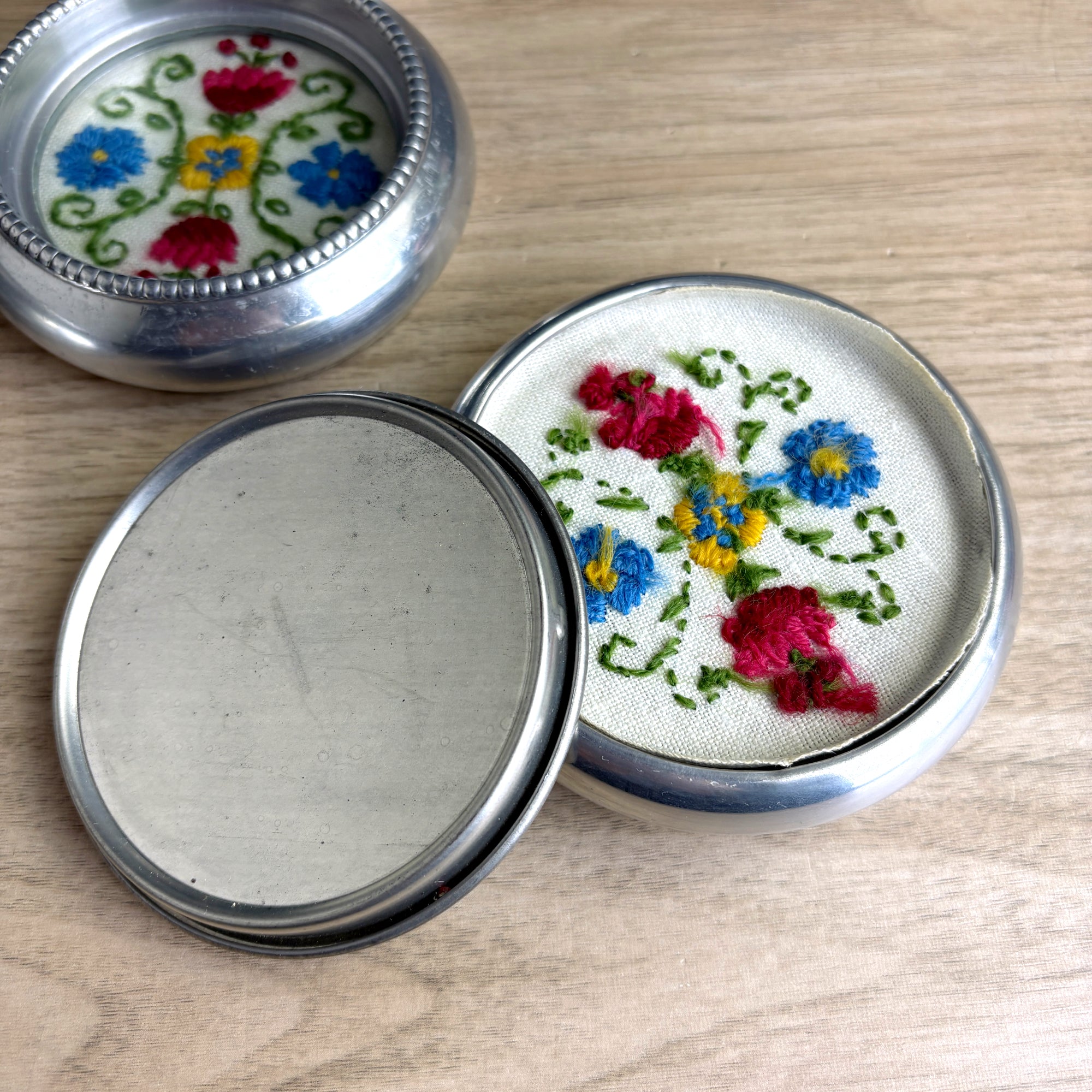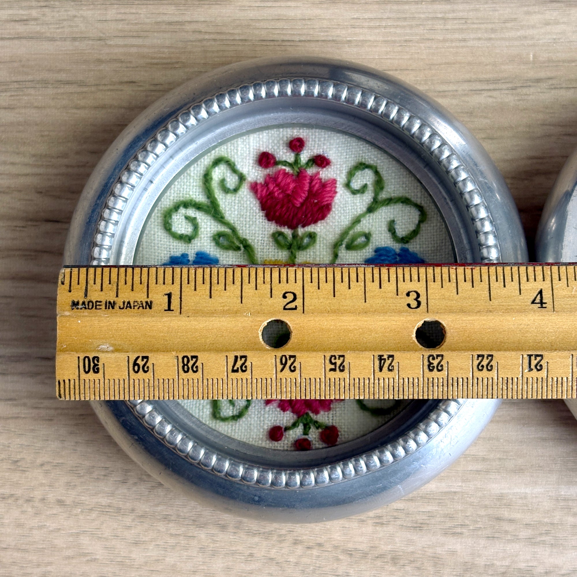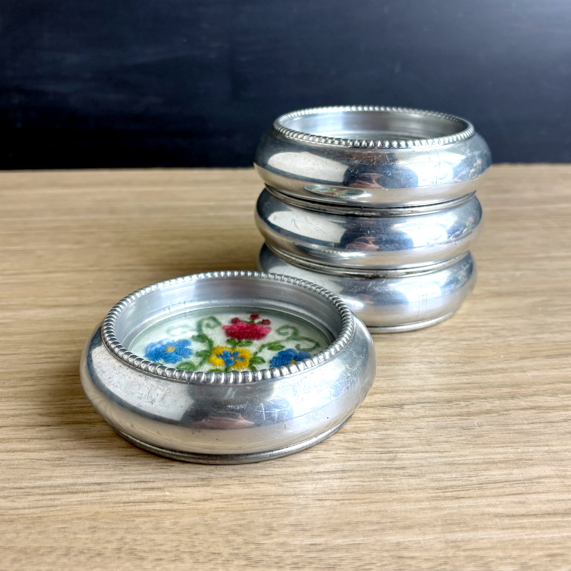 Set of 4 metal and glass coasters feature hand-embroidered flowers "framed" under the glass. You can pop open the frames to change out the embroidery - maybe use seasonal artwork - but the embroidery is nicely done. They stack neatly. Coaster frame marked made in Hong Kong. Coasters stack nicely.