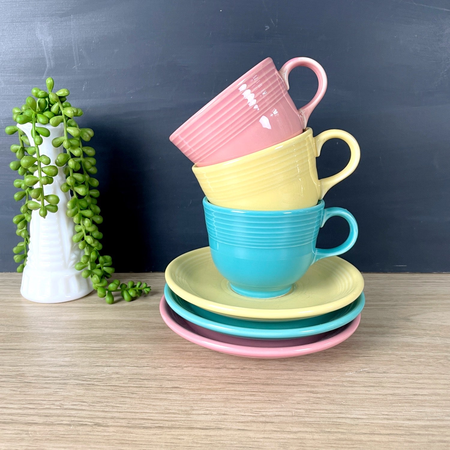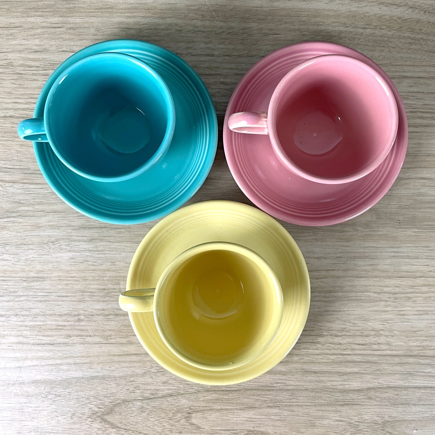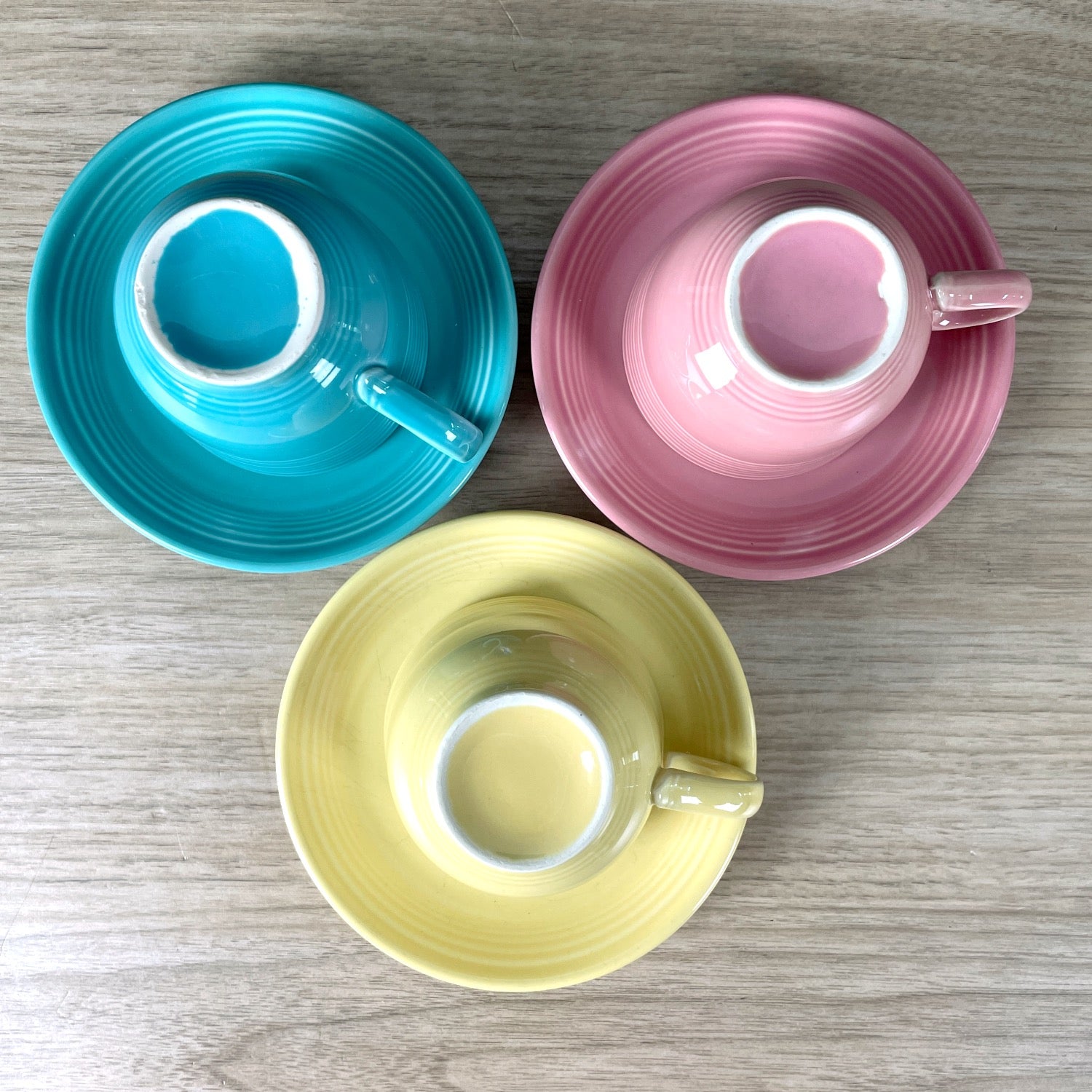 3 Homer Laughlin China Co. Genuine Fiesta cups and saucers in pink, aqua and yellow in a classic ribbed pattern. According to the date code, these were made in 1993.