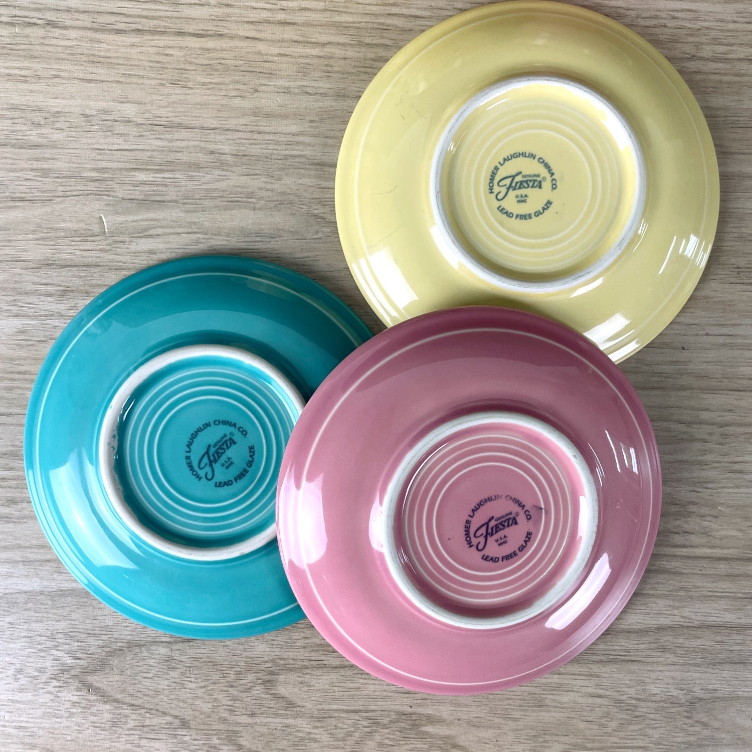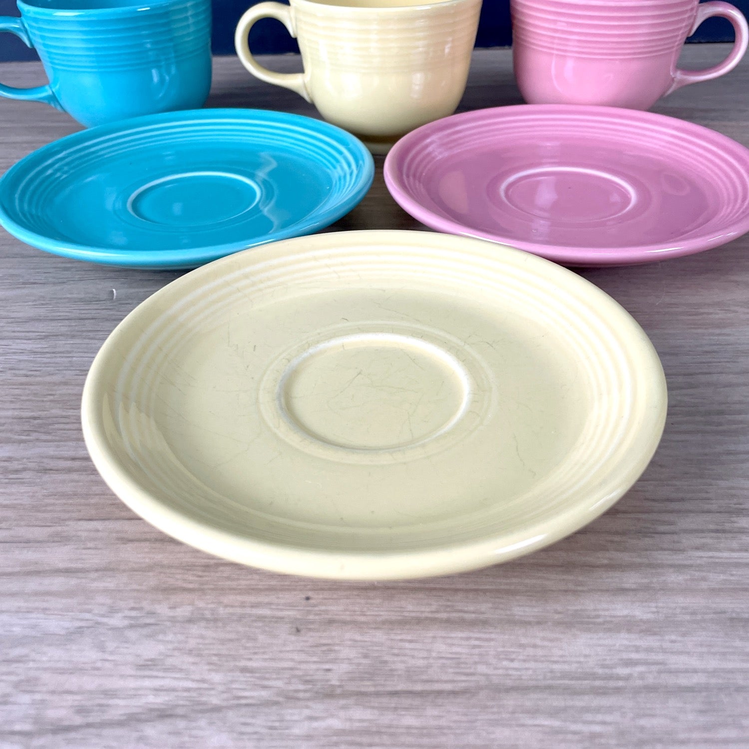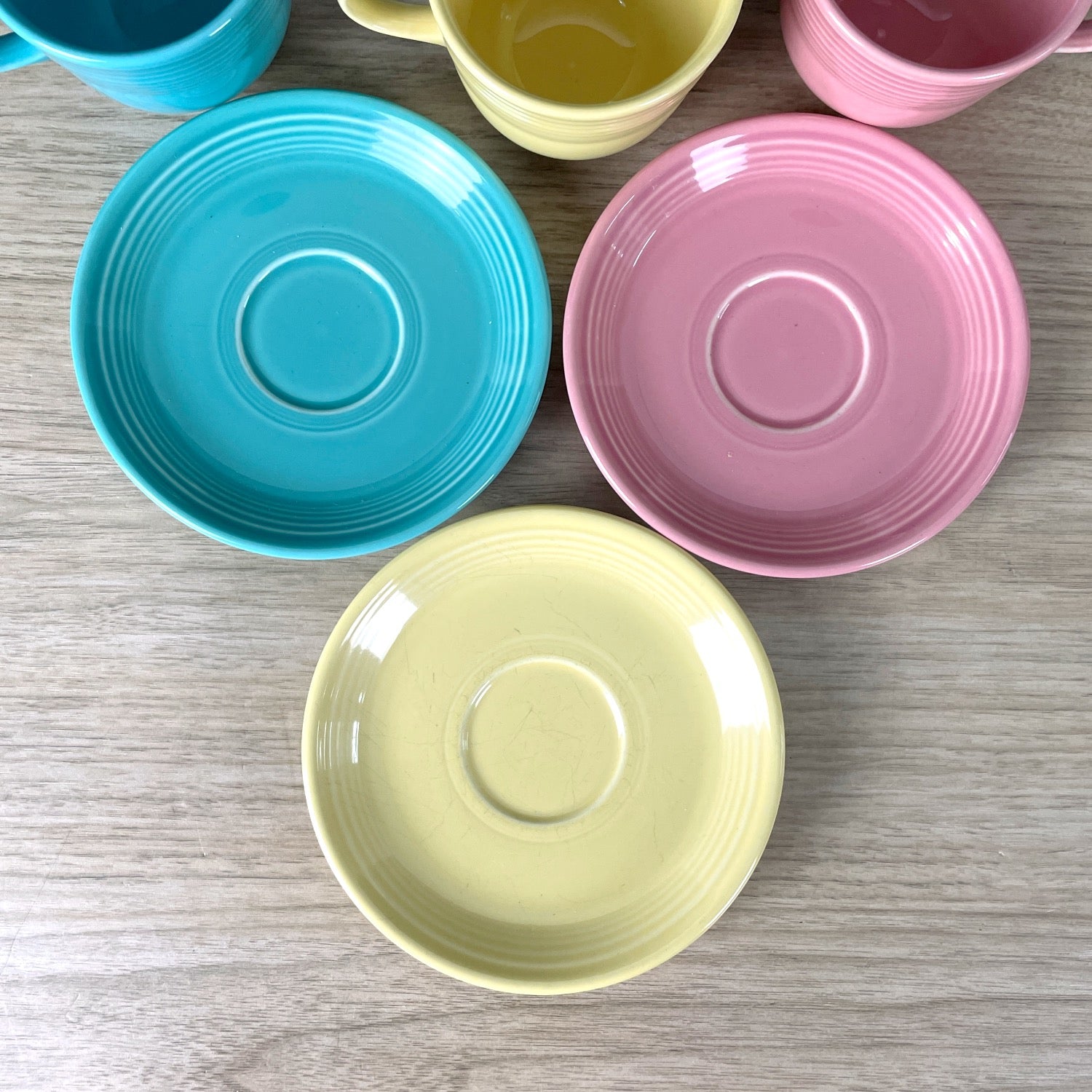 3 Homer Laughlin China Co. Genuine Fiesta cups and saucers in pink, aqua and yellow in a classic ribbed pattern. According to the date code, these were made in 1993.