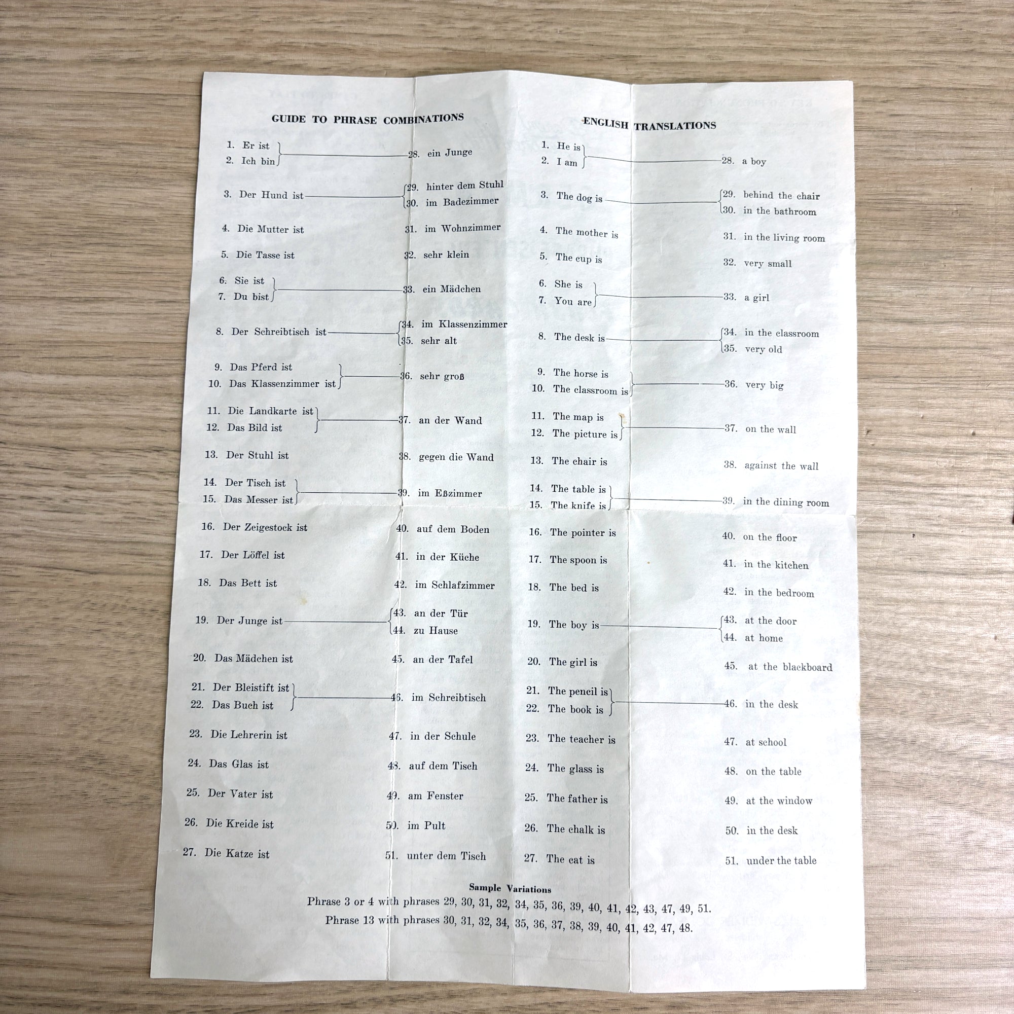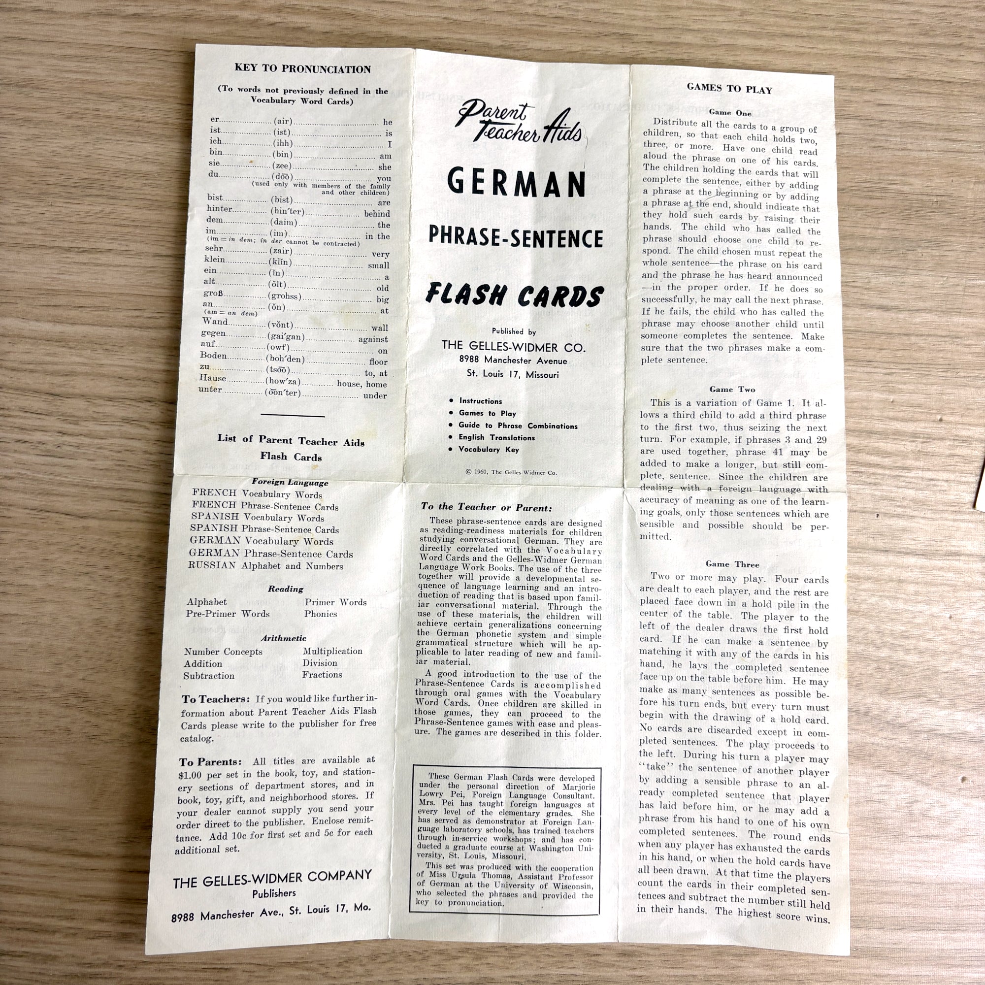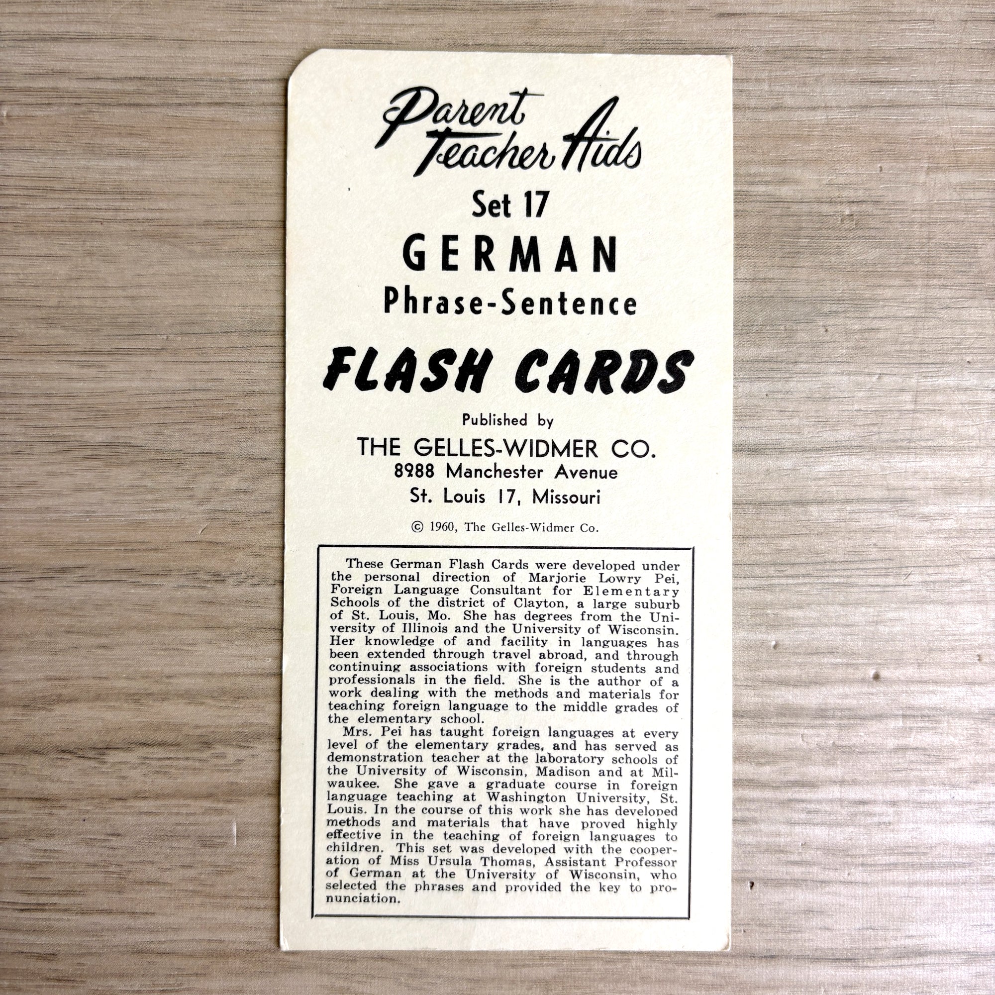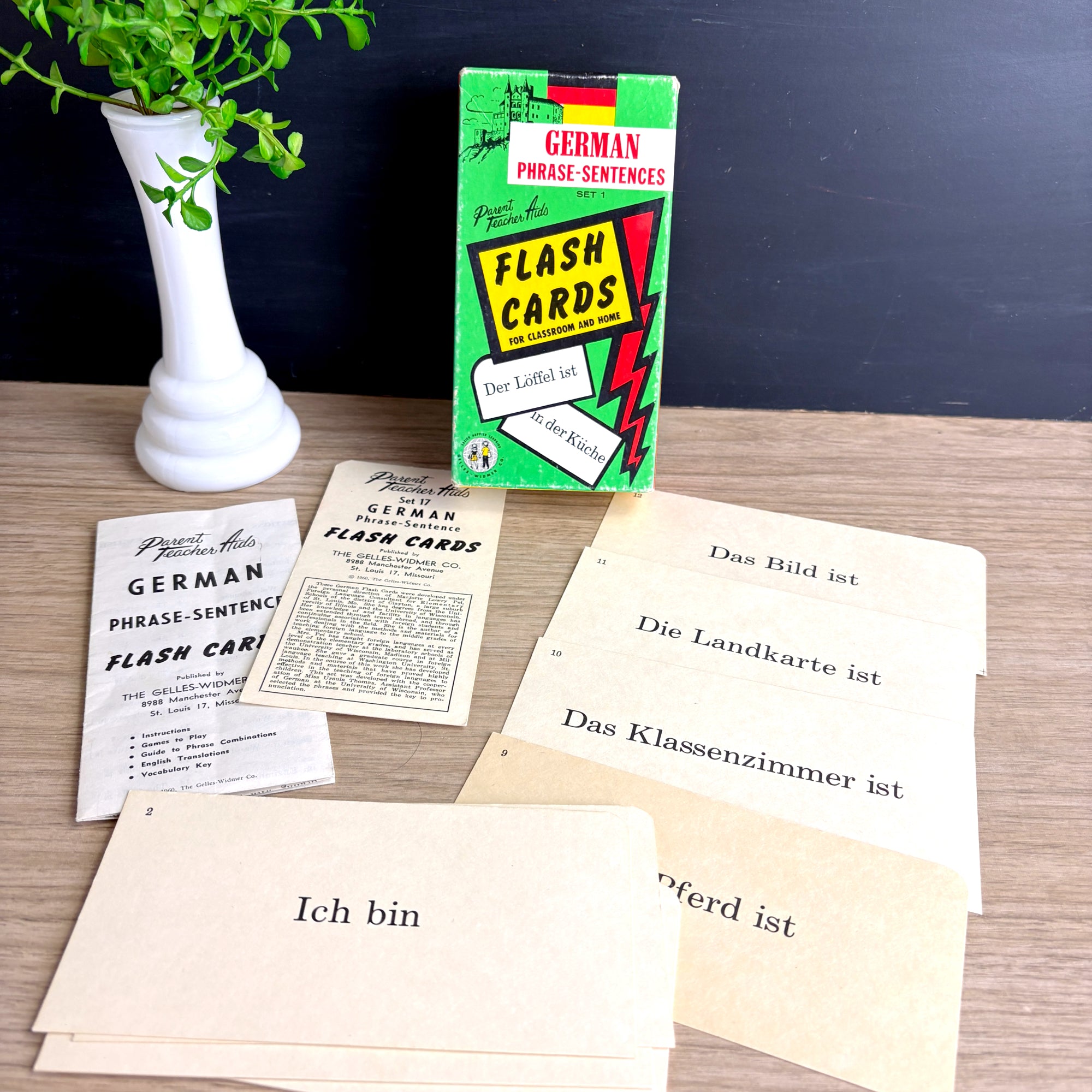 1960 vintage German language Parent Teacher Aids flash cards are by the Gelles-Widmer Co. Instruction sheet has English translations, games, guide to phrase combinations, and vocabulary key. Complete set of 51 numbered cards.