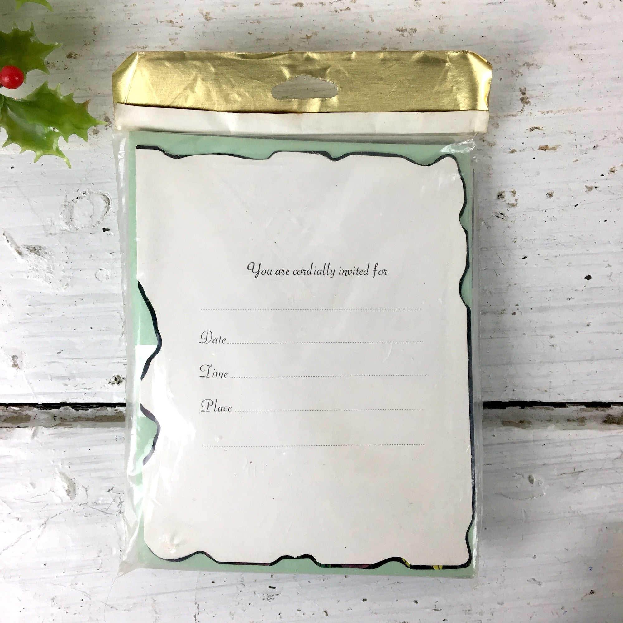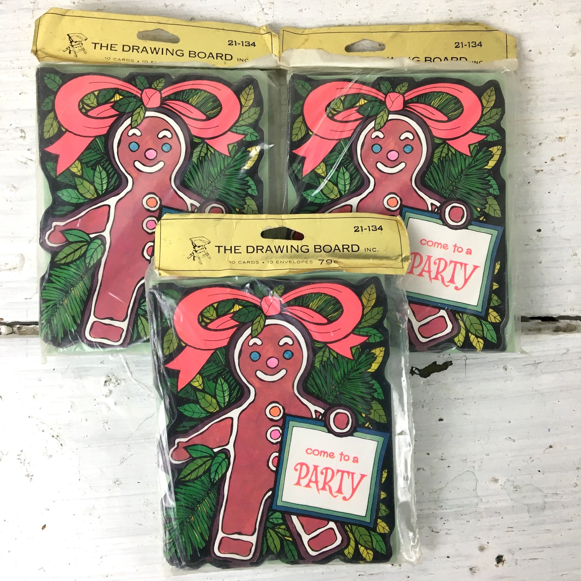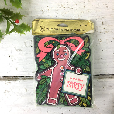 Package of 10 vintage gingerbread boy holiday party invitations, likely from the 1960s or 1970s. Printed design on the front, space on the back to write in your party details. It can absolutely be a Zoom party, btw. Light green envelopes.