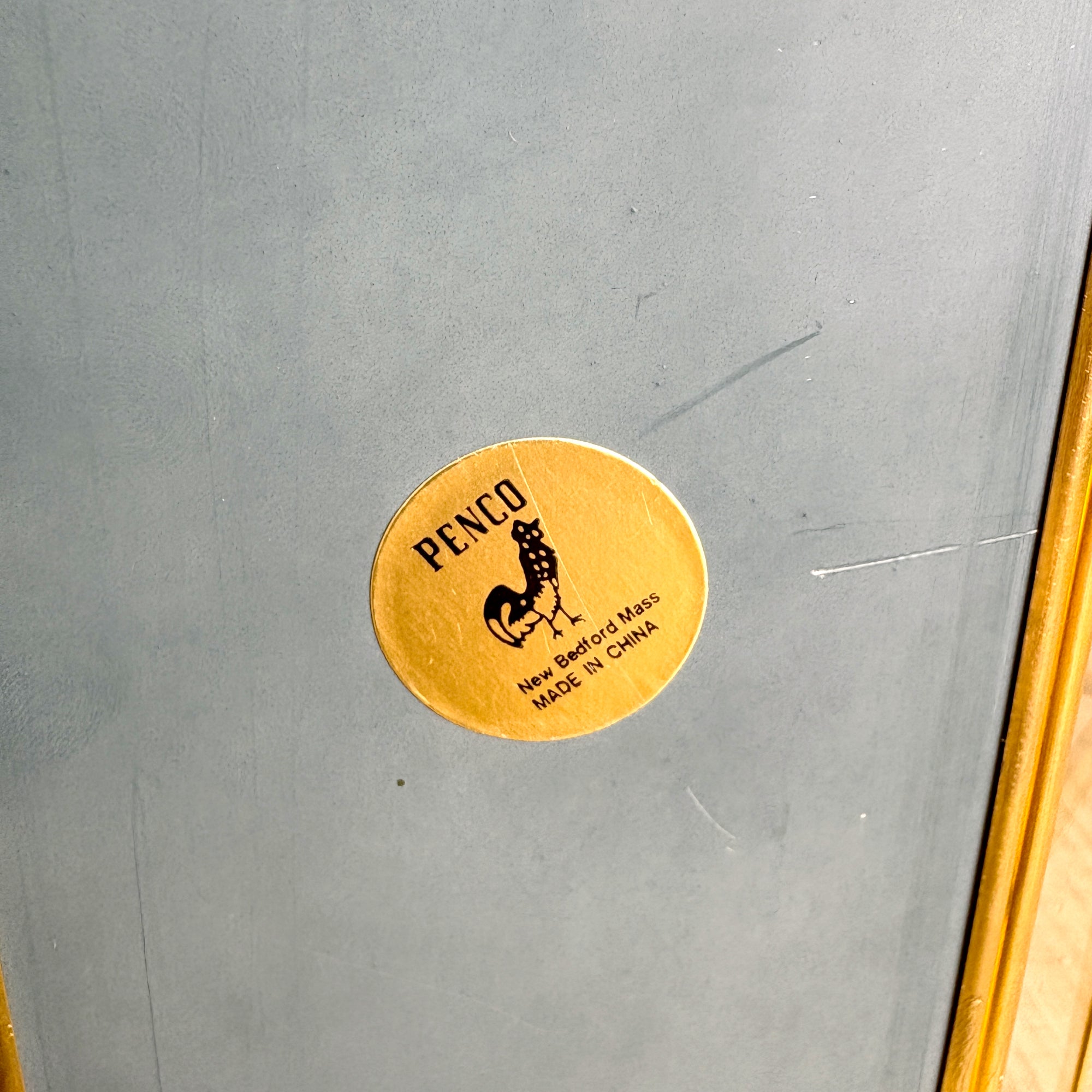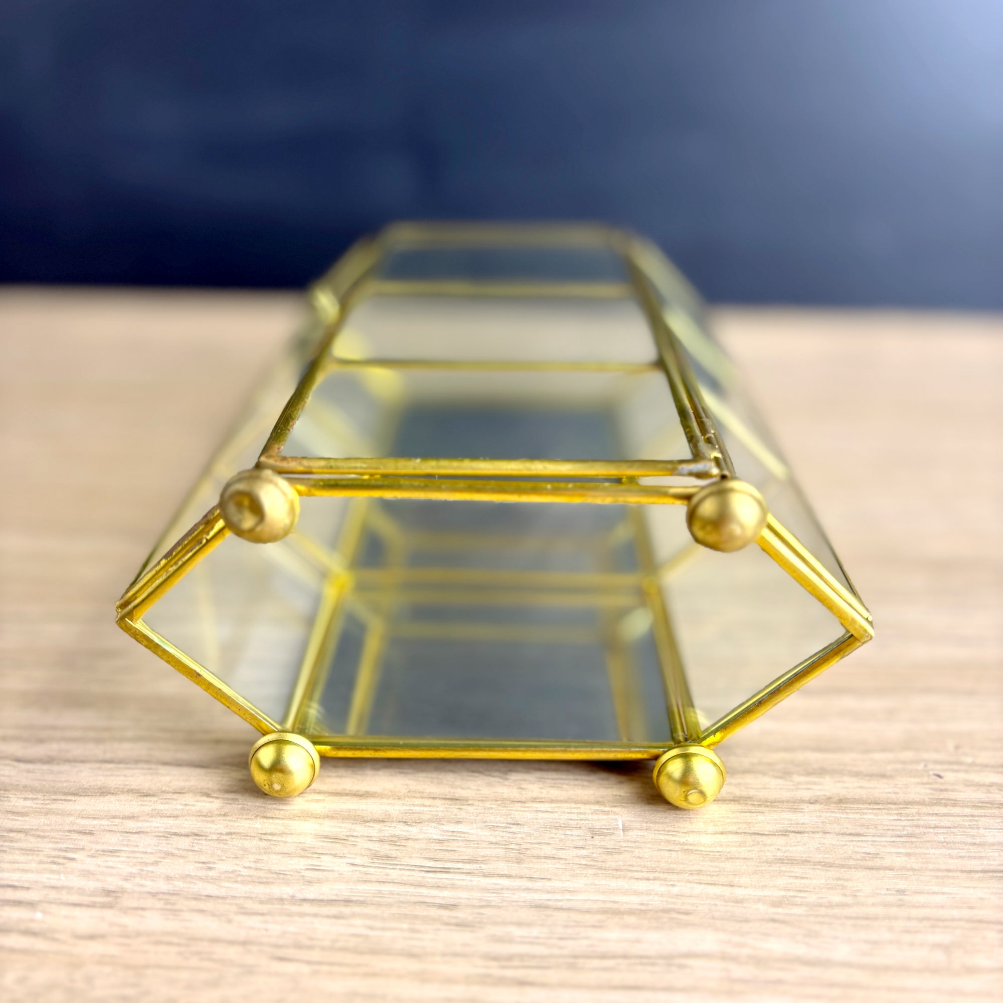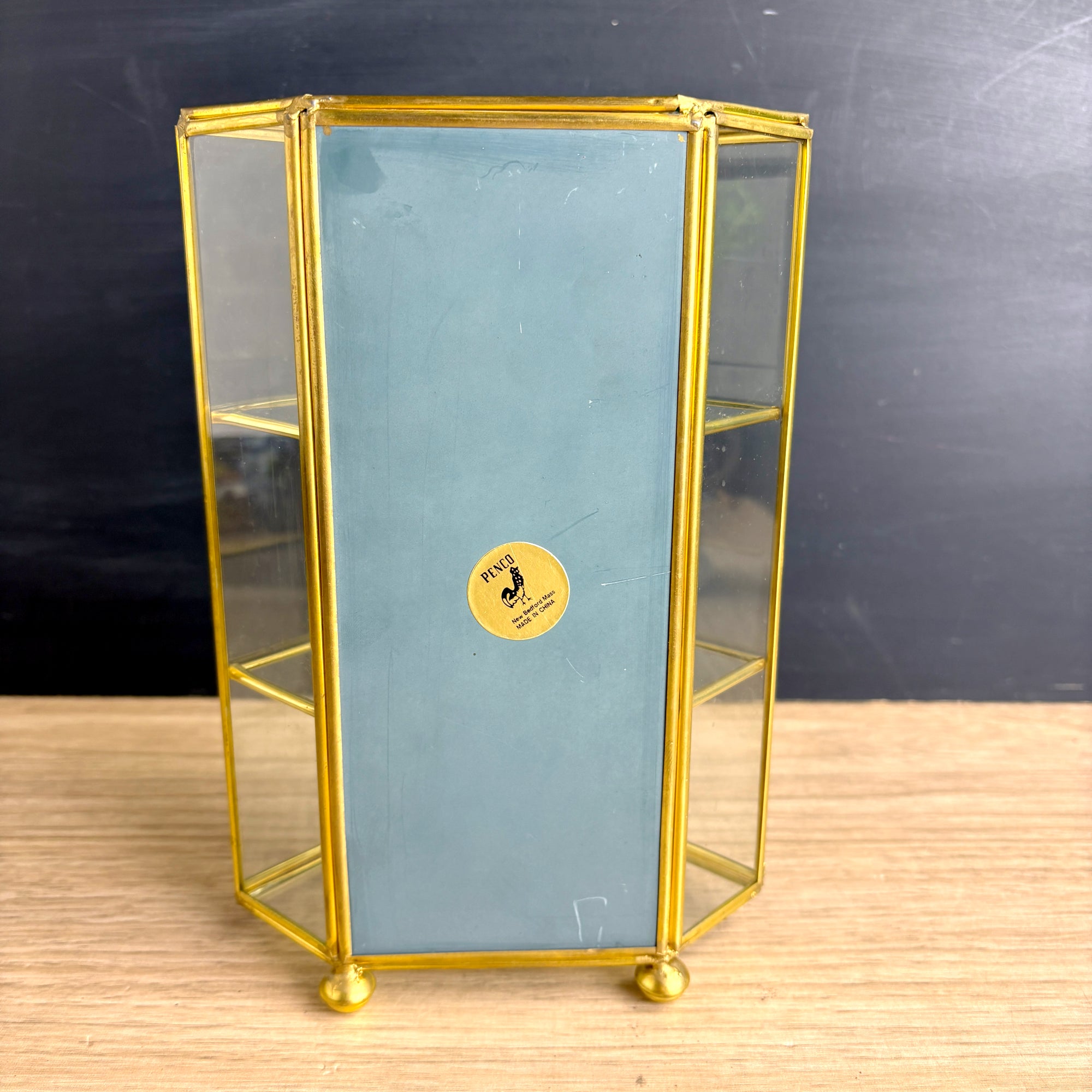 Vintage glass and brass display case, rectangular with beveled front and mirrored back to reflect your small collectibles, jewelry, etc. Three shelves inside. Single door. Four ball feet so it can stand on a table. Marked with a Penco, New Bedford Mass sticker, Made in China. Likely 1980s.