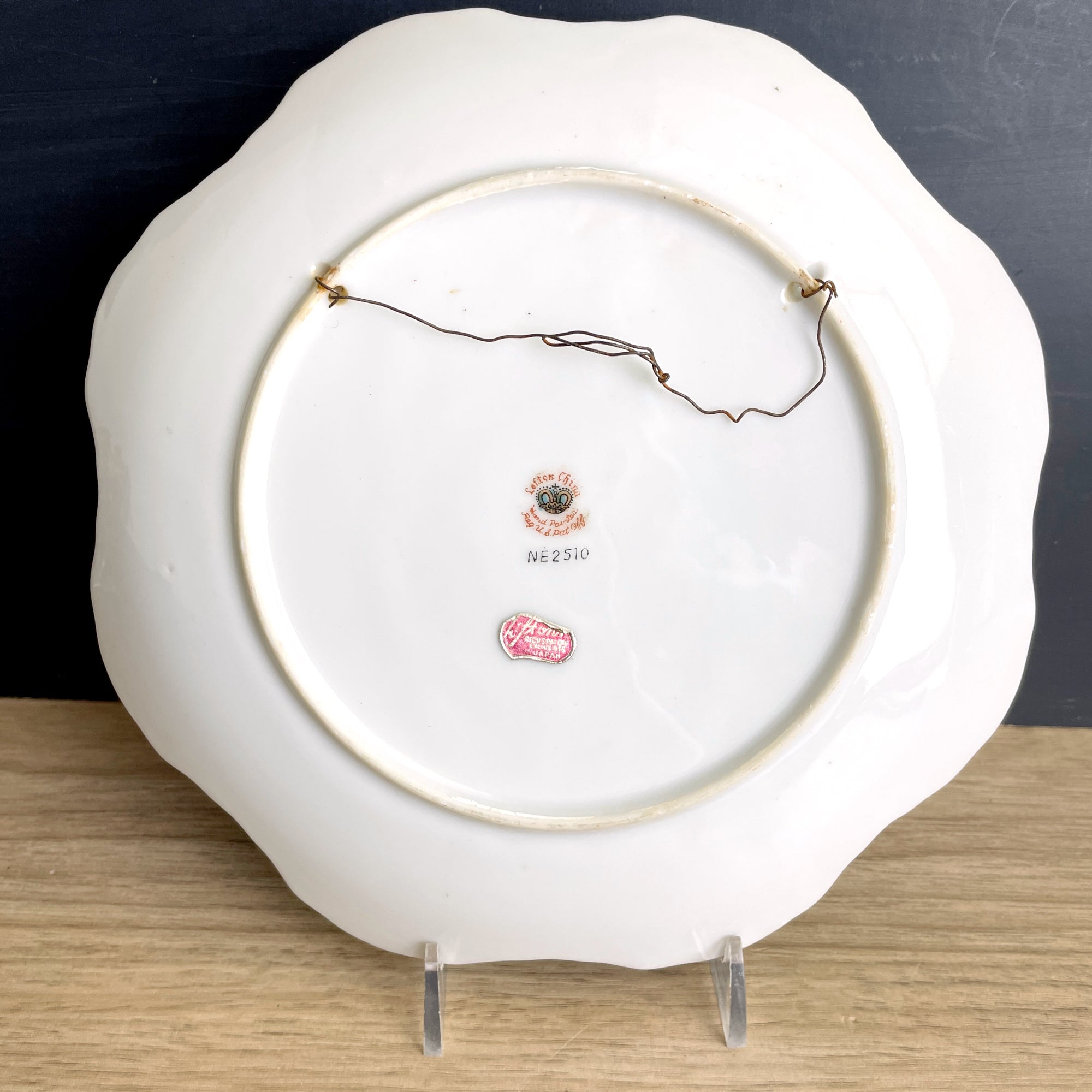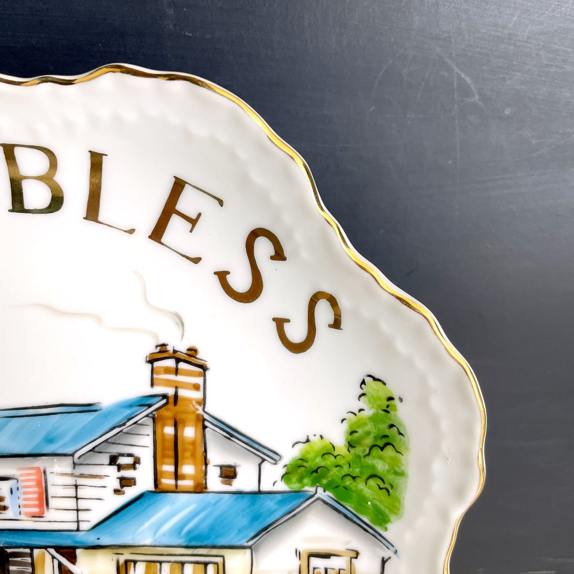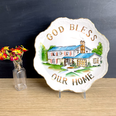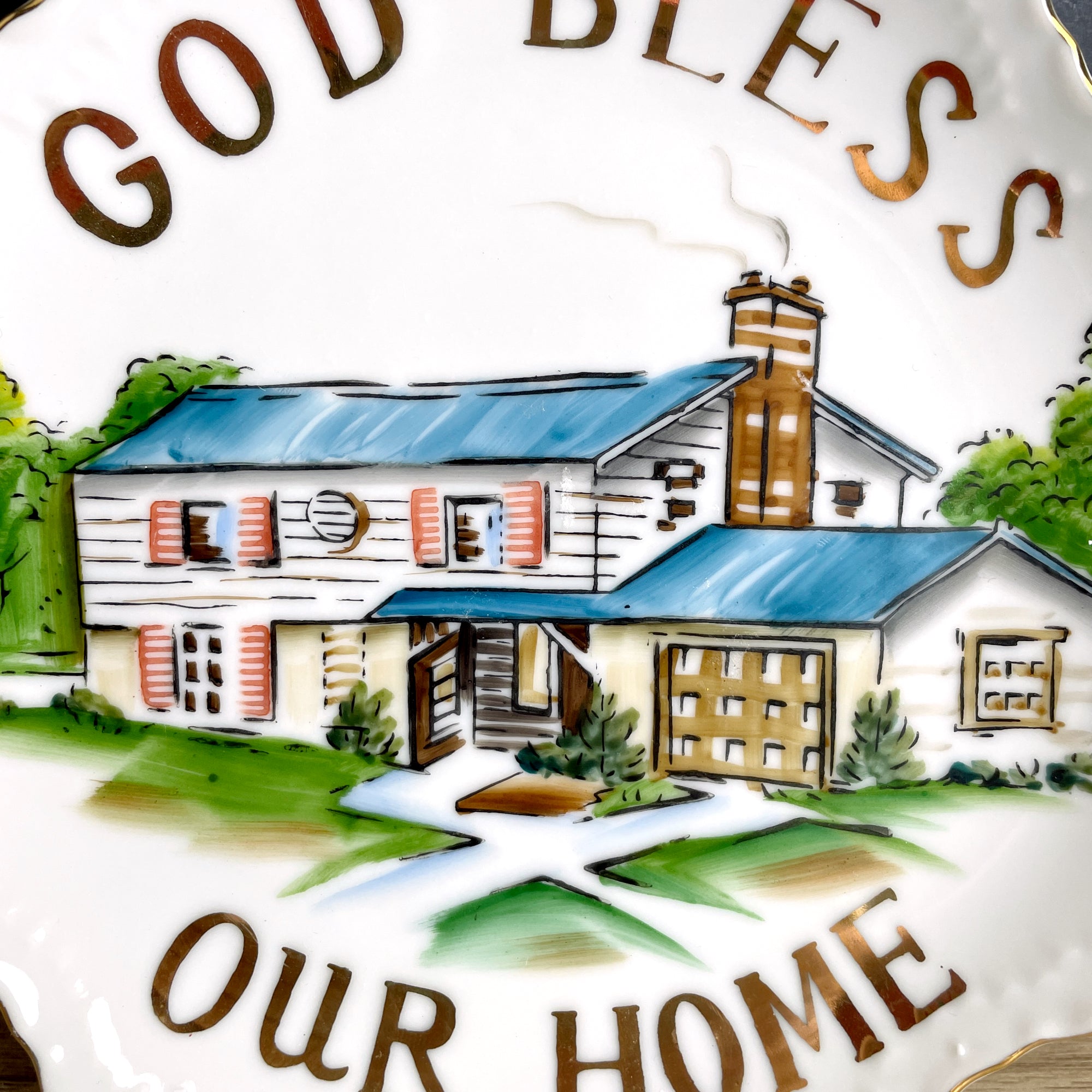 Vintage Lefton decorative plate reading "God Bless Our Home." Center image is of an adorable mid-century colonial home with smoke coming from its chimney. Scalloped edge with gold trim. Wired for hanging.
