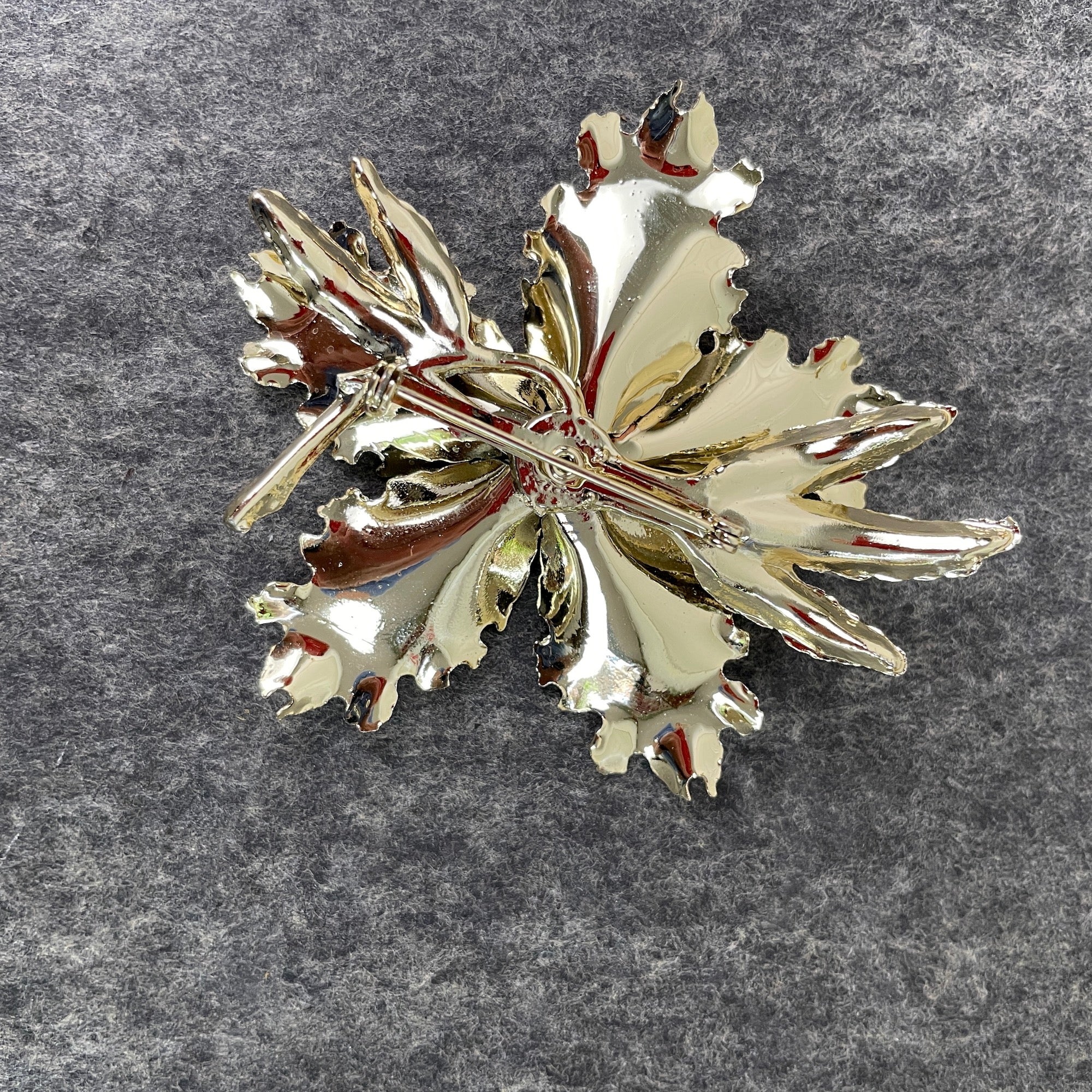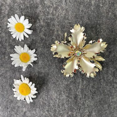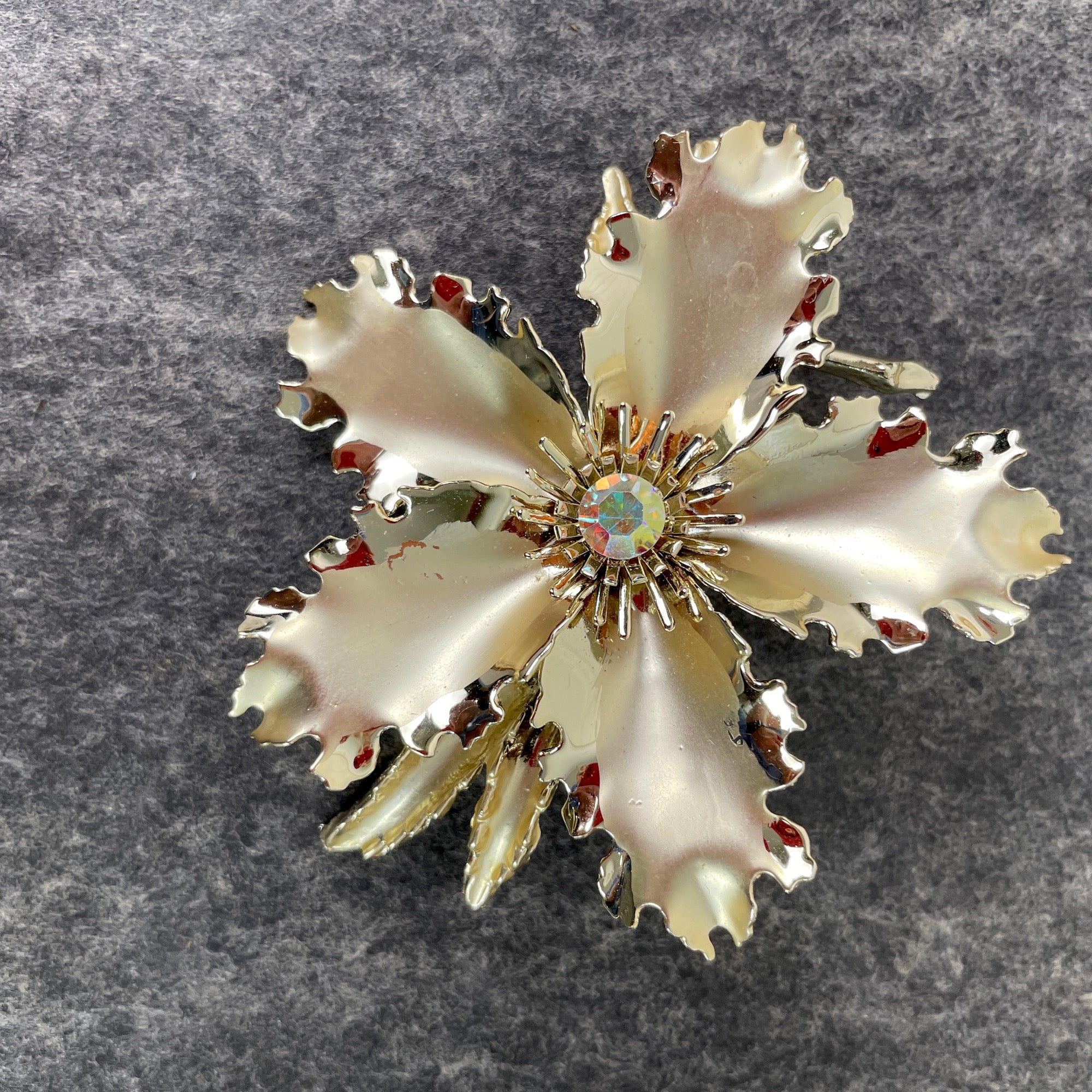 Goldtone flower brooch with aurora borealis rhinestone center - 1960s vintage