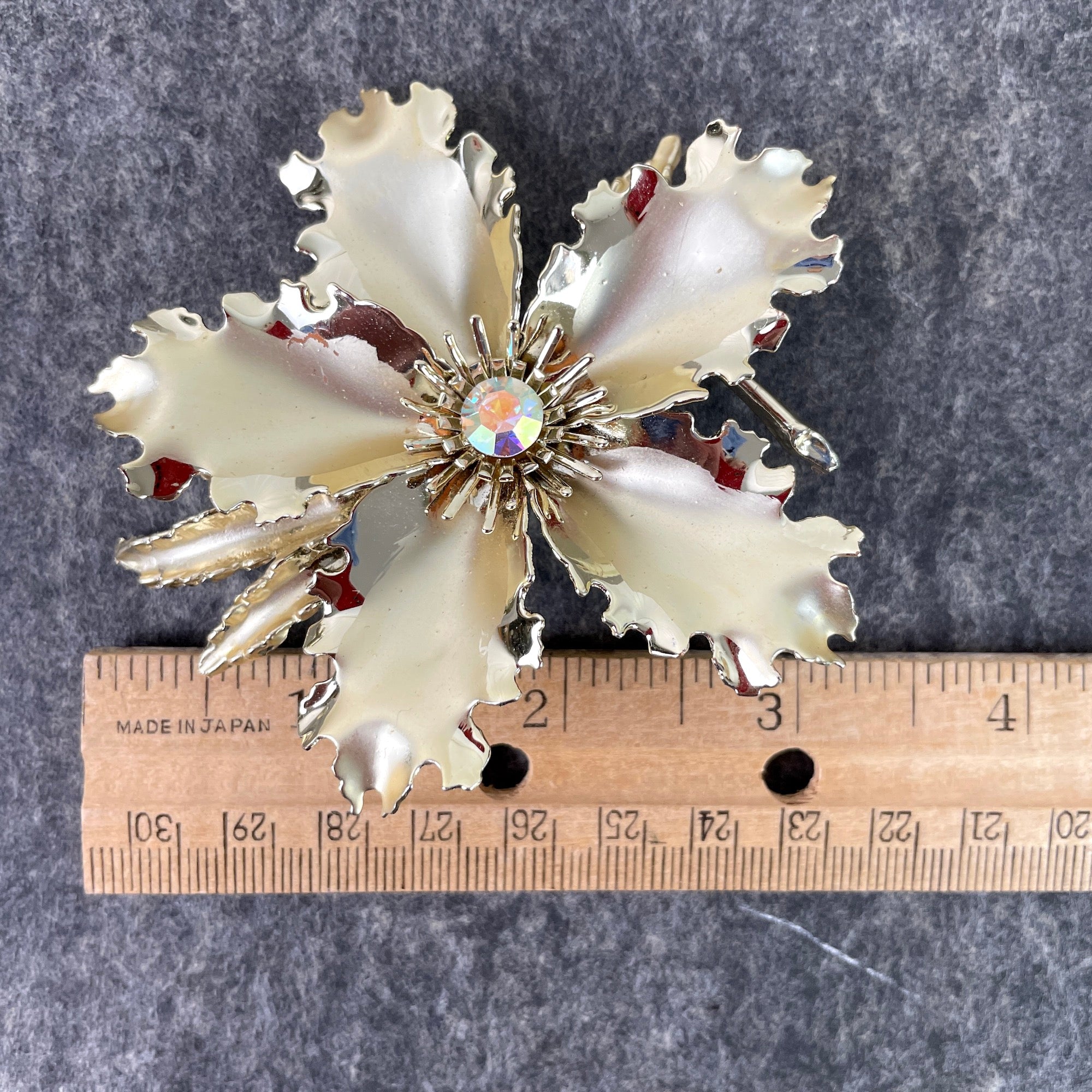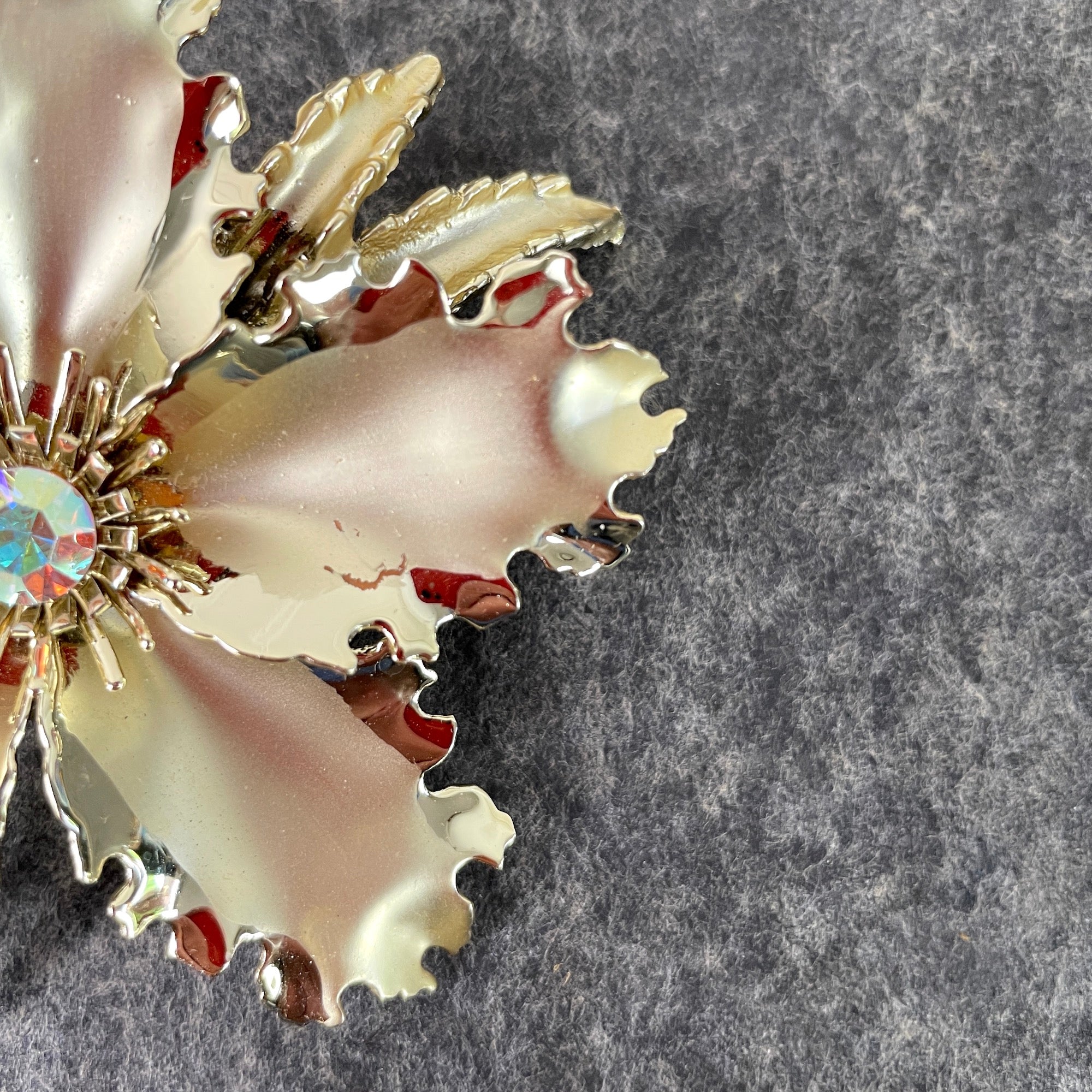 Vintage 1960s goldtone metal flower pin with a large aurora borealis rhinestone in the center. Bright petals have a satin finish in the middle. One of the leaves is broken off the back, see pix.