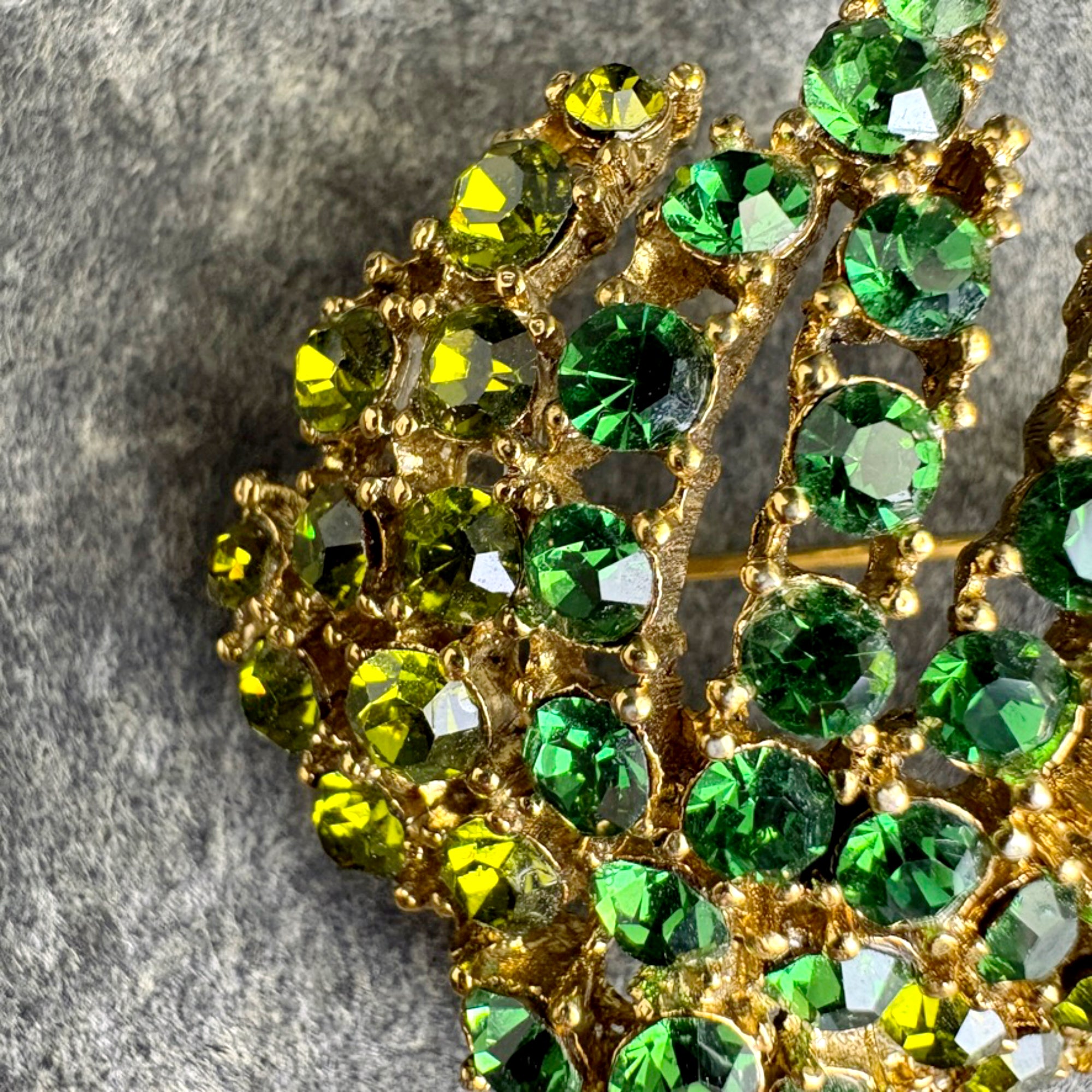 Rhinestone leaf brooch - goldtone with emerald and olivine rhinestones