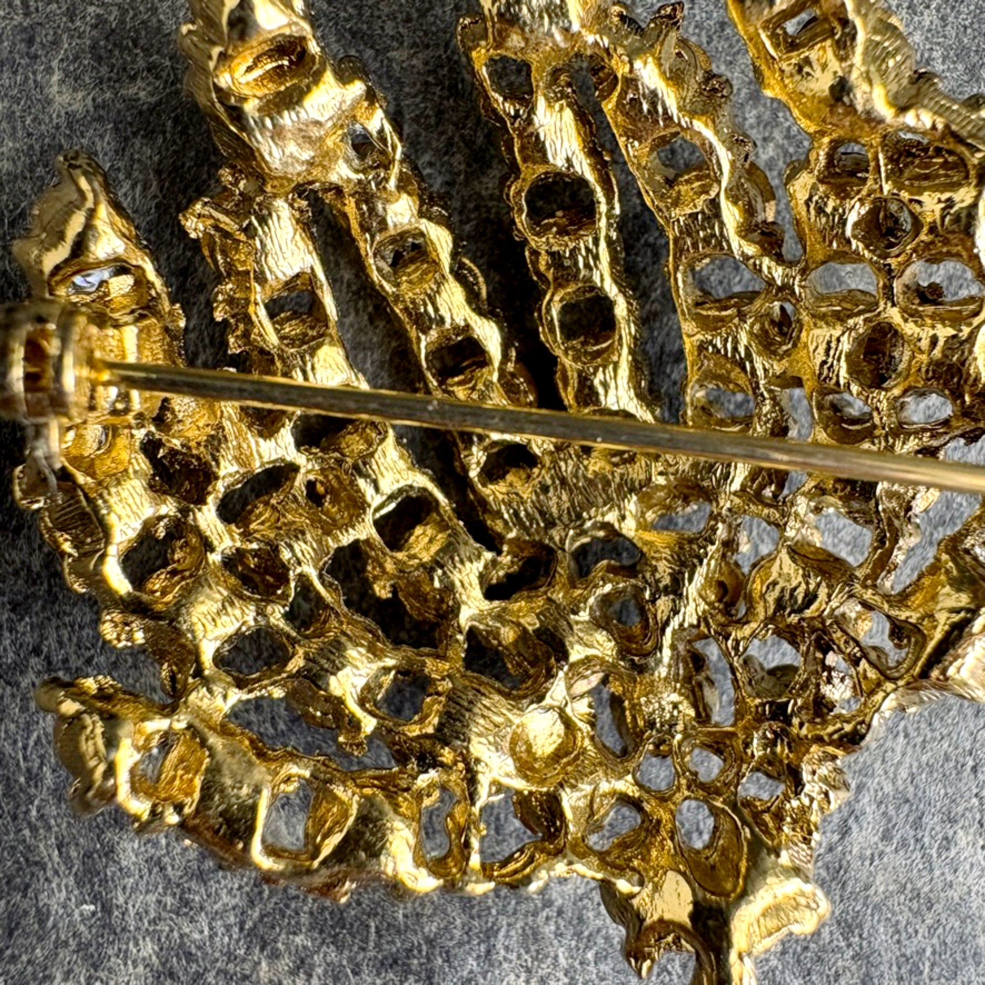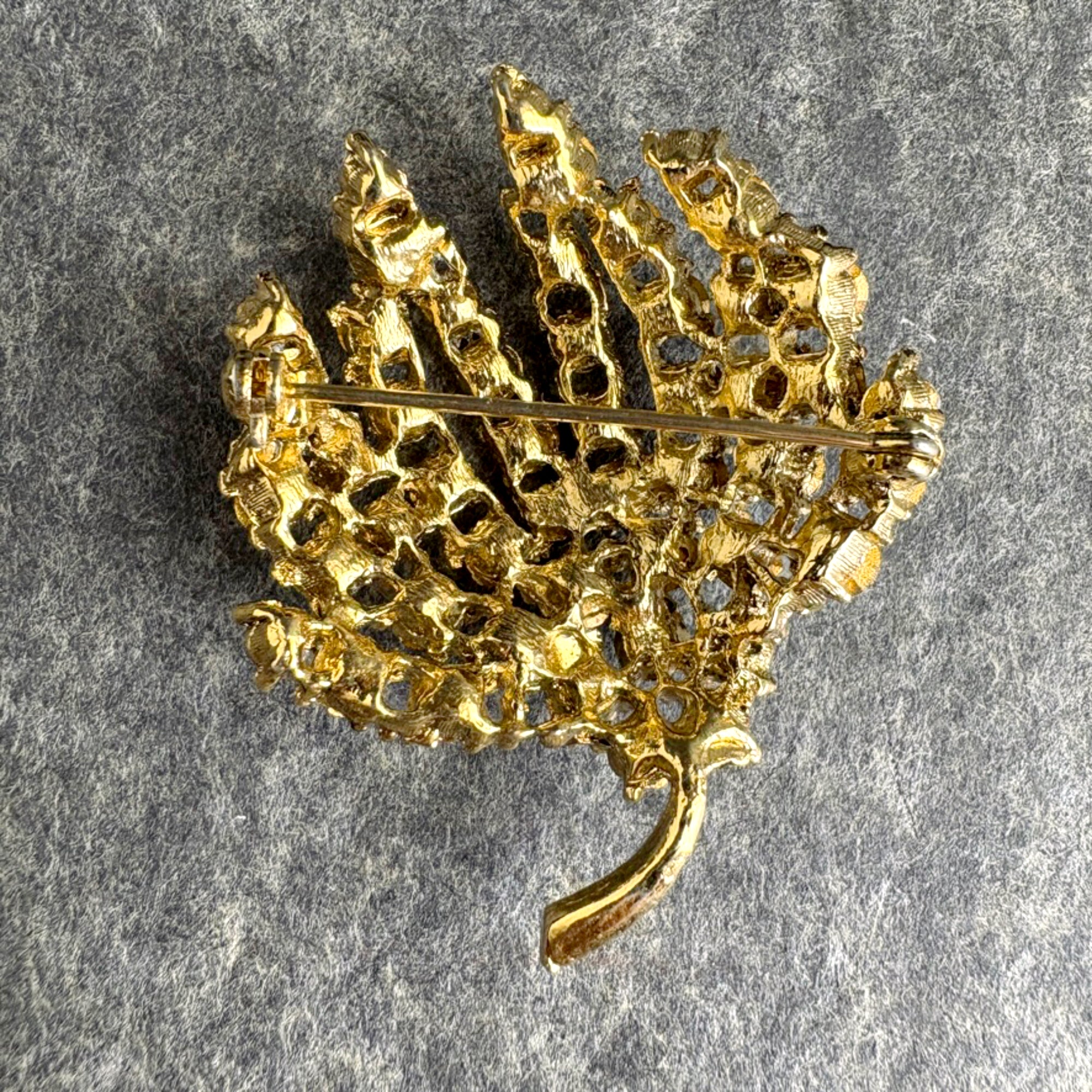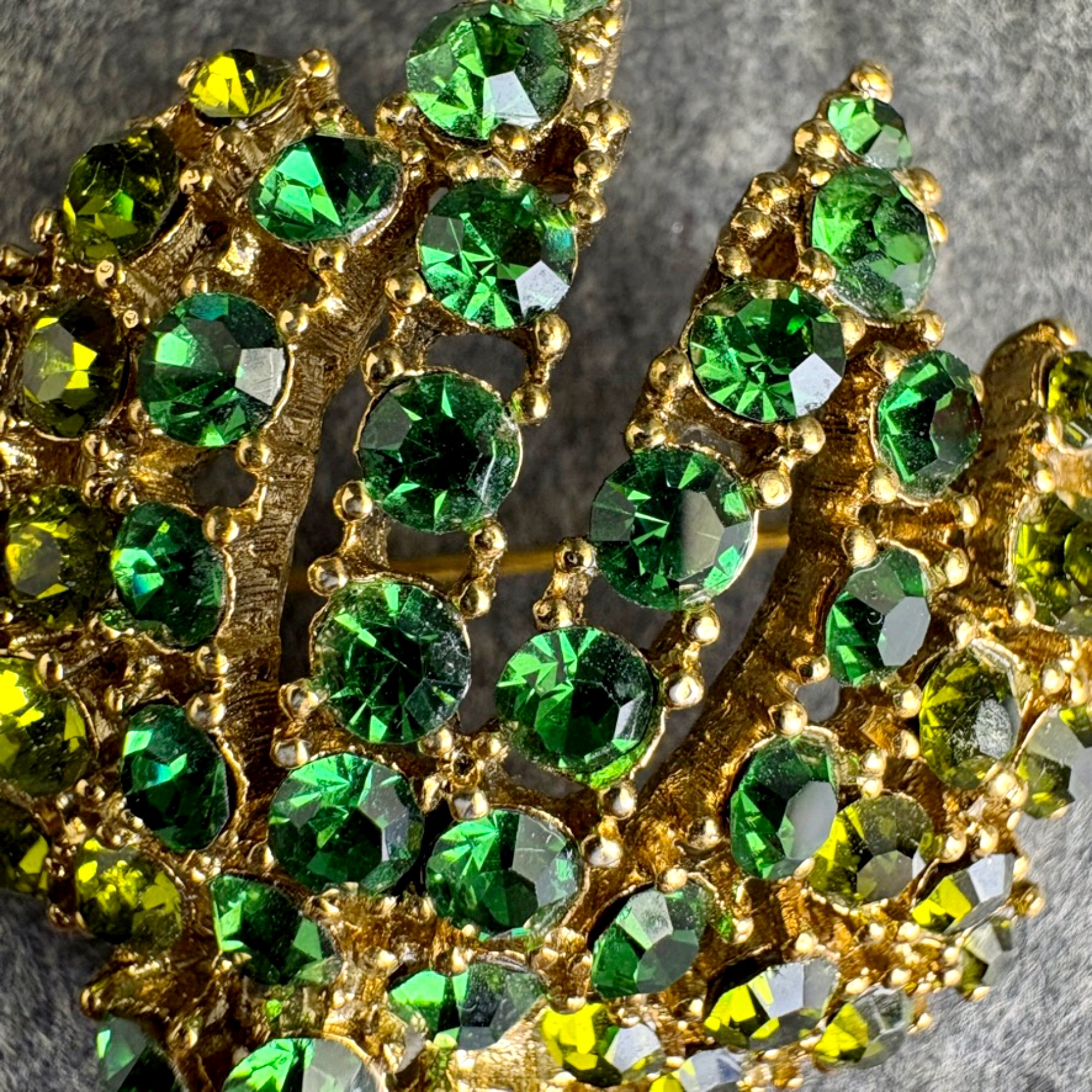 Goldtone leaf brooch, prong set with emerald and olivine rhinestones in multiple sizes. The center 1/3 of the pin is emerald with the outer edges being olivine, and the smaller rhinestones at the edges giving the impression of younger and older growth.