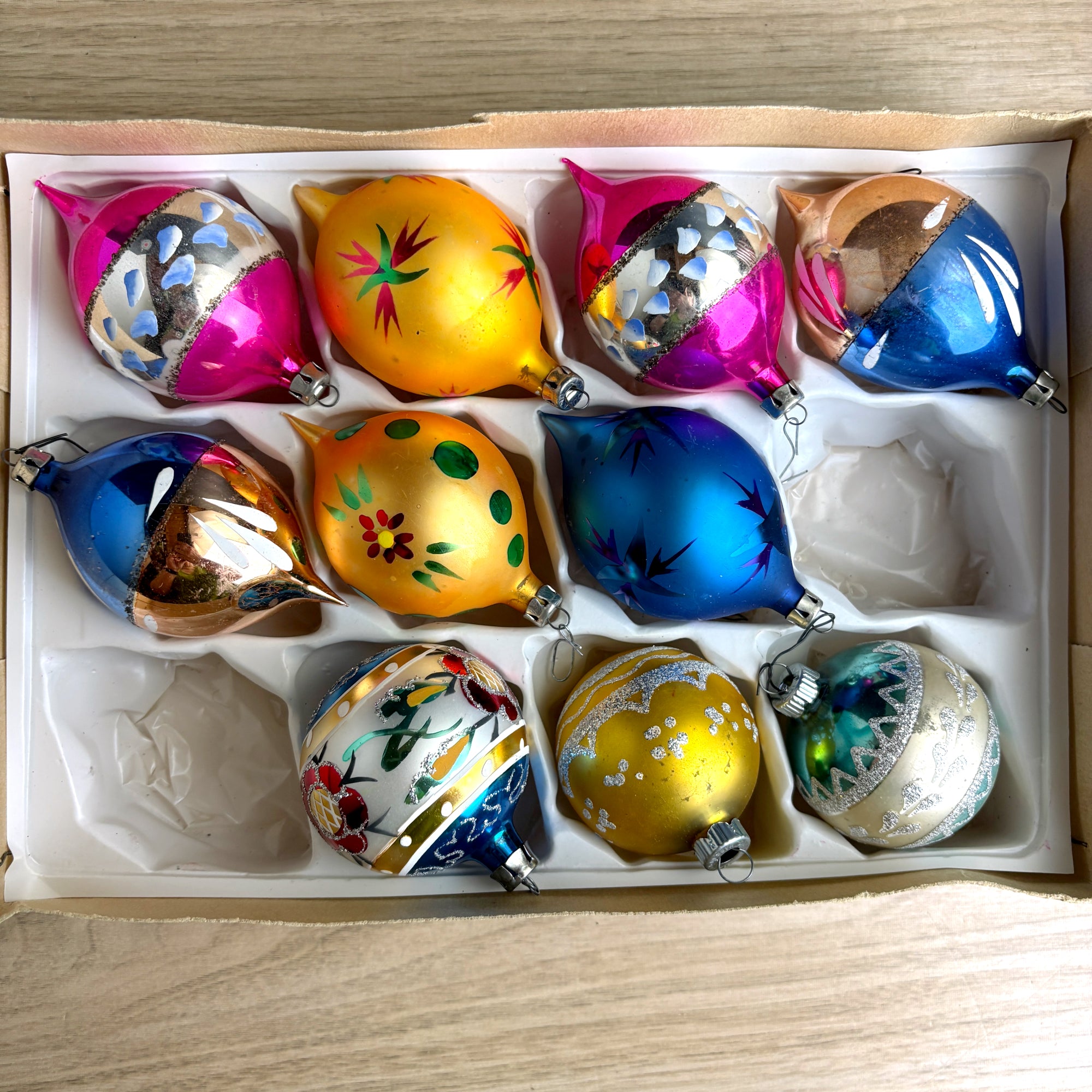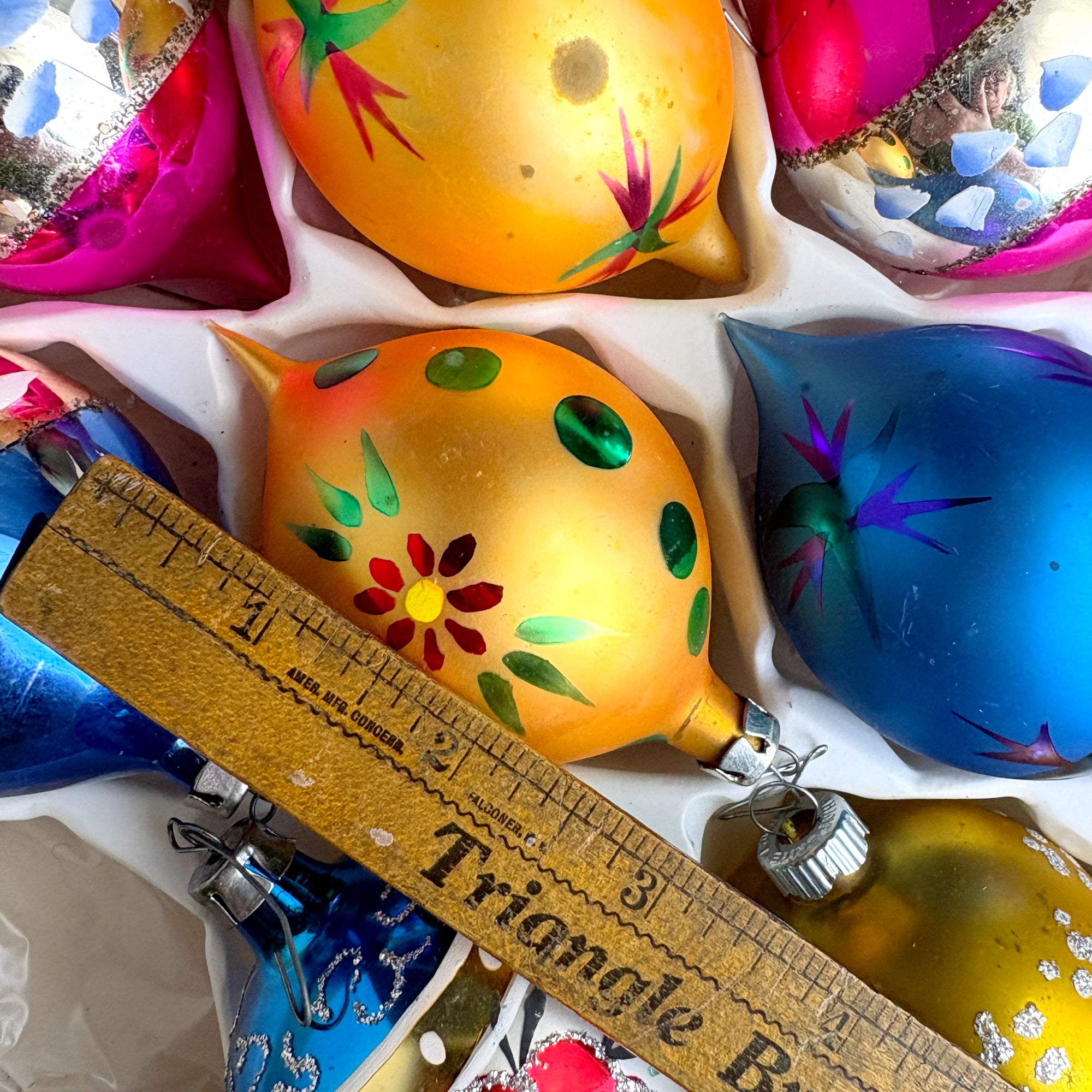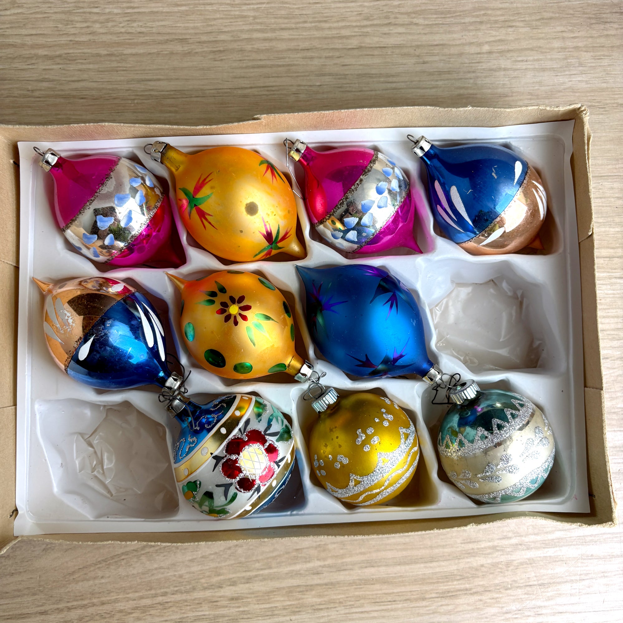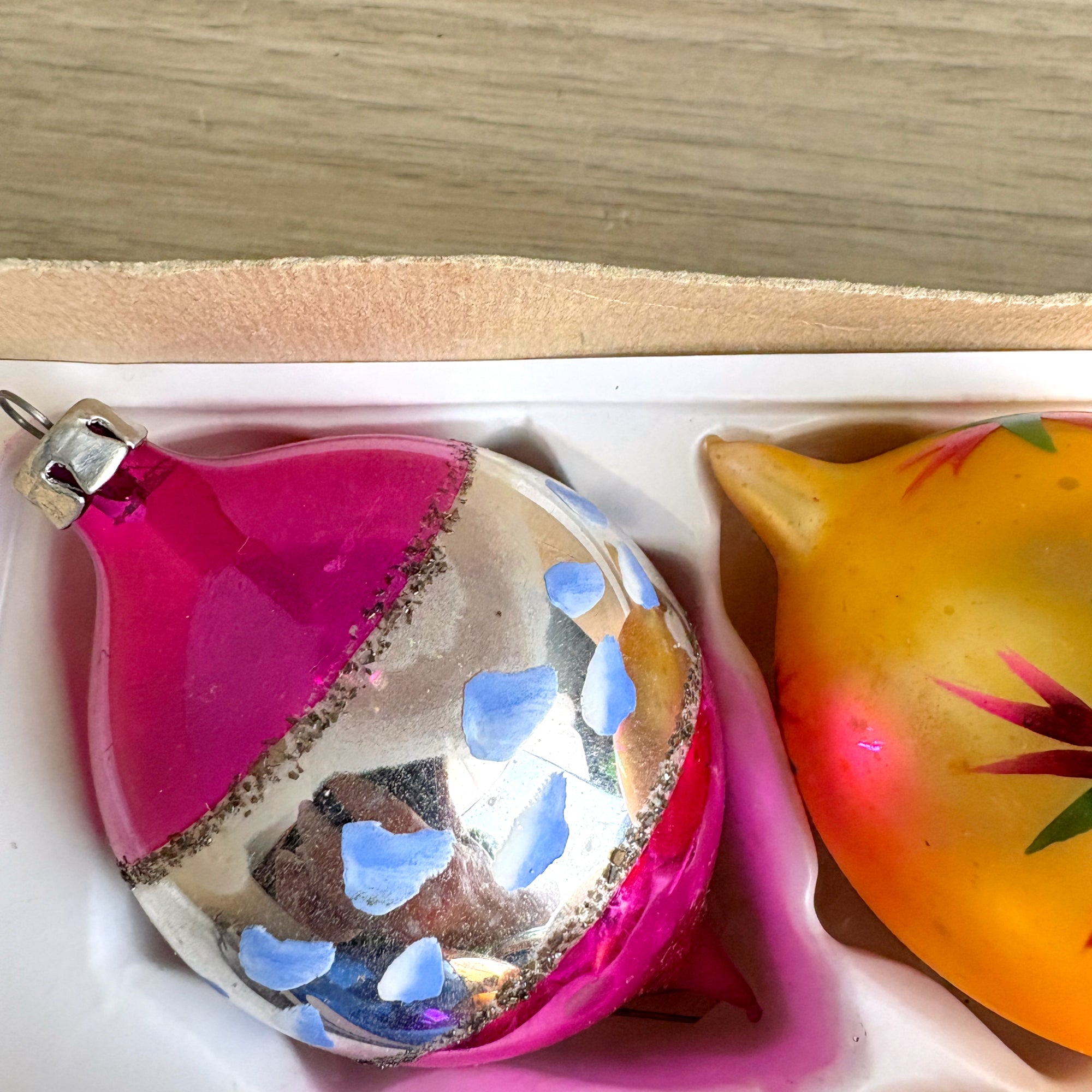CONDITION Ornaments are in well-loved but good condition. Box is sturdy; there is a hand-written "1972" on the lid, and the original box window cellophane has been replaced with cling film.