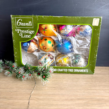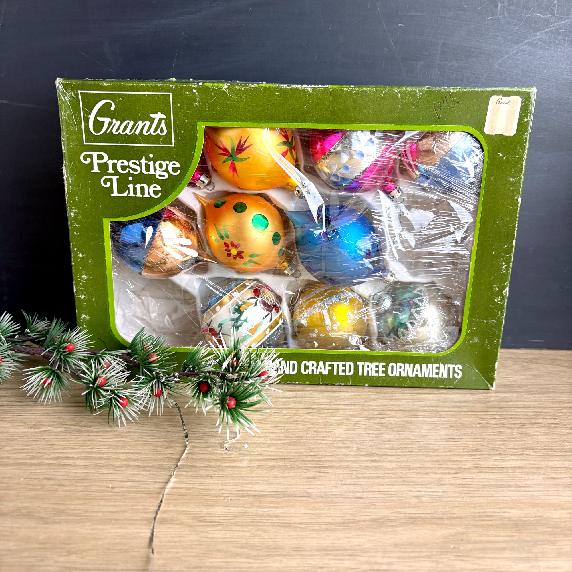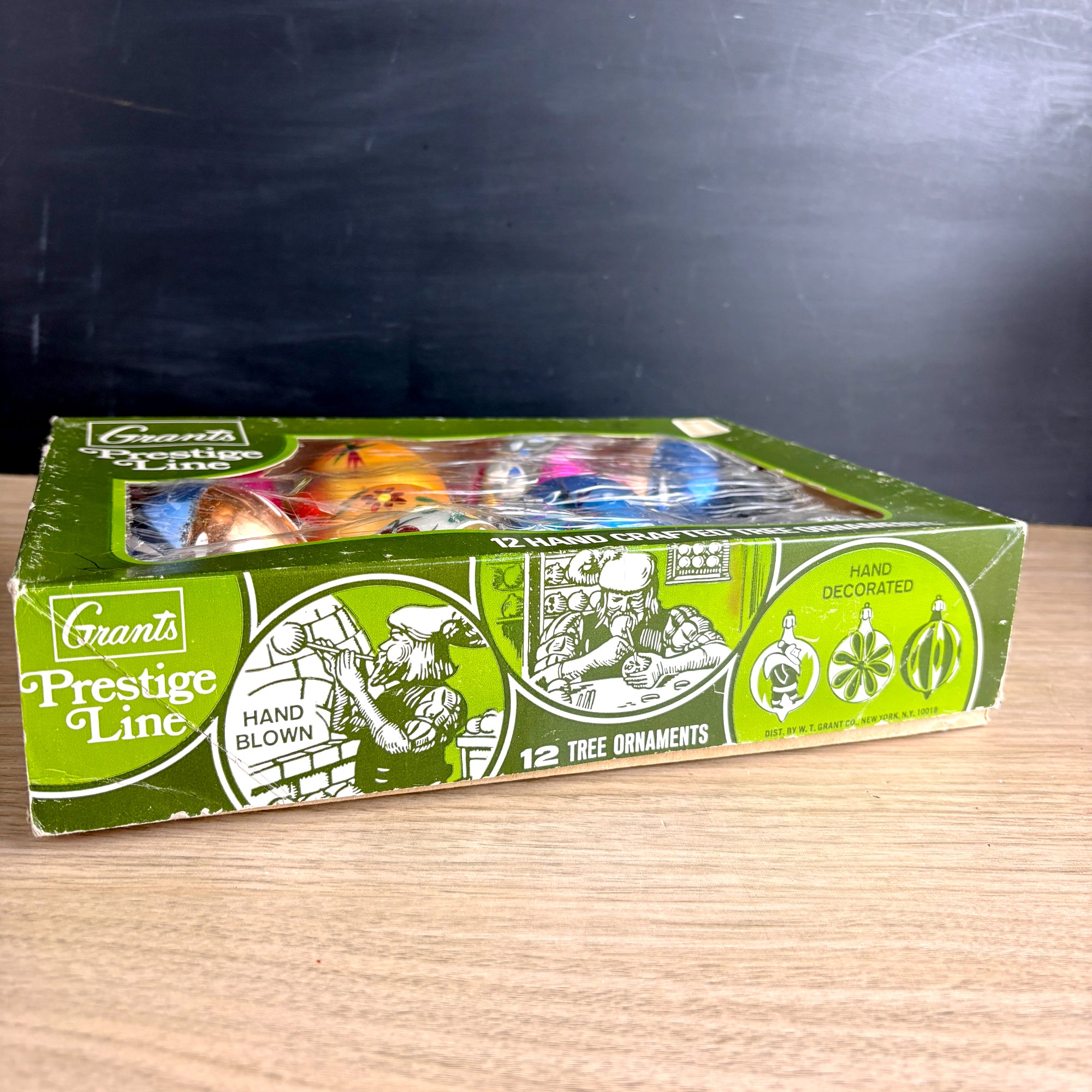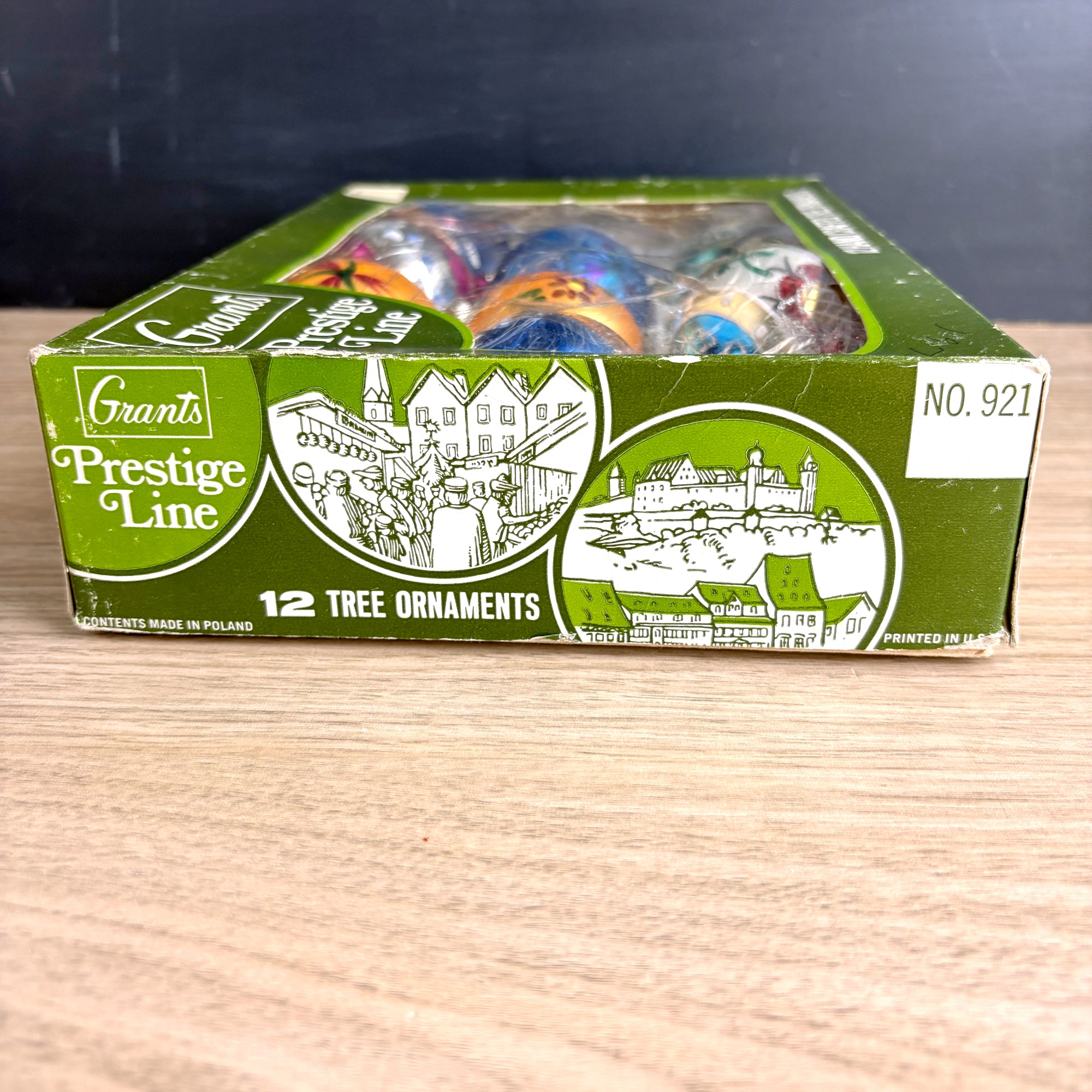 Grants Prestige Line and Shiny Bright vintage glass ornaments in box - 1970s great graphics