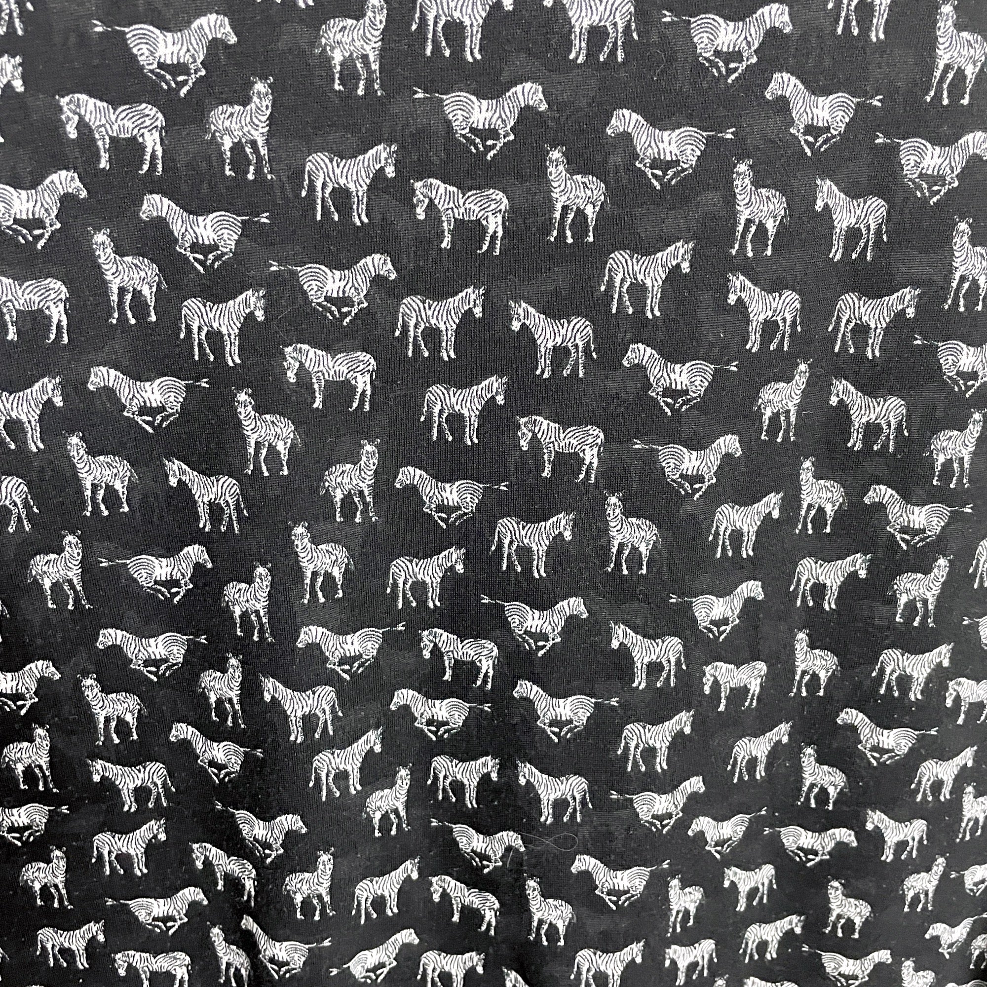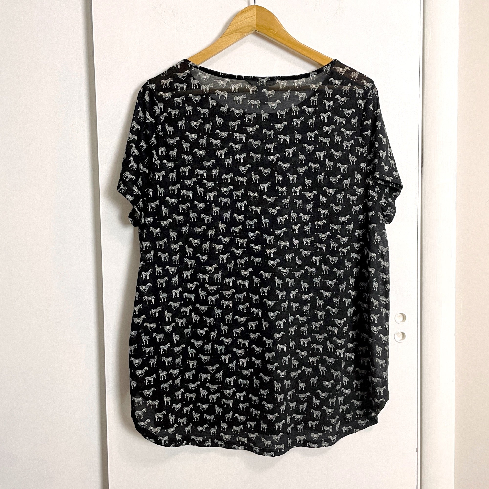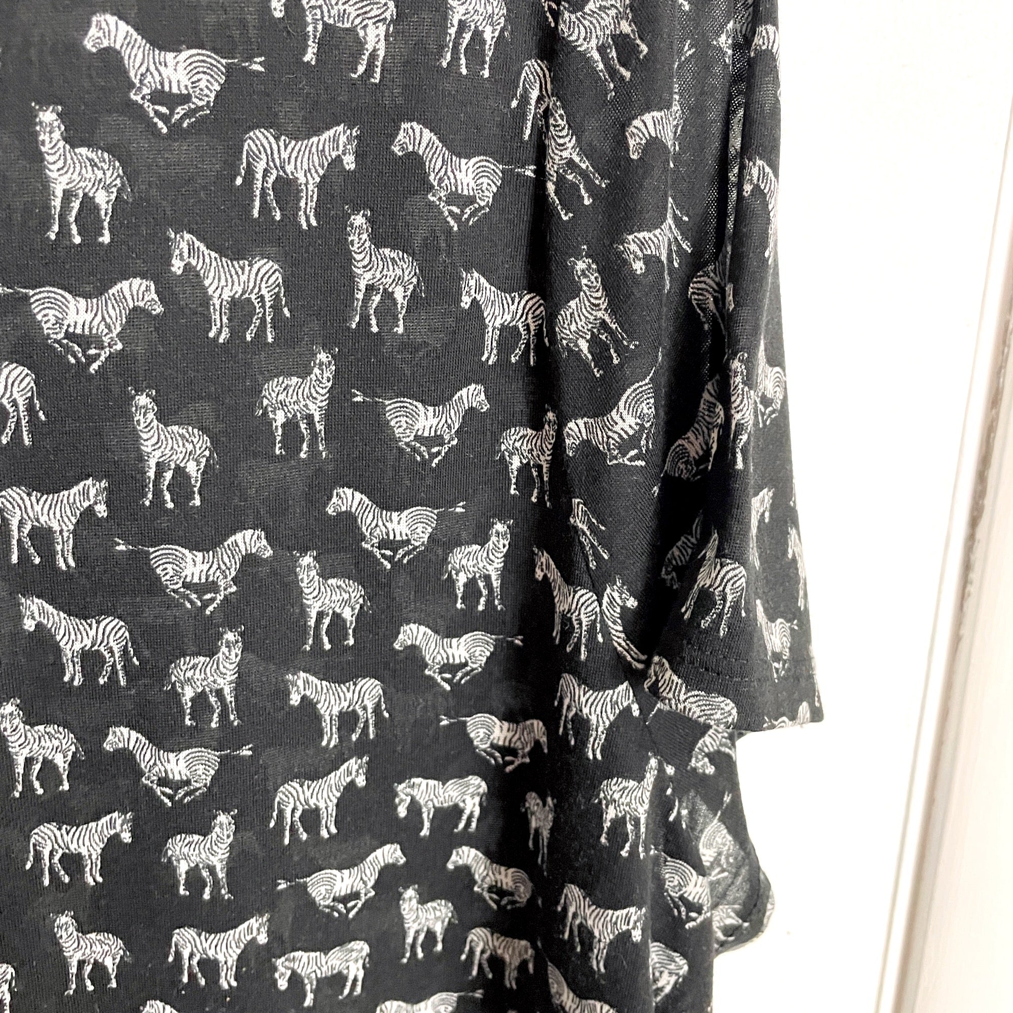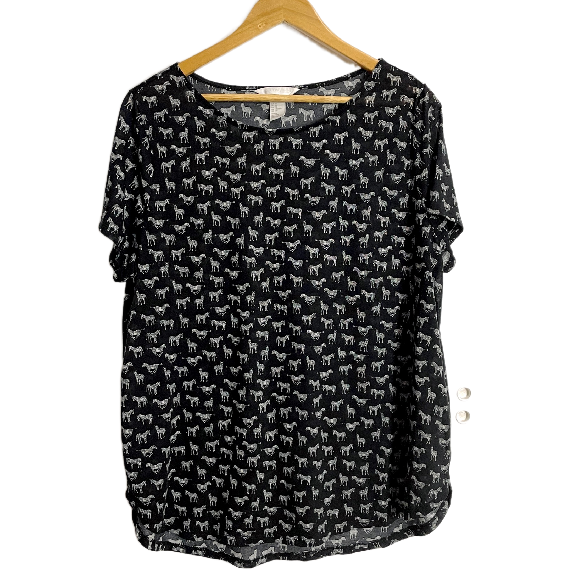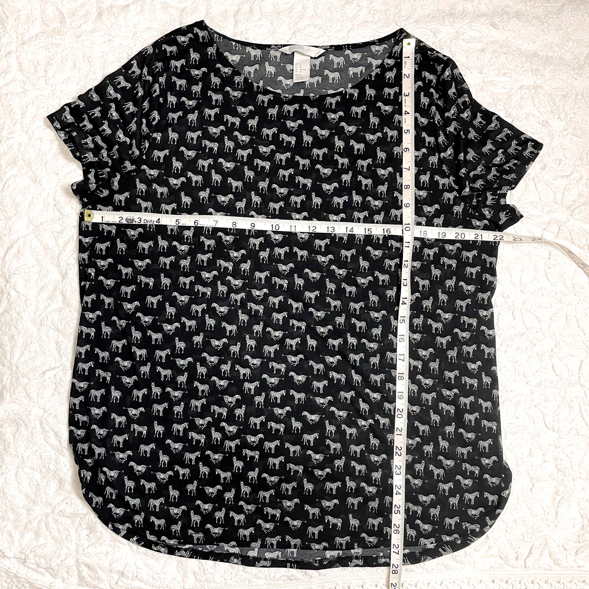 From H&M Conscious, a short sleeve zebra print shirt. Round neck. Shaped hem. Semi-sheer black fabric with white zebras. Great for summer and for transitional seasons.