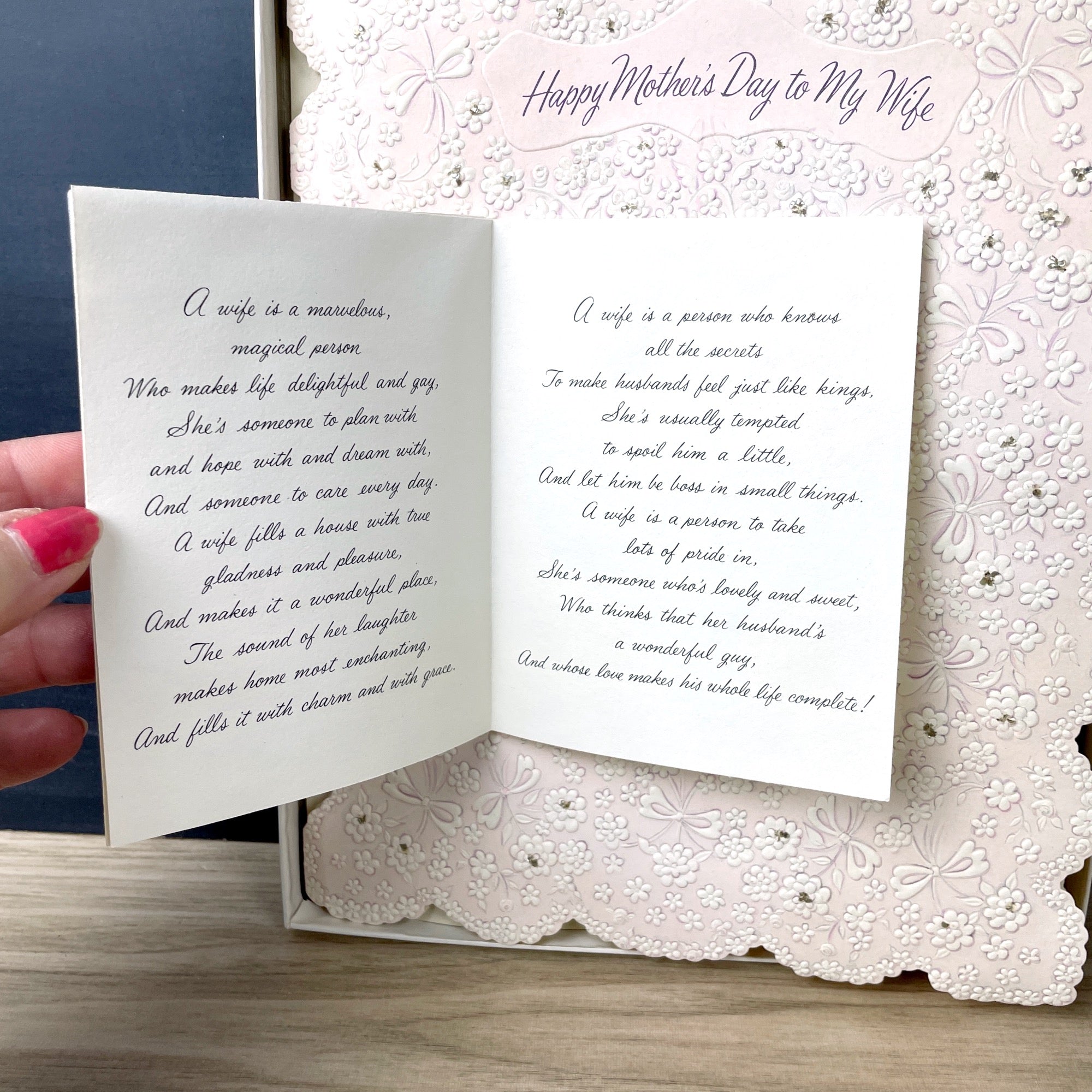 Vintage 1960s Hallmark "Happy Mother's Day to my Wife" oversized unused greeting card. Front is die cut, embossed and glittered, with an applied satin "What is a Wife?" folder that opens to reveal a poem. Fit into a gift box. Made in USA.