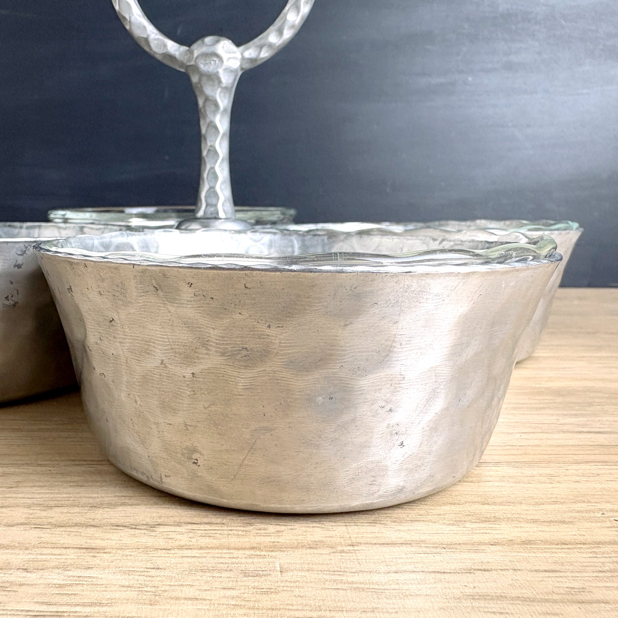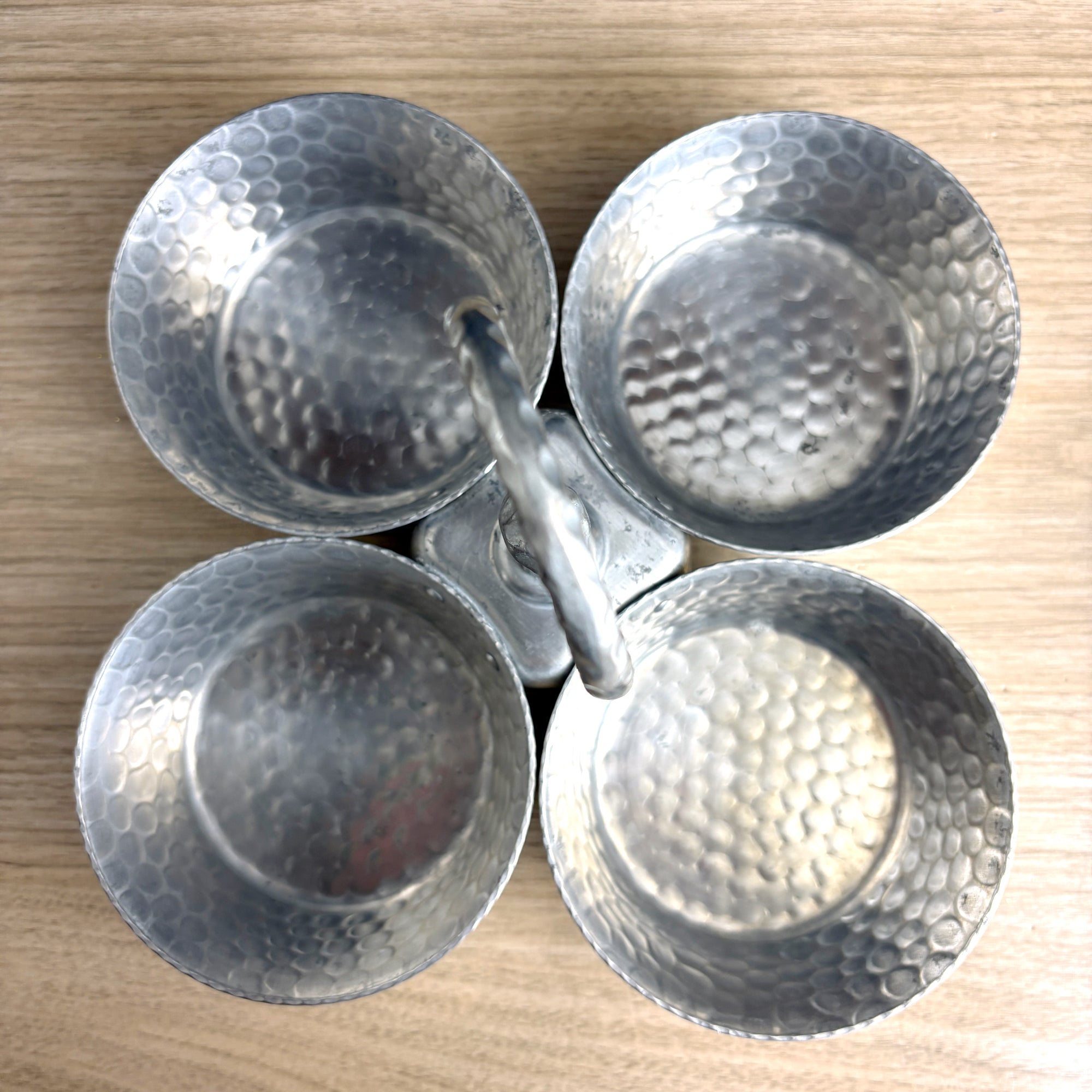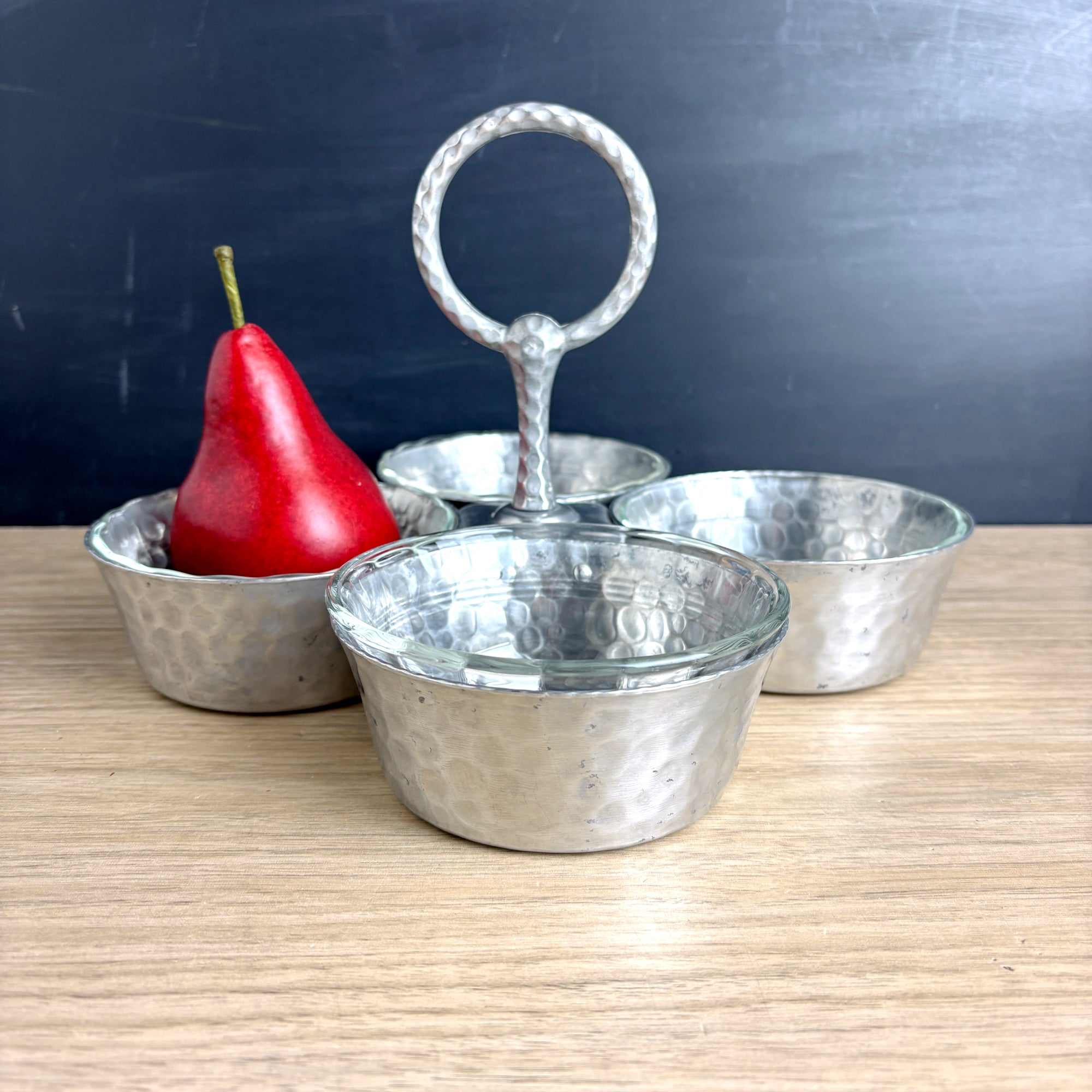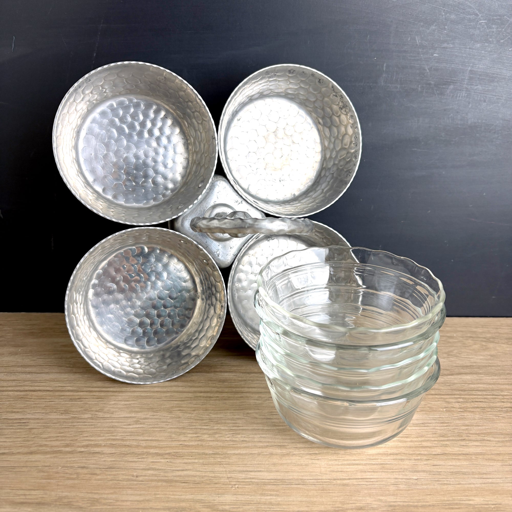 Four bowl hammered aluminum condiment or snack server, with Pyrex #464 custard cups that fit them perfectly. Aluminum server is four bowls joined to a center handle with double rivets. Pyrex bowls were added later, but the fit is like Cinderella's foot in that glass slipper.