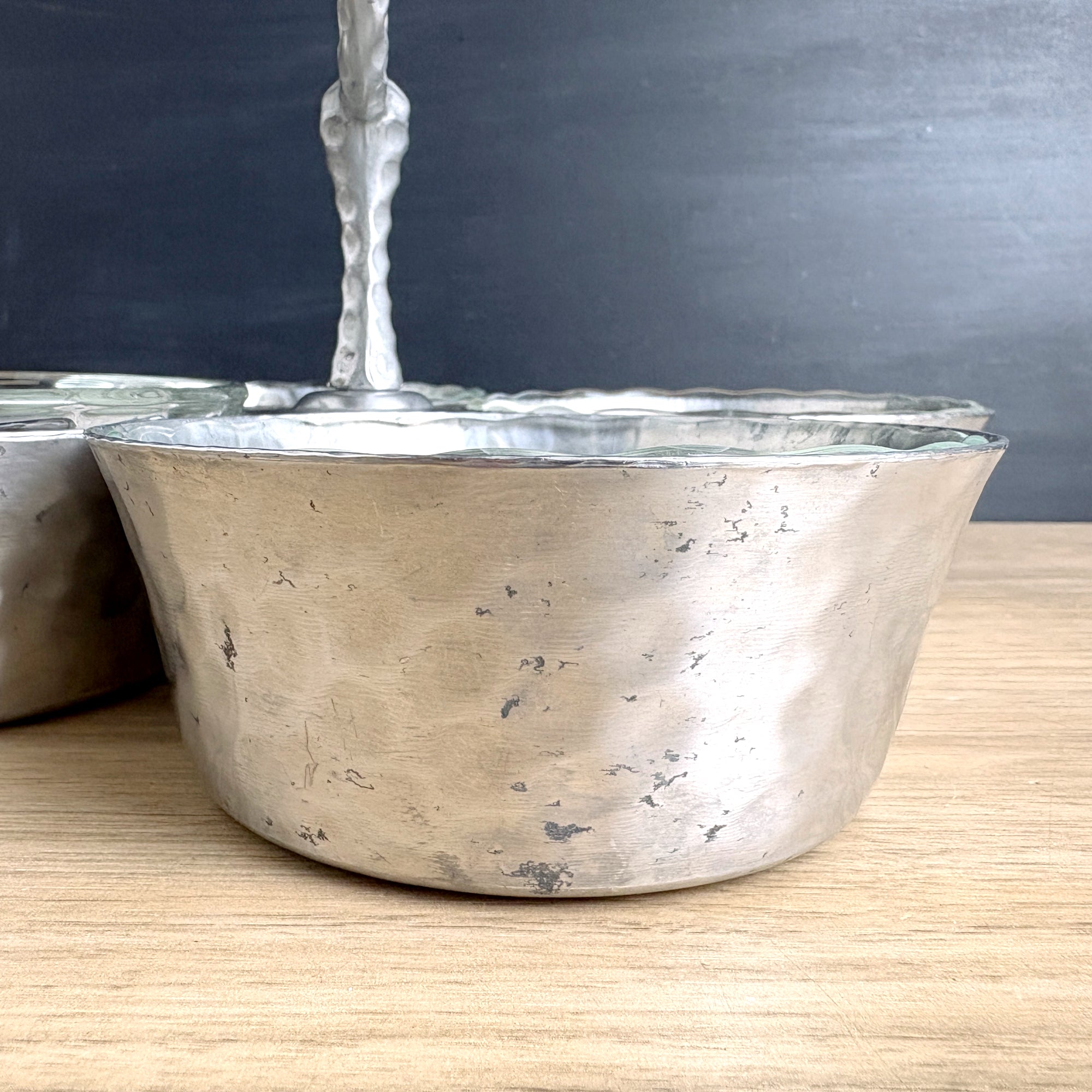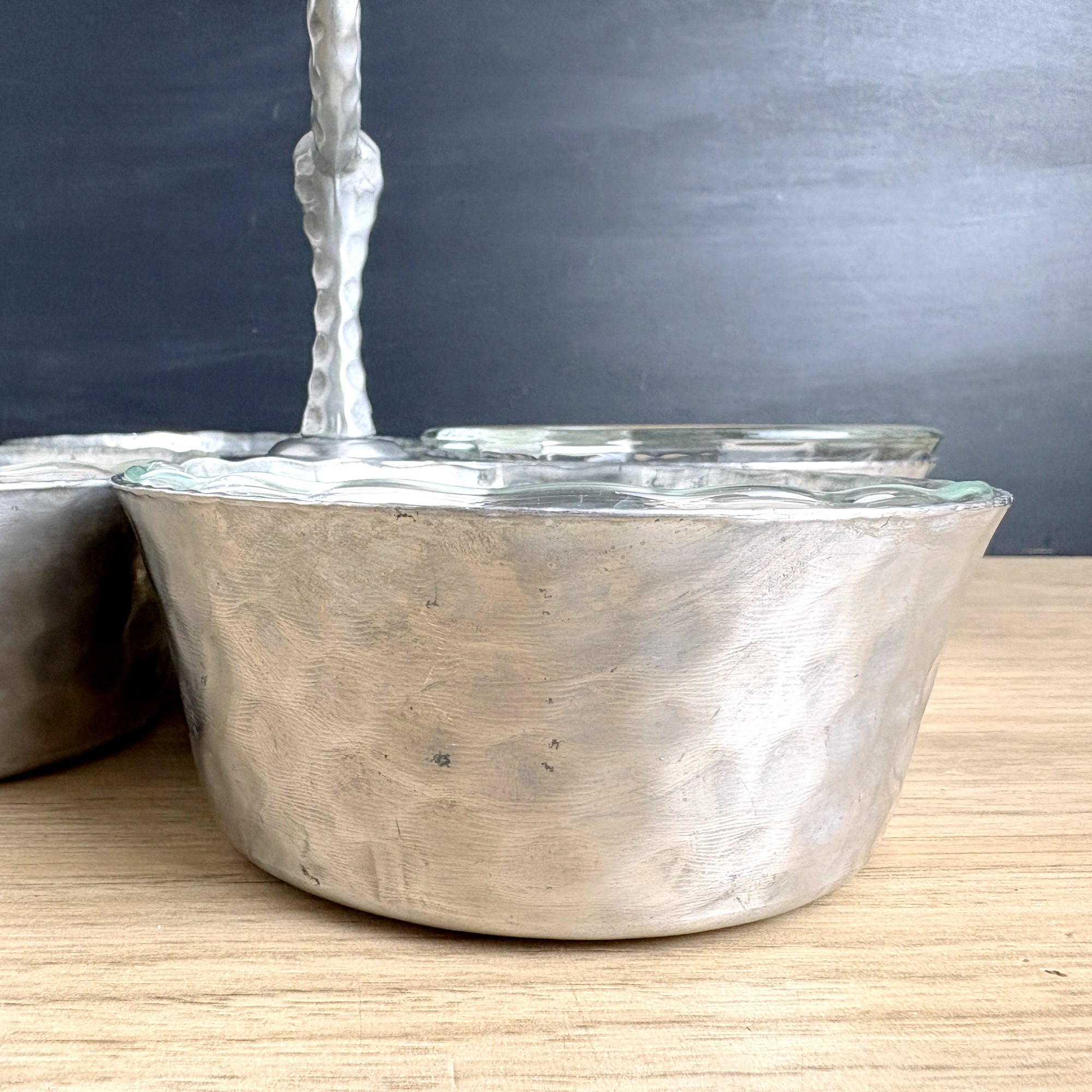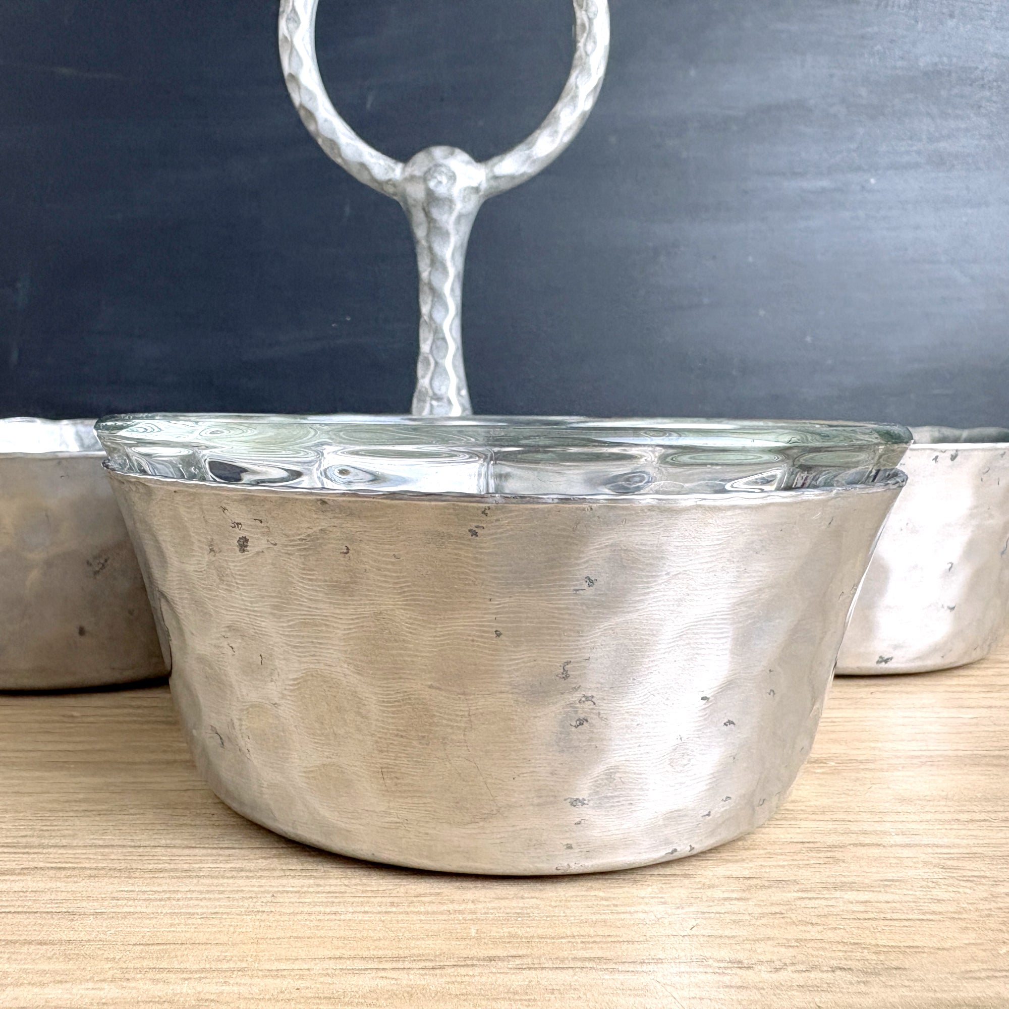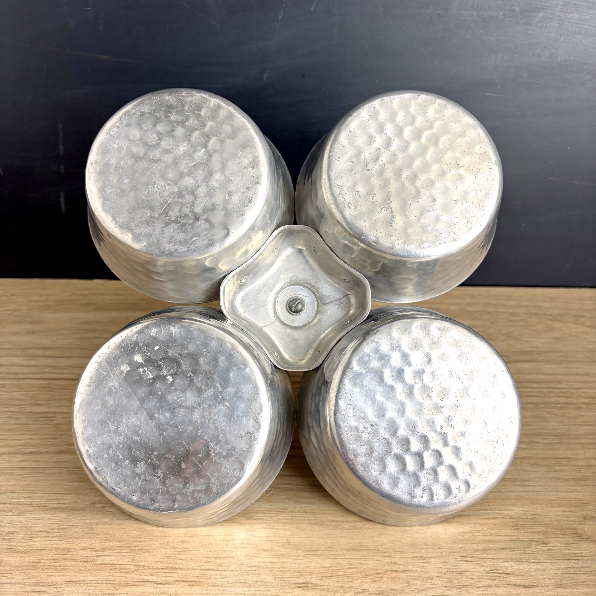 Four bowl hammered aluminum condiment or snack server, with Pyrex #464 custard cups that fit them perfectly. Aluminum server is four bowls joined to a center handle with double rivets. Pyrex bowls were added later, but the fit is like Cinderella's foot in that glass slipper.