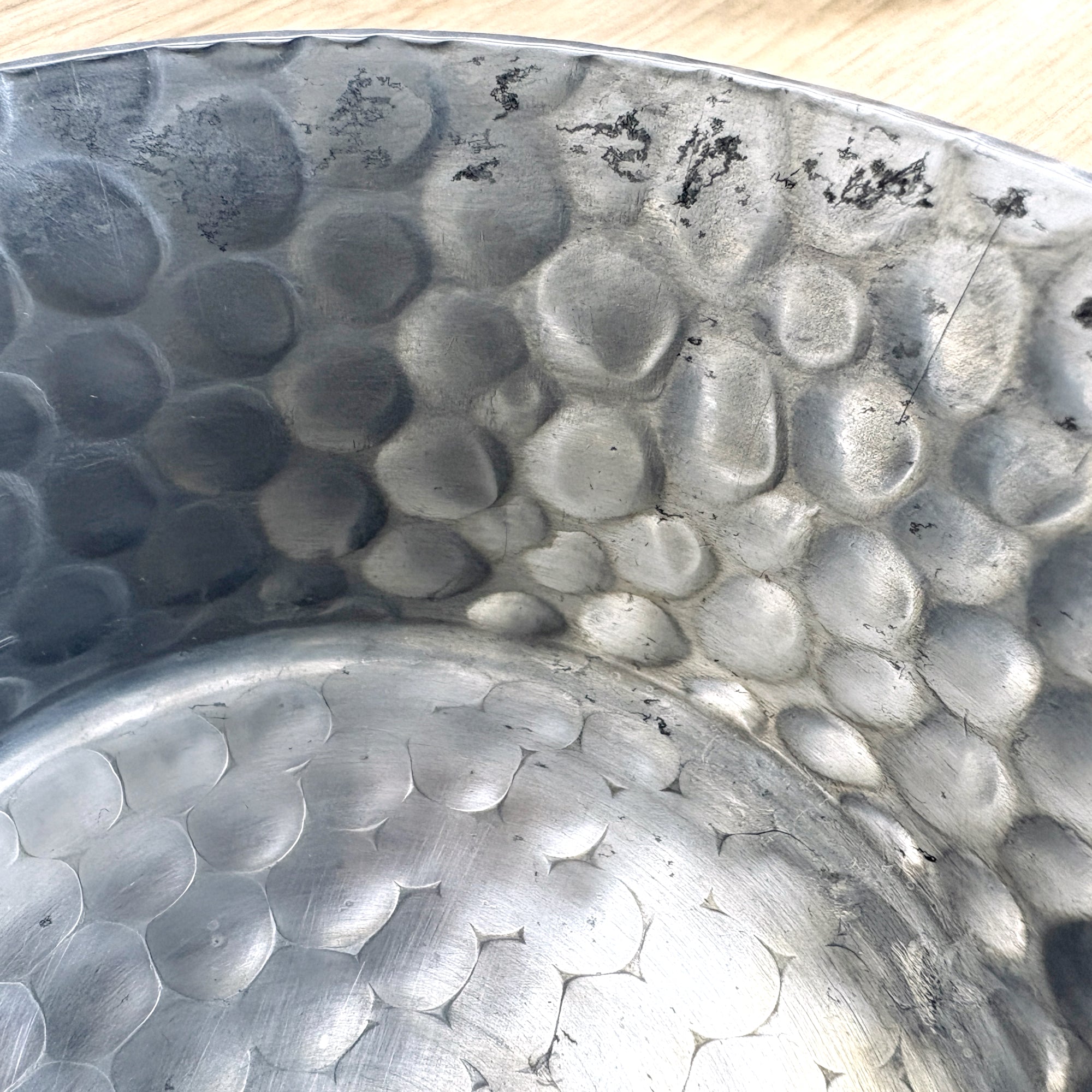 Hammered aluminum snack or condiment server with Pyrex bowls - 1960s vintage