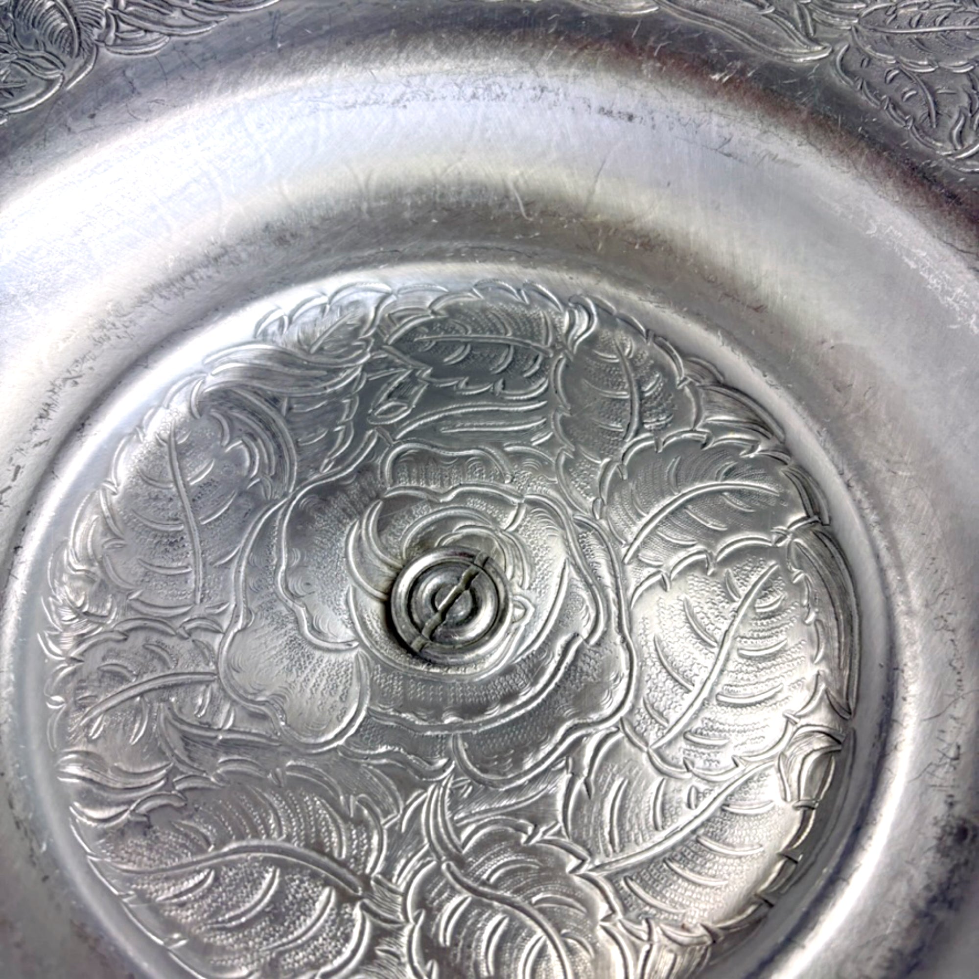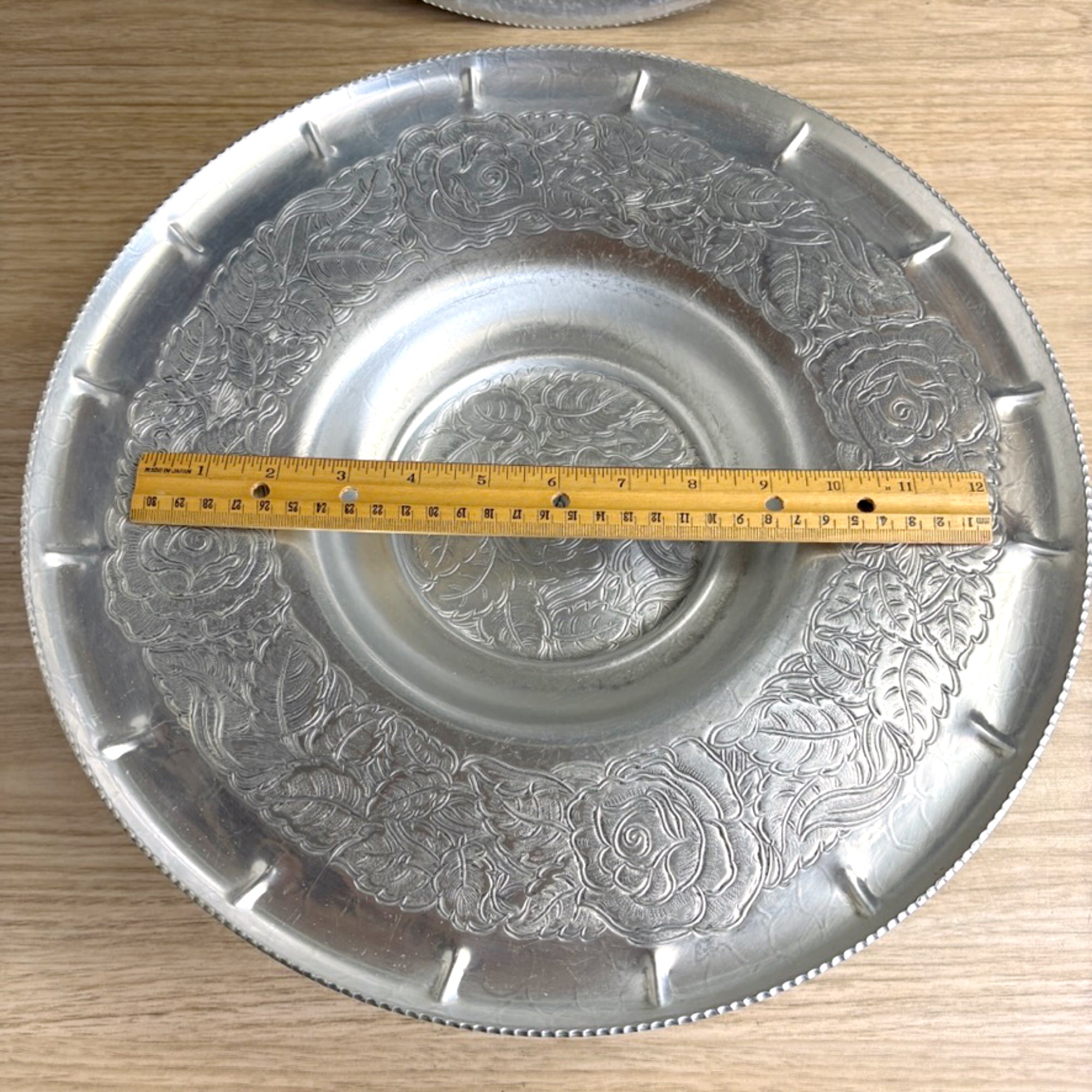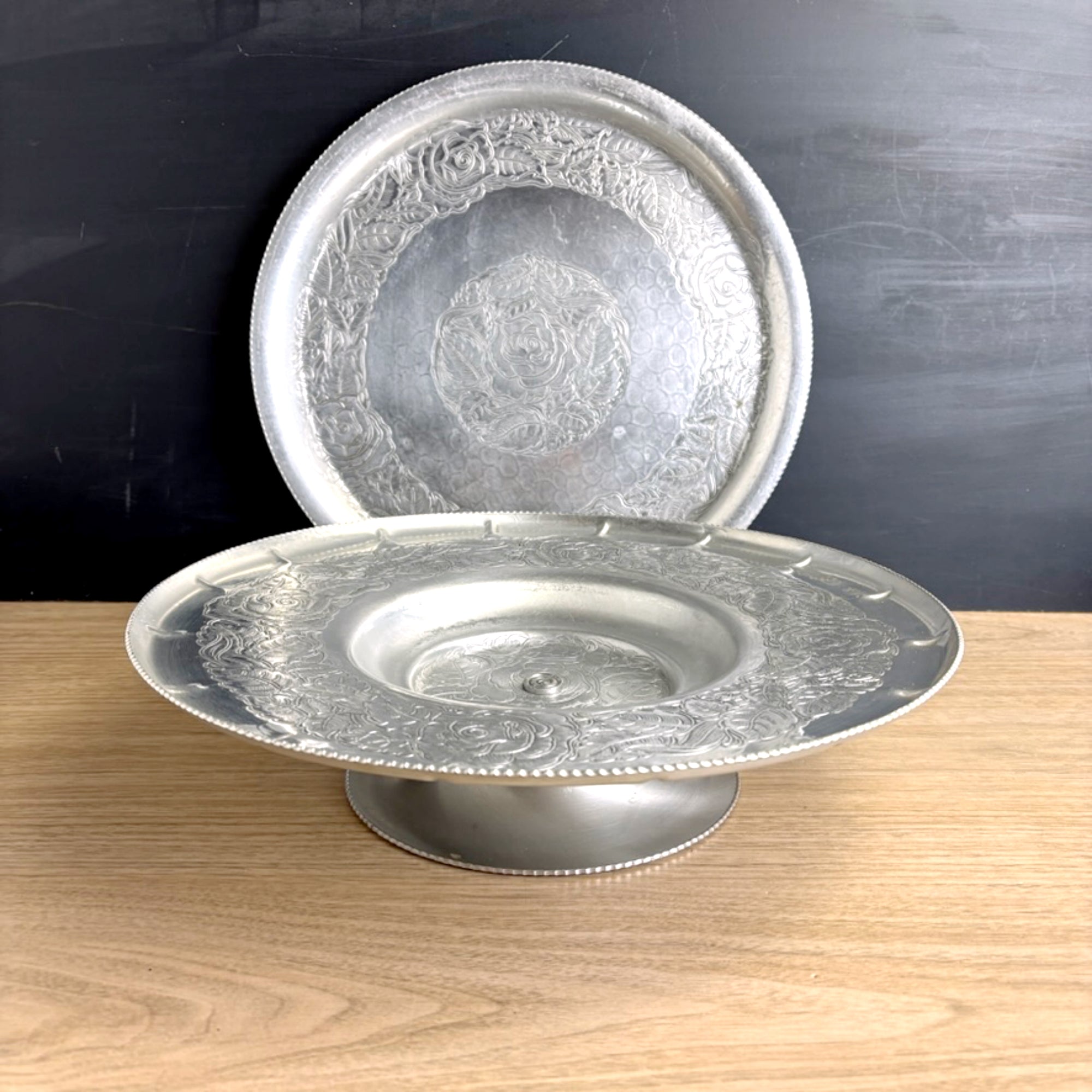 Vintage set of aluminum Lazy Susan and serving tray by Gailstyn. Hand wrought and stamped with flowers and leaves and a scalloped edge. Sturdy metal is perfect for outdoor serving as well as indoor entertaining and display. A bowl, not included, can be used in the center of the Lazy Susan.