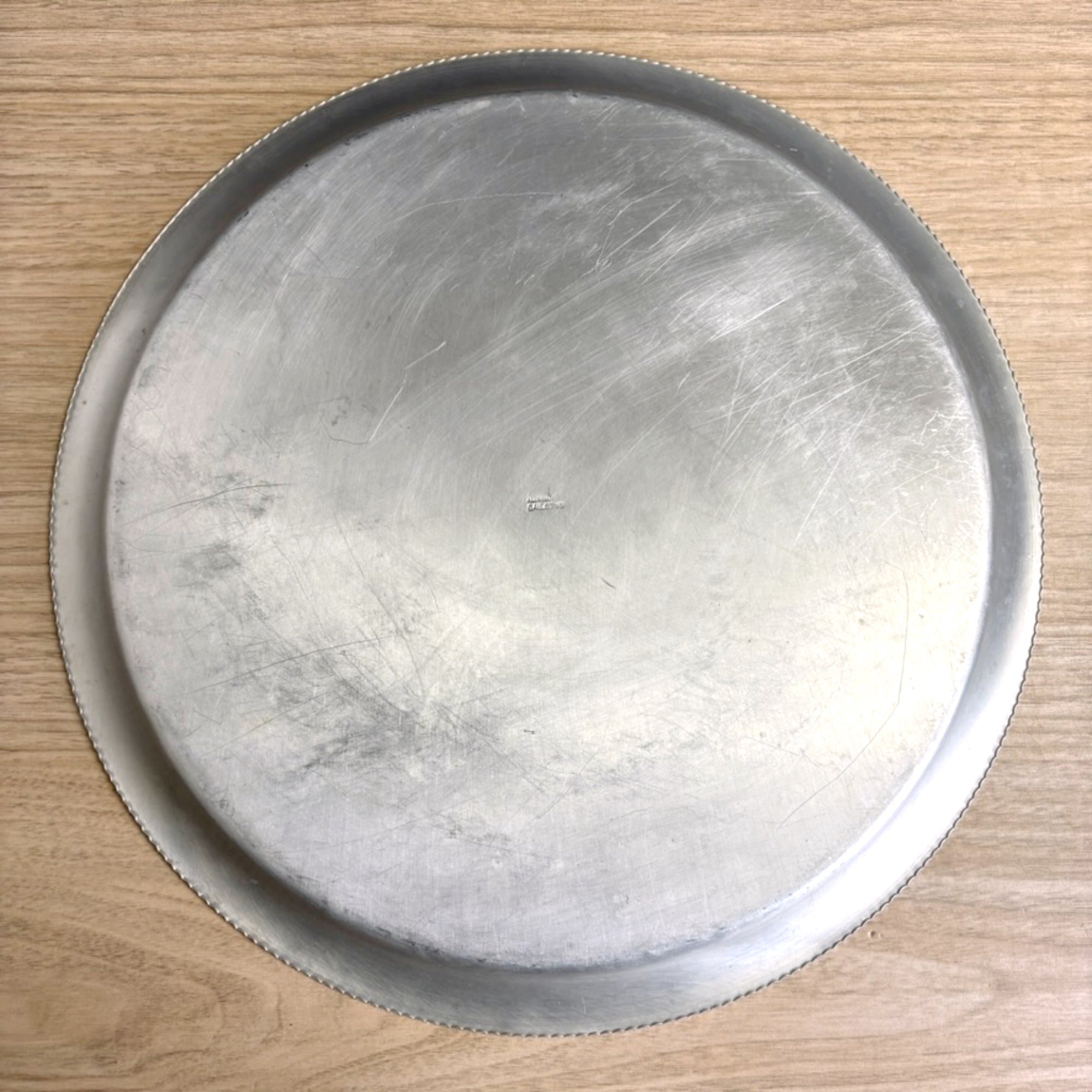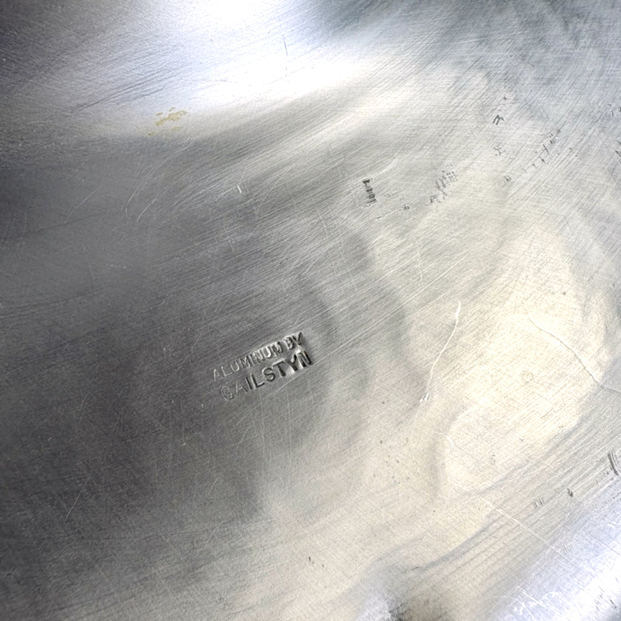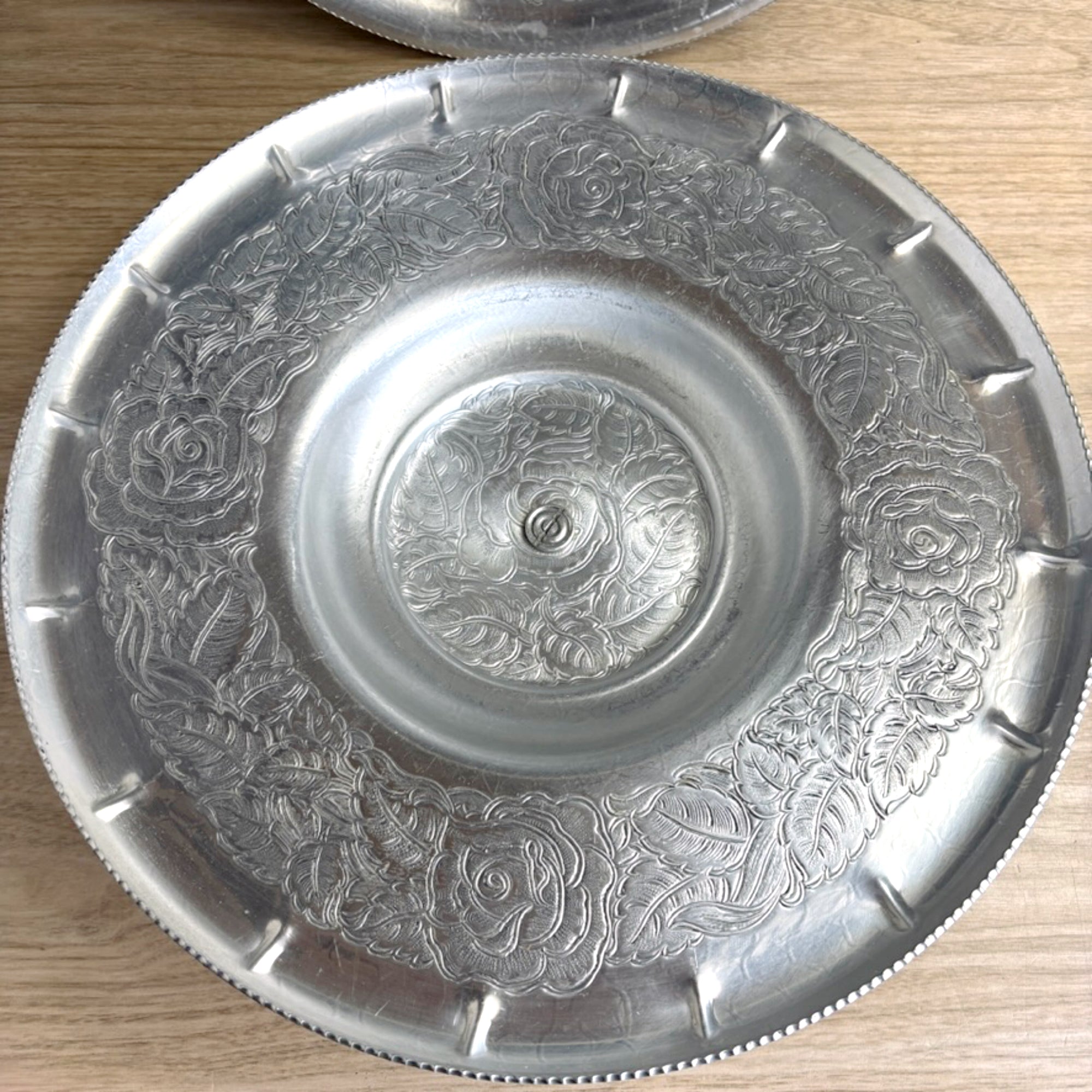 Vintage set of aluminum Lazy Susan and serving tray by Gailstyn. Hand wrought and stamped with flowers and leaves and a scalloped edge. Sturdy metal is perfect for outdoor serving as well as indoor entertaining and display. A bowl, not included, can be used in the center of the Lazy Susan.