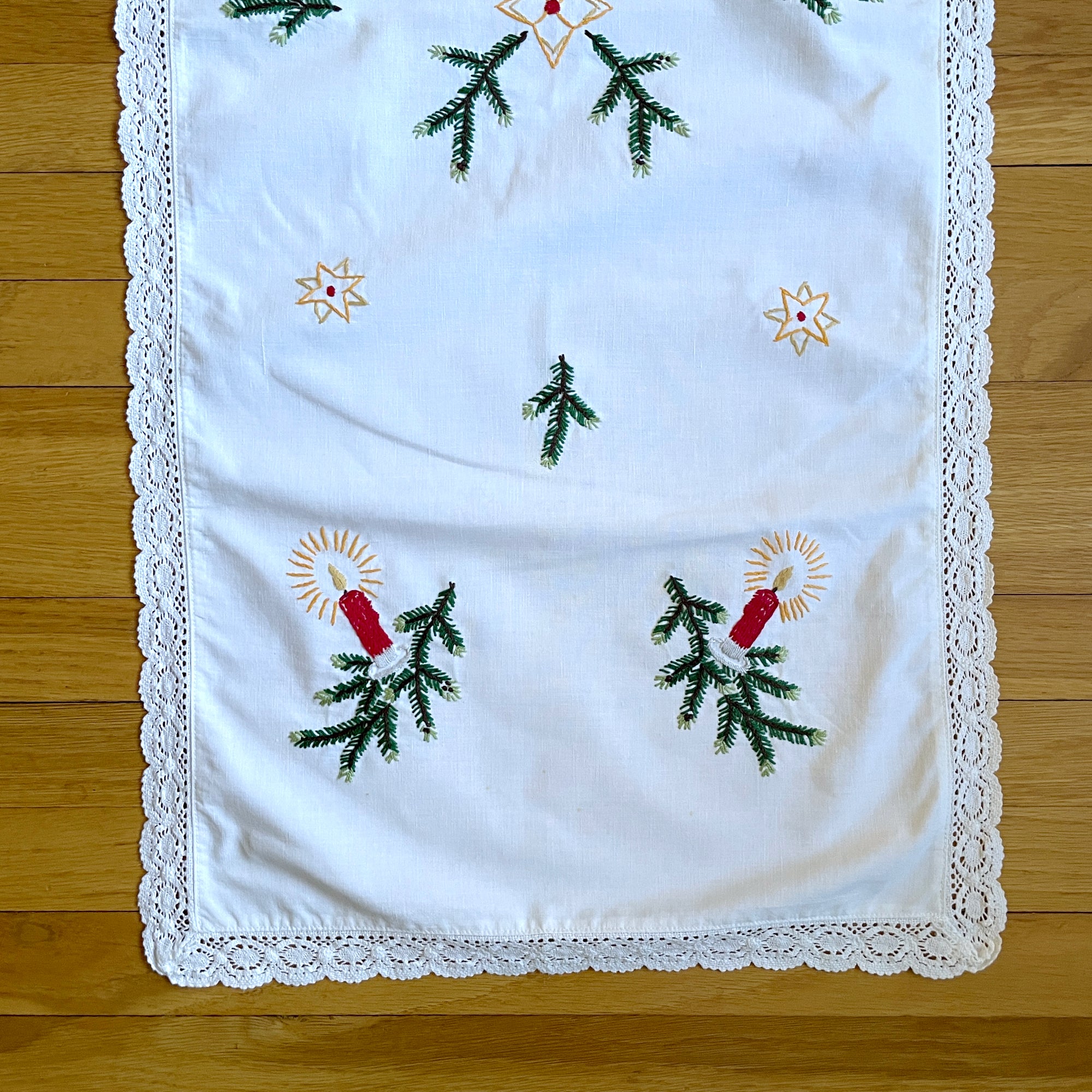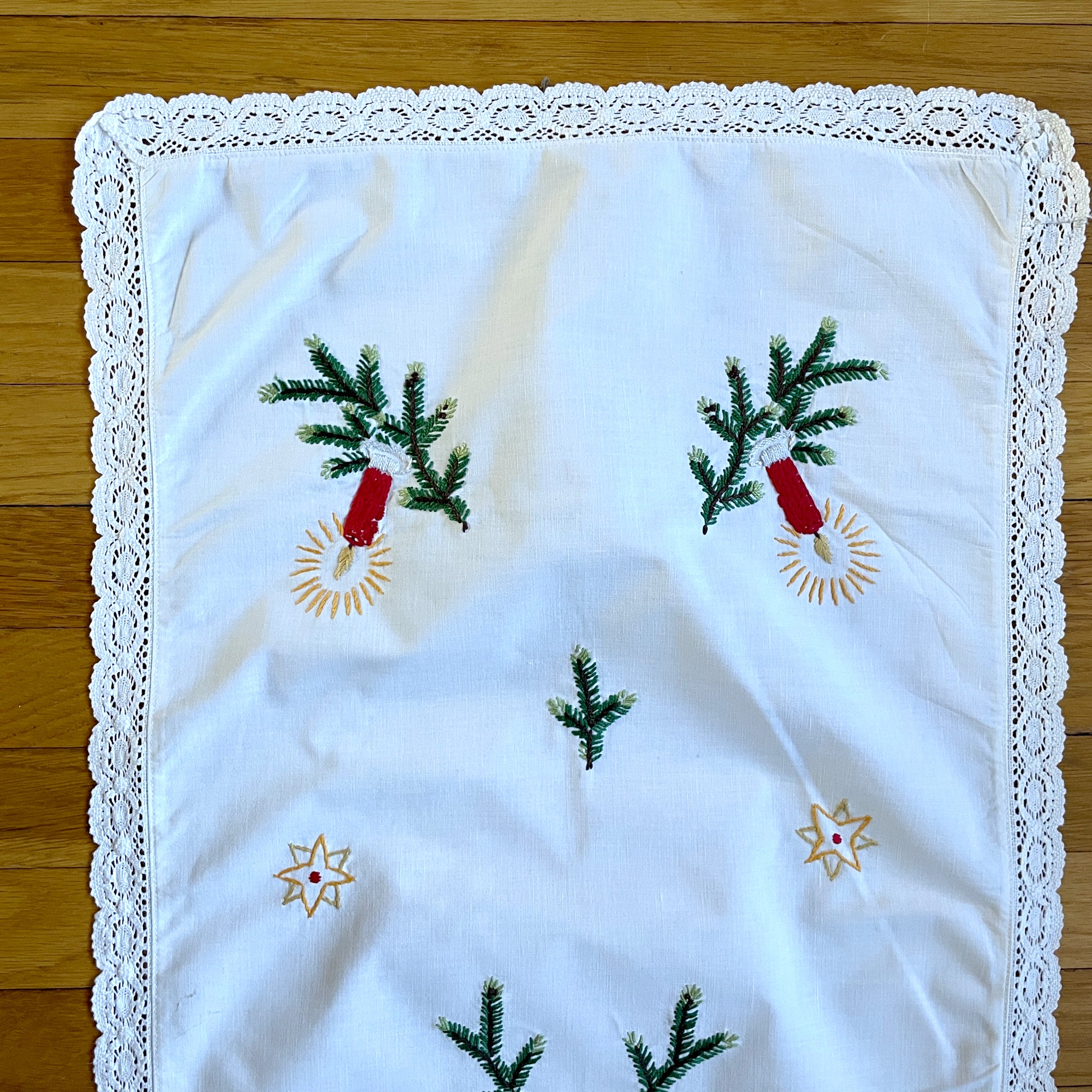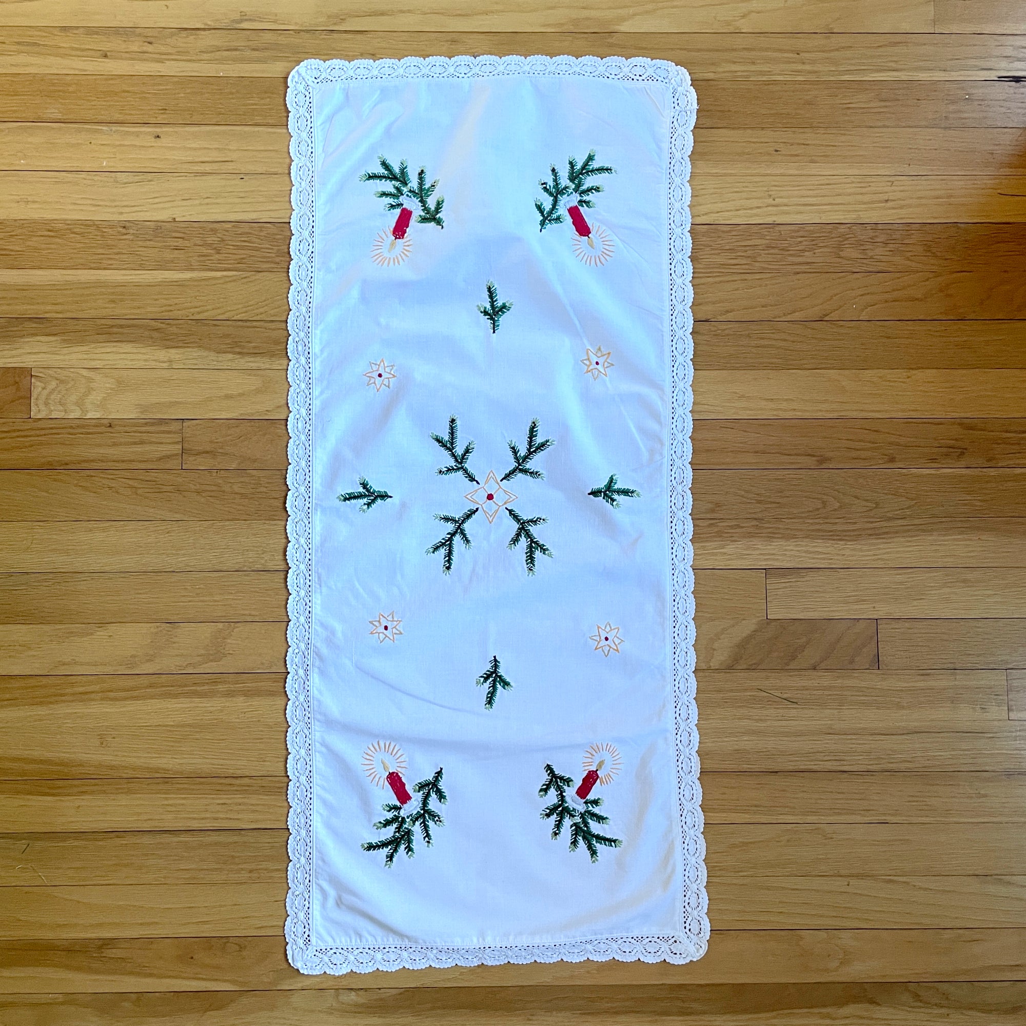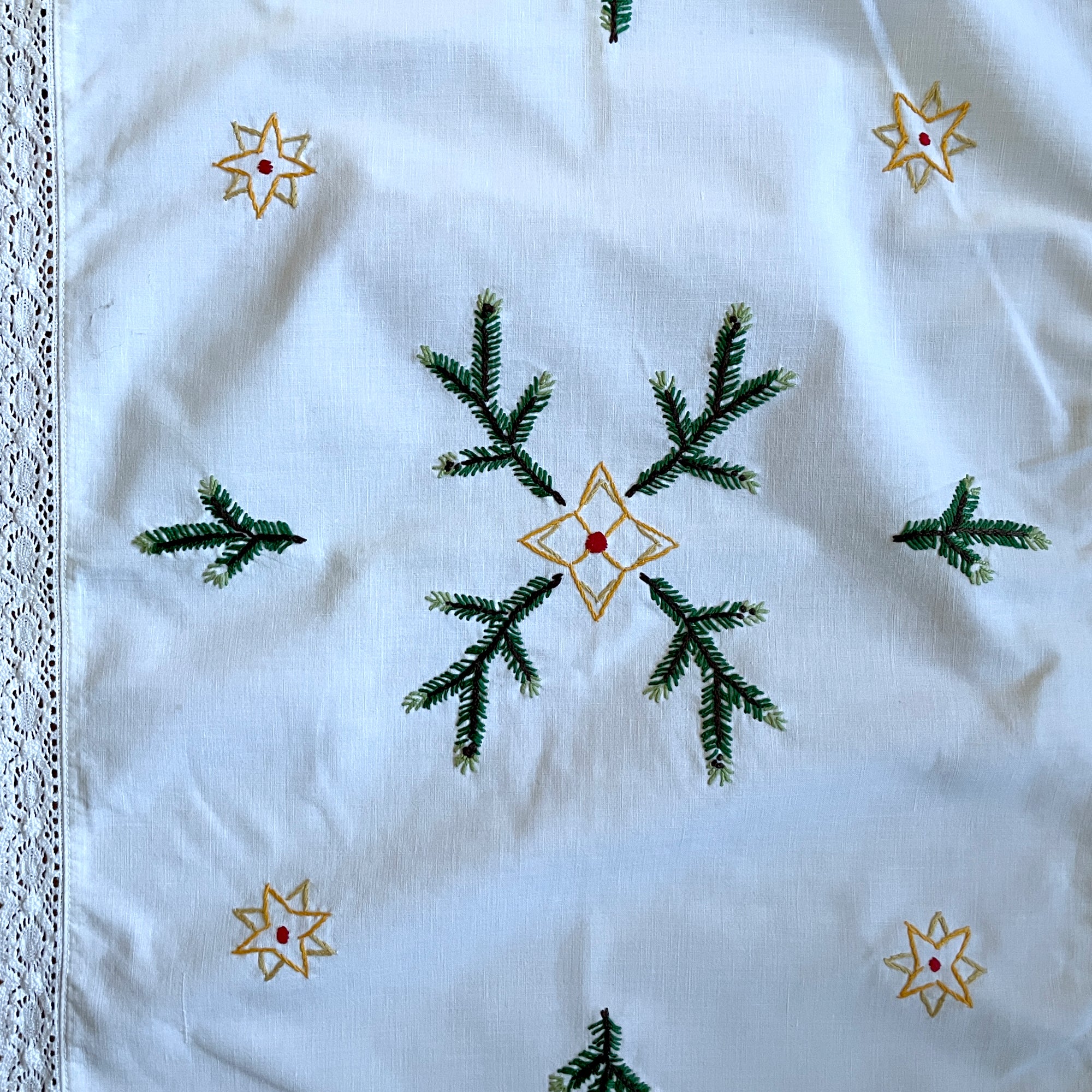 The hand embroidery on this snowy white Christmas cotton table runner is exquisitely done by a family member of the owner. Glowing candles in the corners, with stars and greens in the center. Trimmed in white cotton lace. Absolutely lovely linen from Austria.