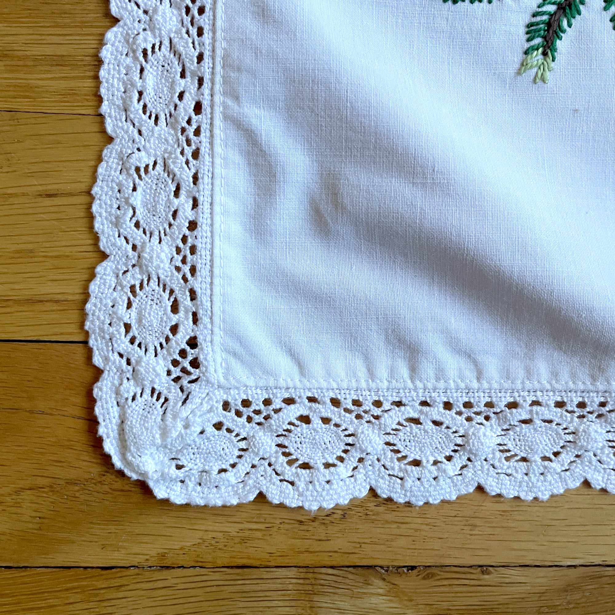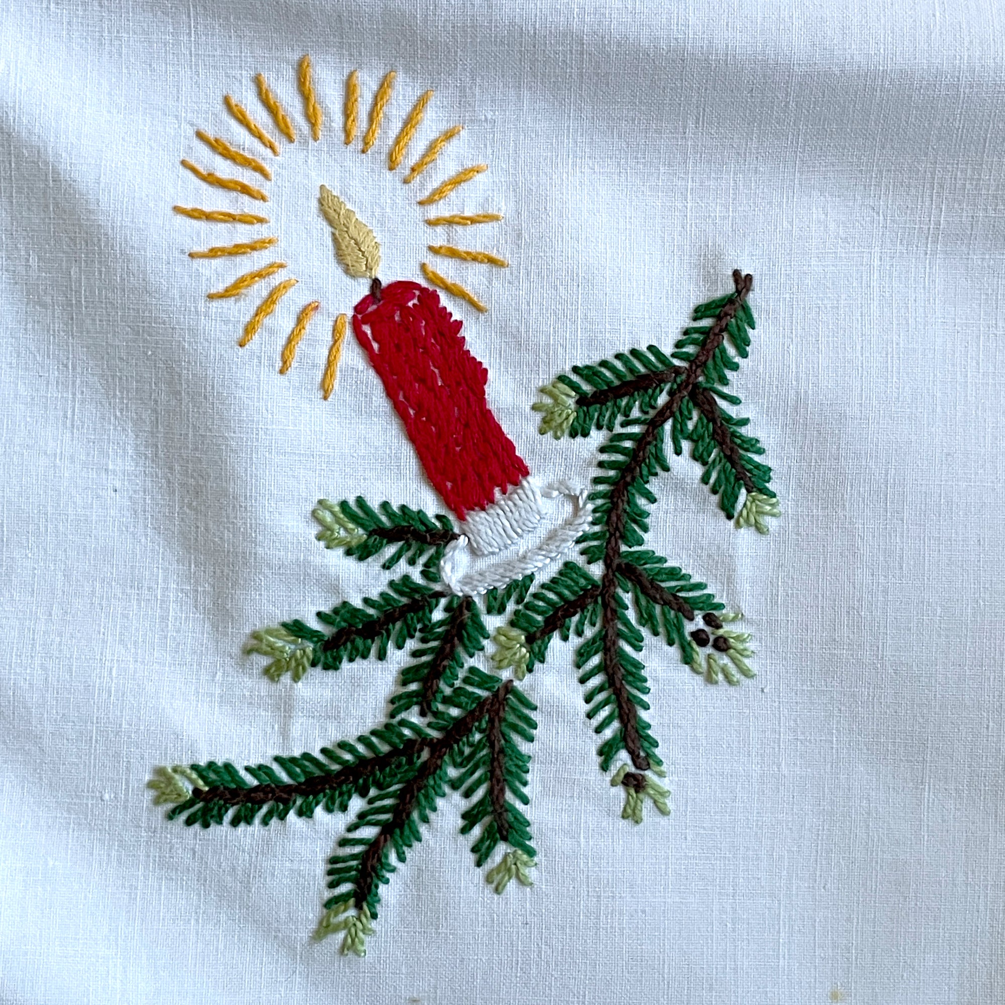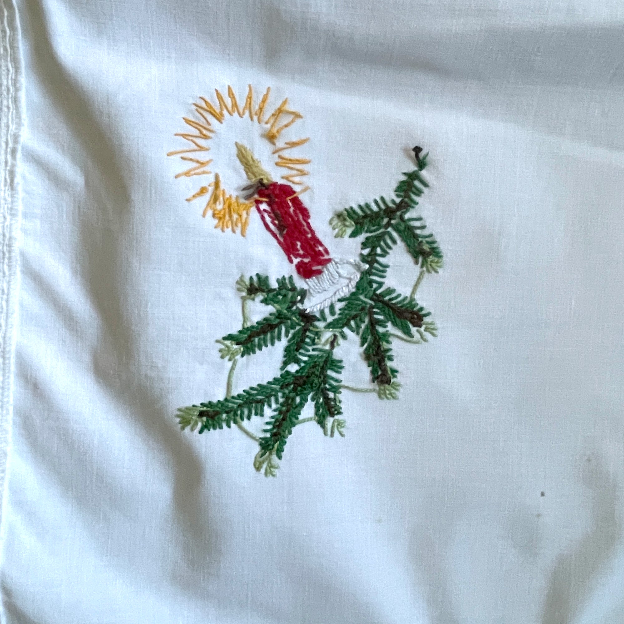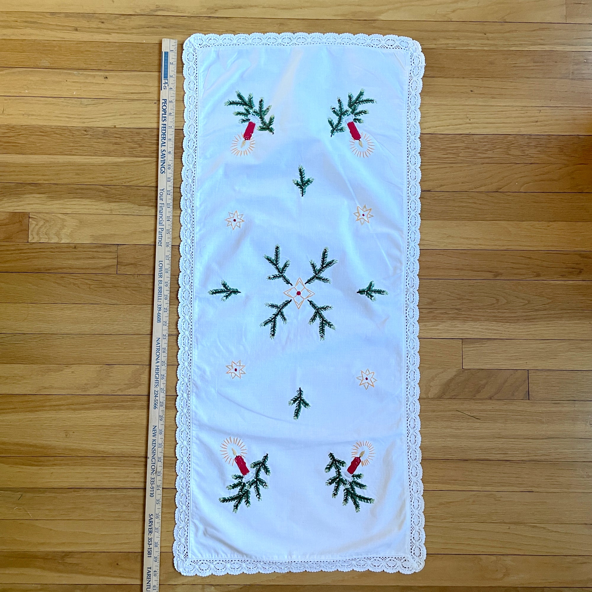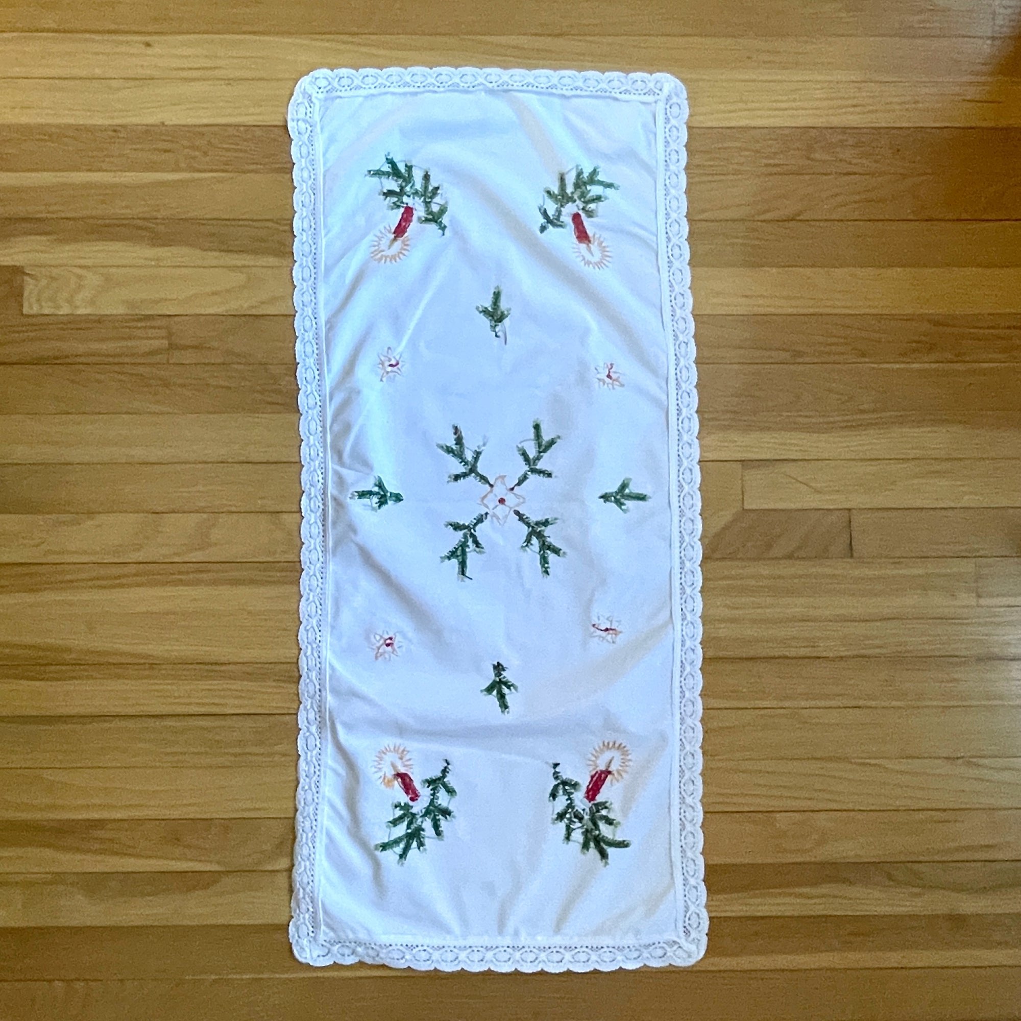 The hand embroidery on this snowy white Christmas cotton table runner is exquisitely done by a family member of the owner. Glowing candles in the corners, with stars and greens in the center. Trimmed in white cotton lace. Absolutely lovely linen from Austria.