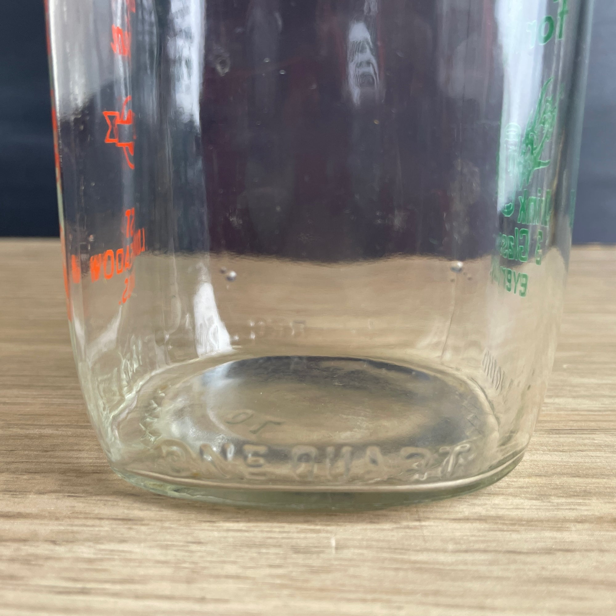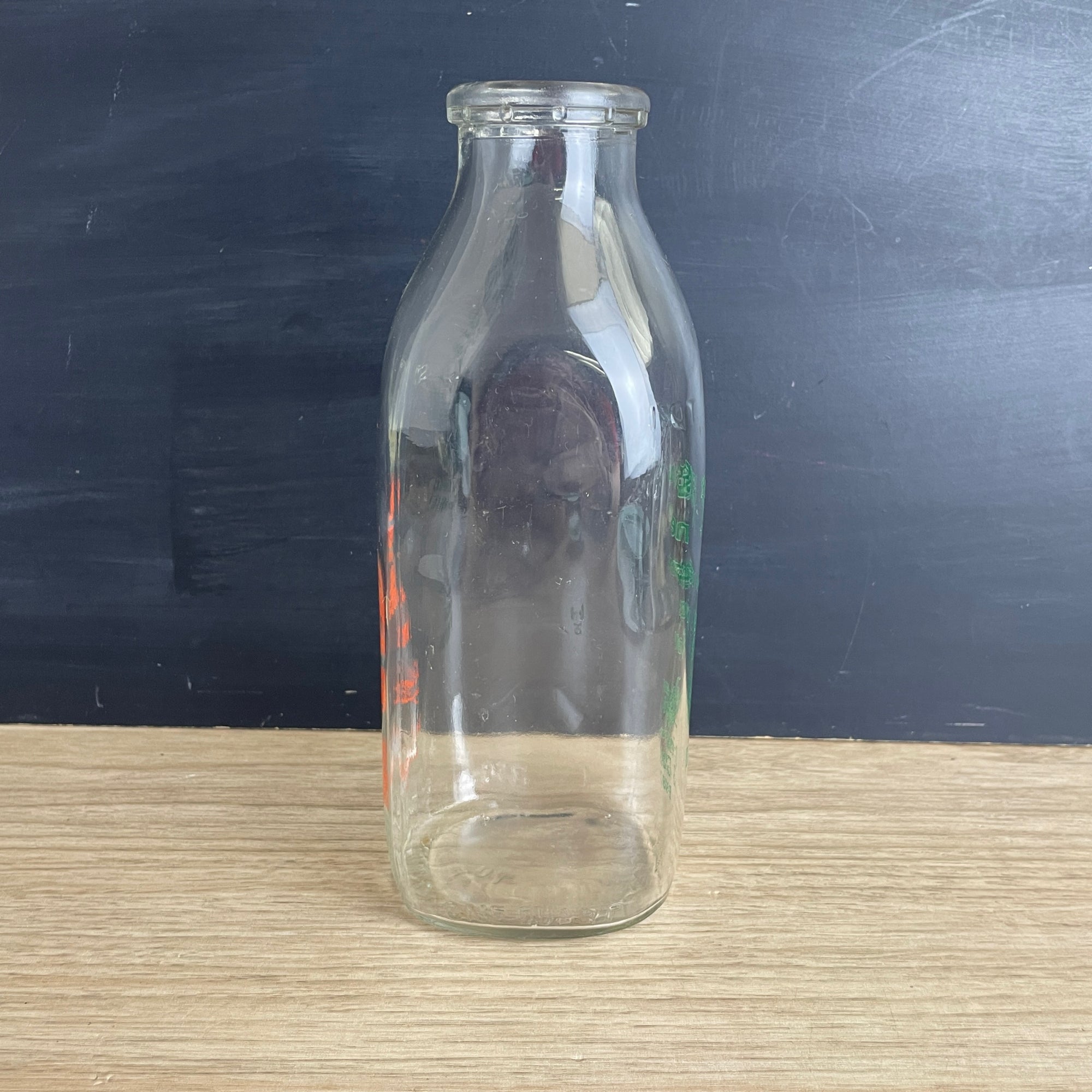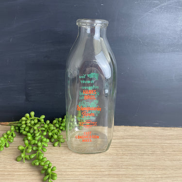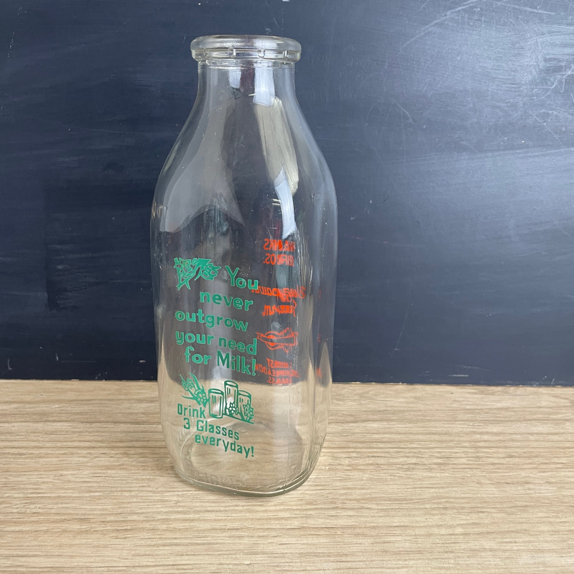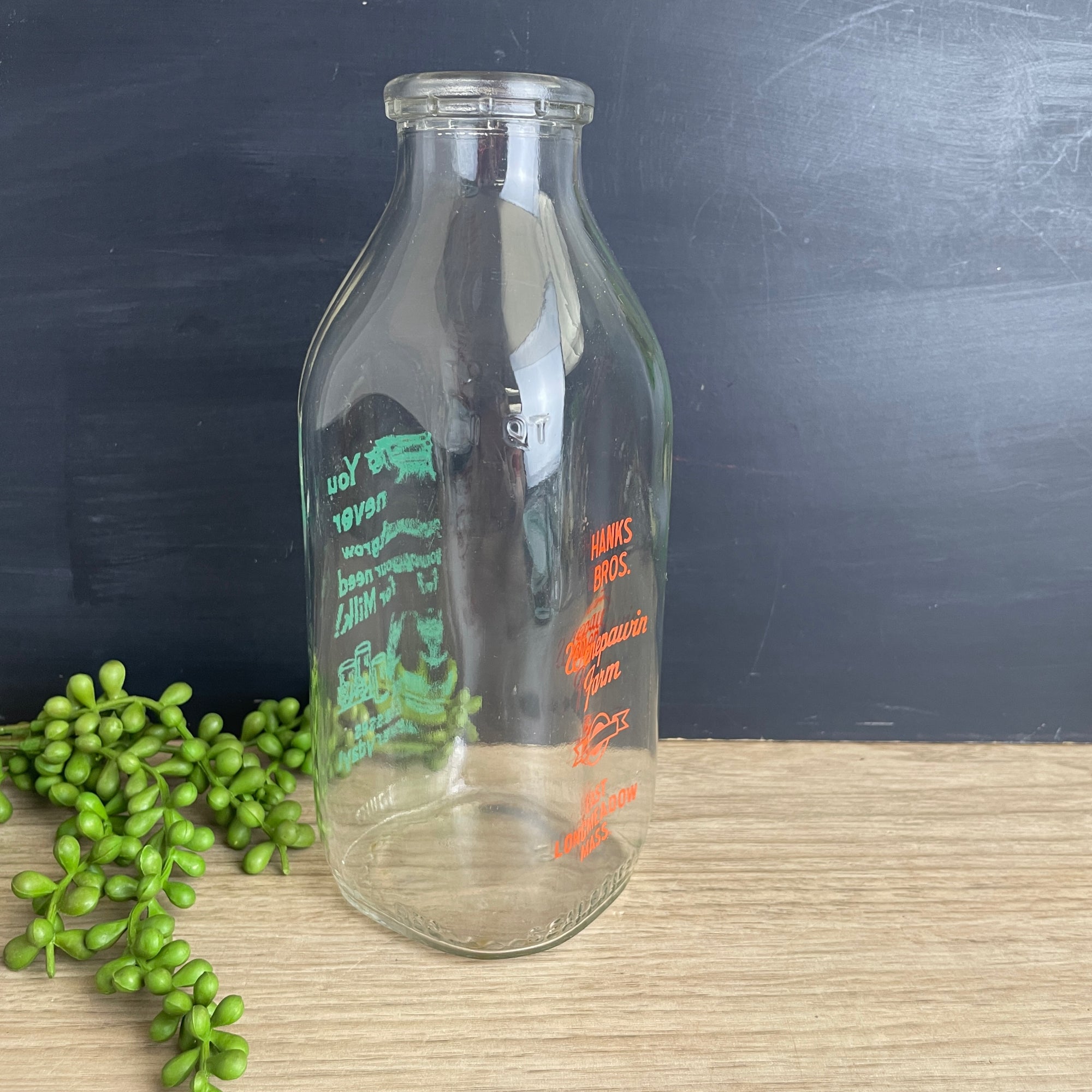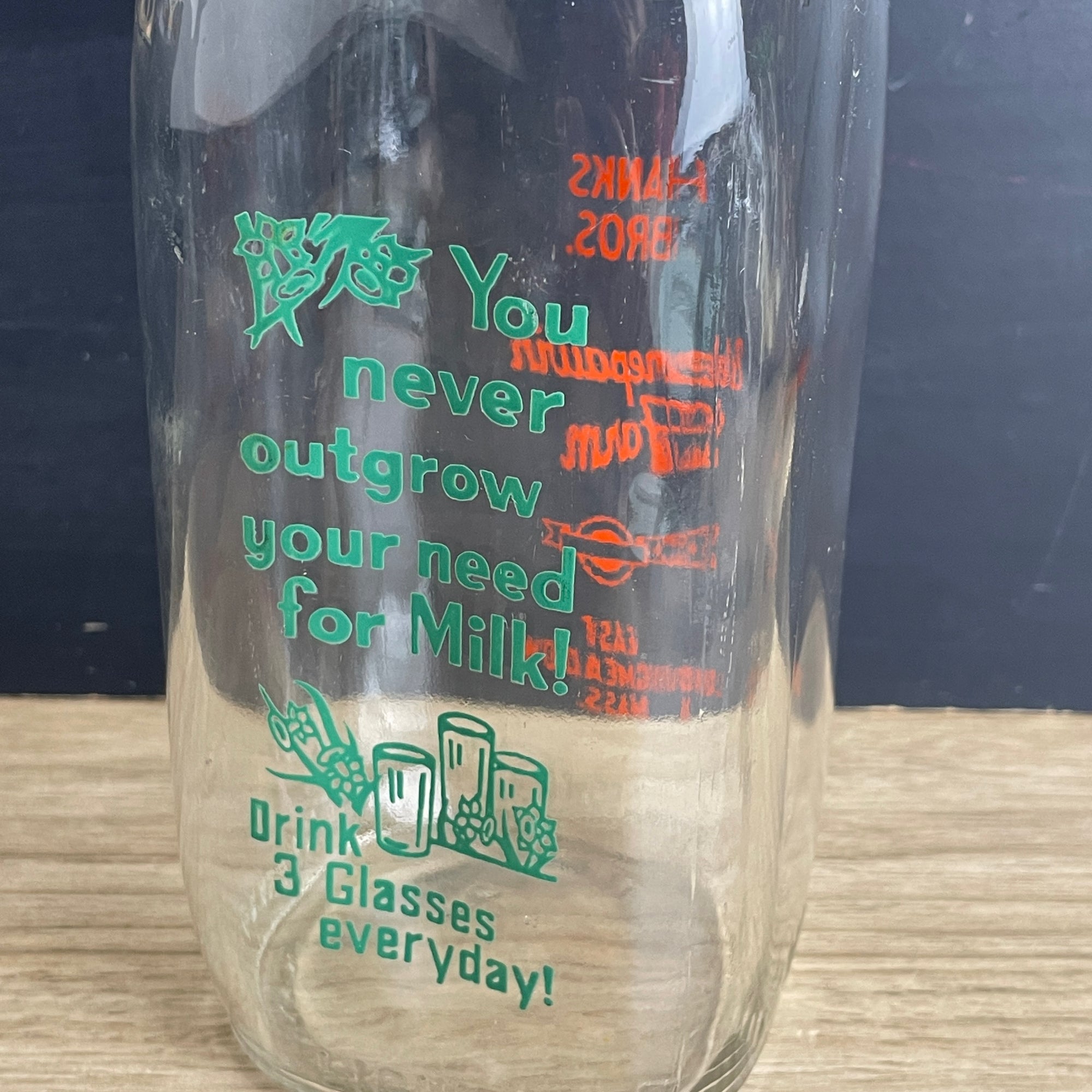 Vintage quart milk bottle from Hanks Bros Wenepawin Farm in East Longmeadow, MASS. Logo on one side in red. Back has green "You never outgrow your need for Milk! Drink 3 Glasses everyday!"
