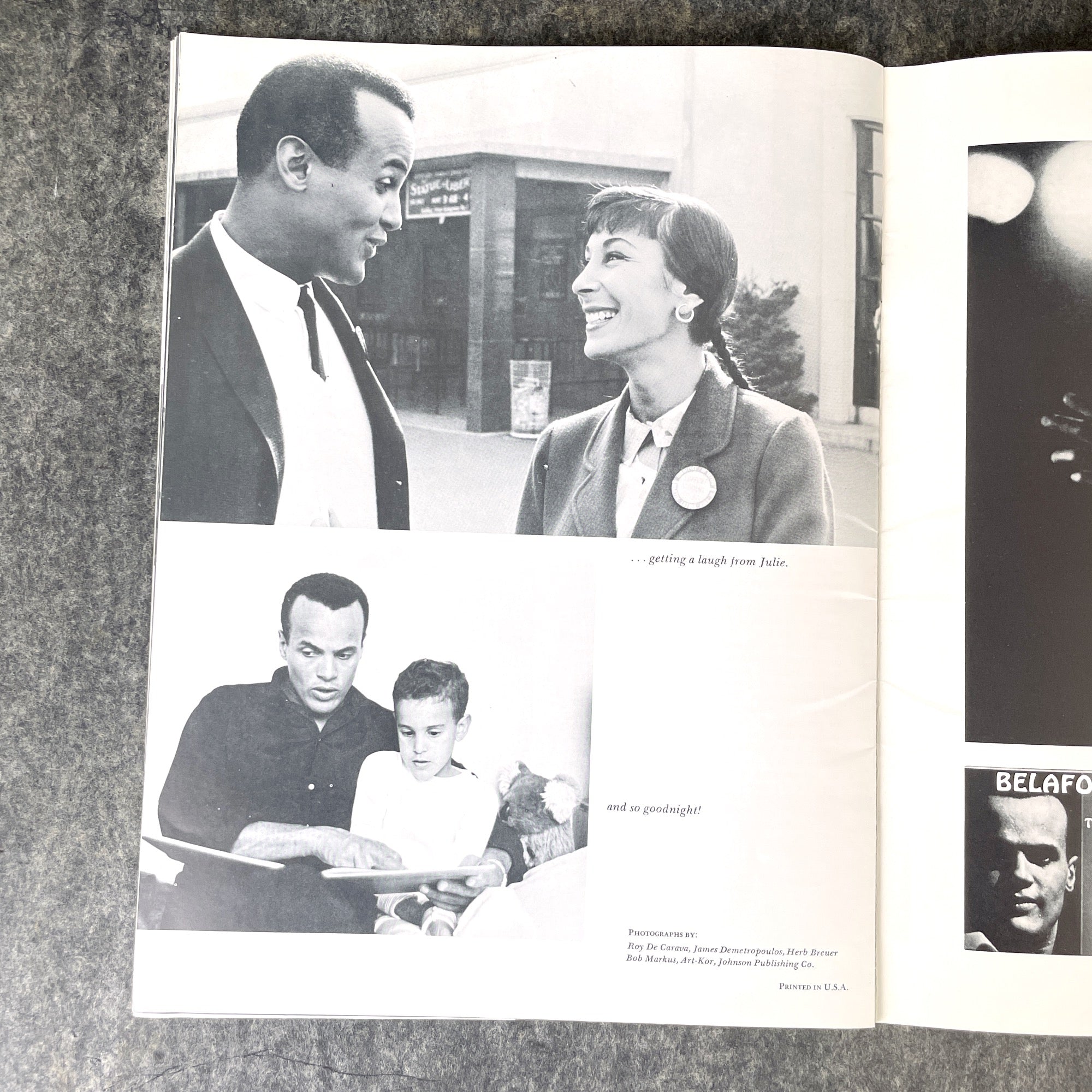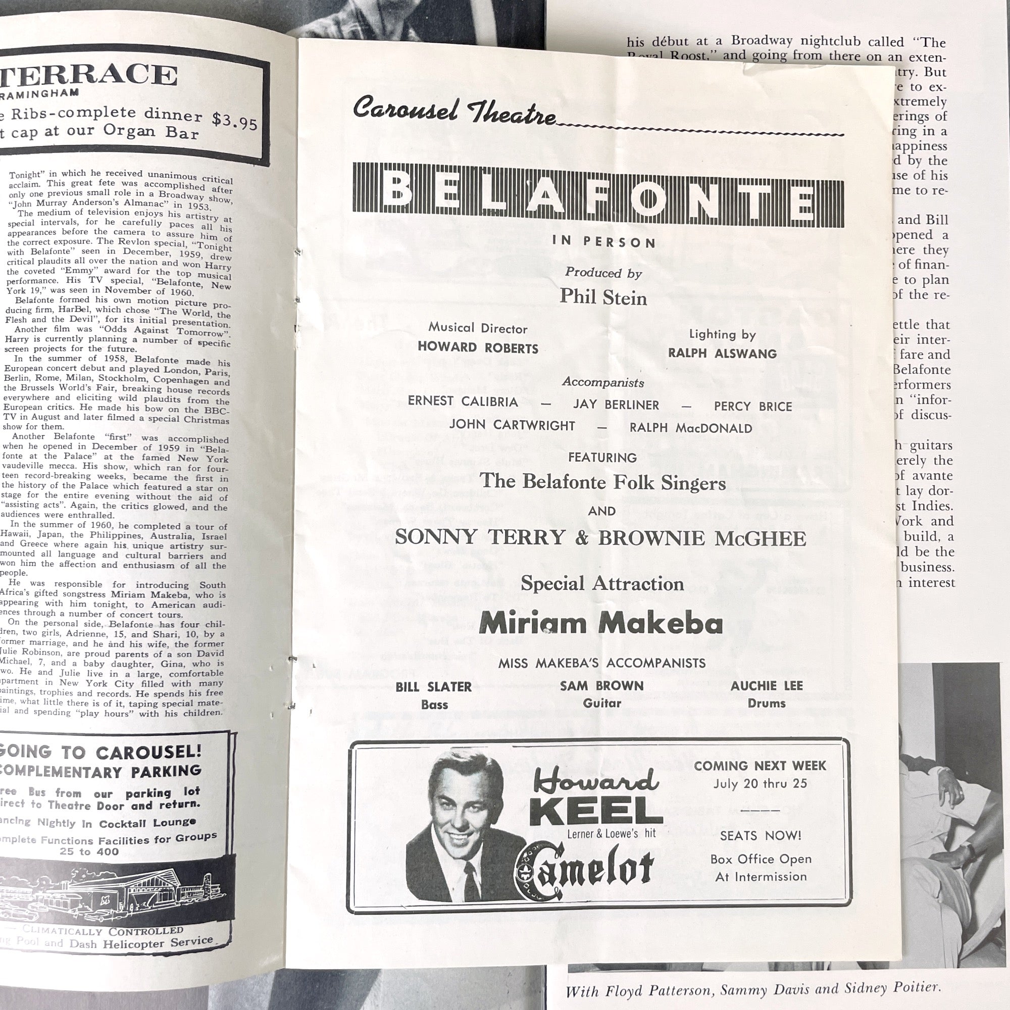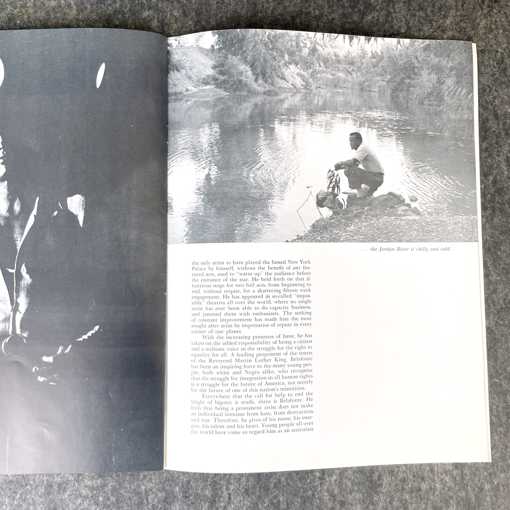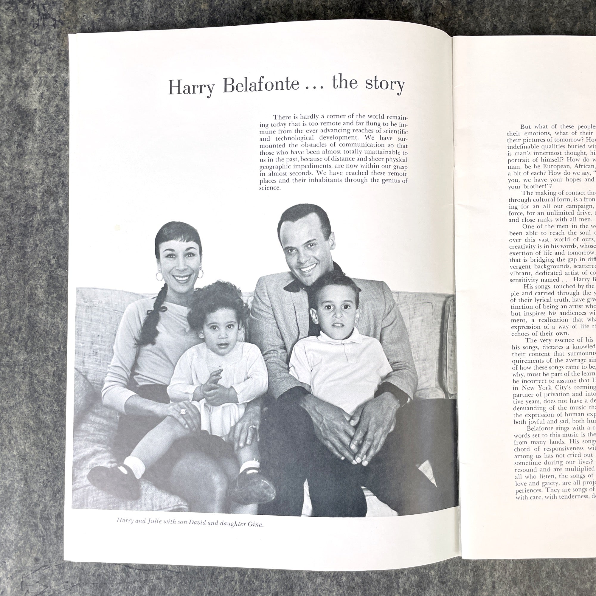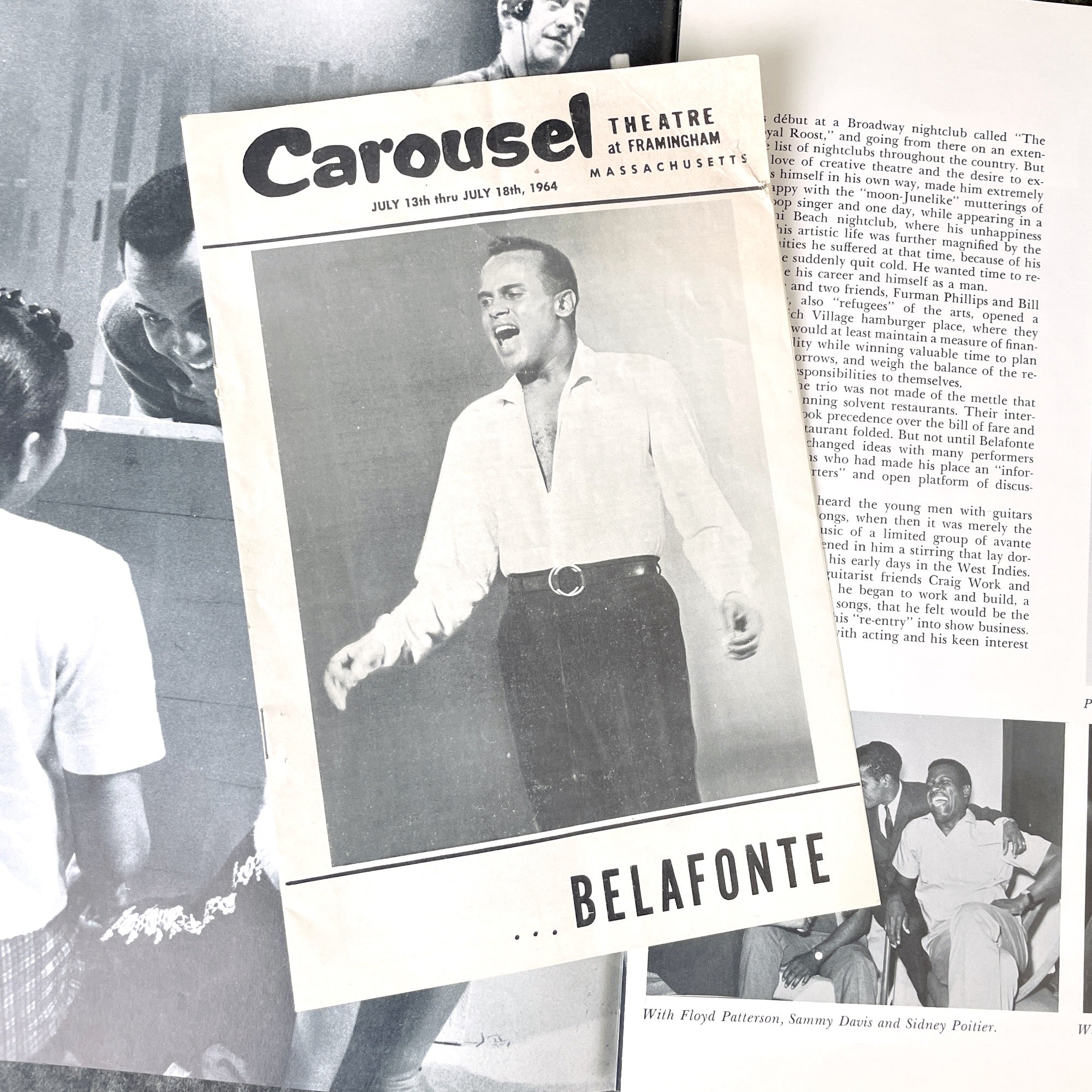 Harry Belafonte memorabilia from the 1960s. Souvenir story book with photos and details about he and his family. Plus a program from when he played at the Carousel Theatre at Framingham, MA in July, 1964.