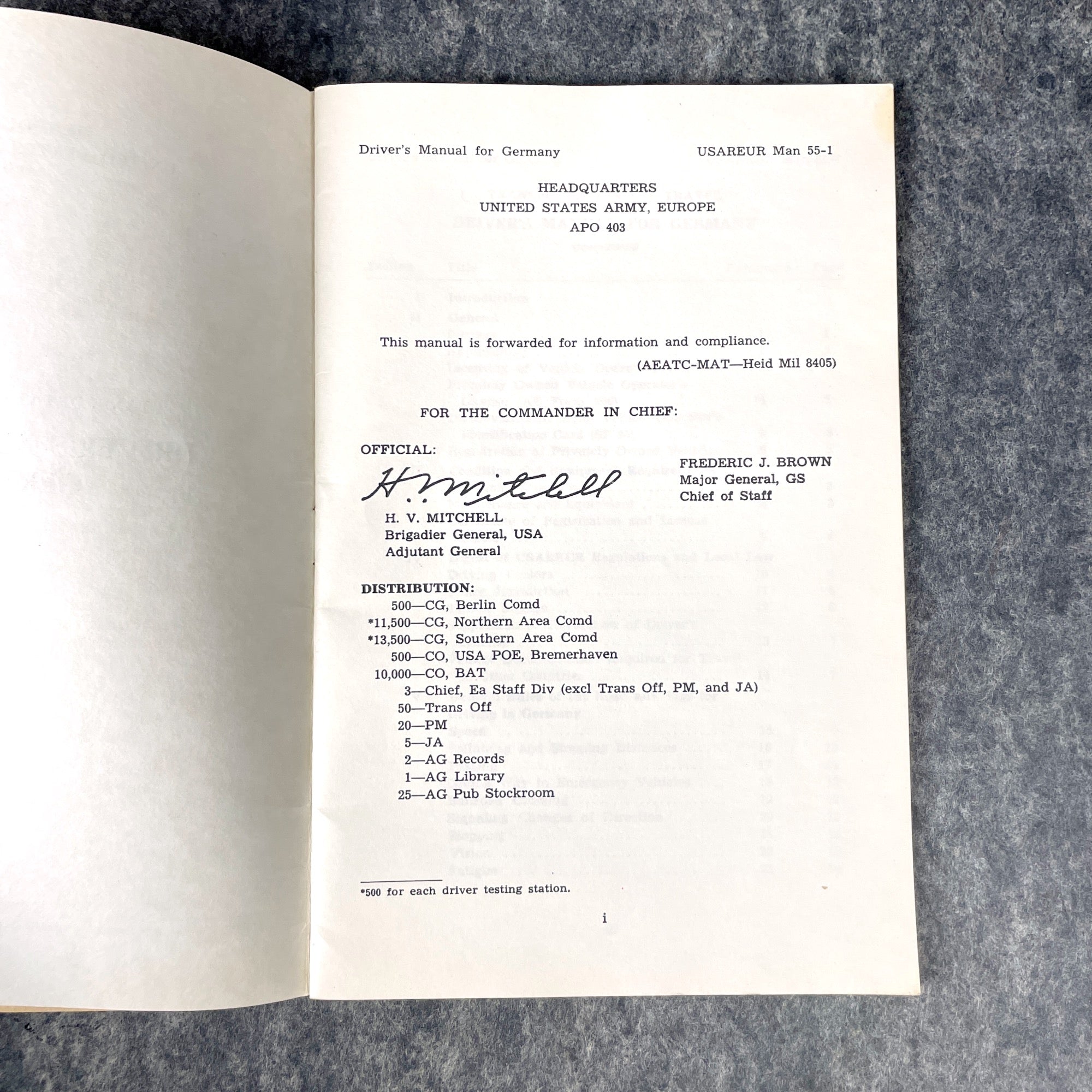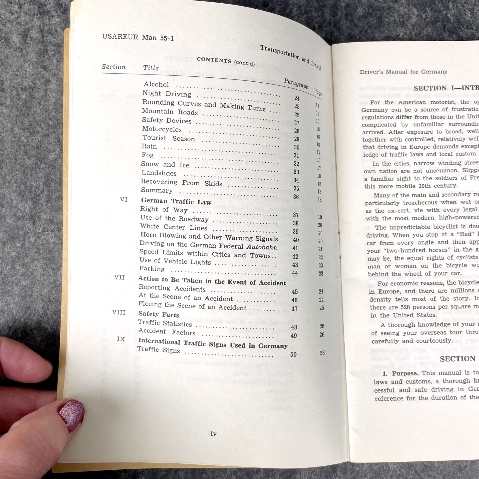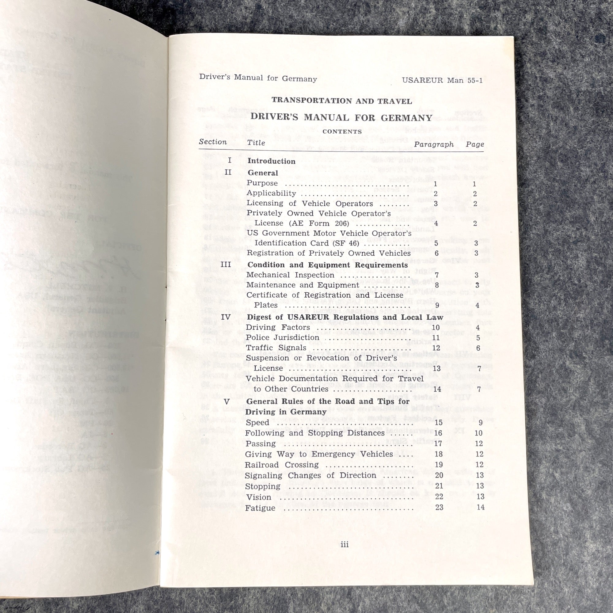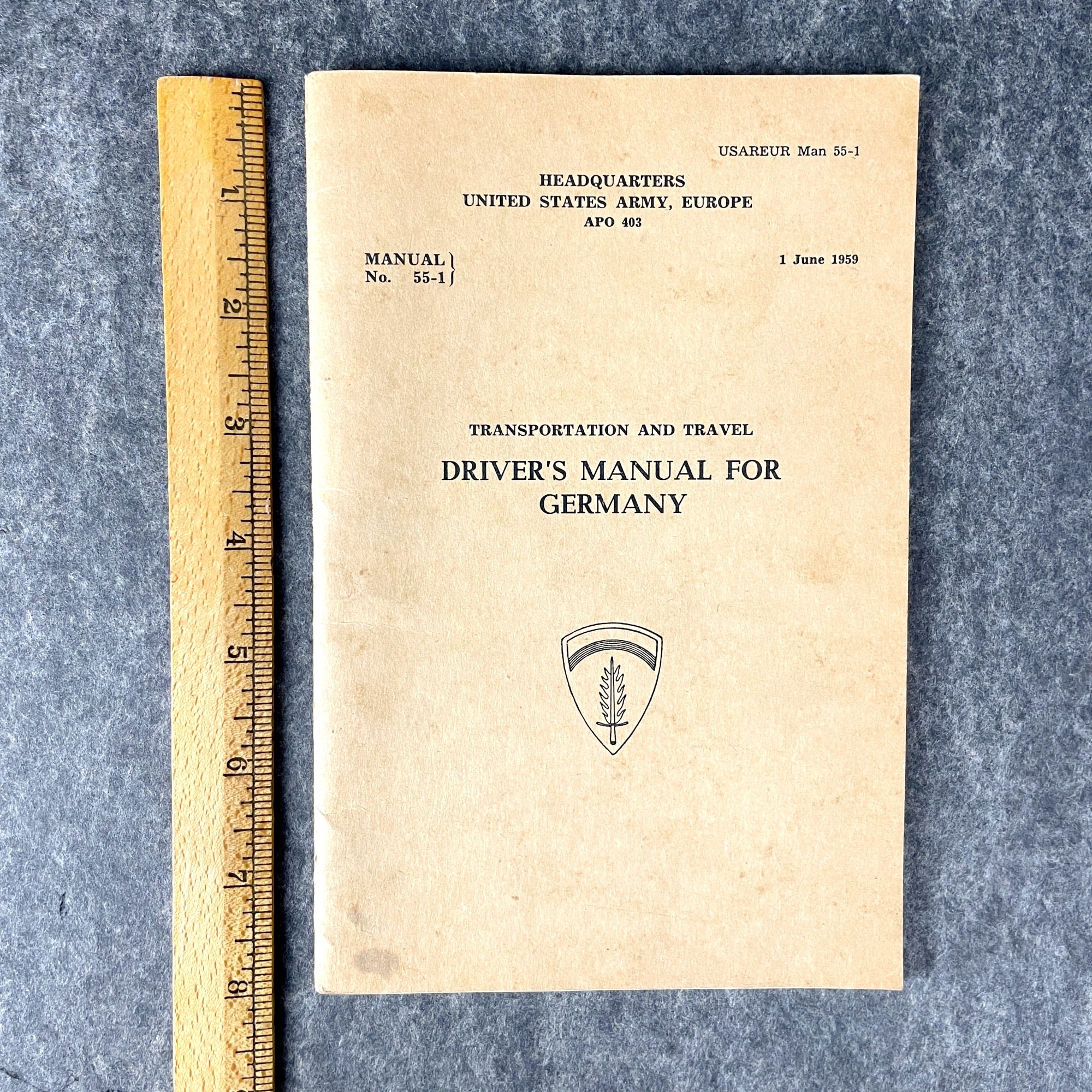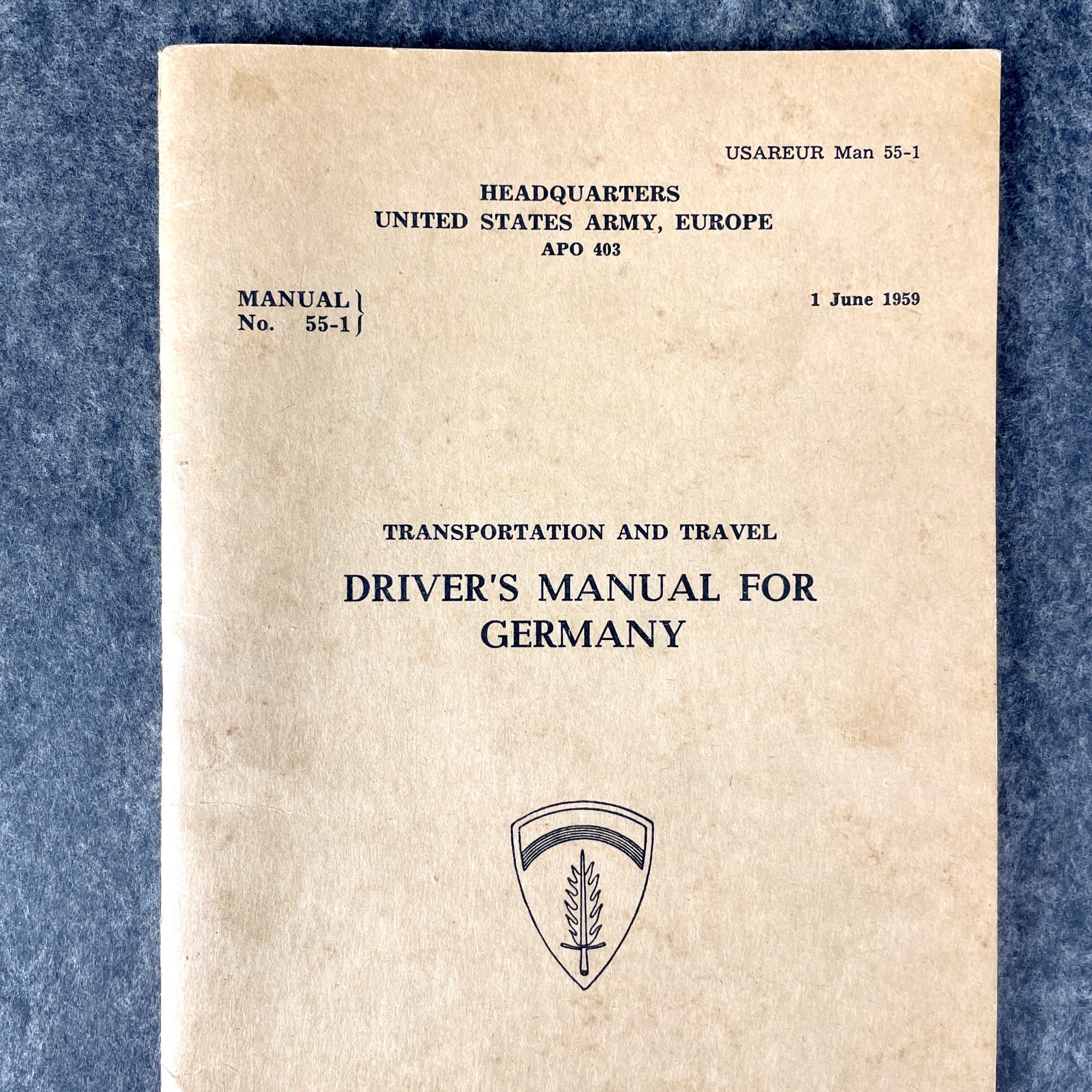 Booklet: Headquarters United States Army, Europe APO 403, Manual no. 55-1, 1 June 1959. Transportation and Travel, Driver's Manual for Germany.