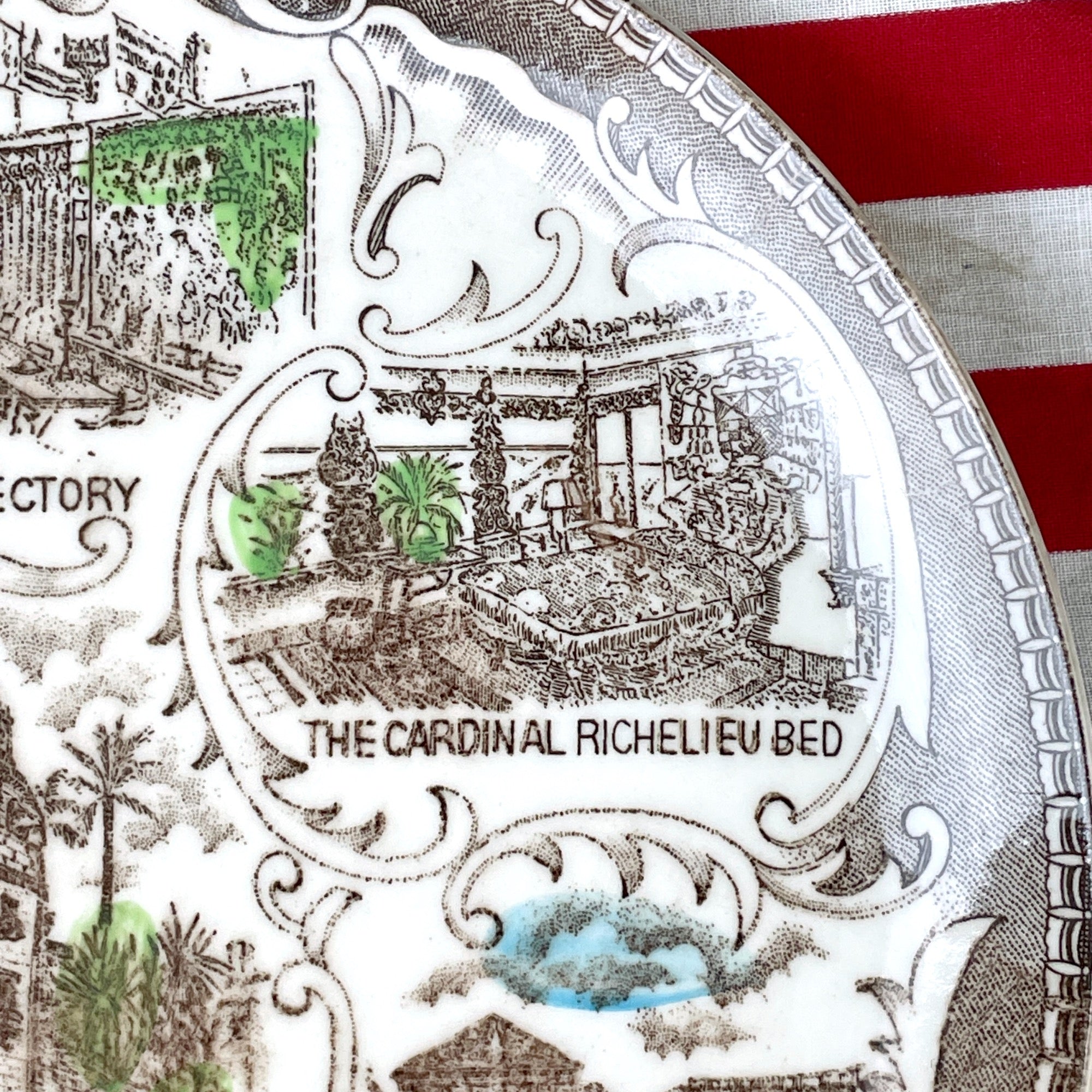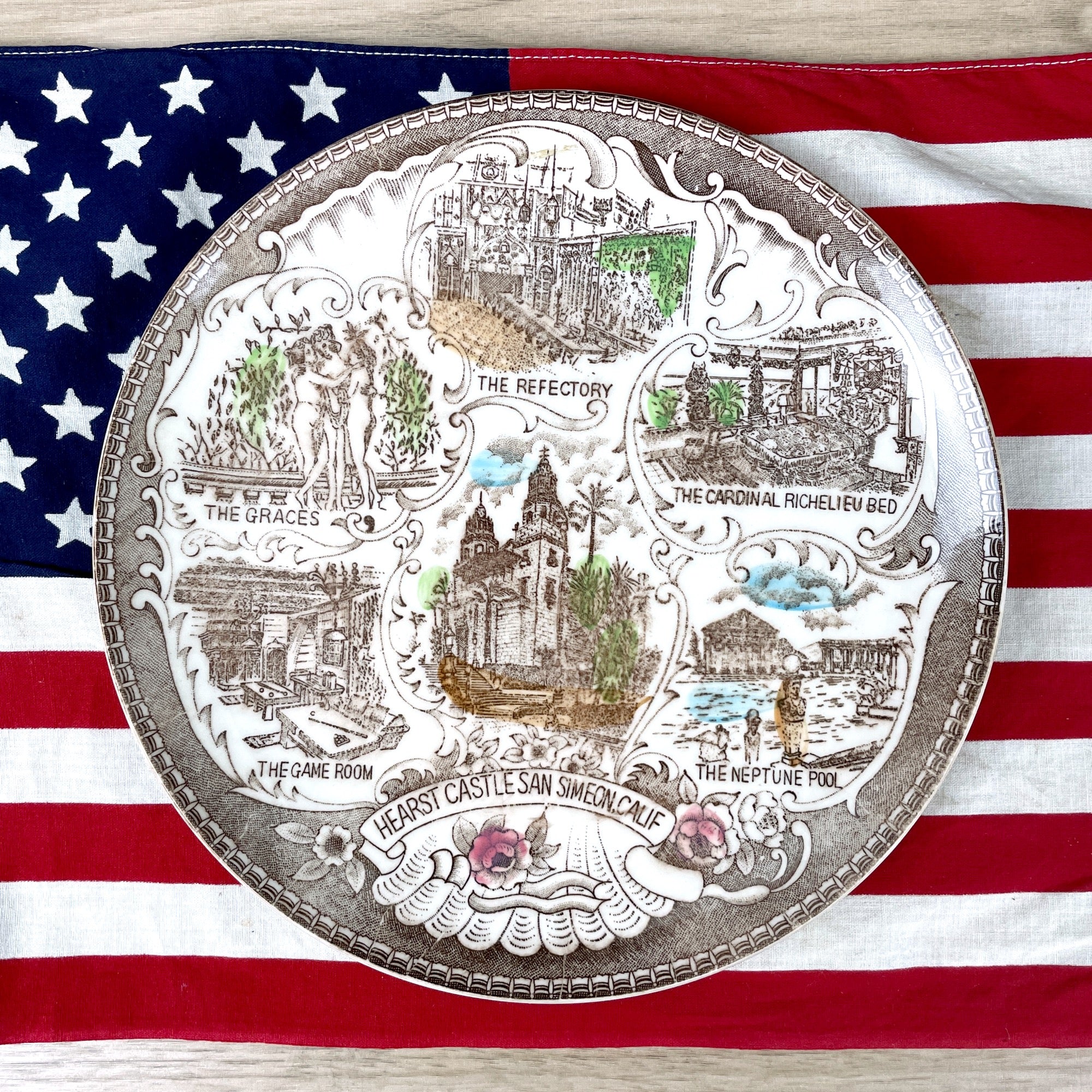 Vintage 1950s souvenir travel plate from Hearst Castle in San Simeon, CA. Images of the exterior, The Cardinal Richelieu Bed, The Neptune Pool, The Game Room, and The Graces.