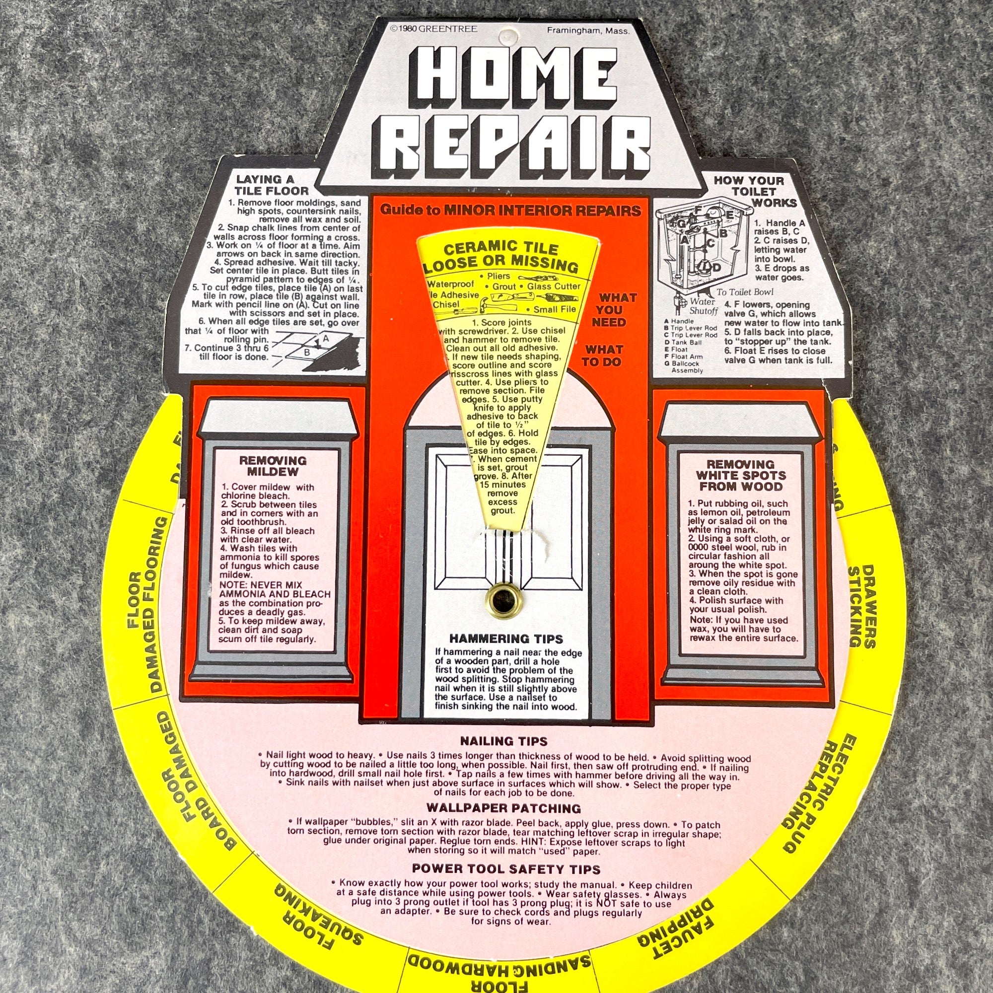 Double-sided Greentree Home Repair wheel. Made in Framingham, MA, 1980. All sorts of tips and instructions for home repair on a handy wheel to put the necessary information at your fingertips. Have you ever wanted to know how to fix a sticking door? How your toilet works? How to remove white spots from wood? Find this information and so much more. Great for any homeowner.