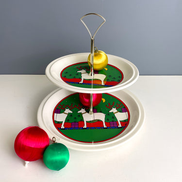 Houze Staffordshire reindeer 2-tiered server - vintage 1980s Christmas china