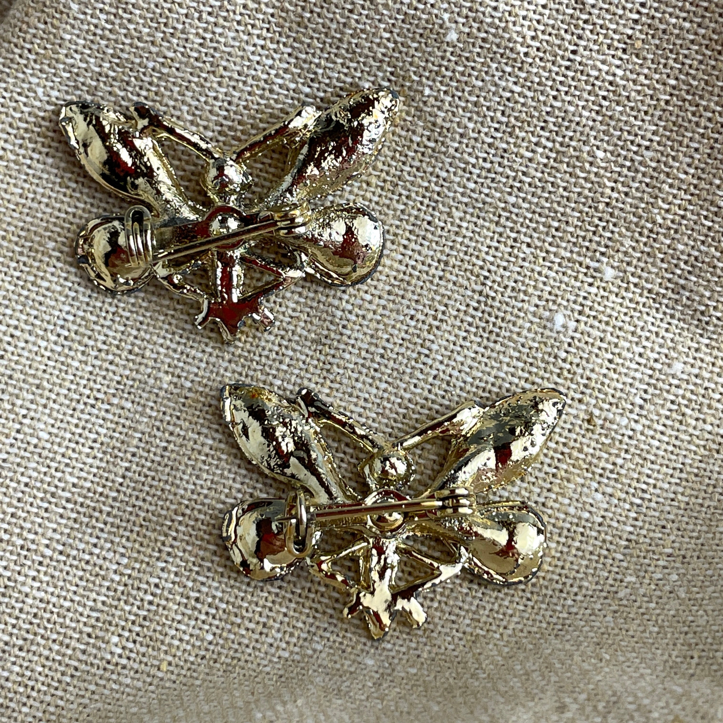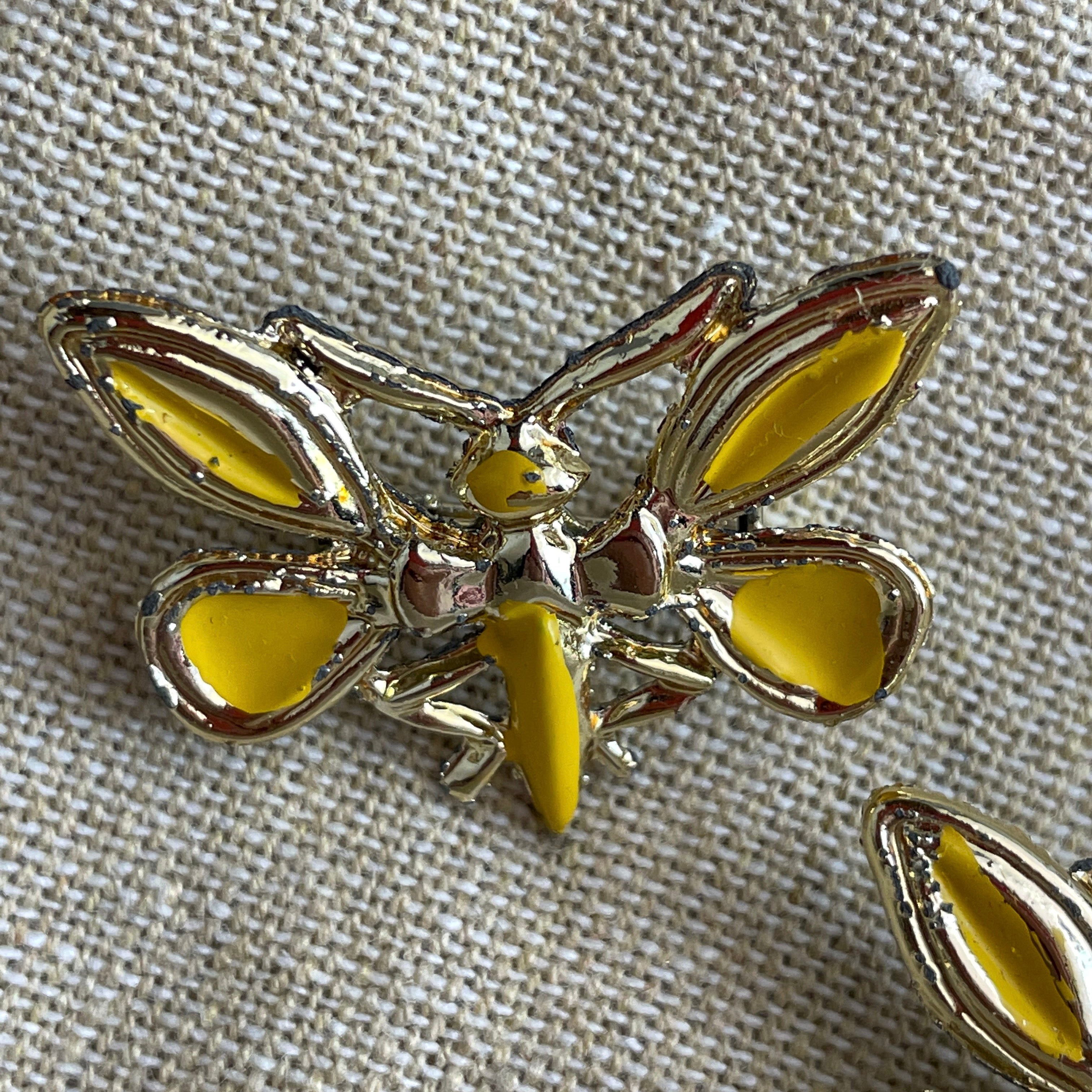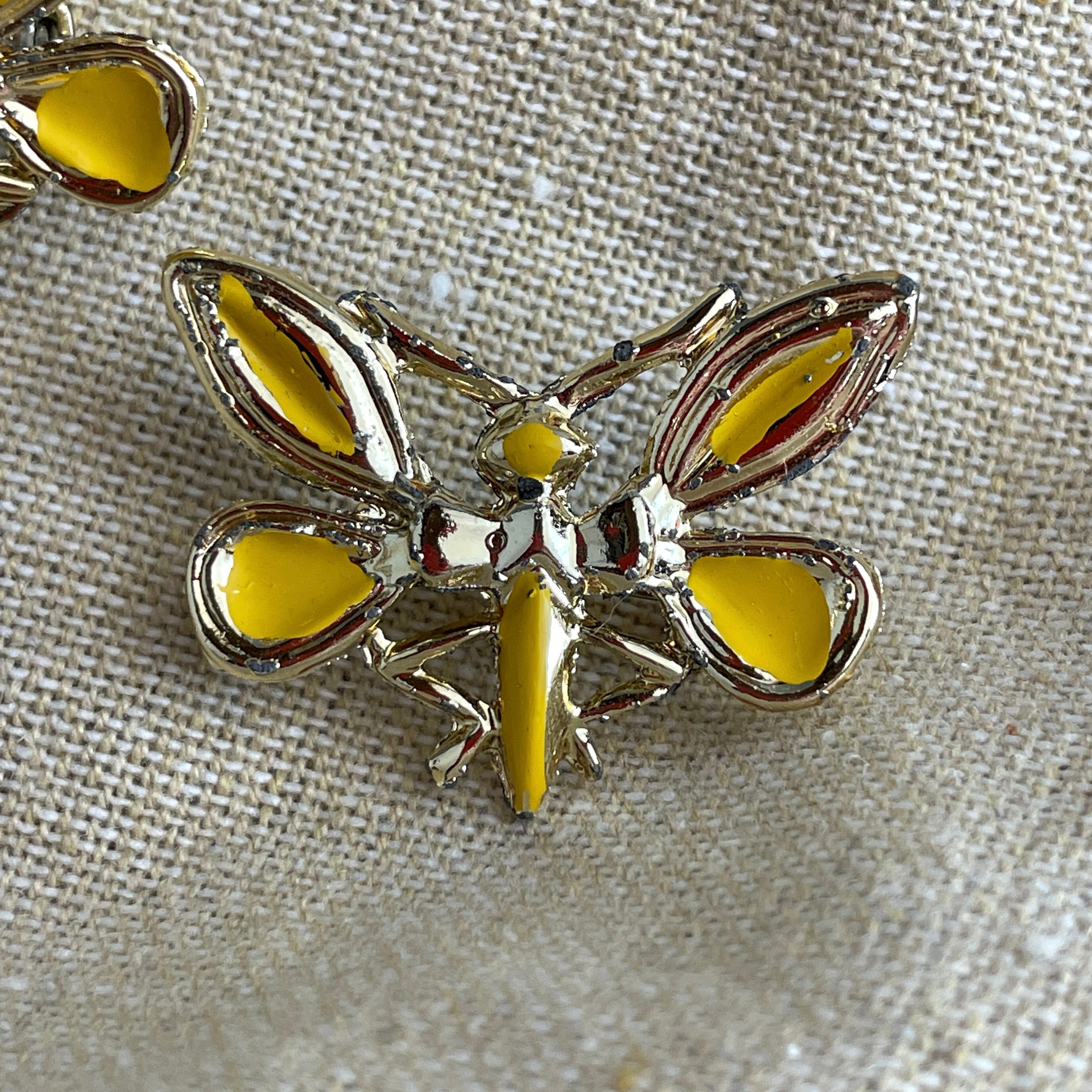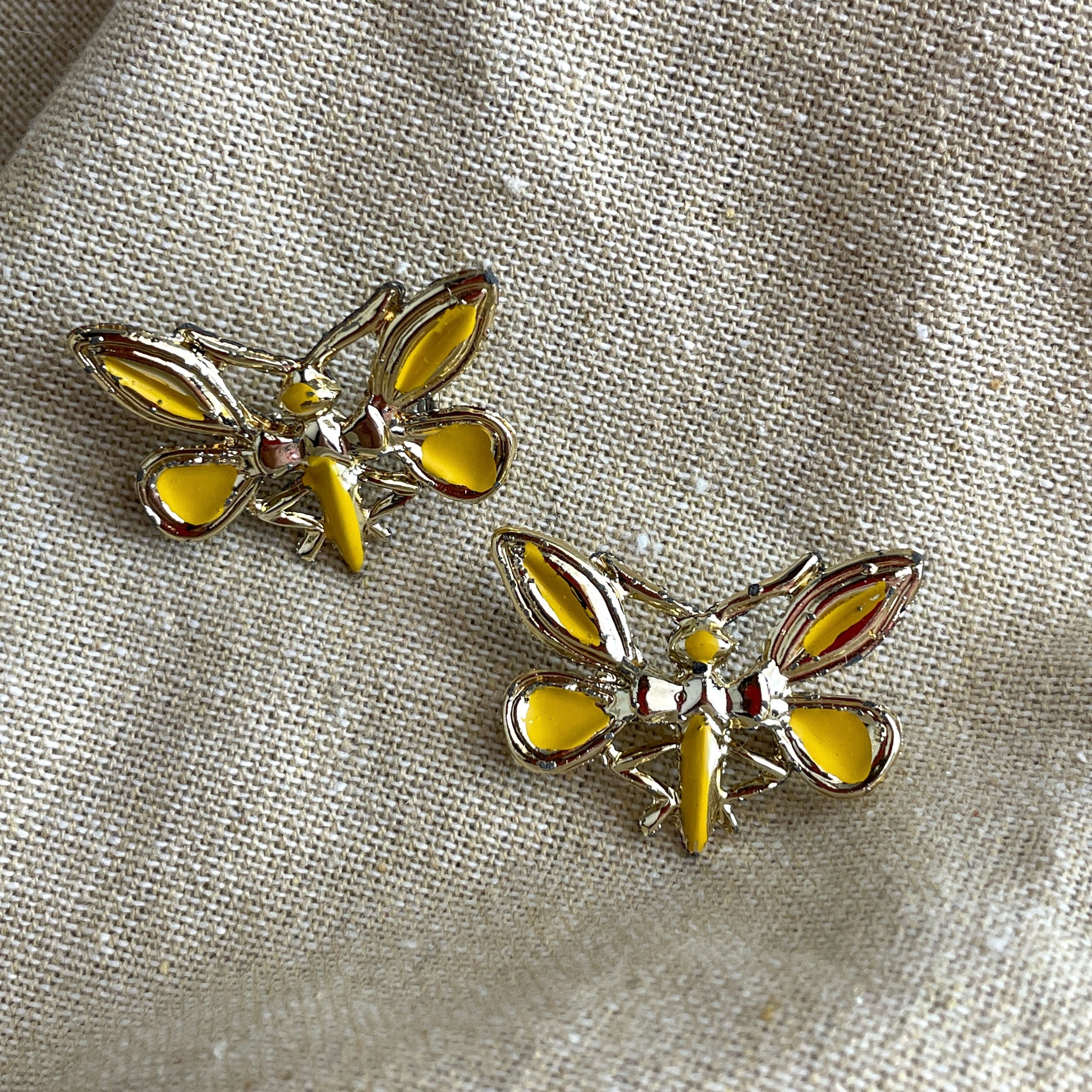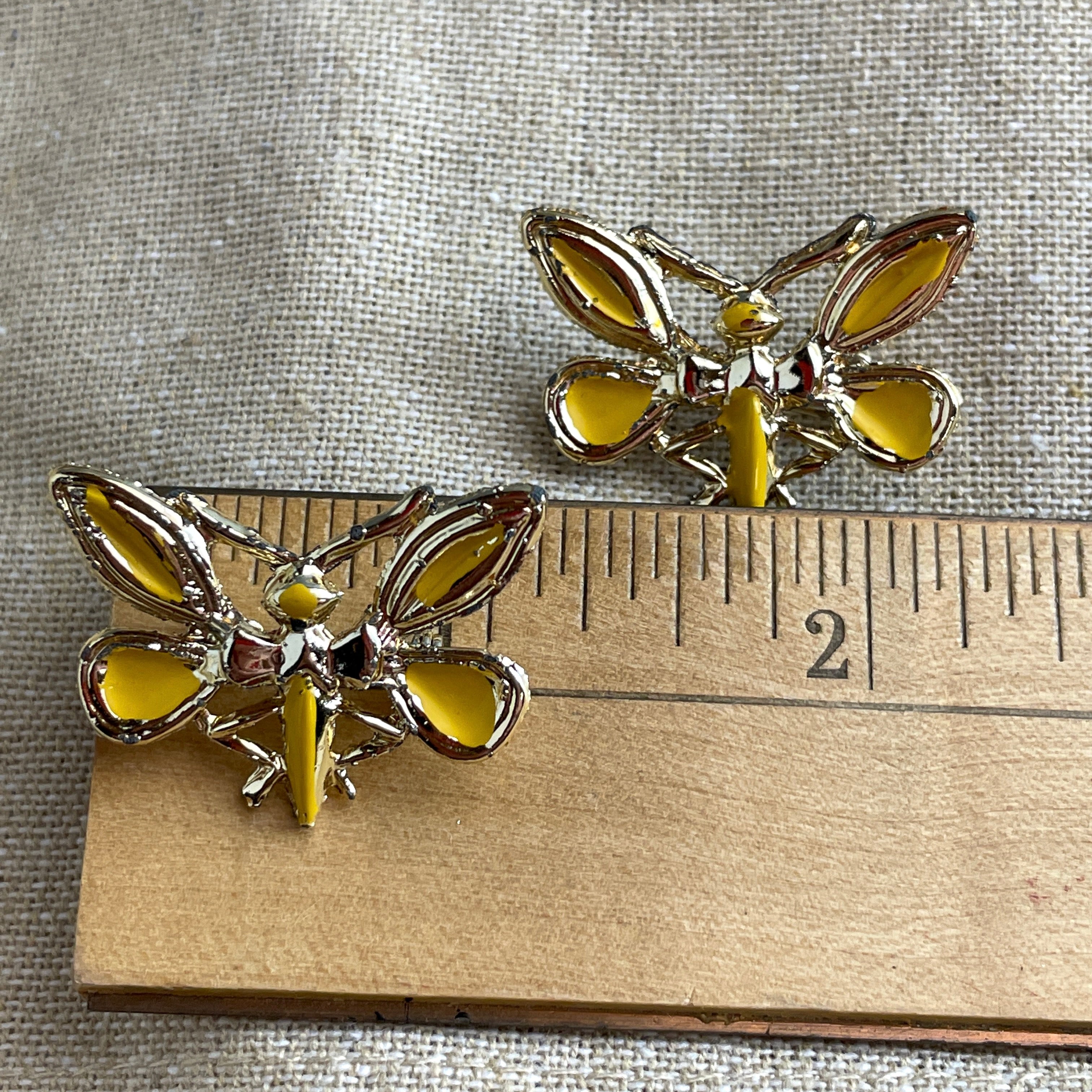 Pair of vintage 1960s insect scatter pins, likely from the five and dime store. Small gold bugs have cold painted goldenrod yellow accents. Some rough edges where the gold coating is not covering the base metal. Adorable everyday costume jewelry from back in the day.