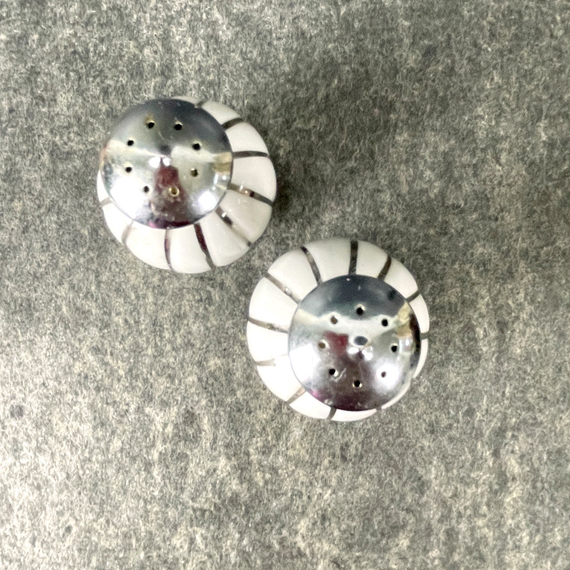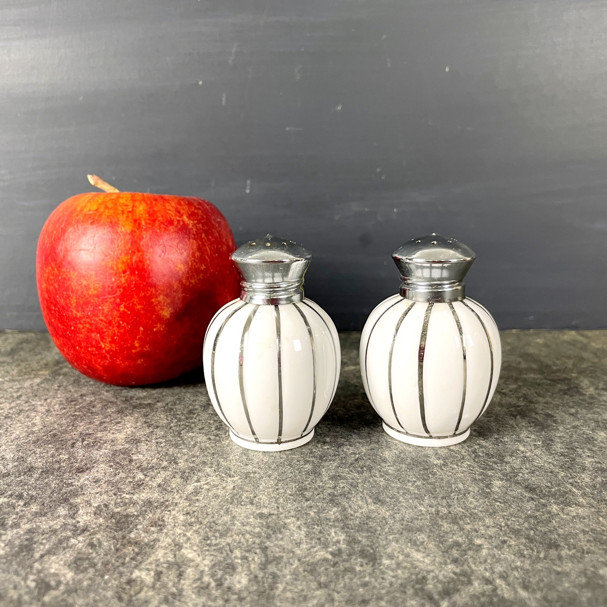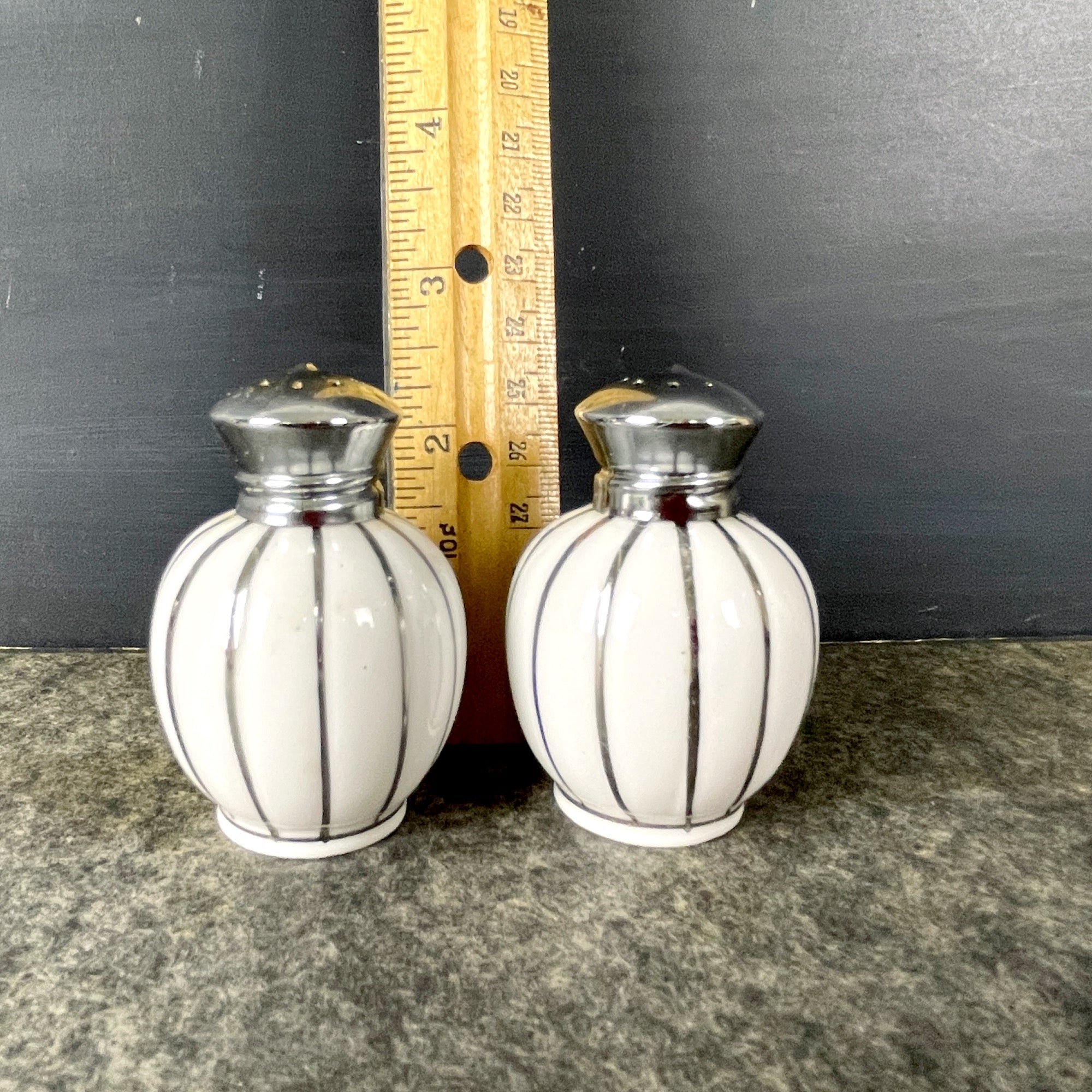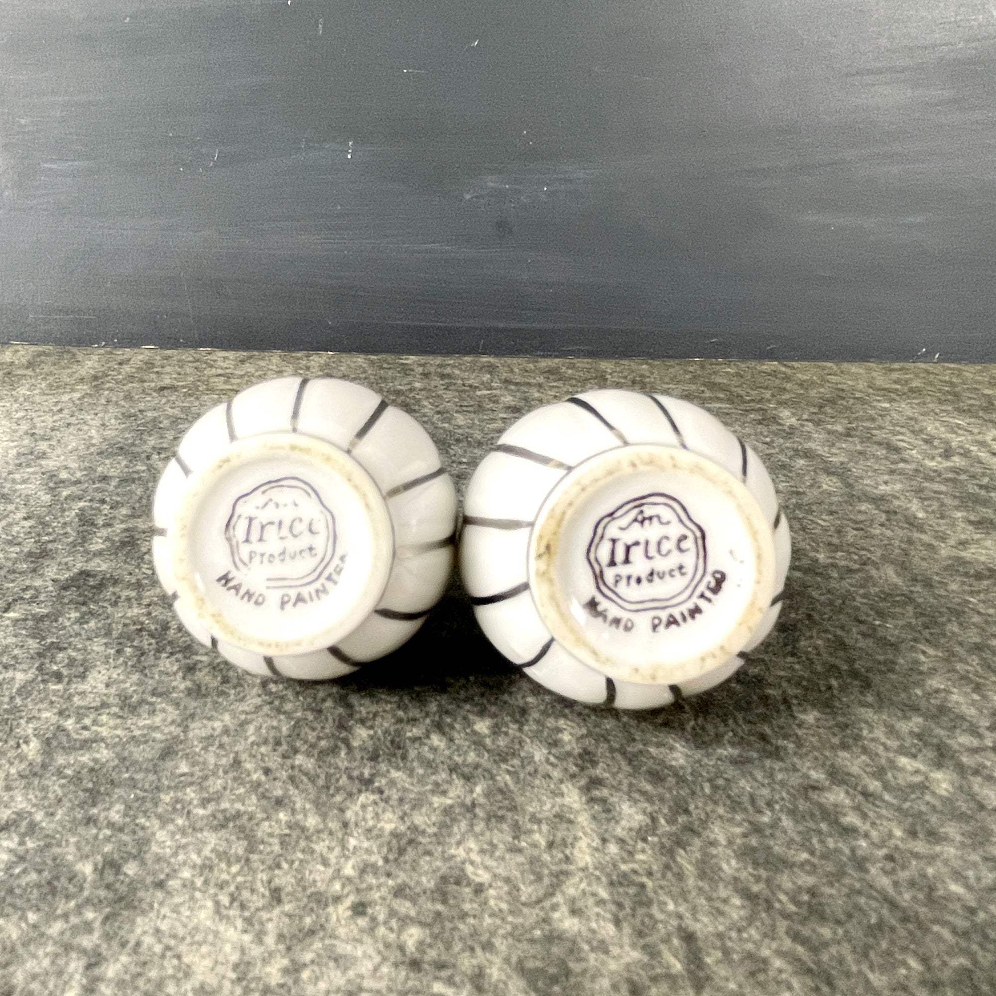 Small pair of Irice ribbed white porcelain salt and pepper shakers, lined with silver paint. Silver metal caps. Made by the Irving W. Rice Company of New York.