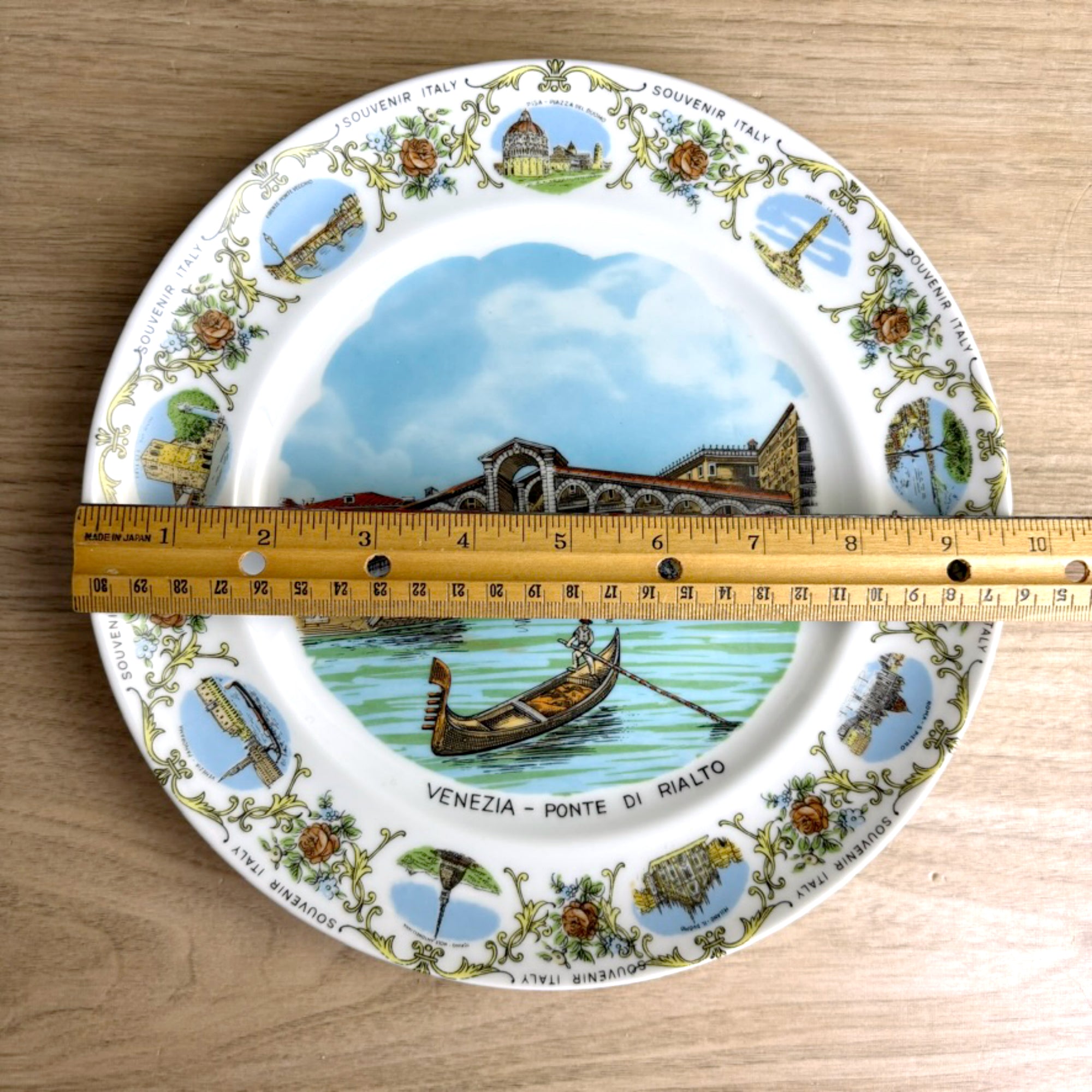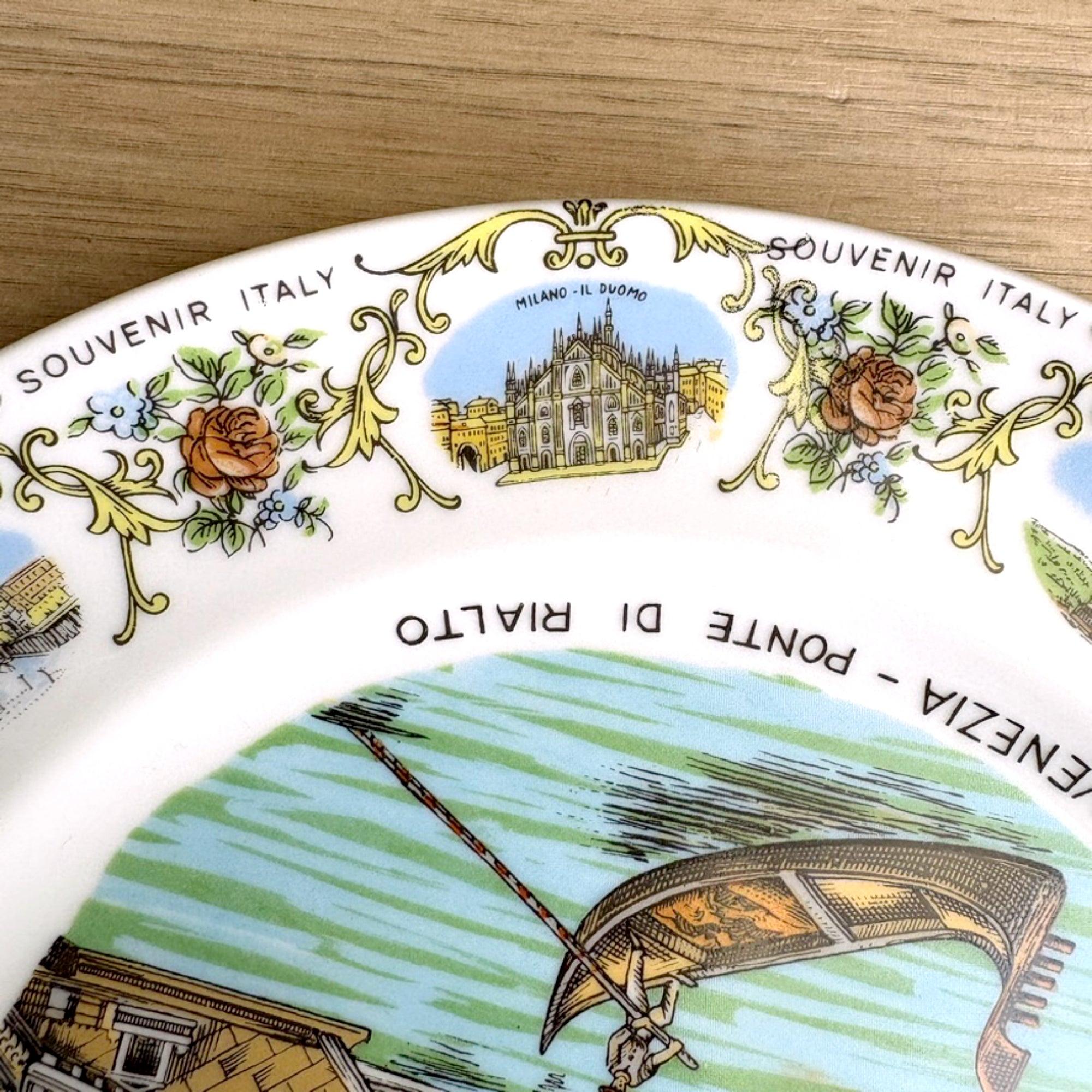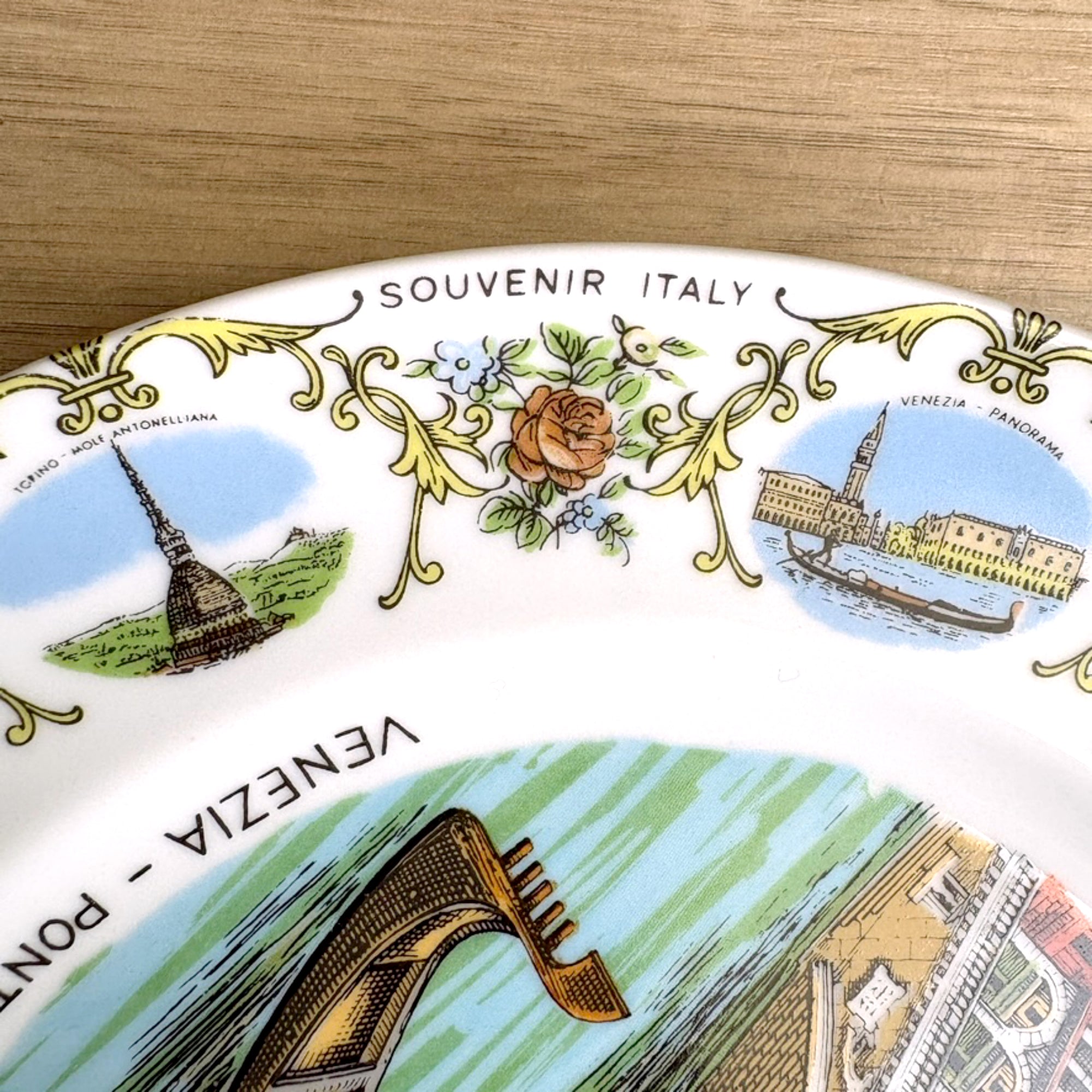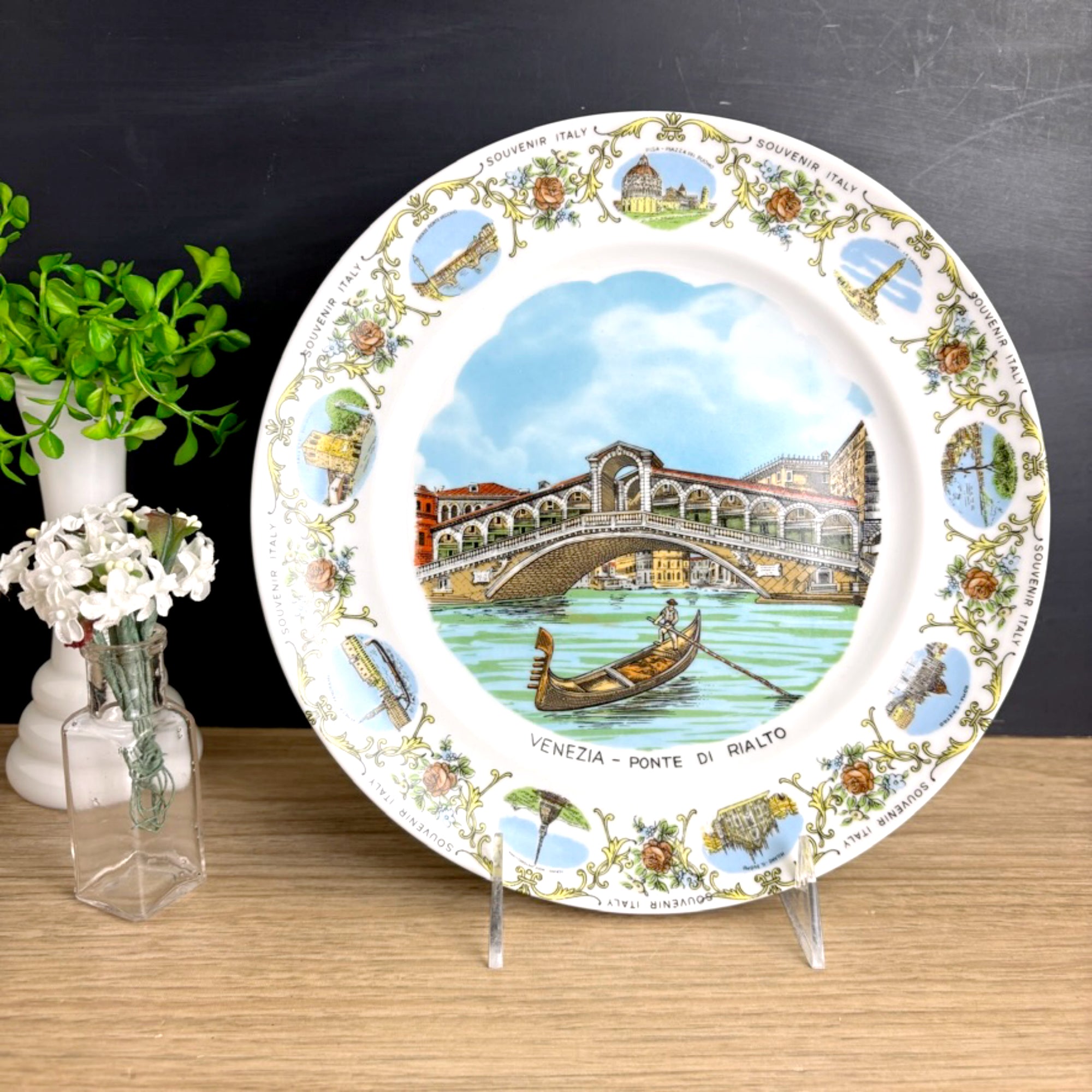 Vintage white souvenir plate from Italy. Large printed image of the Venezi - Ponte Di Rialto in the center of the plate. Along the border are several small depictions of tourist attractions in different cities alternating with a floral motif and "SOUVENIR ITALY" printed several times around the rim.