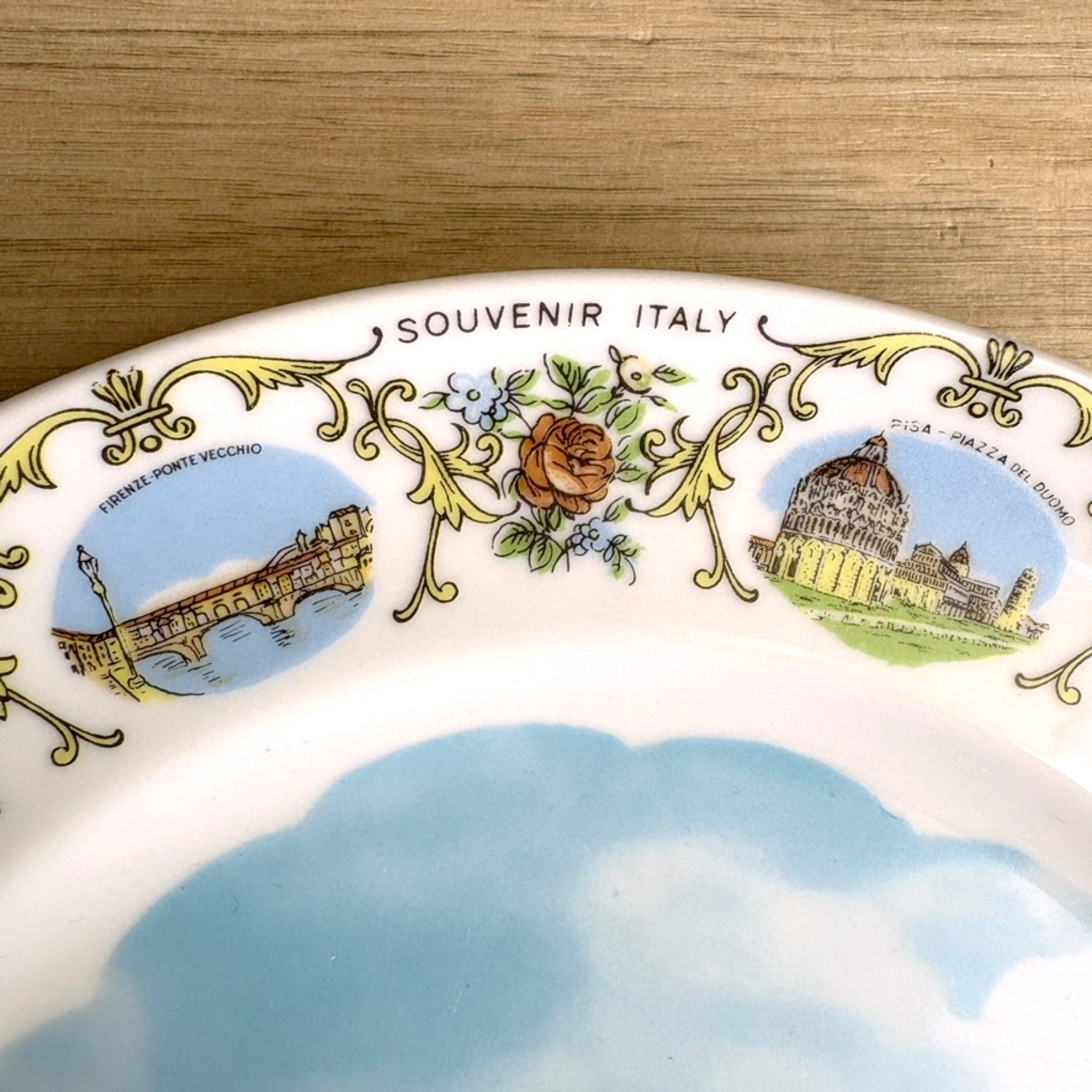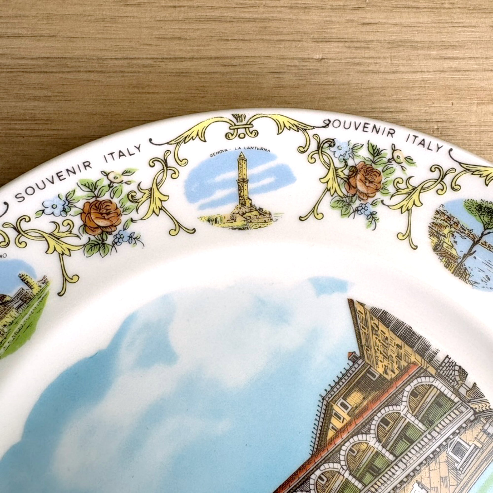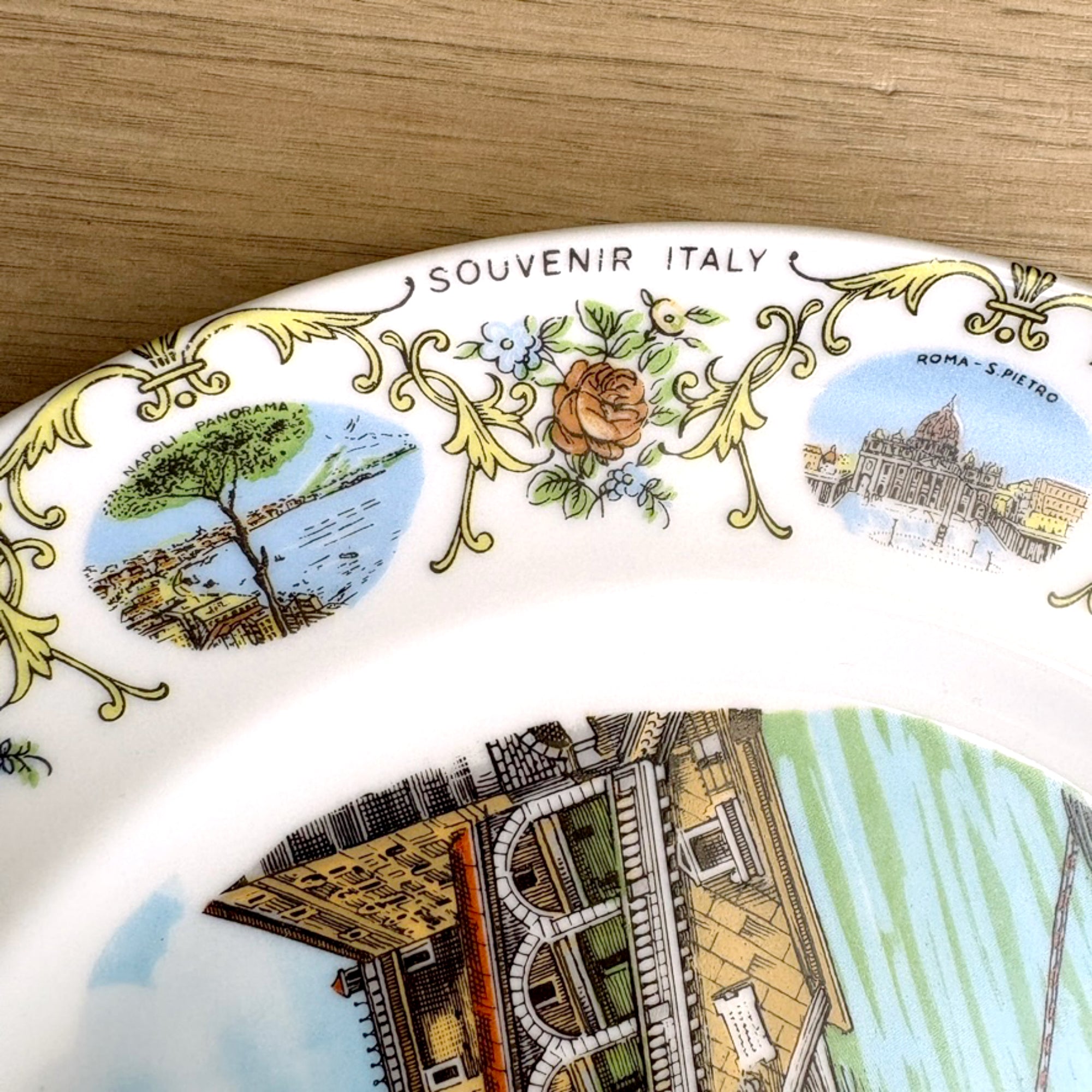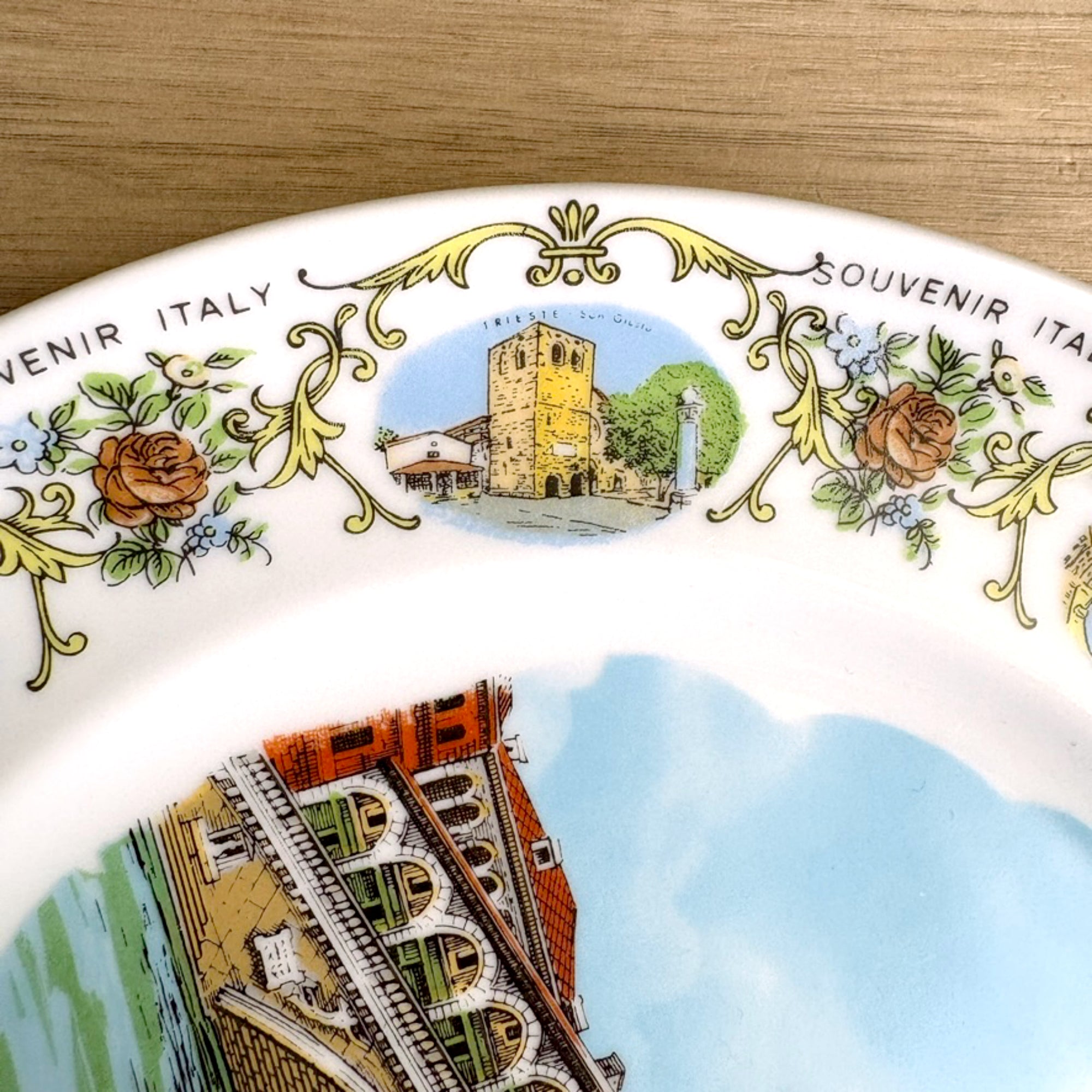 Vintage white souvenir plate from Italy. Large printed image of the Venezi - Ponte Di Rialto in the center of the plate. Along the border are several small depictions of tourist attractions in different cities alternating with a floral motif and "SOUVENIR ITALY" printed several times around the rim.