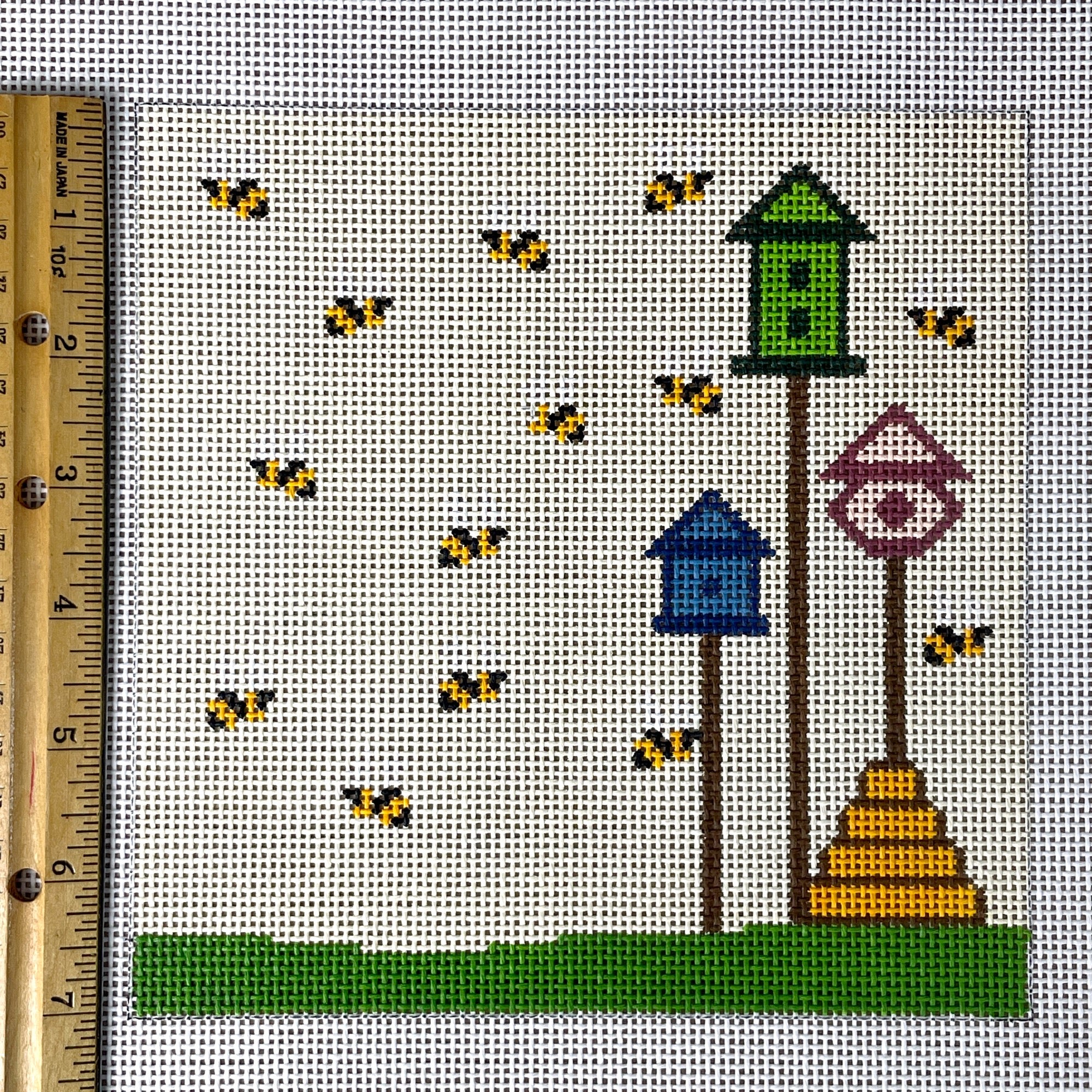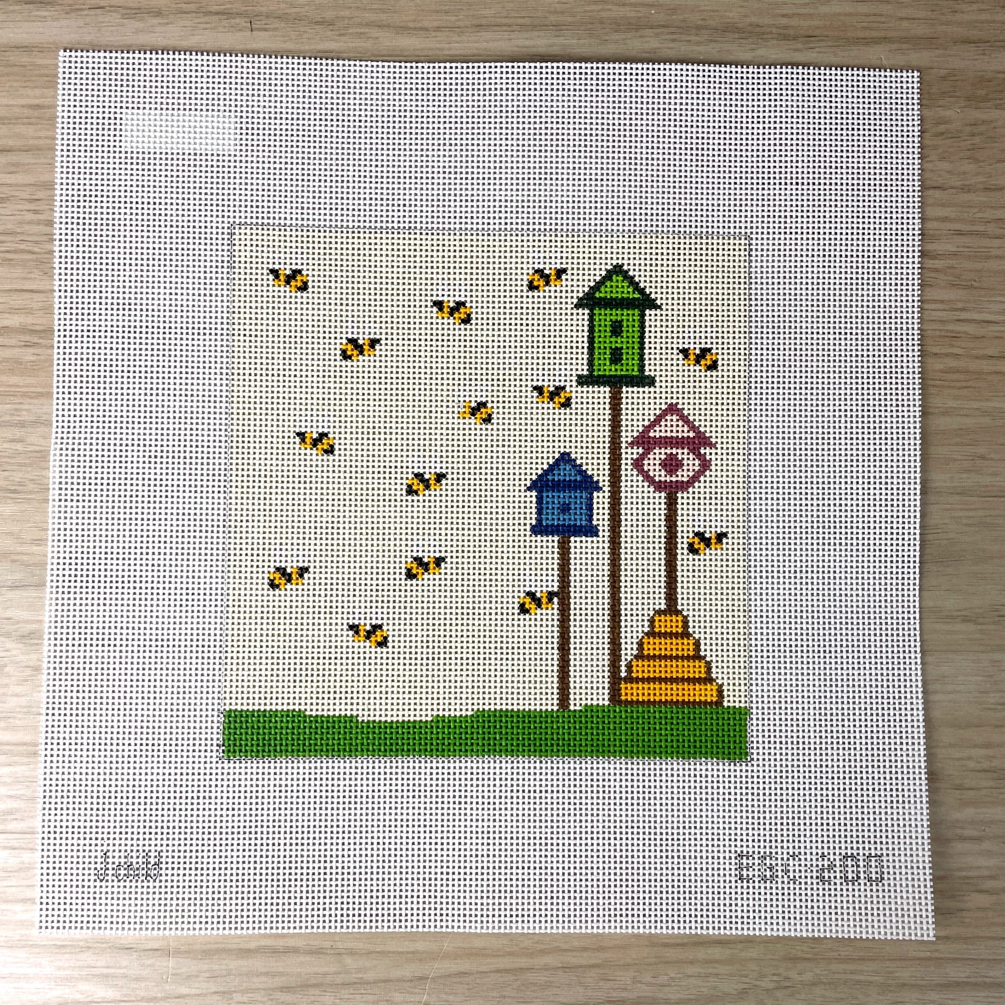 Bees & Birdhouses eyeglass case handpainted needlepoint canvas by J. Child, #EGC-200. Retail $55