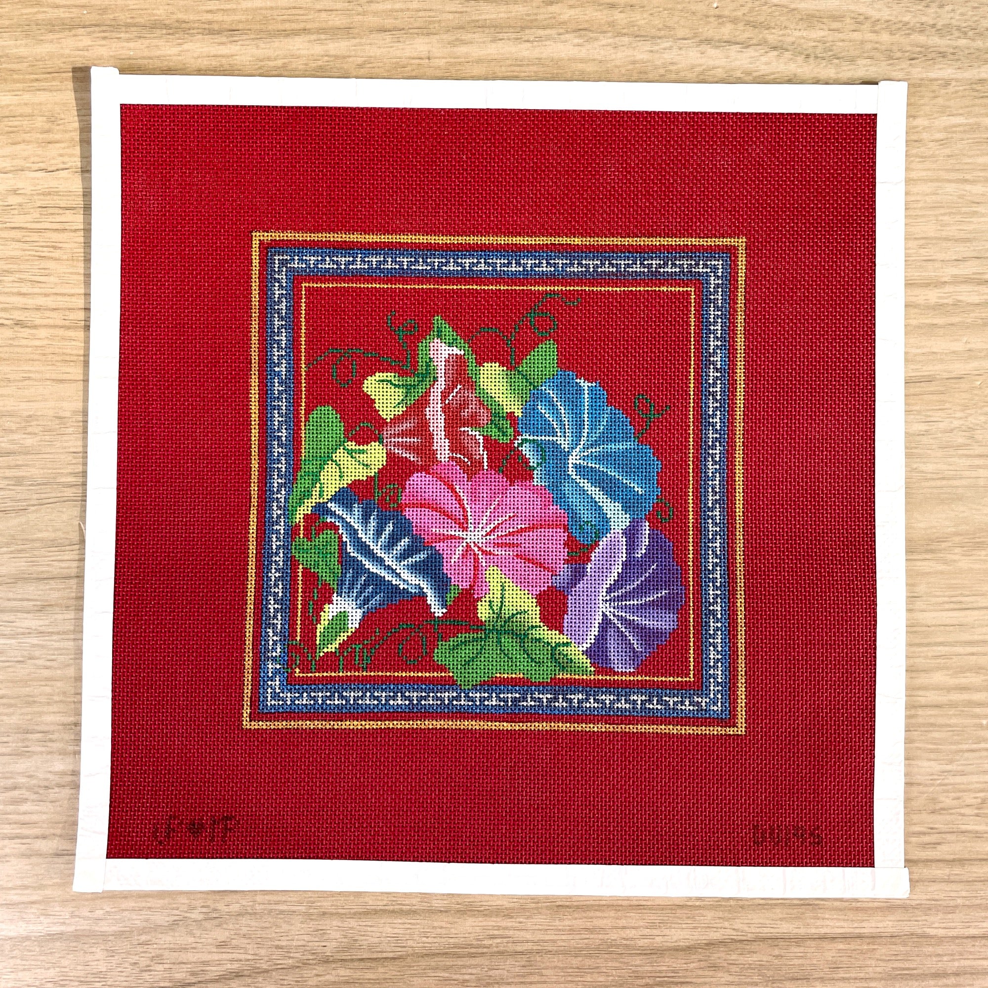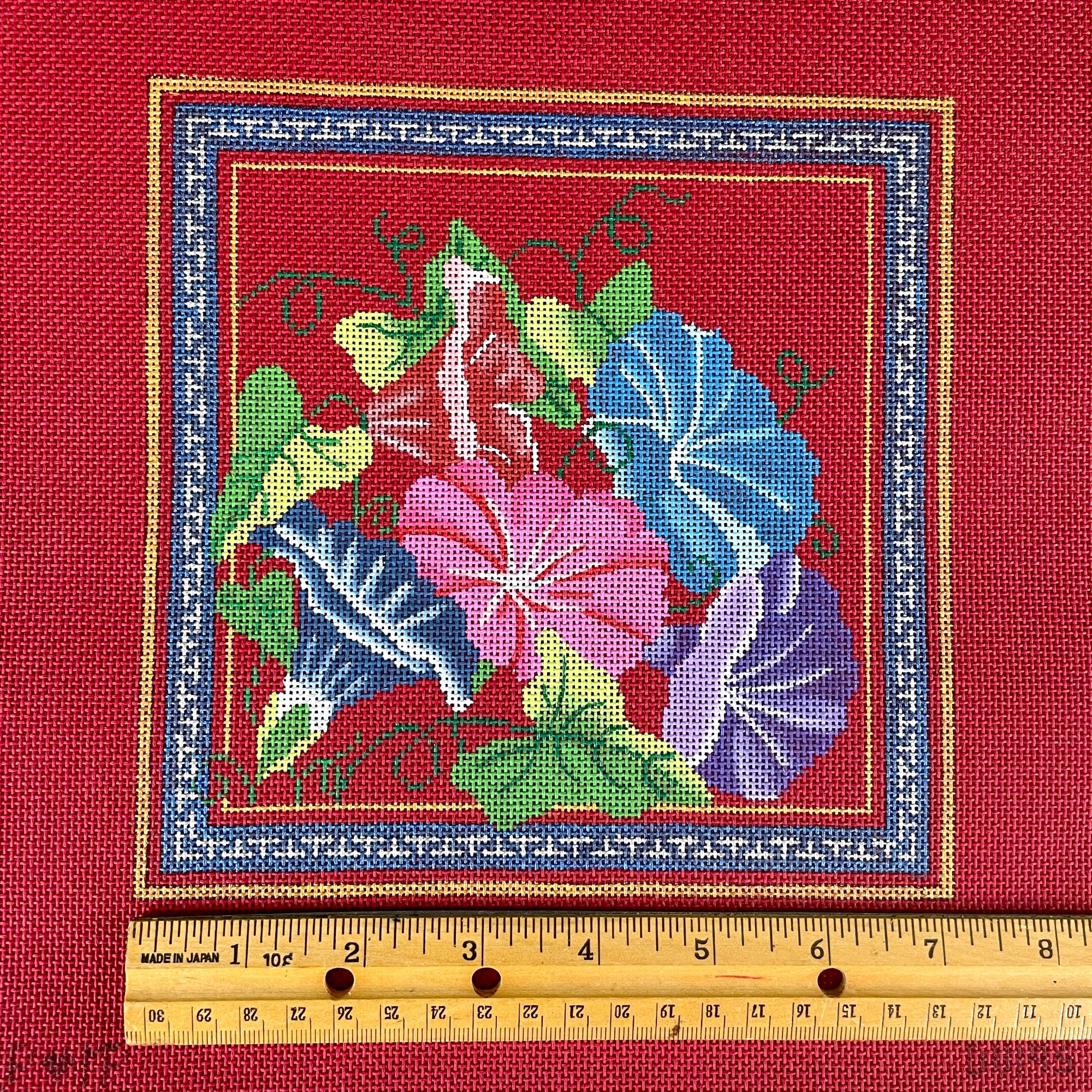 Handpainted needlepoint canvas of morning glories inside a Greek key border by JP Needlepoint, #DV195.
